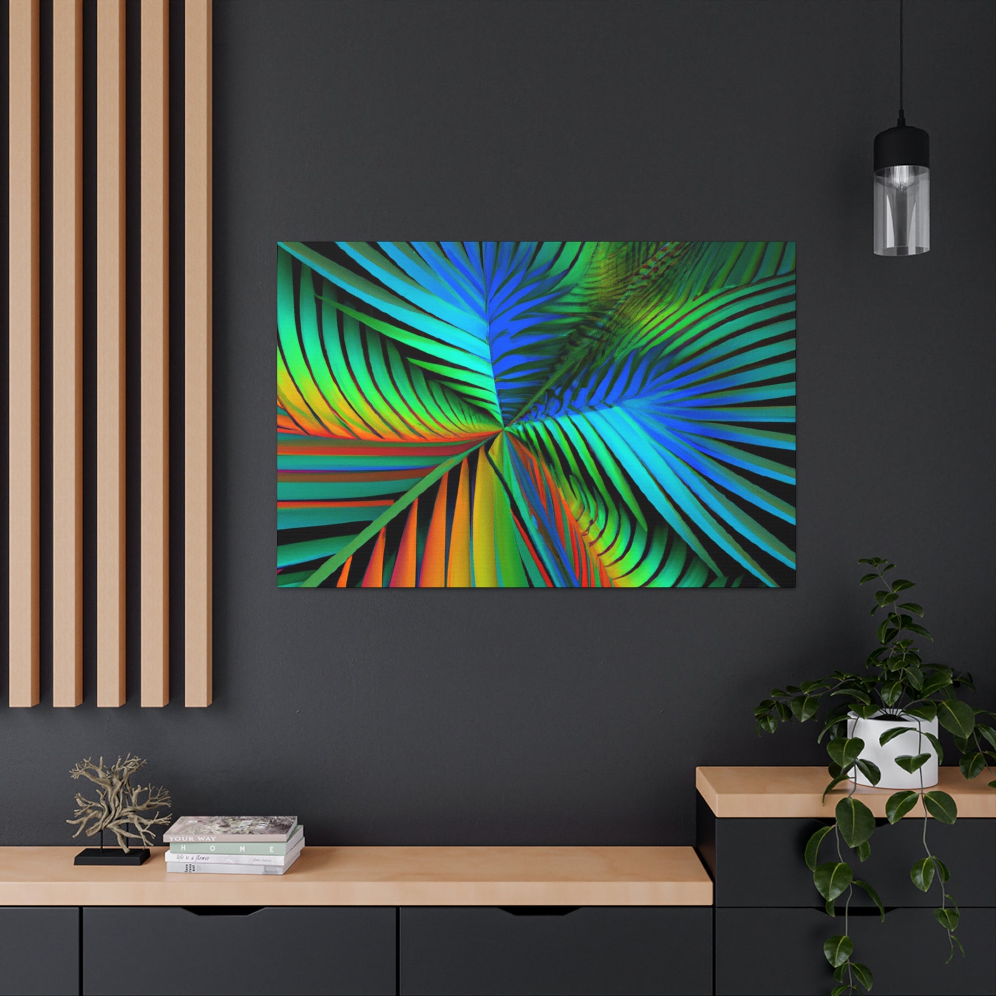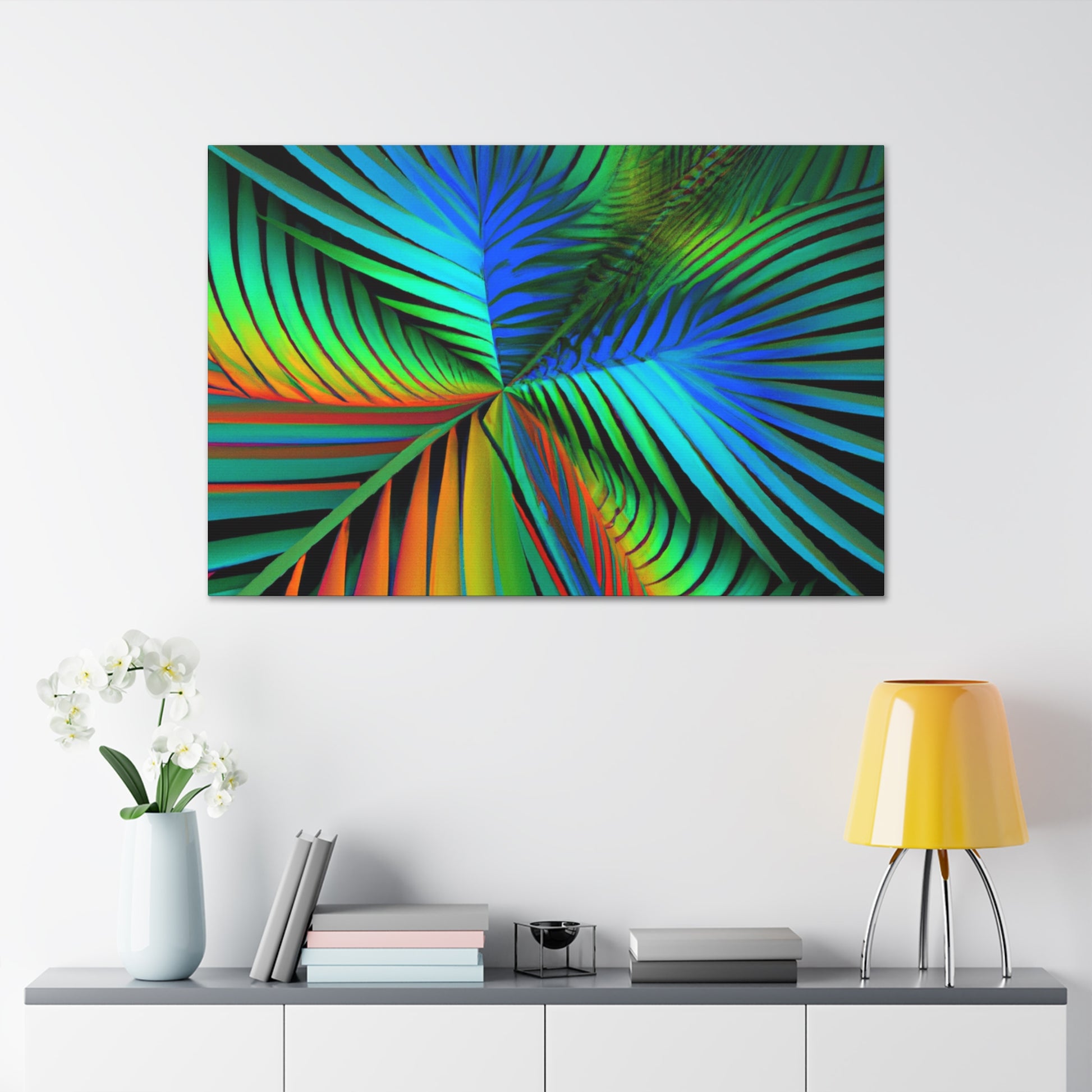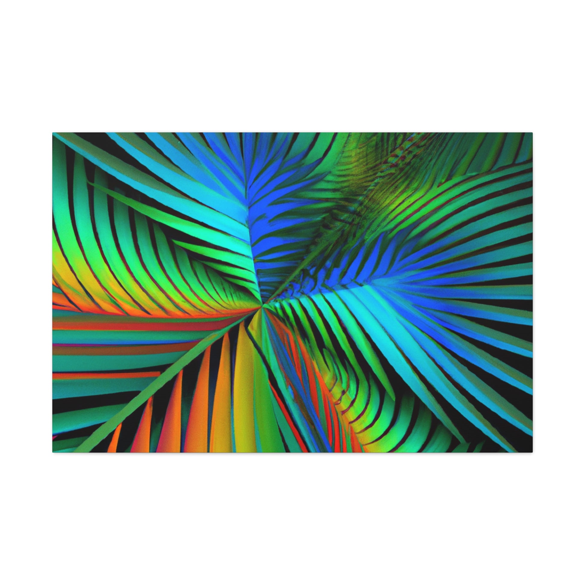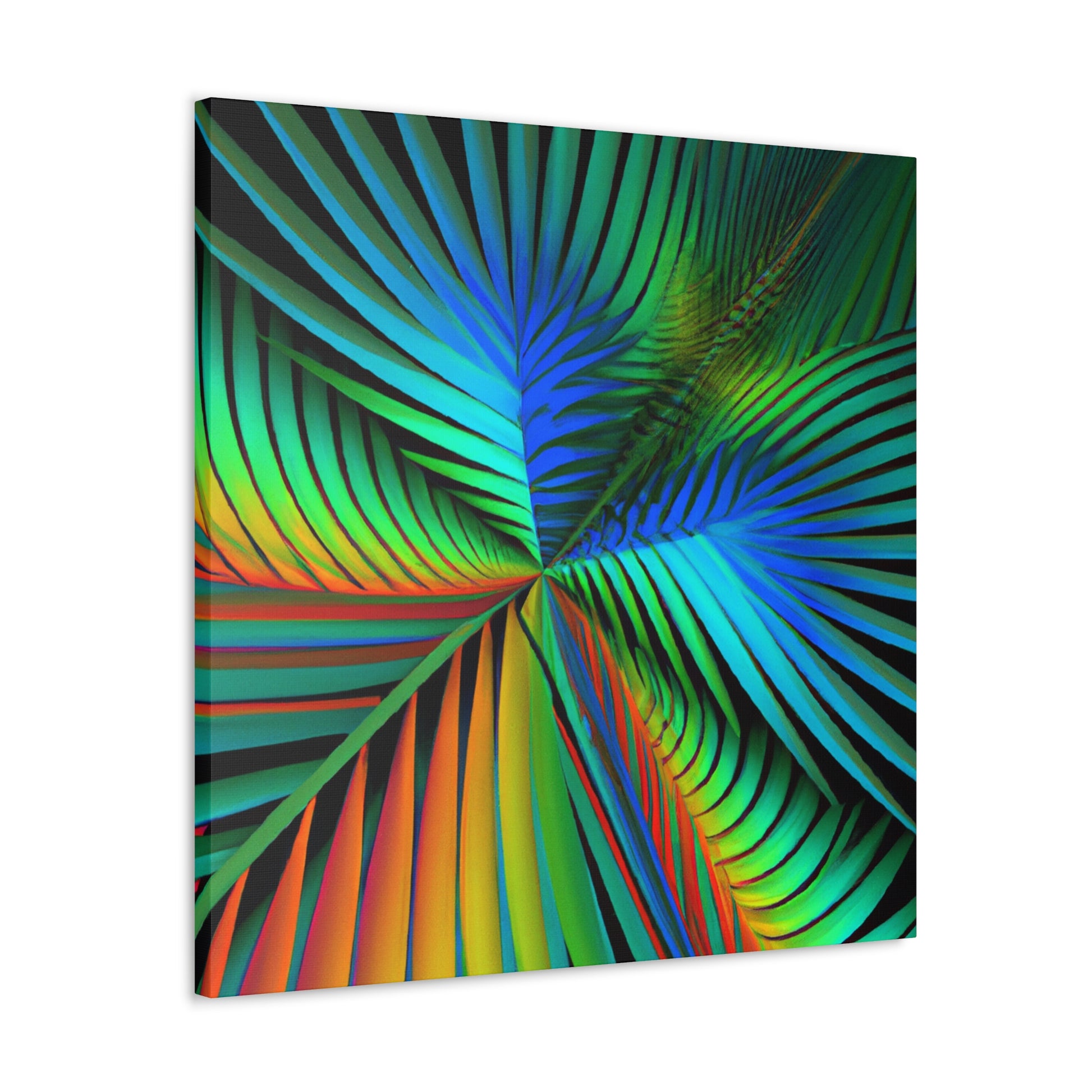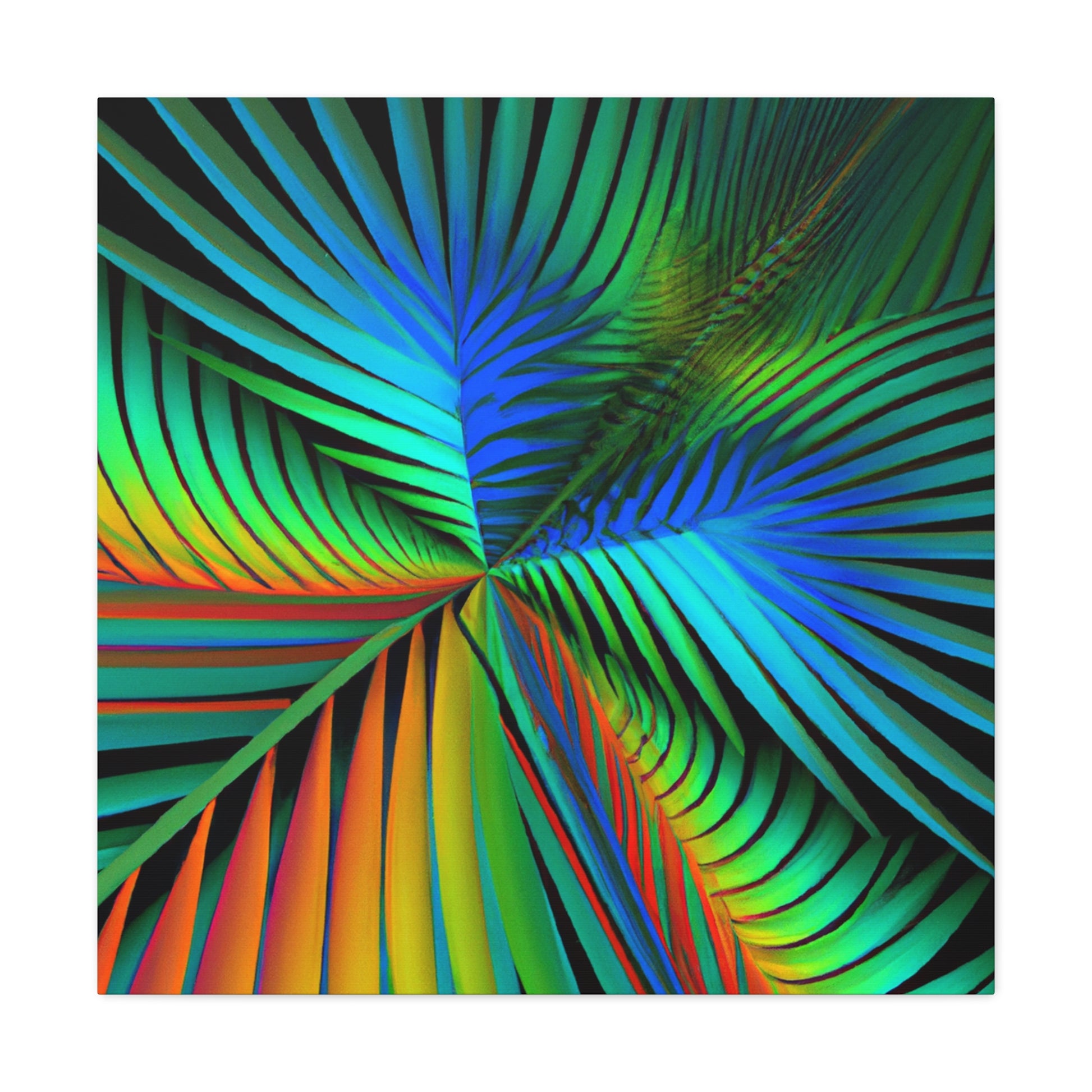 Unlock an eye-catching piece of art for your home with this vivid canvas of trippy geometric palm leaves, kaleidoscope, abstract, digital art, and vibrant colors with 3D lines and fractal patterns. All colors pop out of the canvas with a mesmerizing effect. Elevate the design of your space with this stunning work of art! #art #fractal #abstractart #palmleaves #kaleidoscope #3dlines #vibrantcolors #decor #digitalart #geometricart #homedecor