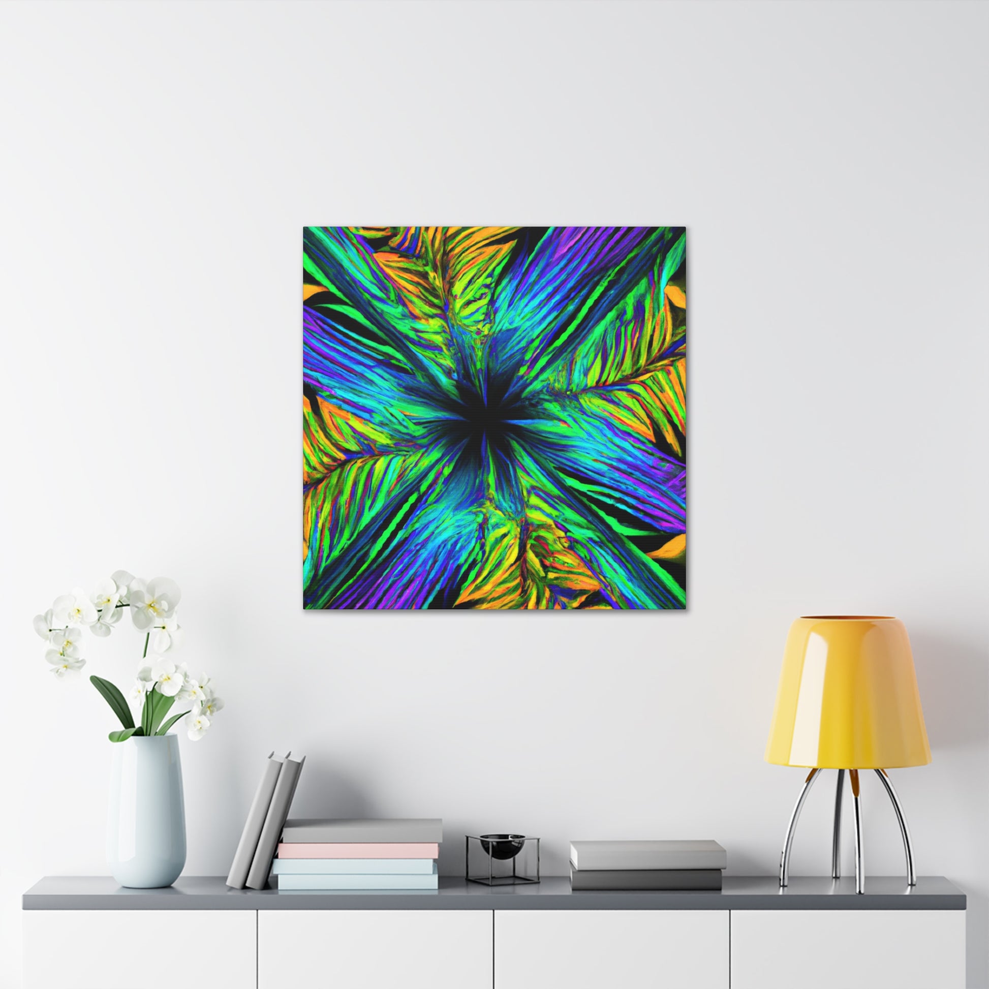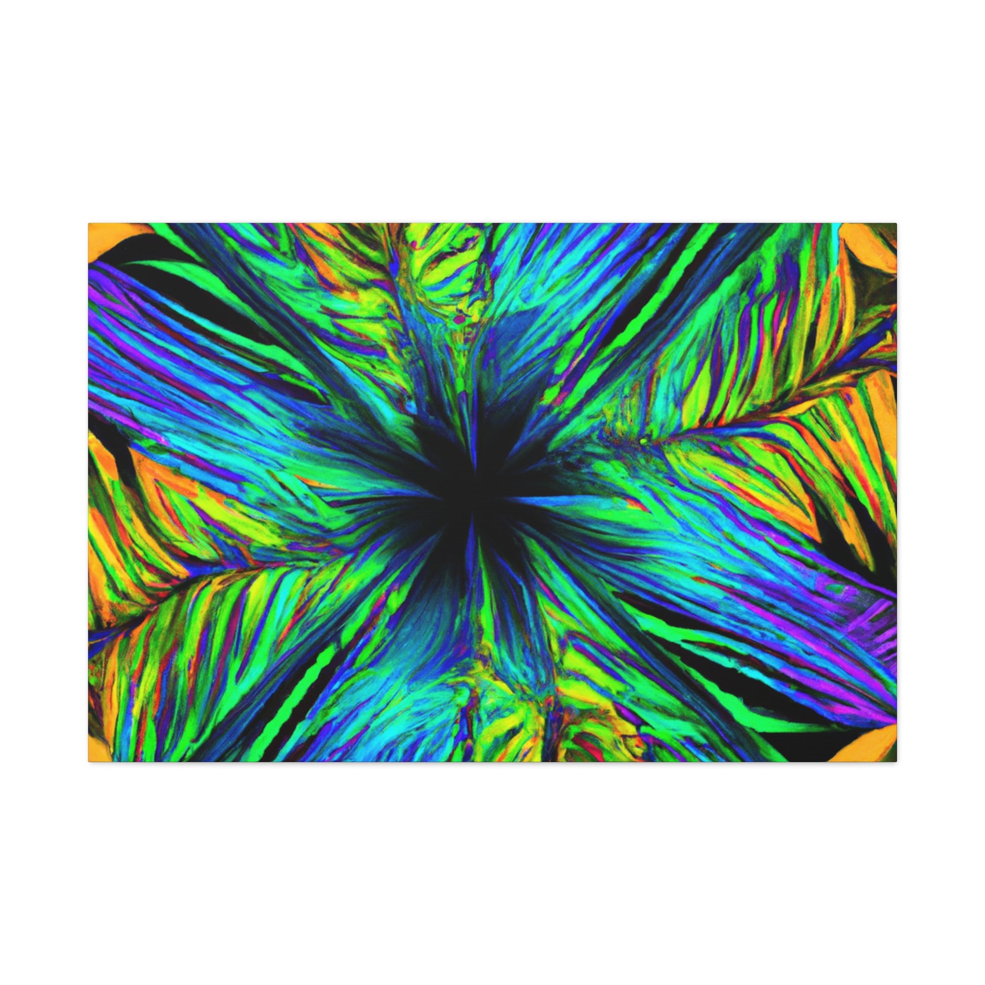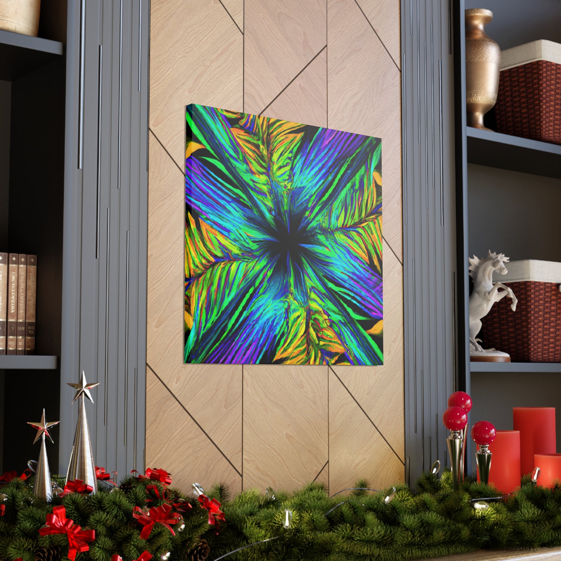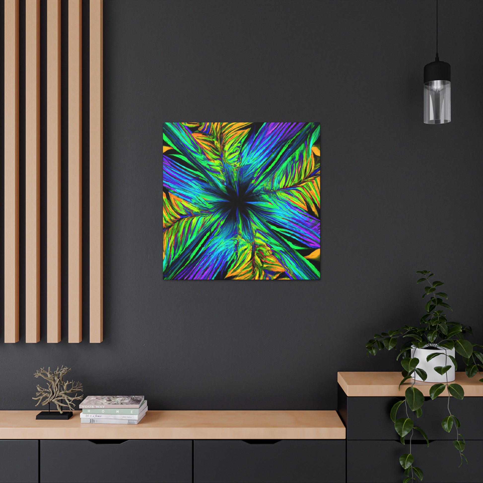 This vibrant abstract canvas art features a trippy geometric palm leaf and kaleidoscope design with 3D lines, fractals and a mix of vibrant, digital colors. It is an original work of art that looks amazing in any modern space and perfect for anyone looking to add a unique touch to their home decor! #trippy #geometric #palmleaves #kaleidoscope #abstractart #digitalart #vibrantcolors #3dlines #fractal #homedecor #art