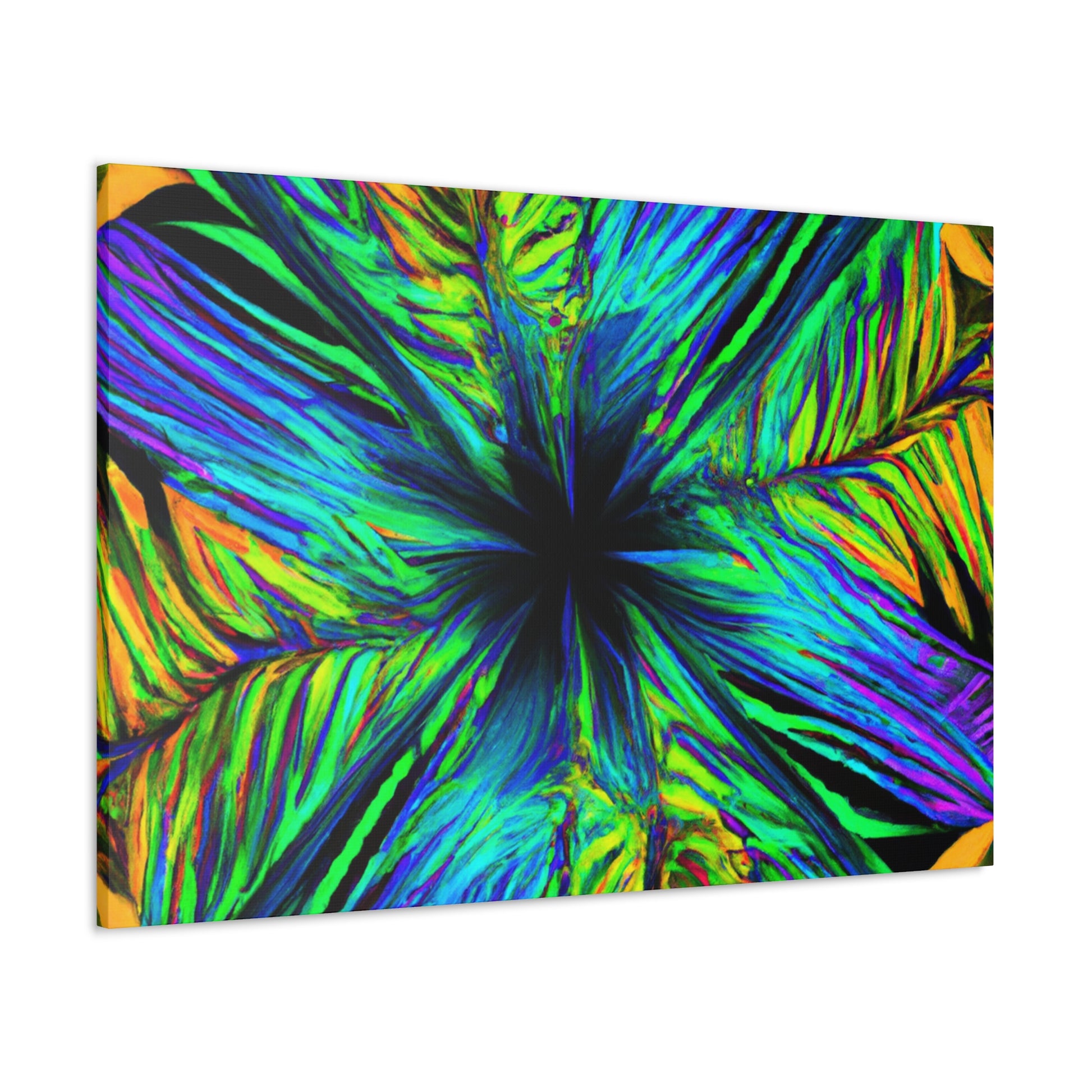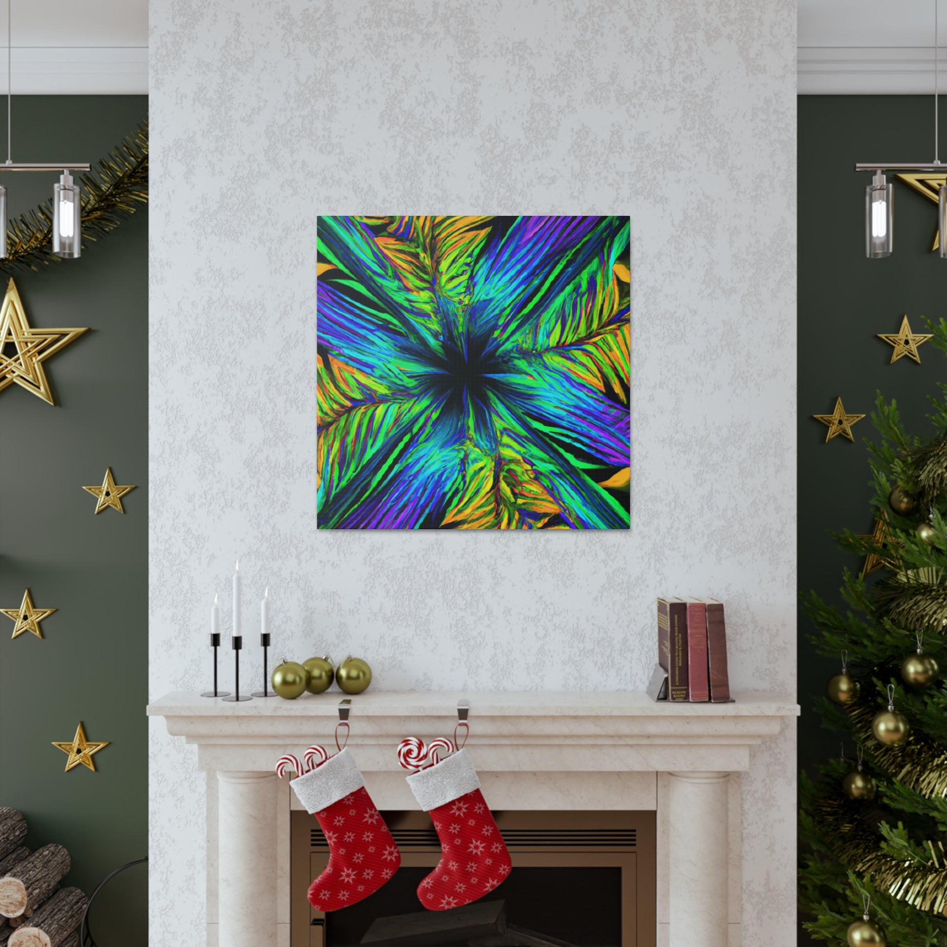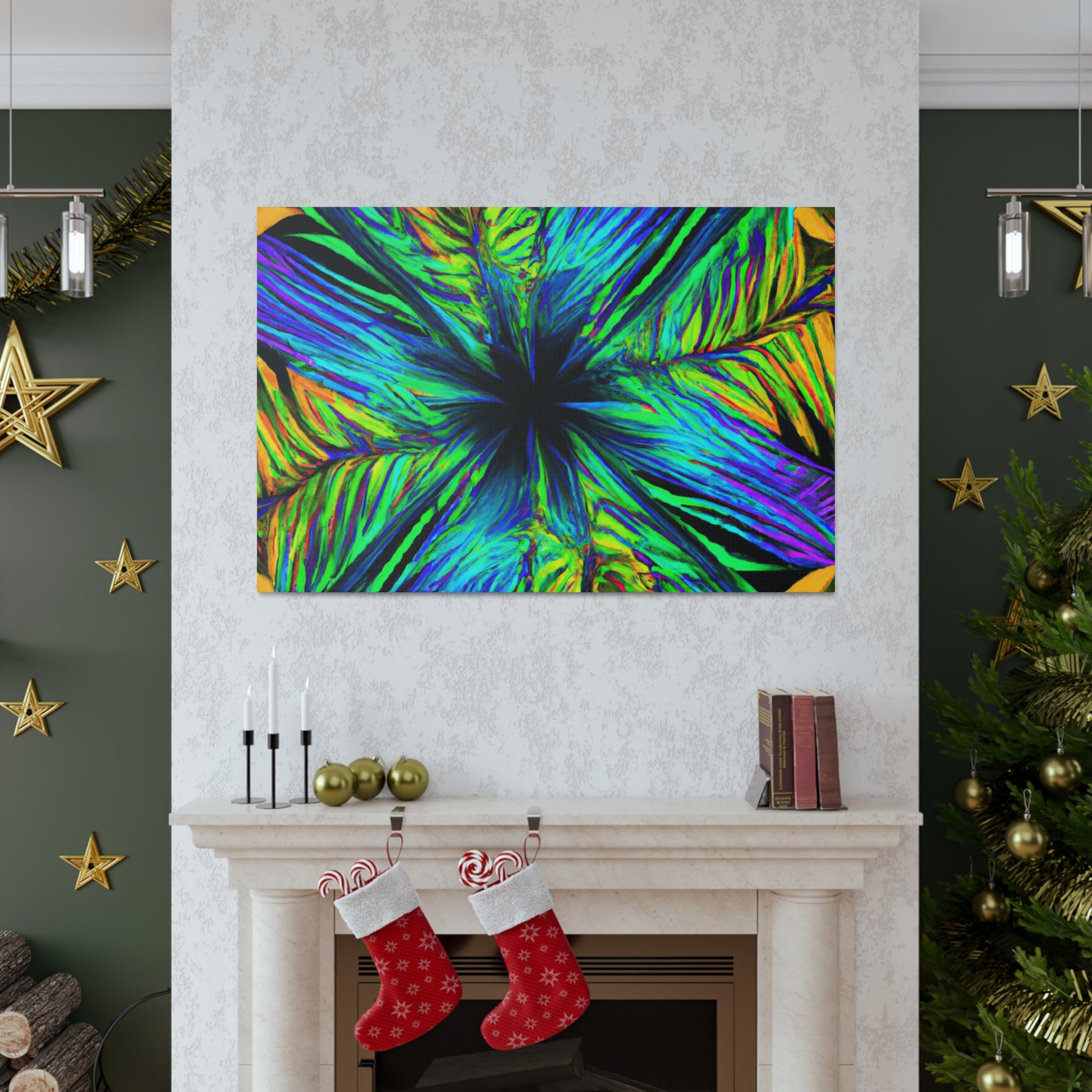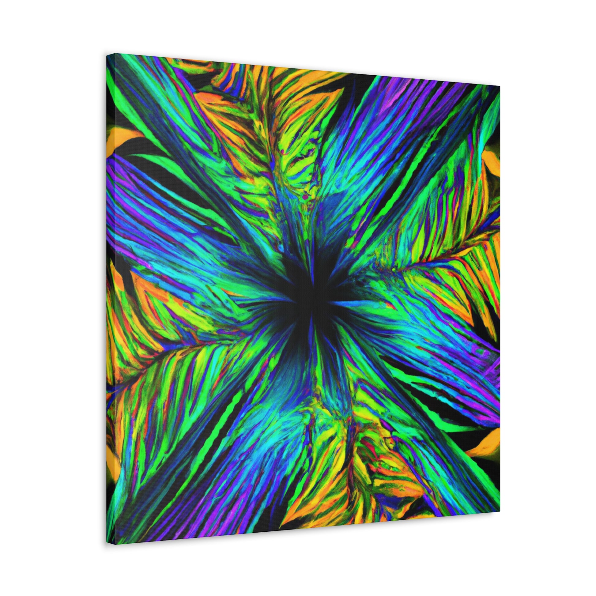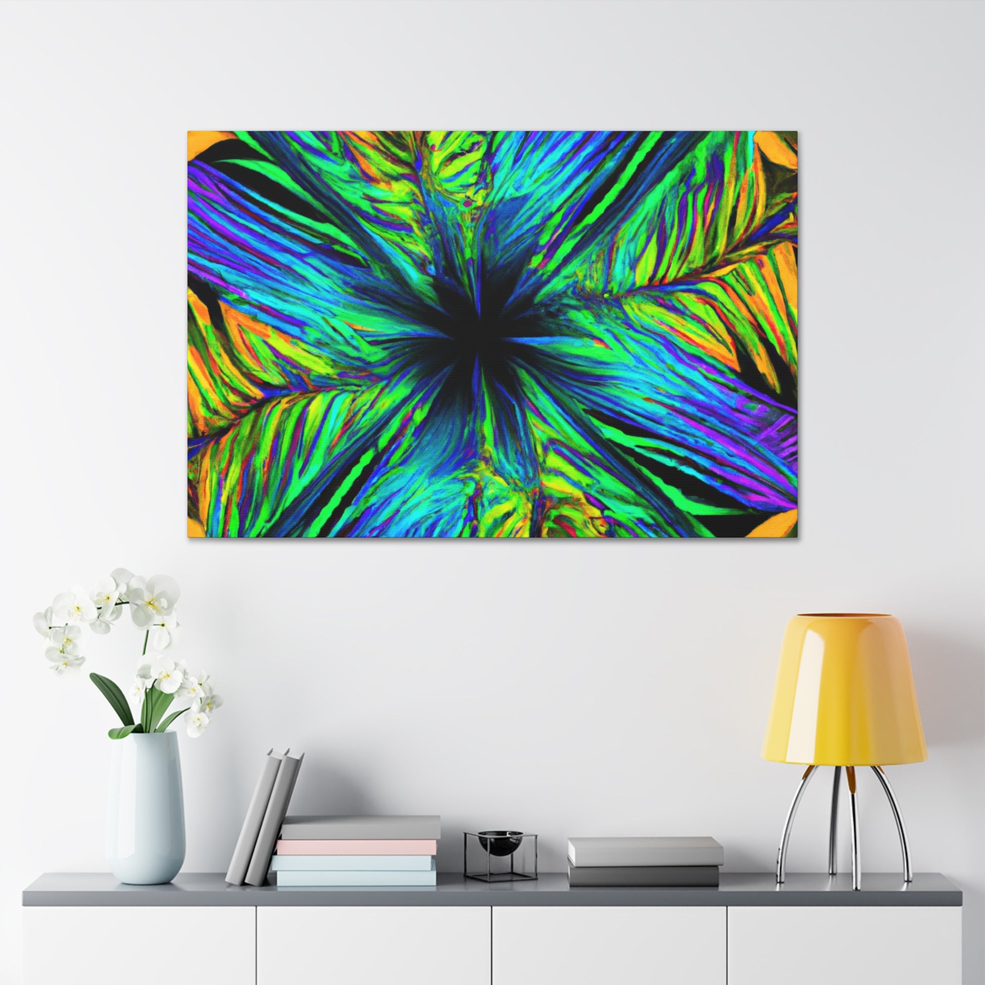 This vibrant abstract canvas art features a trippy geometric palm leaf and kaleidoscope design with 3D lines, fractals and a mix of vibrant, digital colors. It is an original work of art that looks amazing in any modern space and perfect for anyone looking to add a unique touch to their home decor! #trippy #geometric #palmleaves #kaleidoscope #abstractart #digitalart #vibrantcolors #3dlines #fractal #homedecor #art