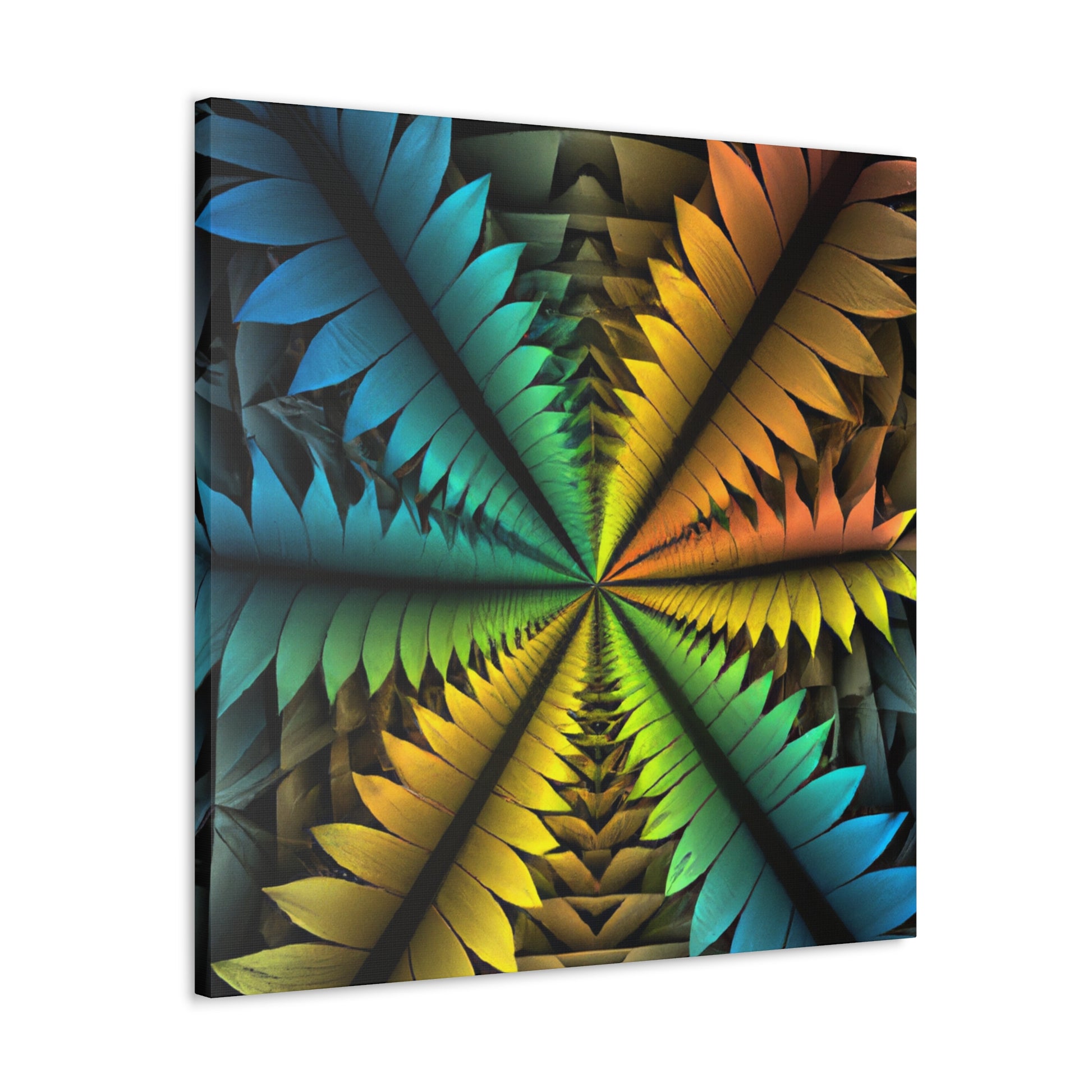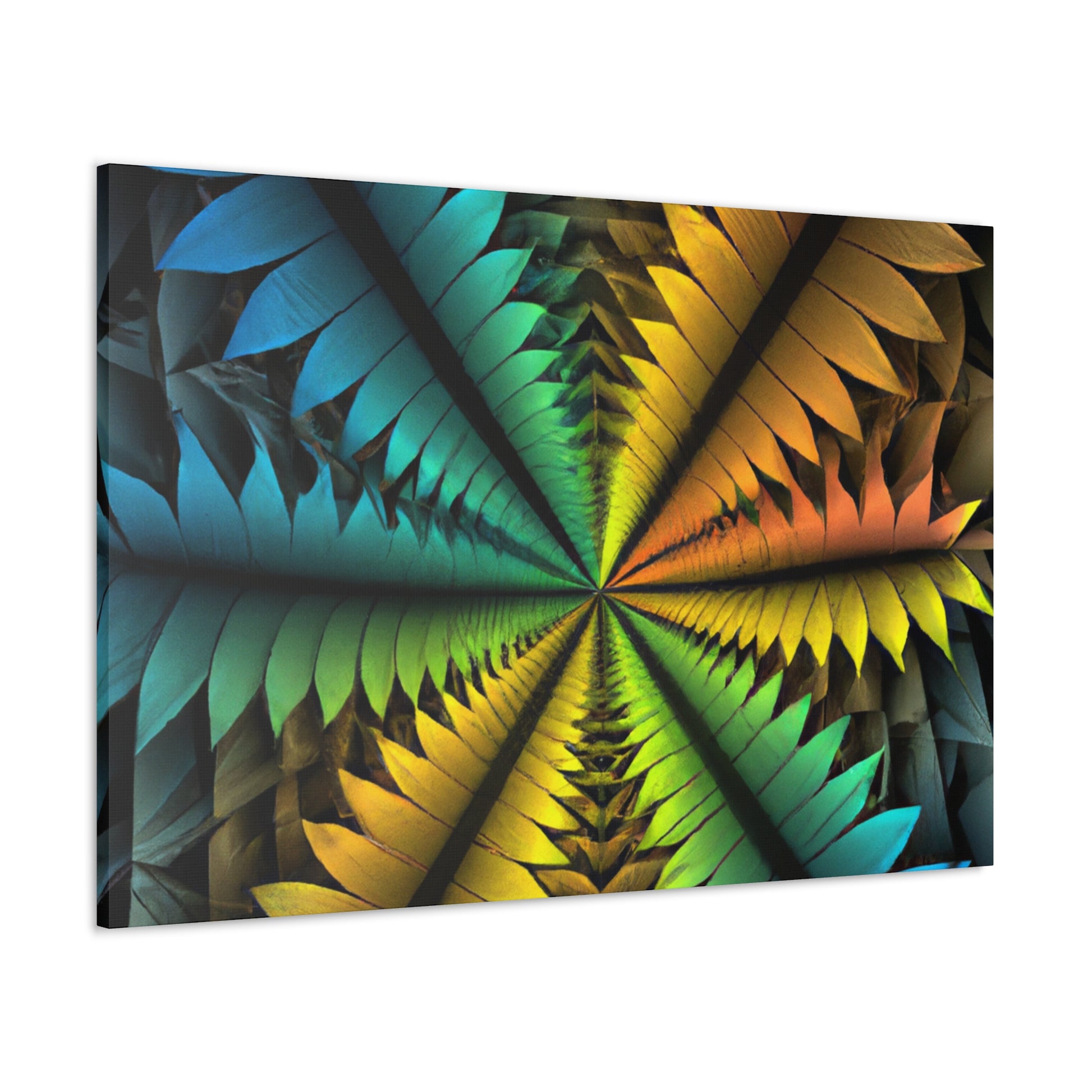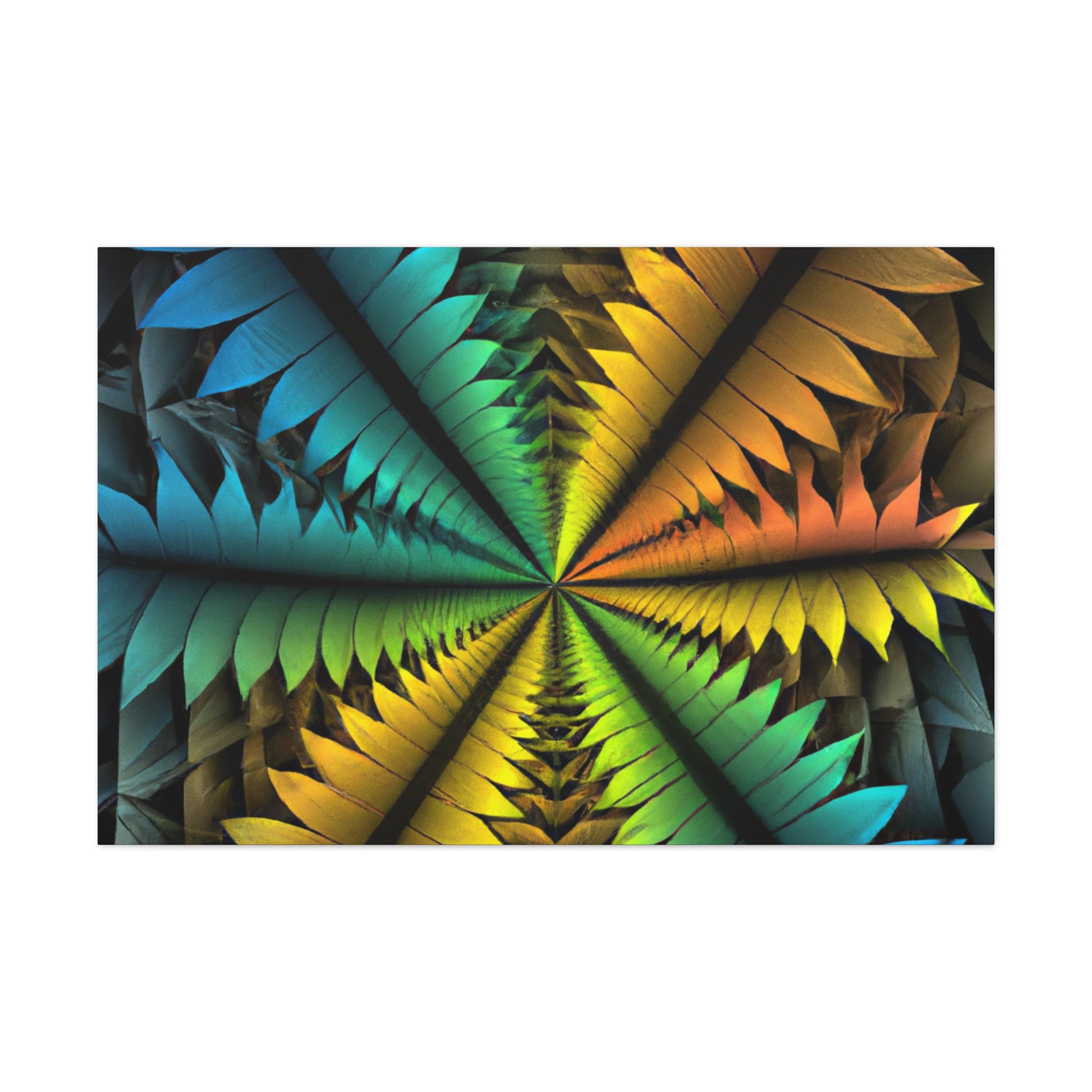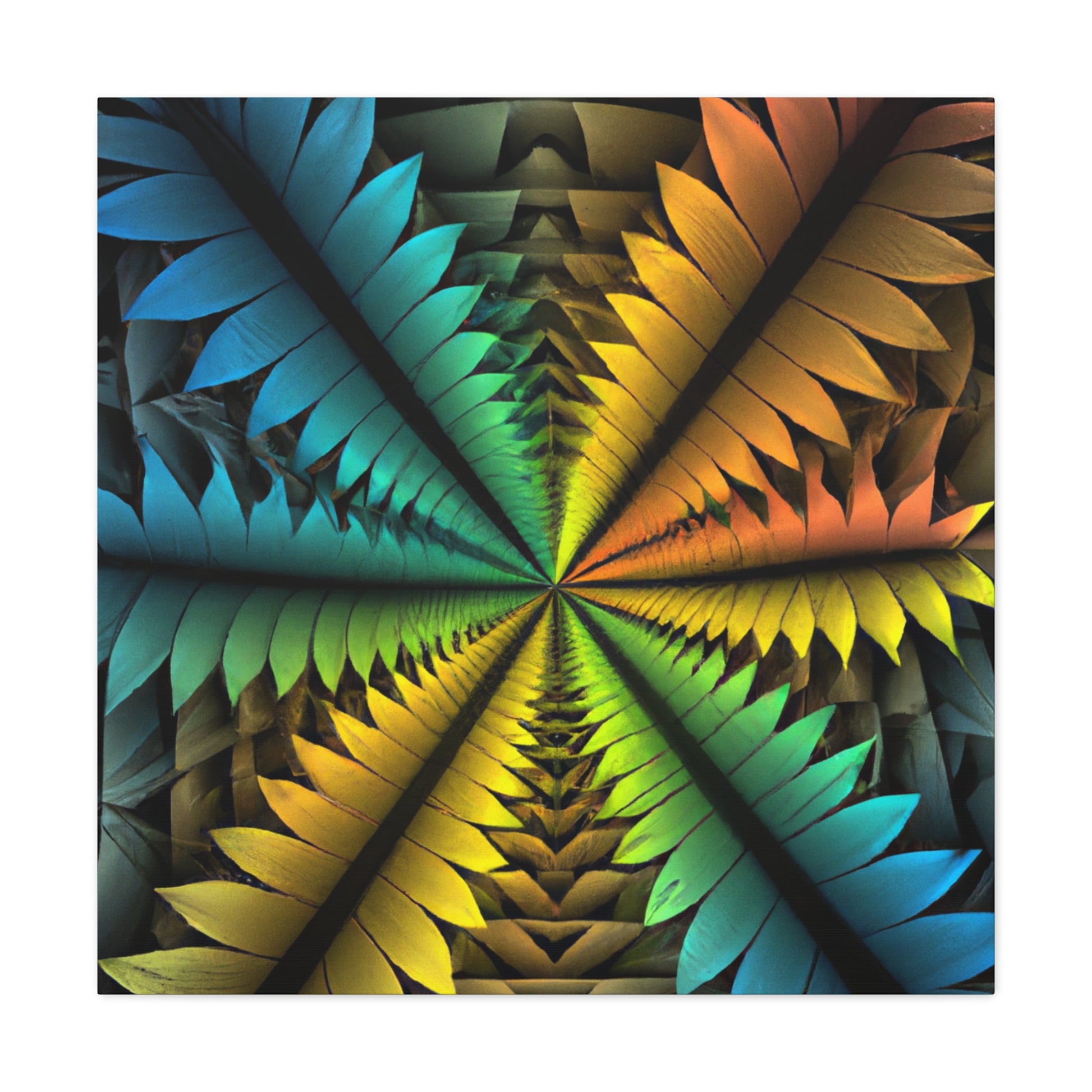 This canvas features a stunning mix of abstract techniques and colors, resulting in a kaleidoscopic work of art that will bring a unique, artistic element to your home. The image features trippy geometric palm leaves, vibrant colors, 3D lines, fractals, and digital art, all of which is sure to have your guests in awe. Get this one-of-a-kind piece of art today and bring an intriguing visual element into your home! #ArtCanvas #DigitalArt #UniqueArt #Geometric #AbstractArt #Kaleidoscope #Fractal #VisualArt #PalmLeaves #VibrantColors #3DLines