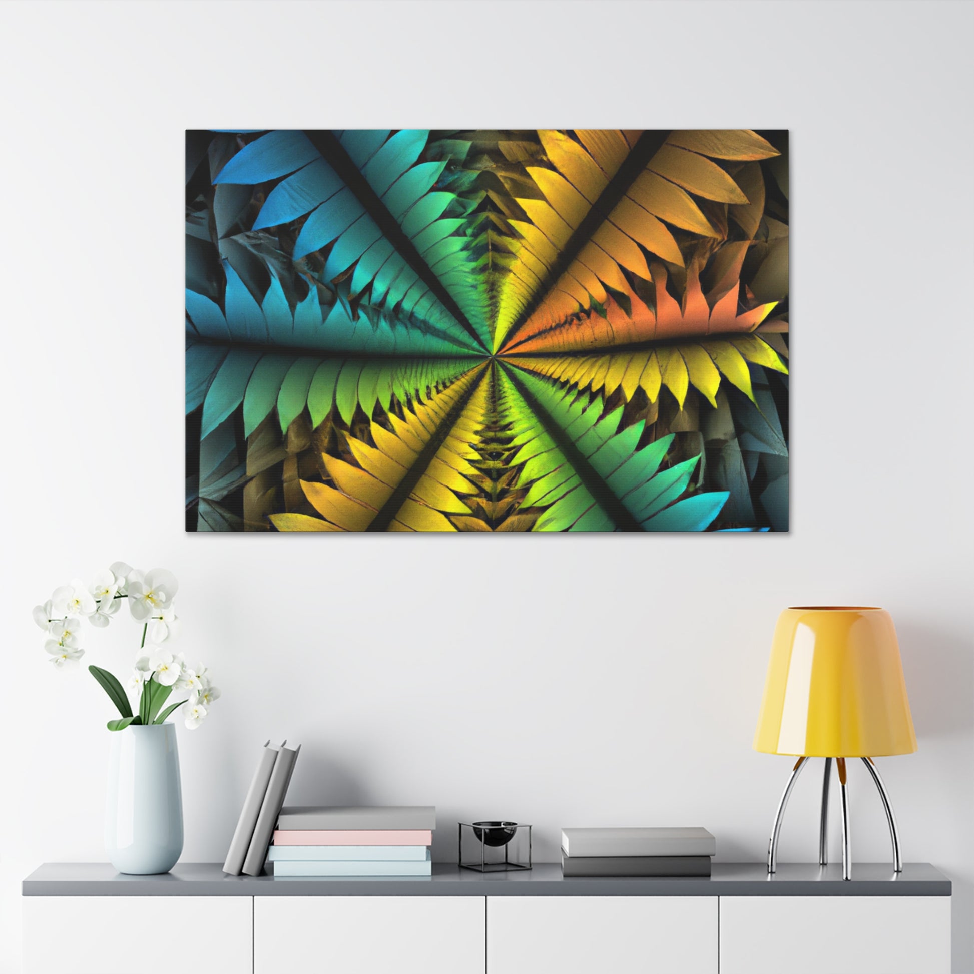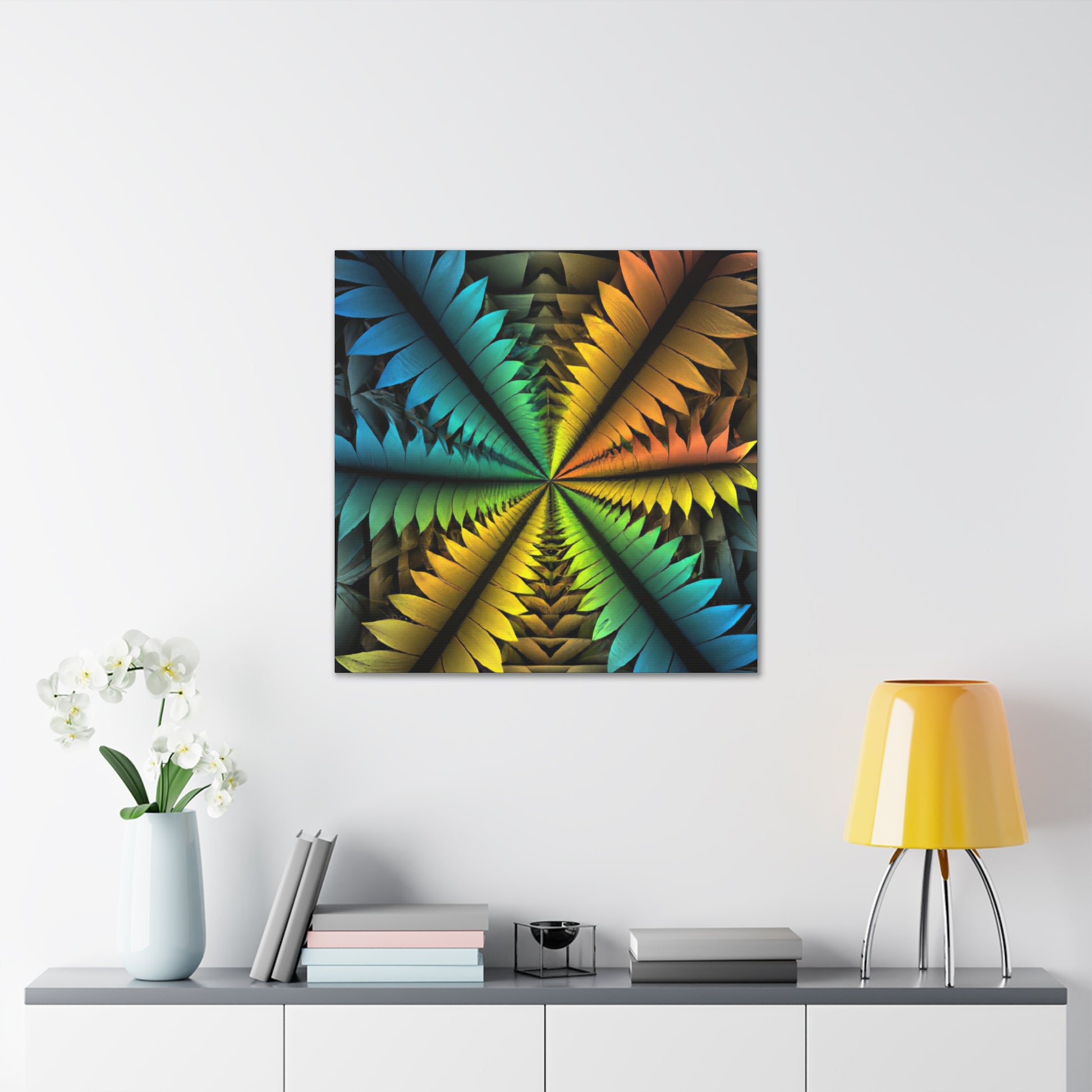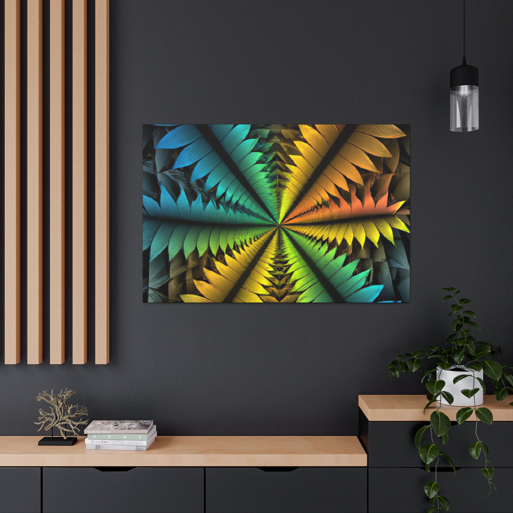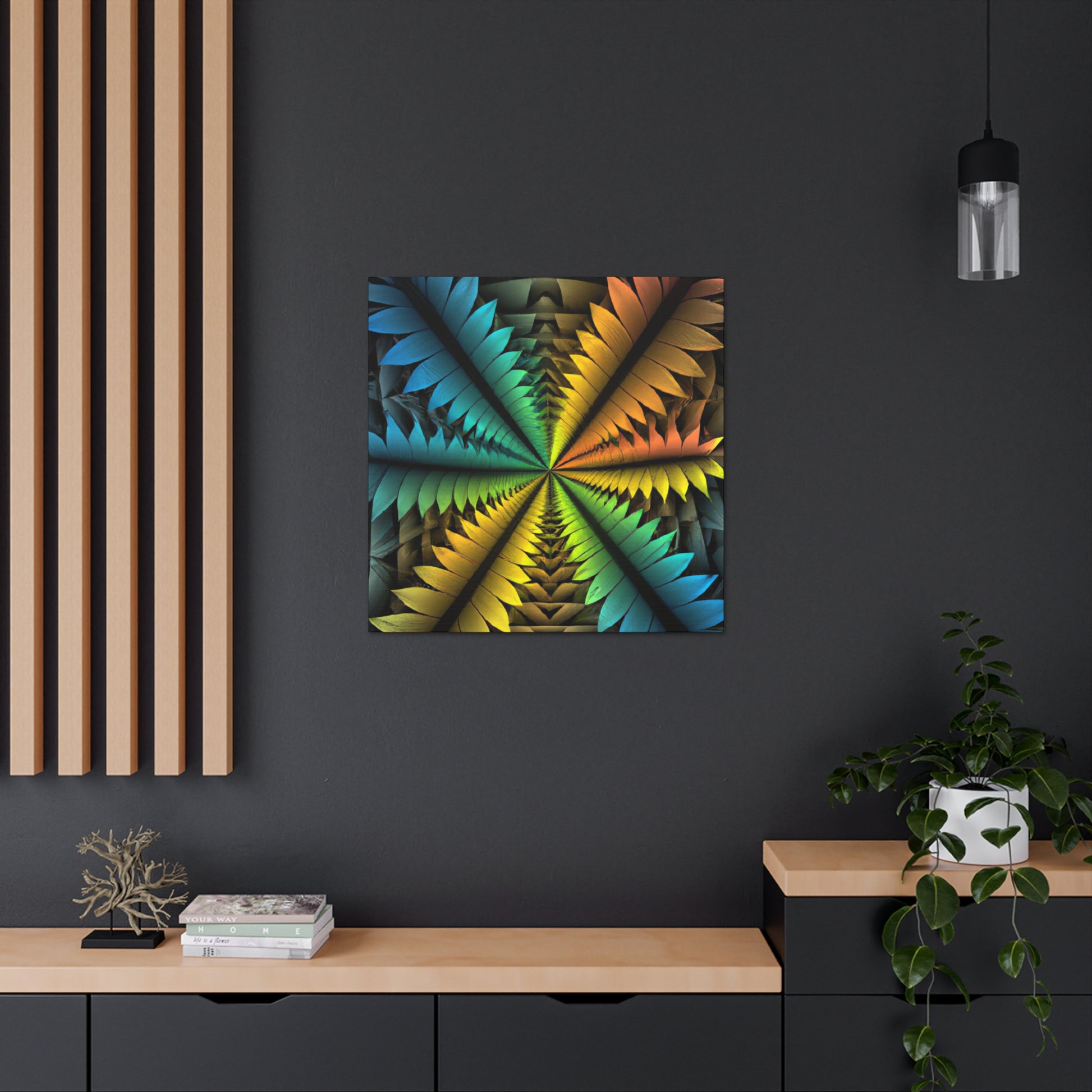 This canvas features a stunning mix of abstract techniques and colors, resulting in a kaleidoscopic work of art that will bring a unique, artistic element to your home. The image features trippy geometric palm leaves, vibrant colors, 3D lines, fractals, and digital art, all of which is sure to have your guests in awe. Get this one-of-a-kind piece of art today and bring an intriguing visual element into your home! #ArtCanvas #DigitalArt #UniqueArt #Geometric #AbstractArt #Kaleidoscope #Fractal #VisualArt #PalmLeaves #VibrantColors #3DLines