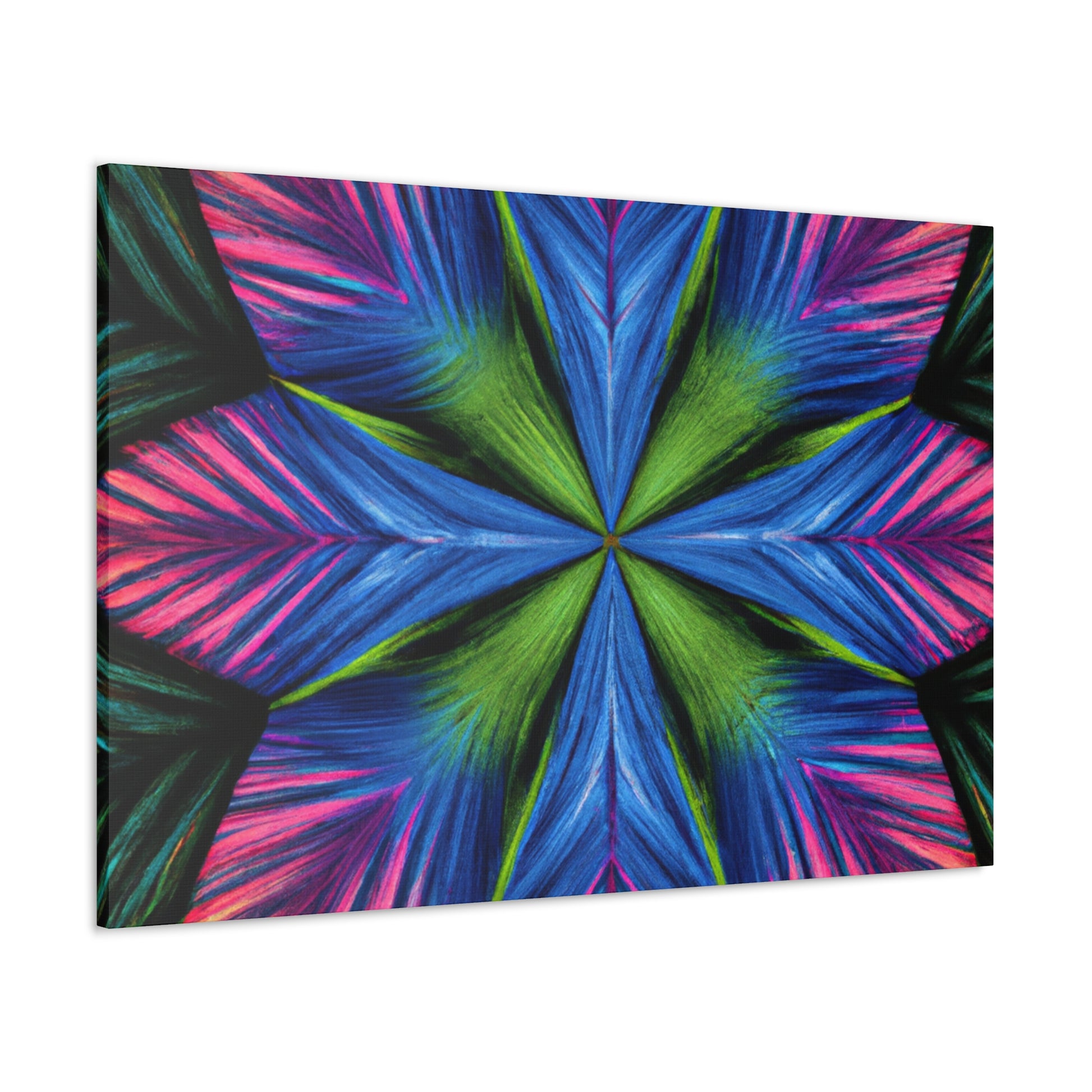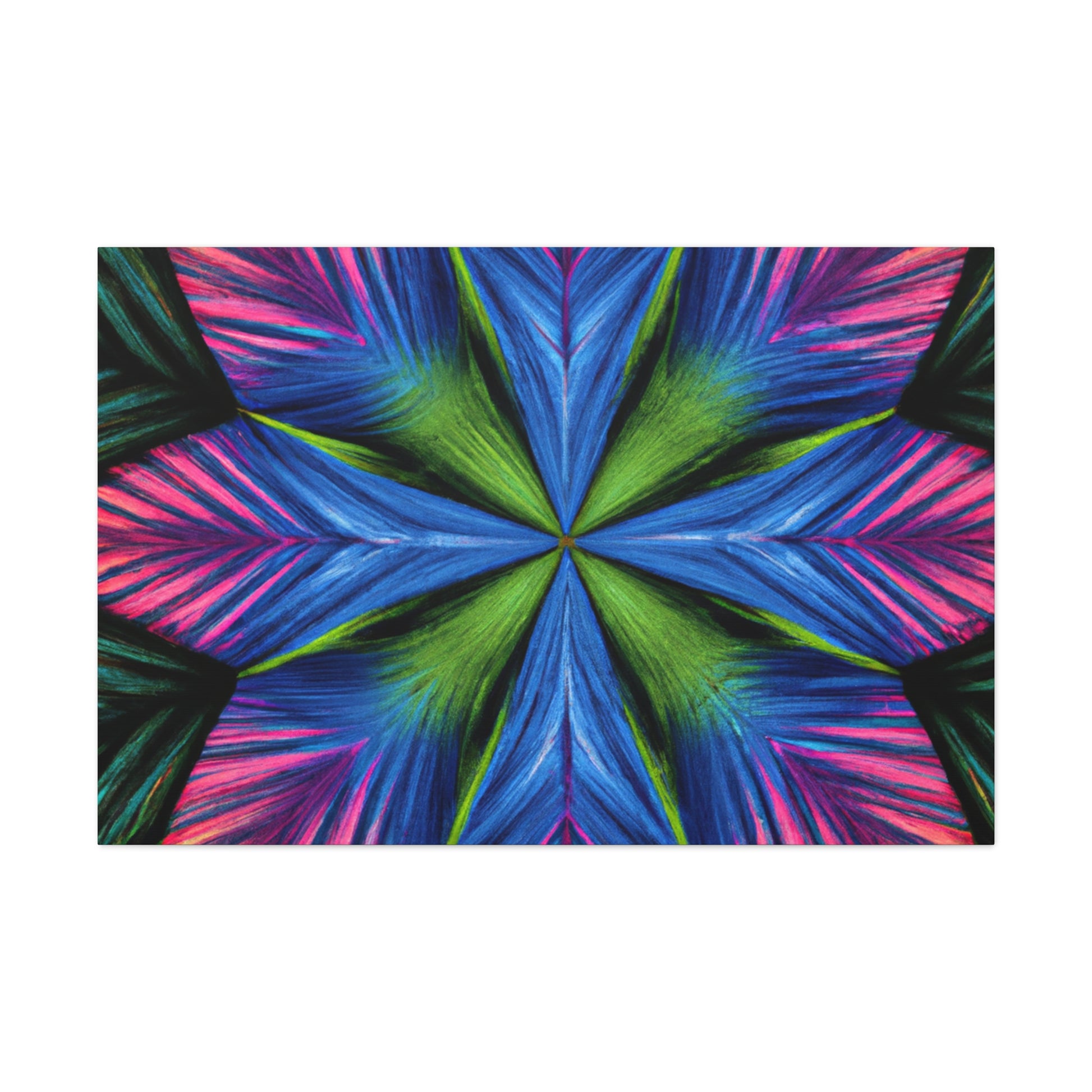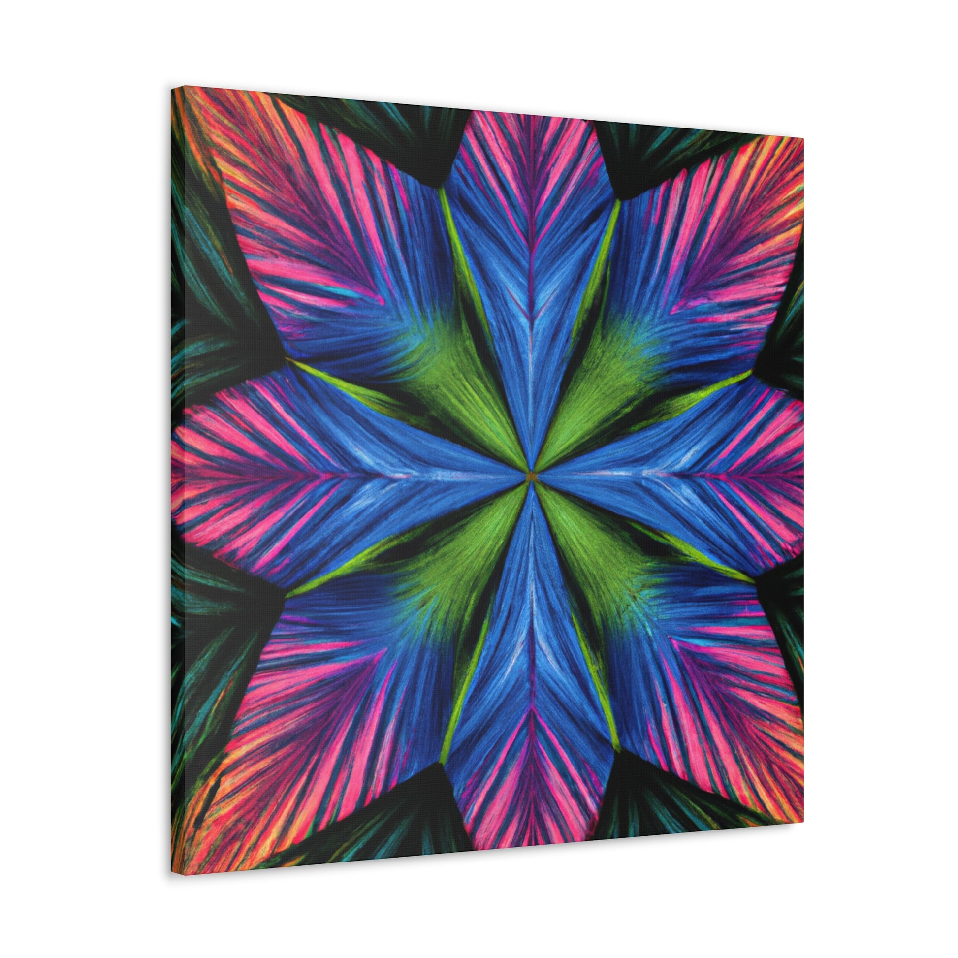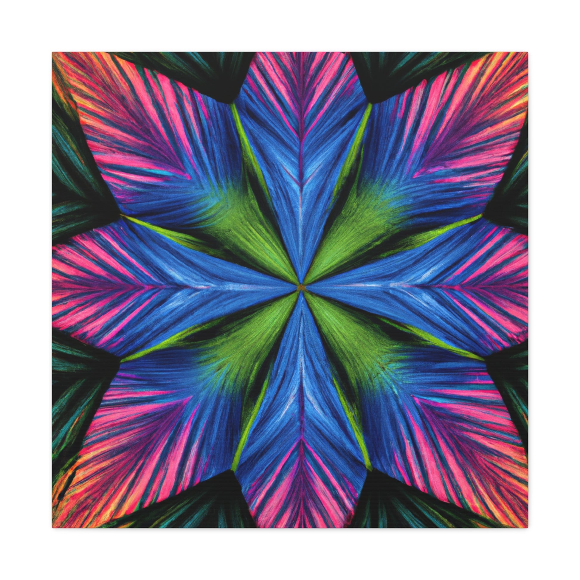 This canvas print features a vibrant abstract digital art filled with trippy geometric palm leaves, kaleidoscope, 3D lines, and fractal. The lively colors and textures create a stunning 3D effect that will dazzle your home or office. Add some modern flair to your wall décor and bring some bold energy int your space. #abstract #digitalart #vibrantcolors #3Dlines #fractal #trippy #geometric #palmleaves #kaleidoscope #canvasprint #homeoffice