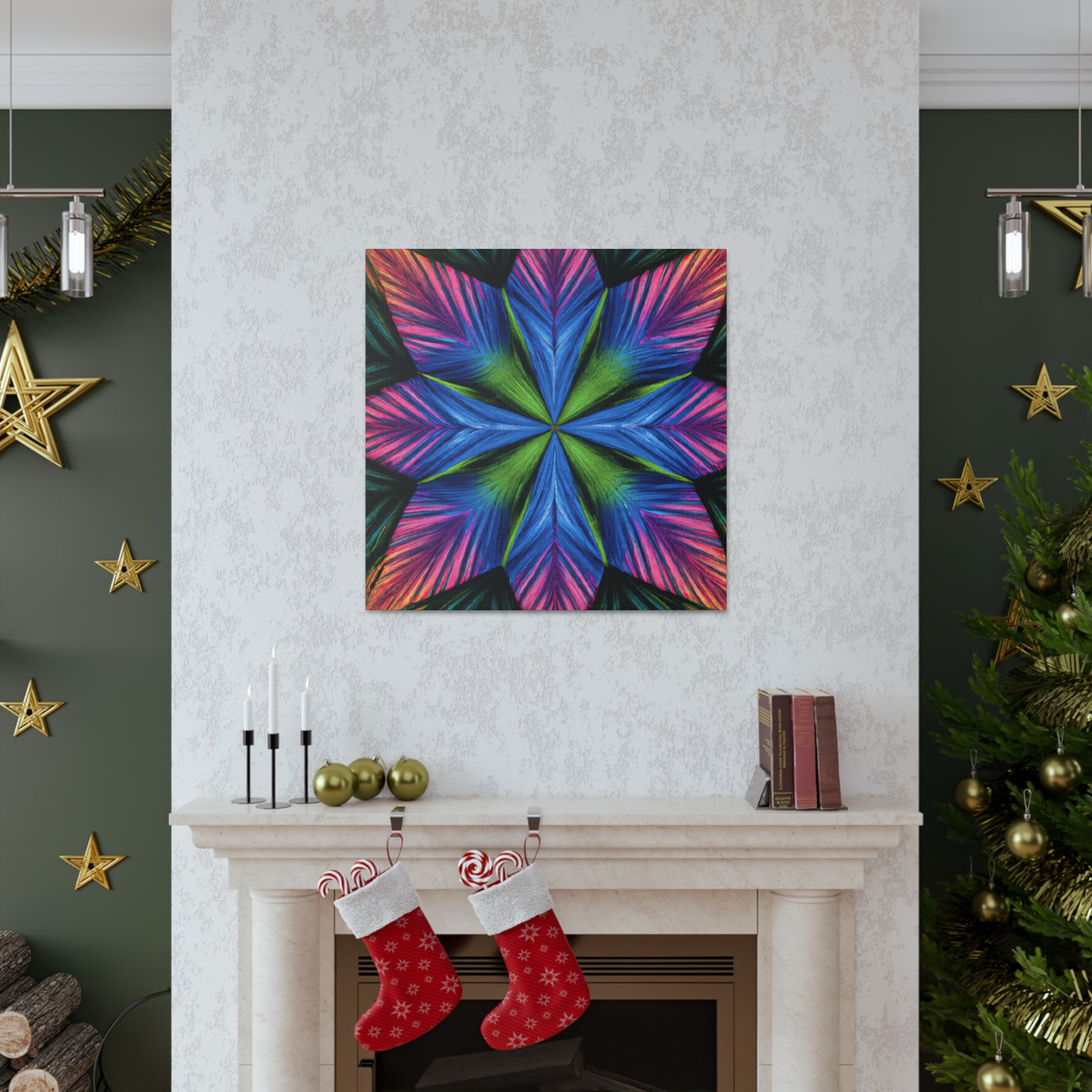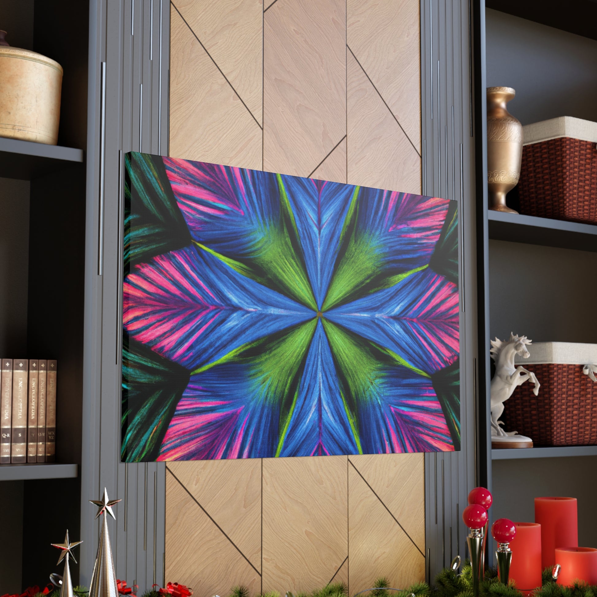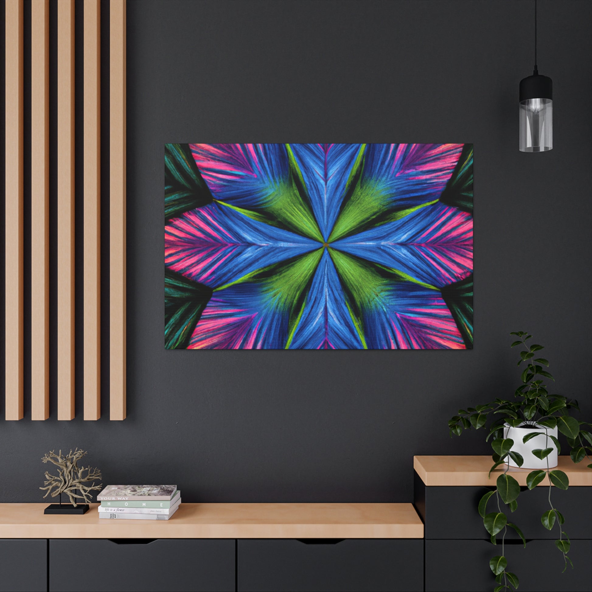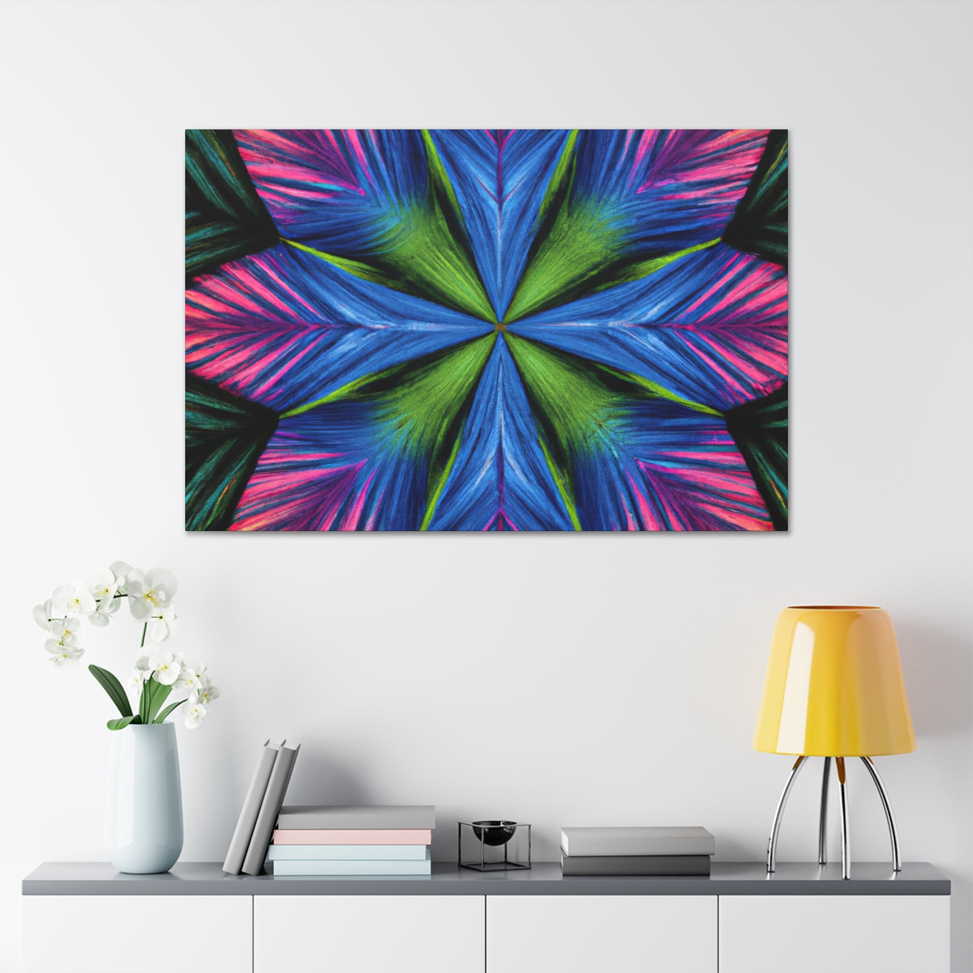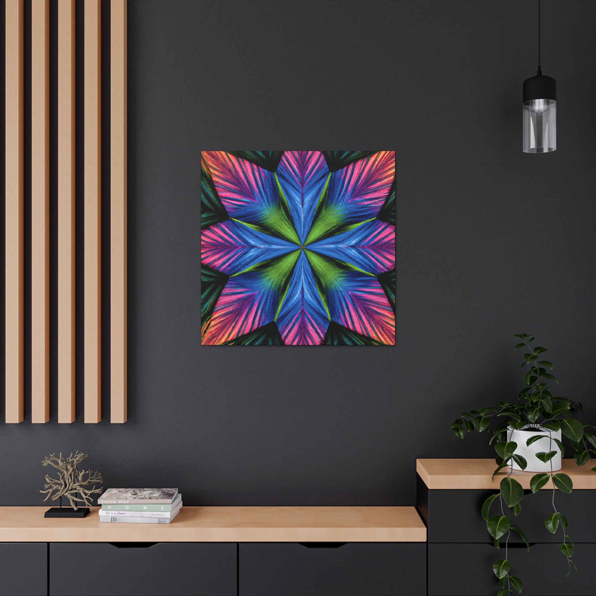 This canvas print features a vibrant abstract digital art filled with trippy geometric palm leaves, kaleidoscope, 3D lines, and fractal. The lively colors and textures create a stunning 3D effect that will dazzle your home or office. Add some modern flair to your wall décor and bring some bold energy int your space. #abstract #digitalart #vibrantcolors #3Dlines #fractal #trippy #geometric #palmleaves #kaleidoscope #canvasprint #homeoffice