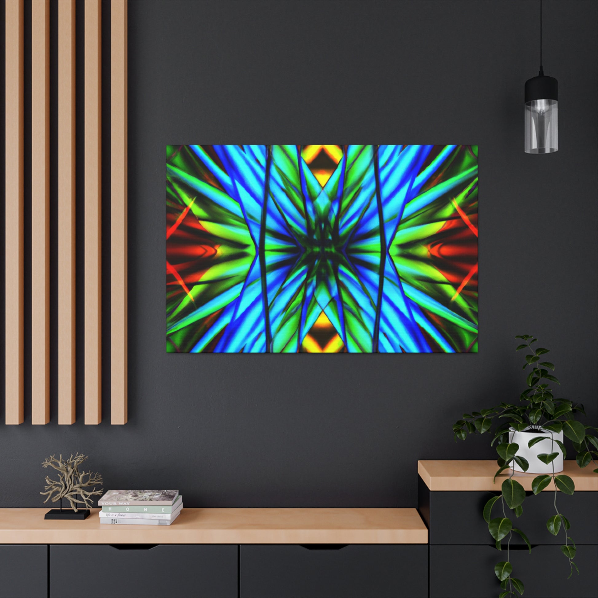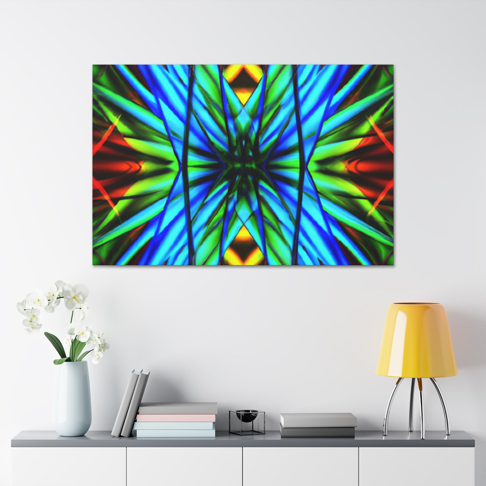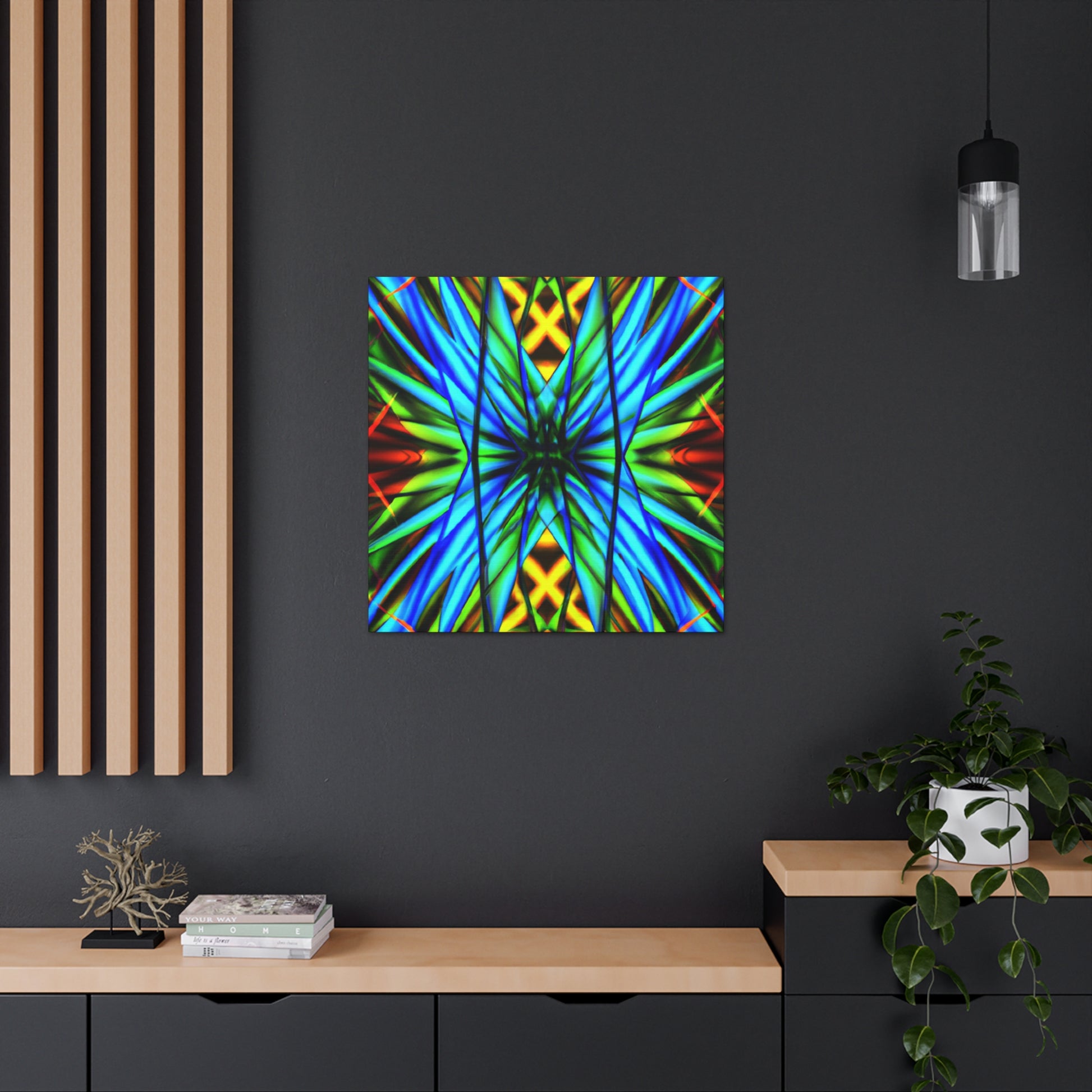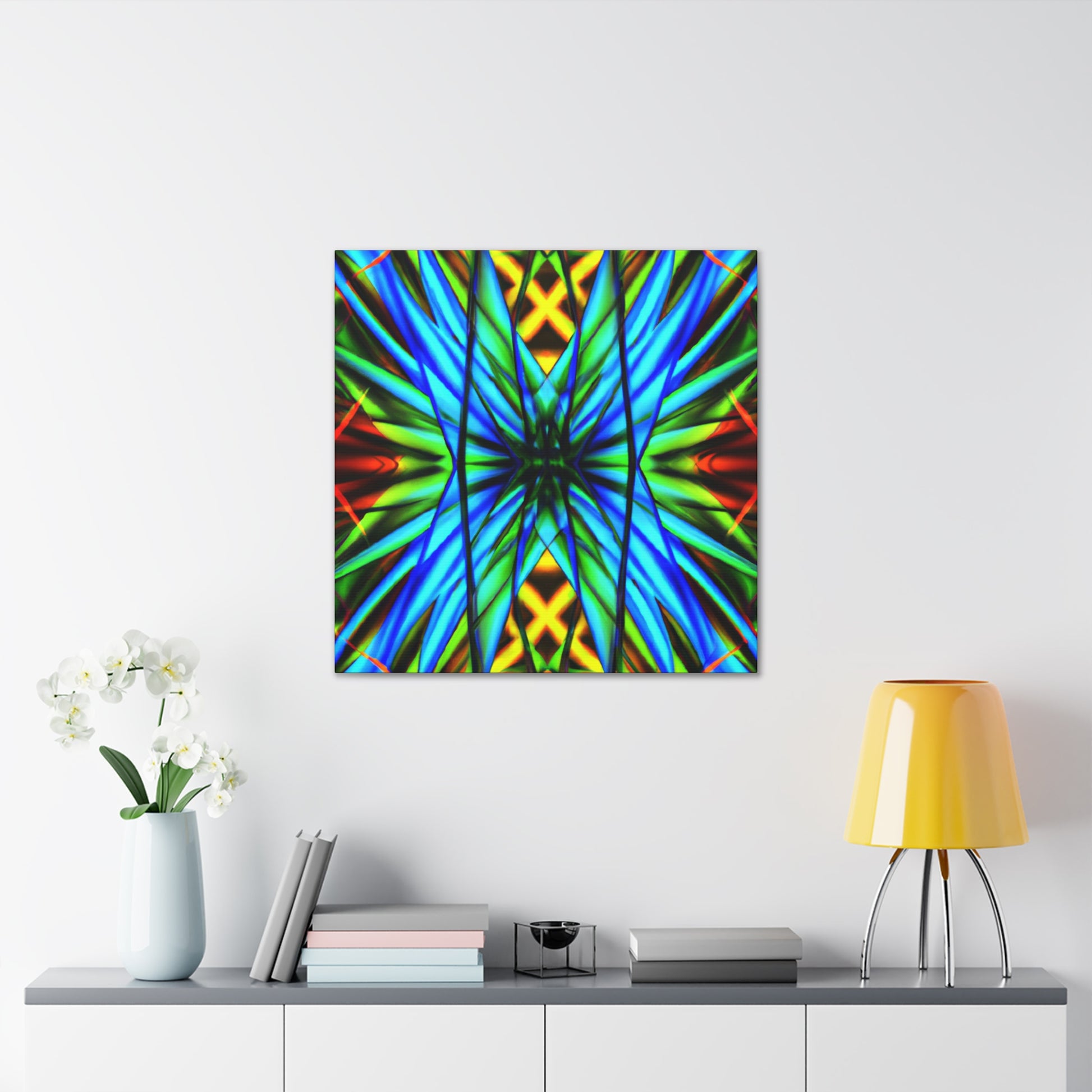 This canvas is a great addition to any home. It features a Trippy Geometric Palm Leaves, Kaleidoscope, Abstract, Digital Art, Vibrant Colors, 3D Lines, and Fractal, creating a visually stimulating effect. Whether it's in the bedroom, living room, office, or any other space, it will add an interesting and unique layer to any decor. #trippy #geometric #palmleaves #kaleidscope #abstract #digitalart #vibrantcolors #3Dlines #fractal #canvasart #homeart