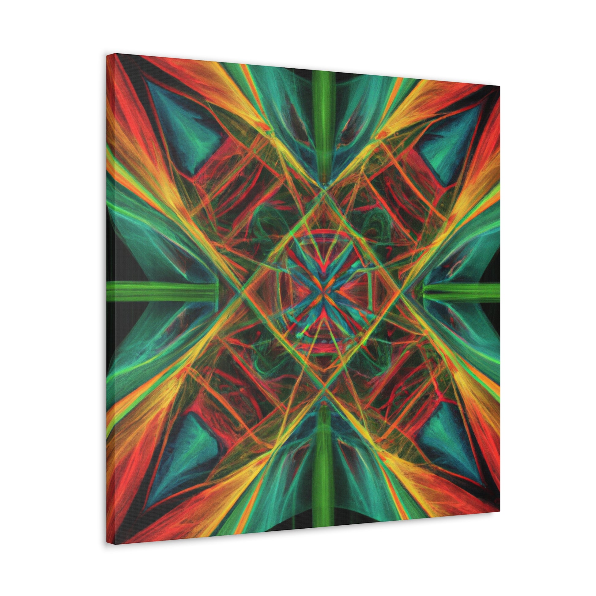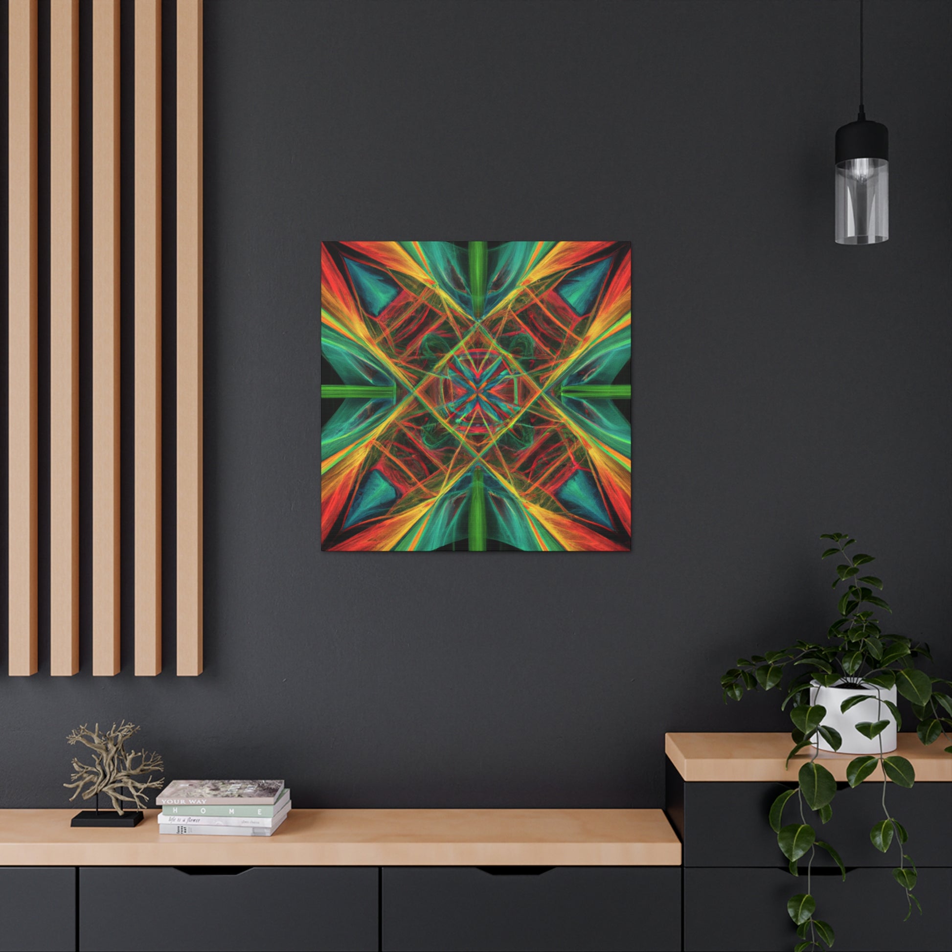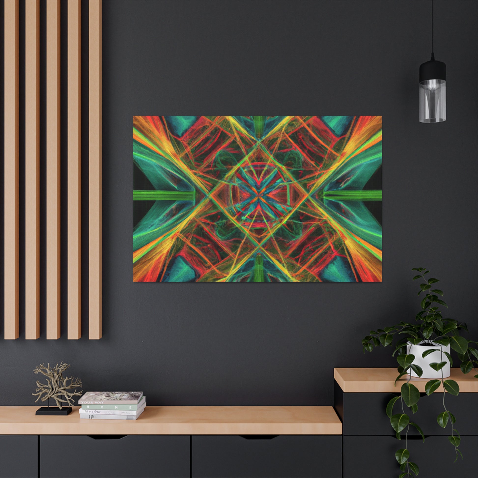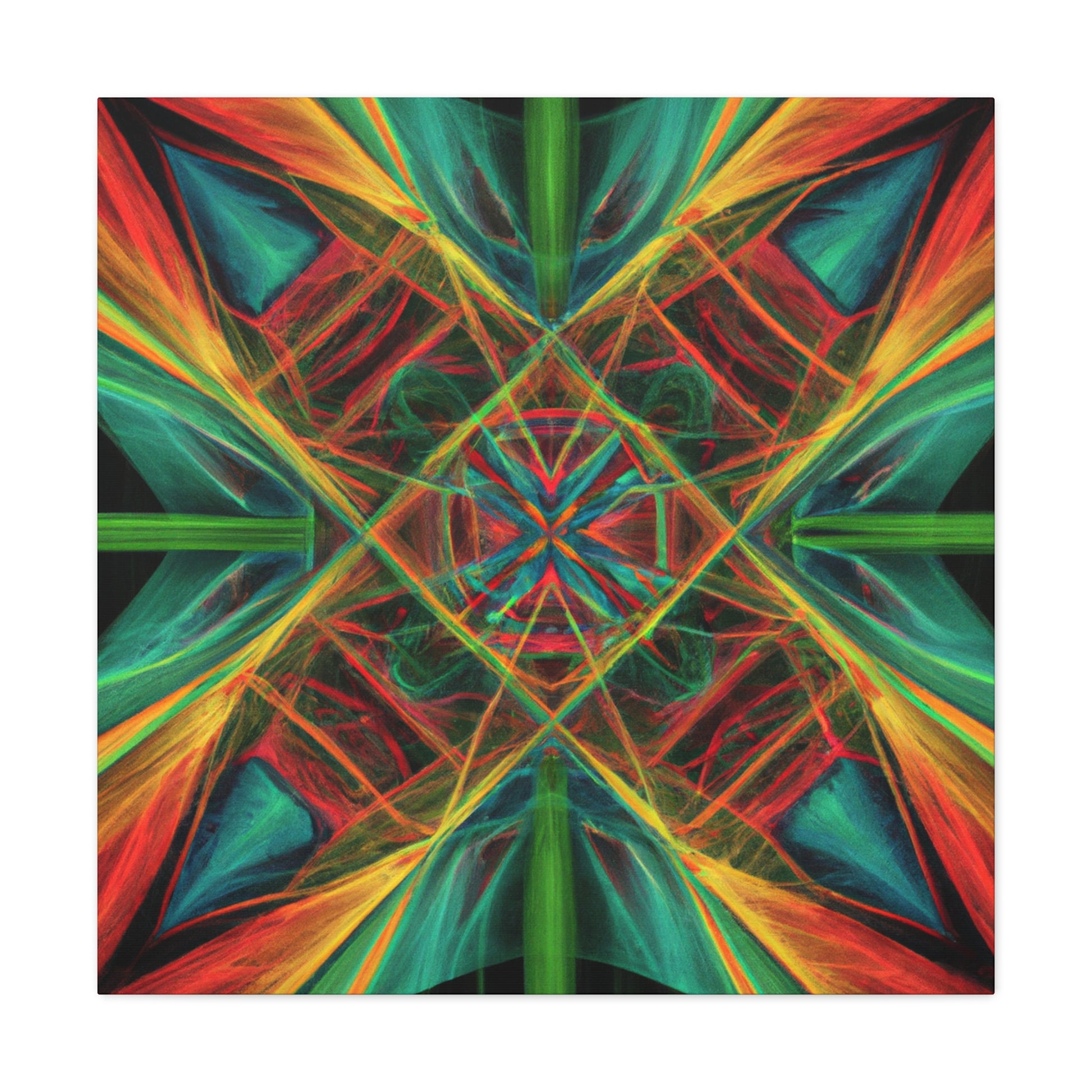 You'll love the brilliant combination of vibrant colors, 3D lines, and fractal collage art in this canvas. Trippy geometric palm leaves, kaleidoscope, abstract shapes, and digital art give this wall hanging extra depth and a dreamy feel. This unique piece will make any space feel daring and stylish, with its creative bursts of color and energy! #abstractart #wallhanging #canvasart #modernart #fractalart #kaleidoscope #palmleaves #colors #digitalart #3dlines #vibrant #artlovers