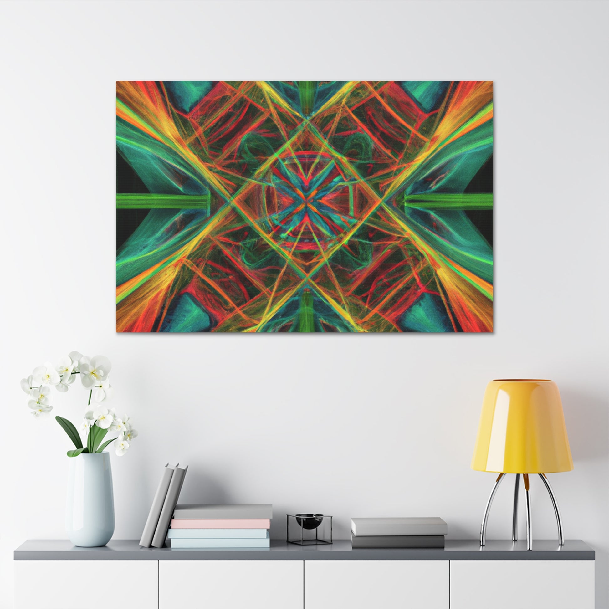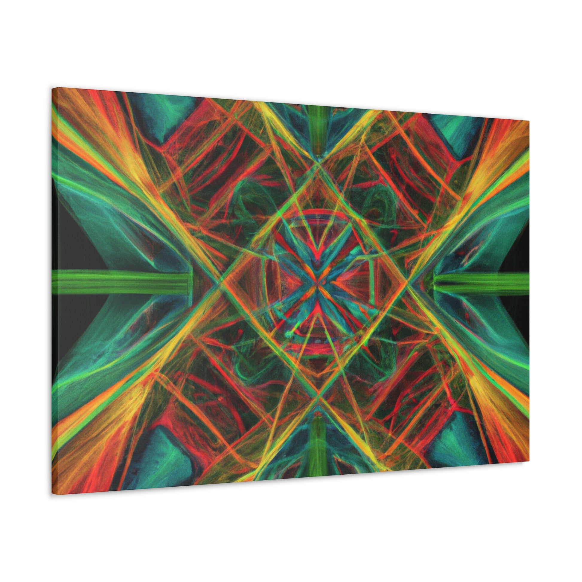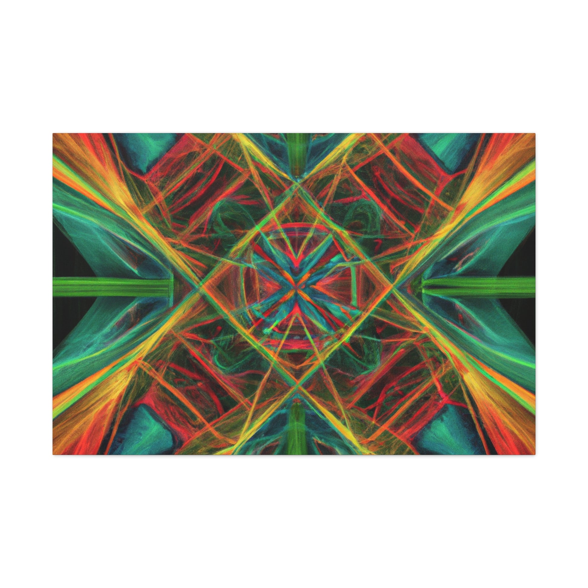 You'll love the brilliant combination of vibrant colors, 3D lines, and fractal collage art in this canvas. Trippy geometric palm leaves, kaleidoscope, abstract shapes, and digital art give this wall hanging extra depth and a dreamy feel. This unique piece will make any space feel daring and stylish, with its creative bursts of color and energy! #abstractart #wallhanging #canvasart #modernart #fractalart #kaleidoscope #palmleaves #colors #digitalart #3dlines #vibrant #artlovers
