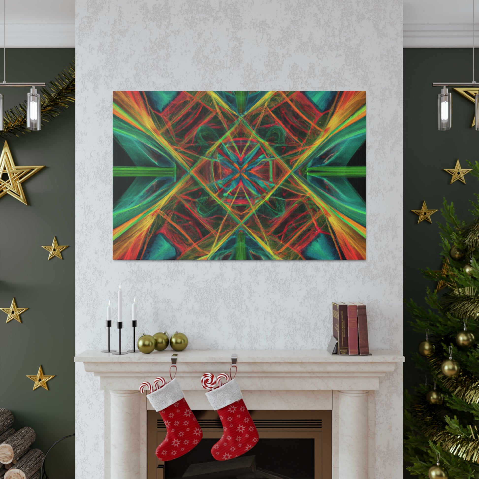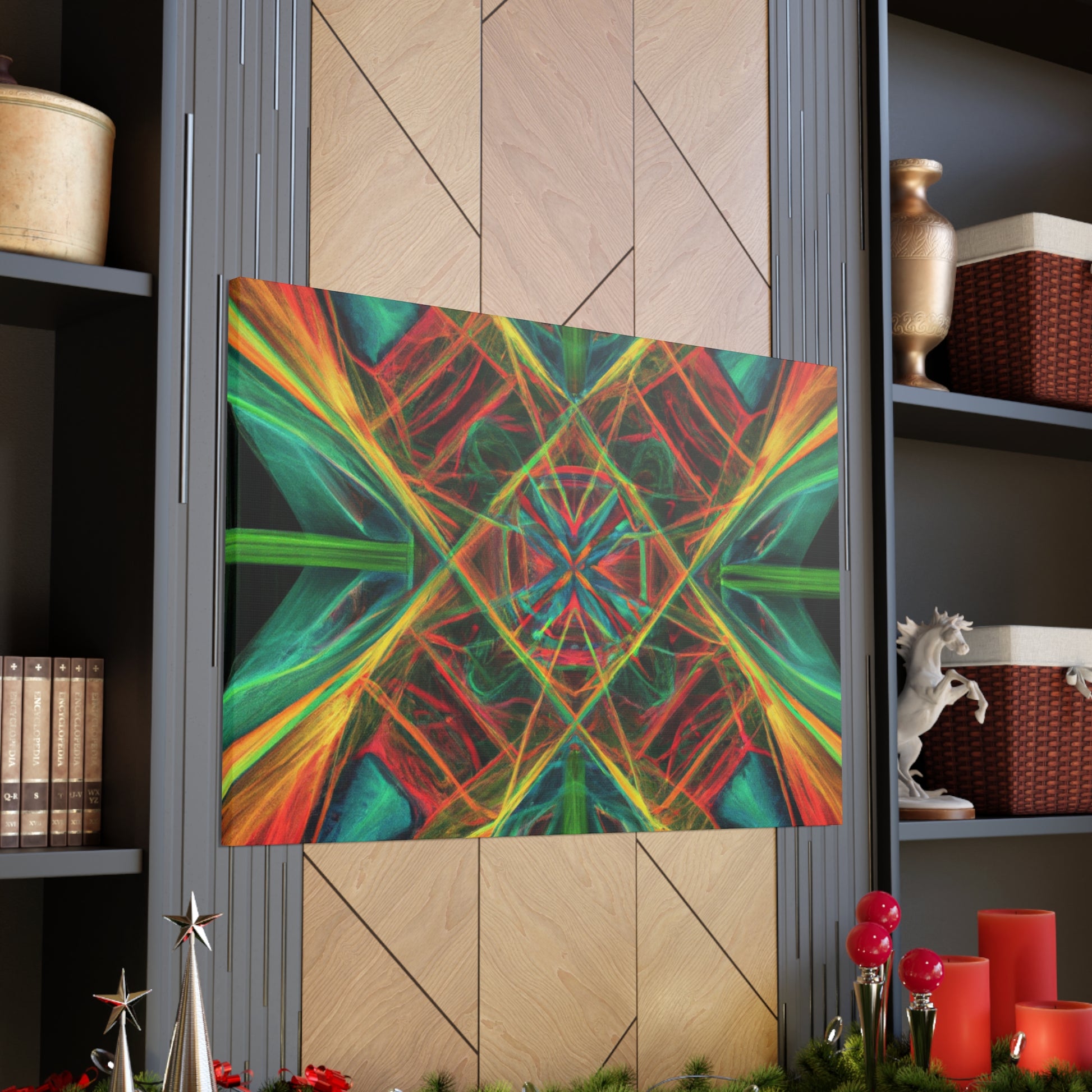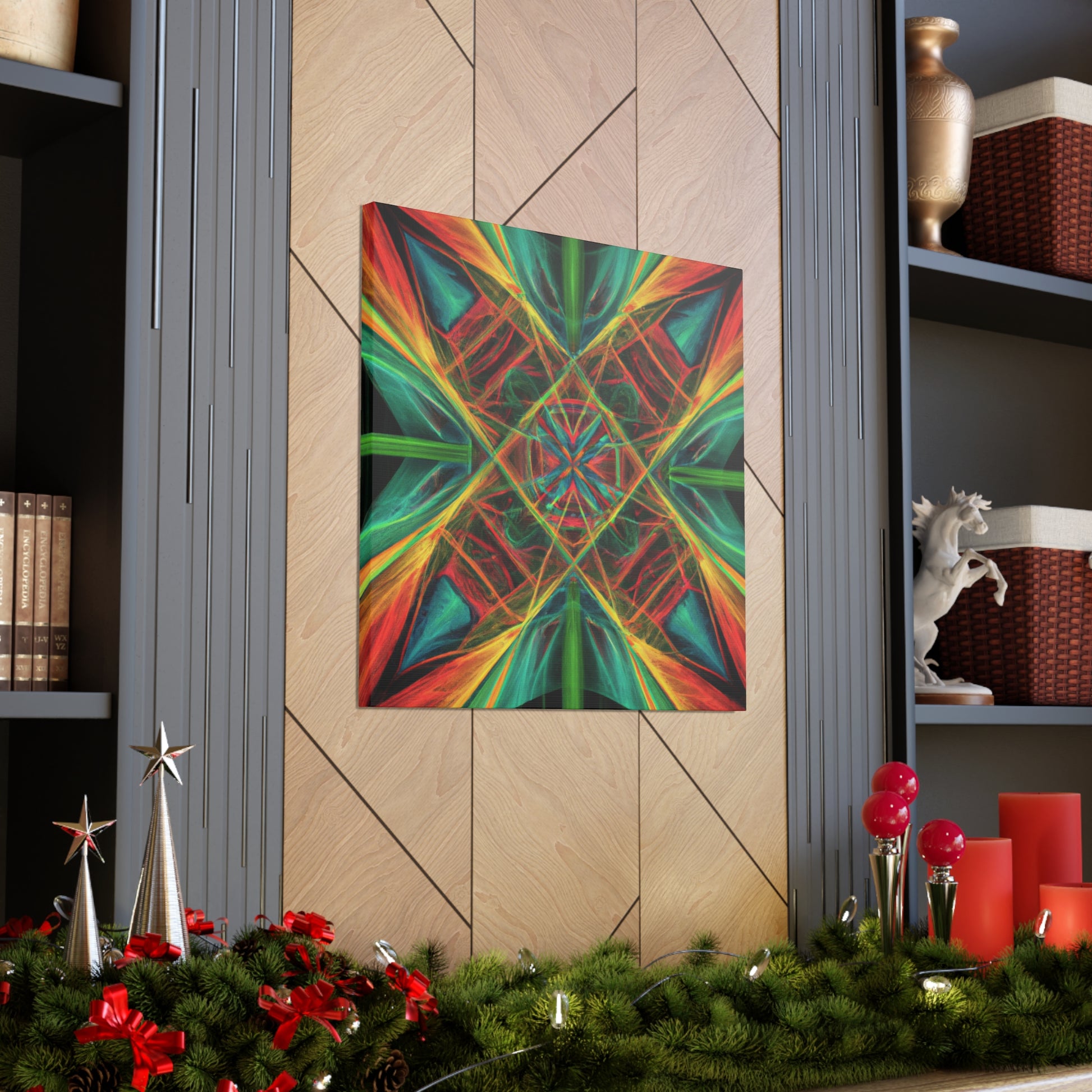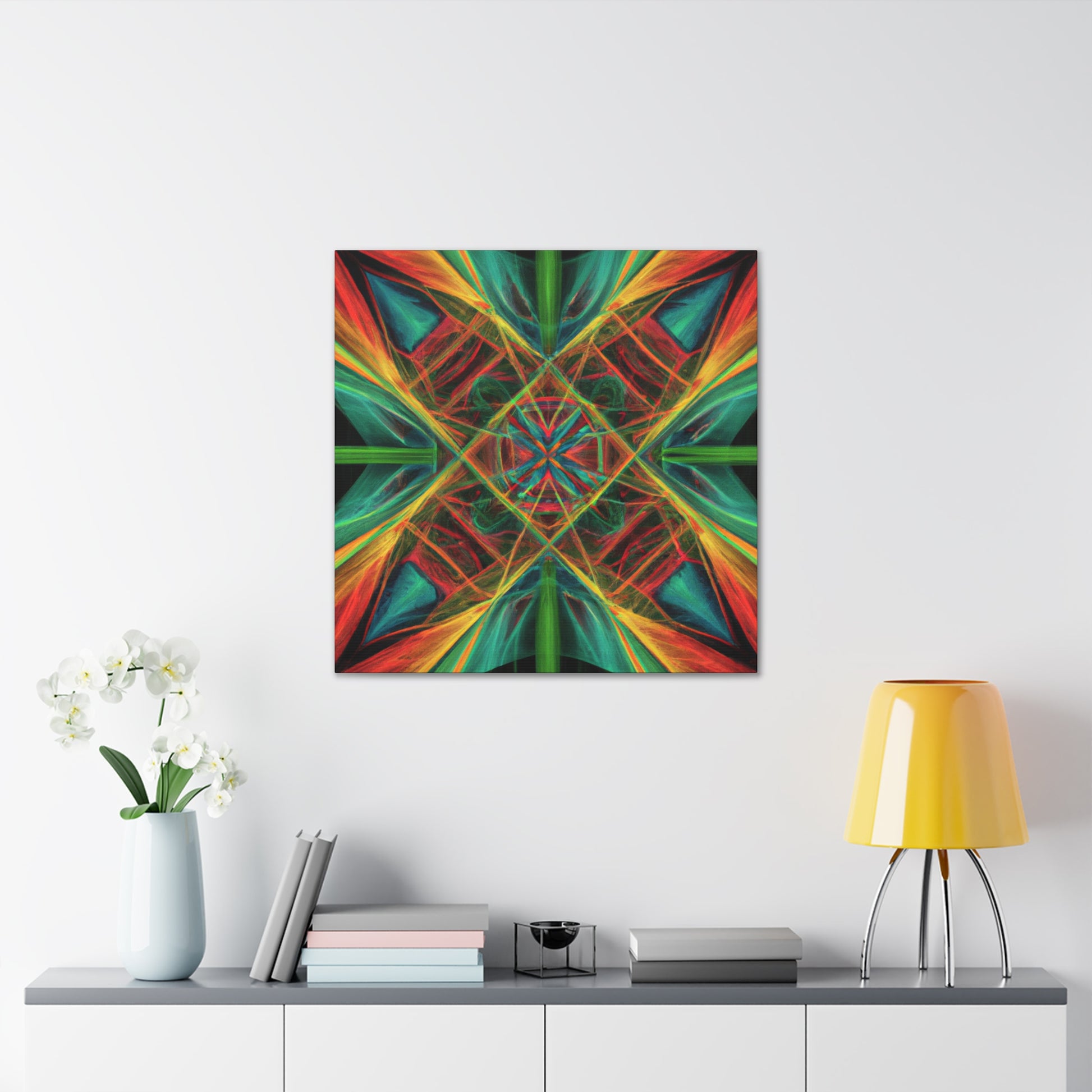 You'll love the brilliant combination of vibrant colors, 3D lines, and fractal collage art in this canvas. Trippy geometric palm leaves, kaleidoscope, abstract shapes, and digital art give this wall hanging extra depth and a dreamy feel. This unique piece will make any space feel daring and stylish, with its creative bursts of color and energy! #abstractart #wallhanging #canvasart #modernart #fractalart #kaleidoscope #palmleaves #colors #digitalart #3dlines #vibrant #artlovers