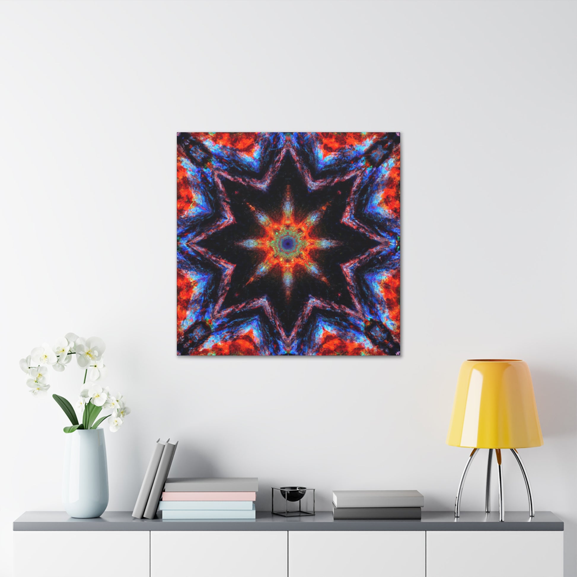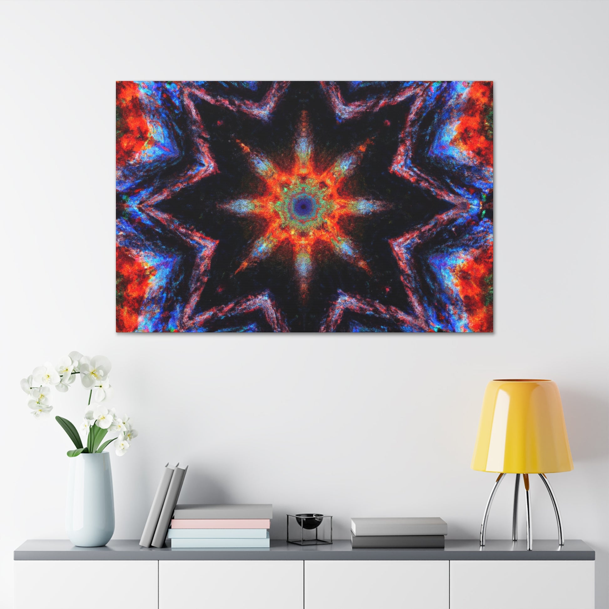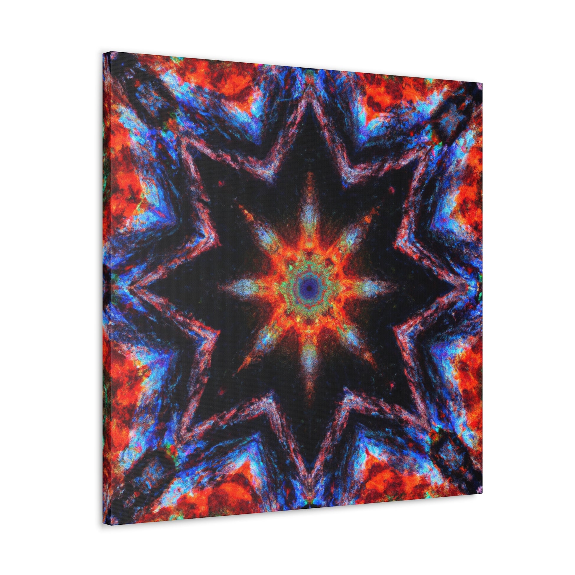 This unique canvas art is a blend of abstract digital art and kaleidoscope design with vibrant colors. The eye-catching symmetrical design is HD quality, making it perfect to hang up and give your room an instant makeover. Brighten up any space with this one-of-a-kind Trippy stars design! #trippystars #kaleidoscope #abstractart #digitalart #vividcolors #hdquality #symmetrical #canvasart #roomdecor #wallart #hdcanvas