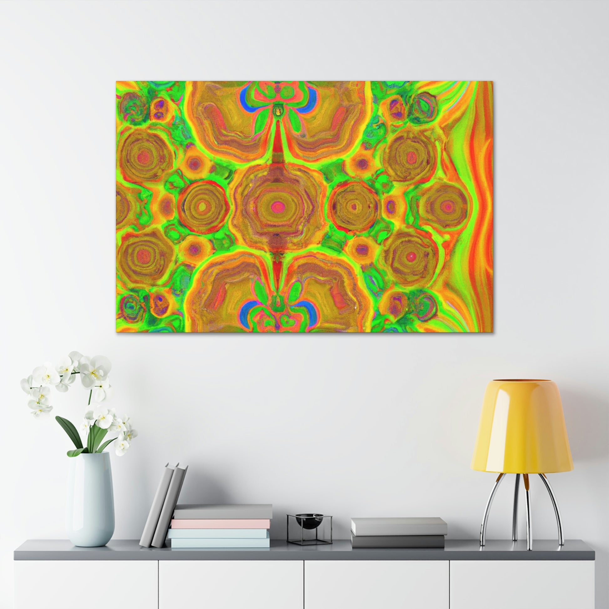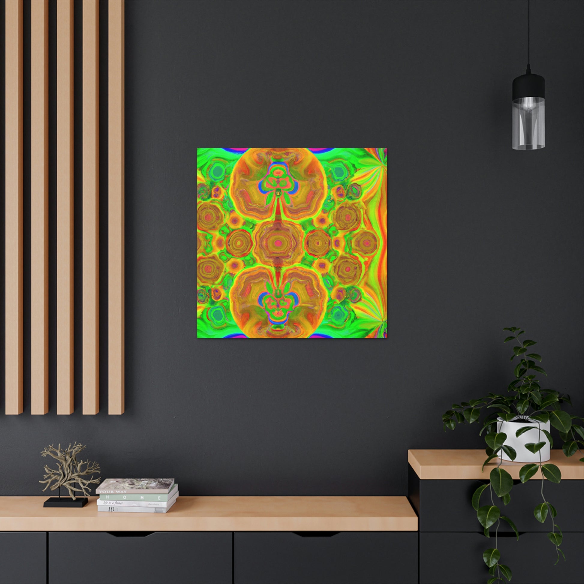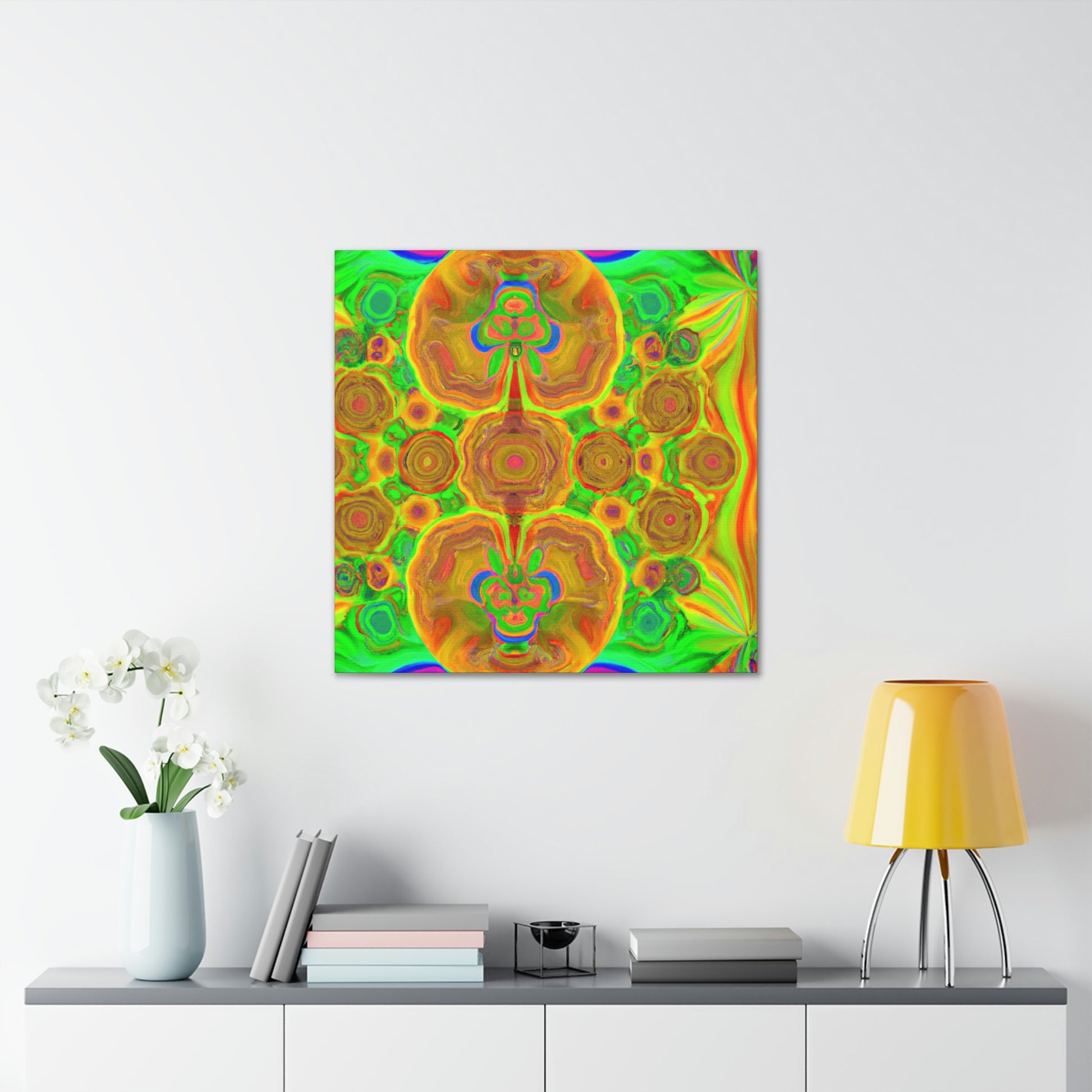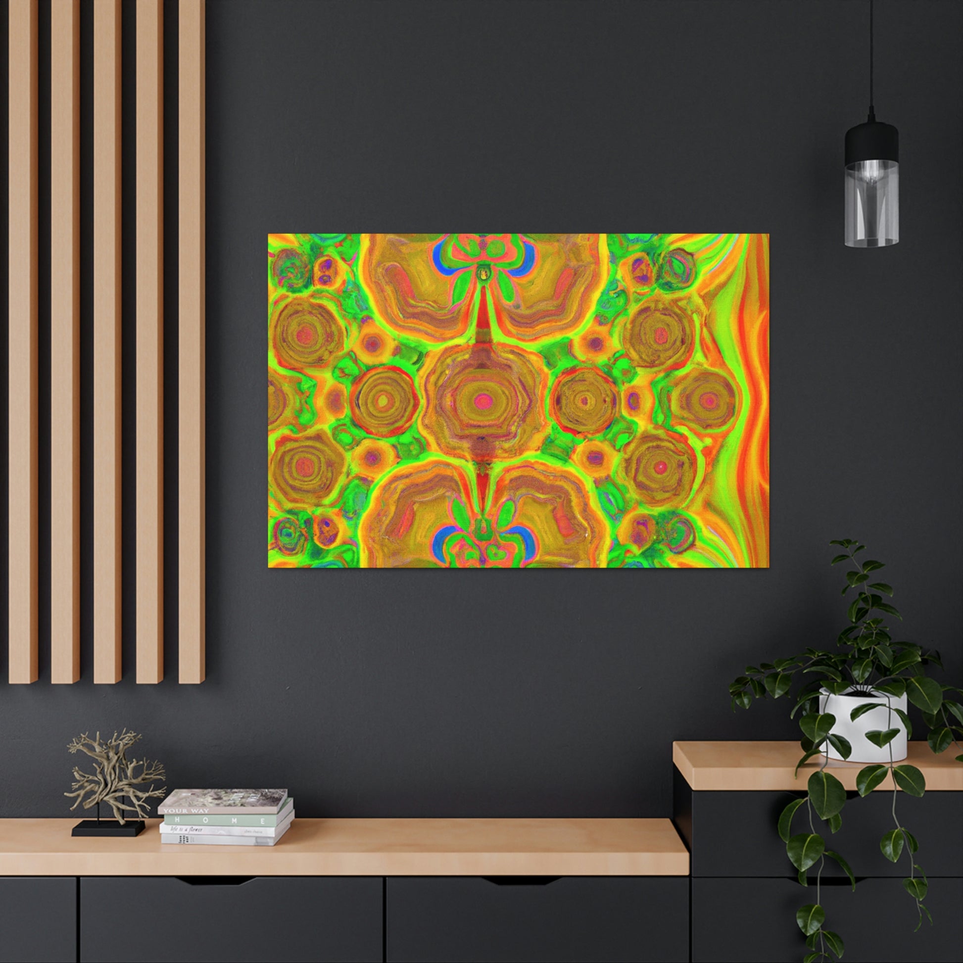 This digital art is bursting with color and vibrancy. Featuring a psychedelic display of trippy mushrooms, kaleidoscopic shapes, abstract imagery, and 3D lines, this canvas will turn any wall into a modern art masterpiece. Its intricate design and bold colors will capture anyone's attention and be a show-stopping piece. #abstractart #mushrooms #kaleidoscope #3dlines #digitalart #wallcanvas #trippyart #vibrantcolors #modernart #psychedelic #canvasart