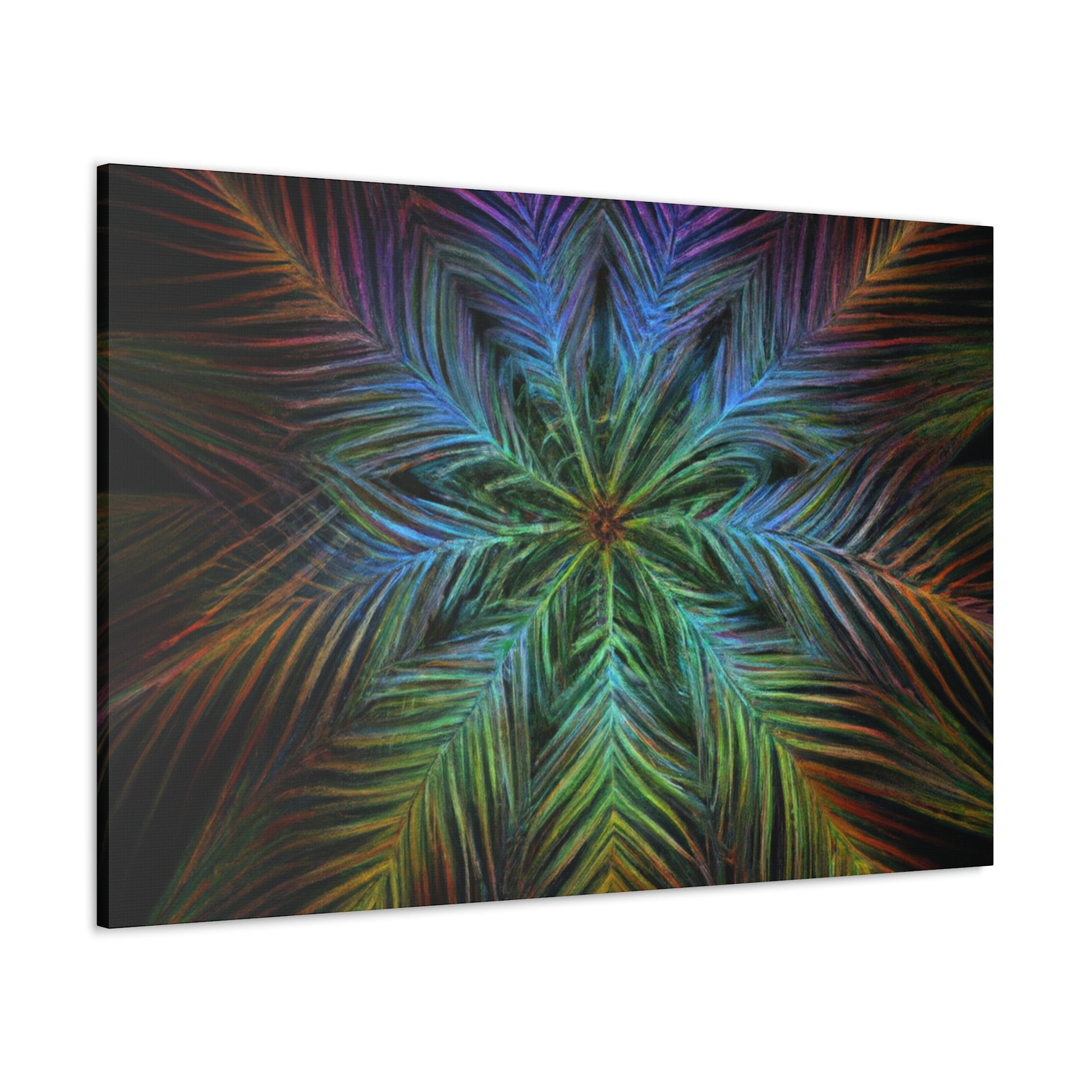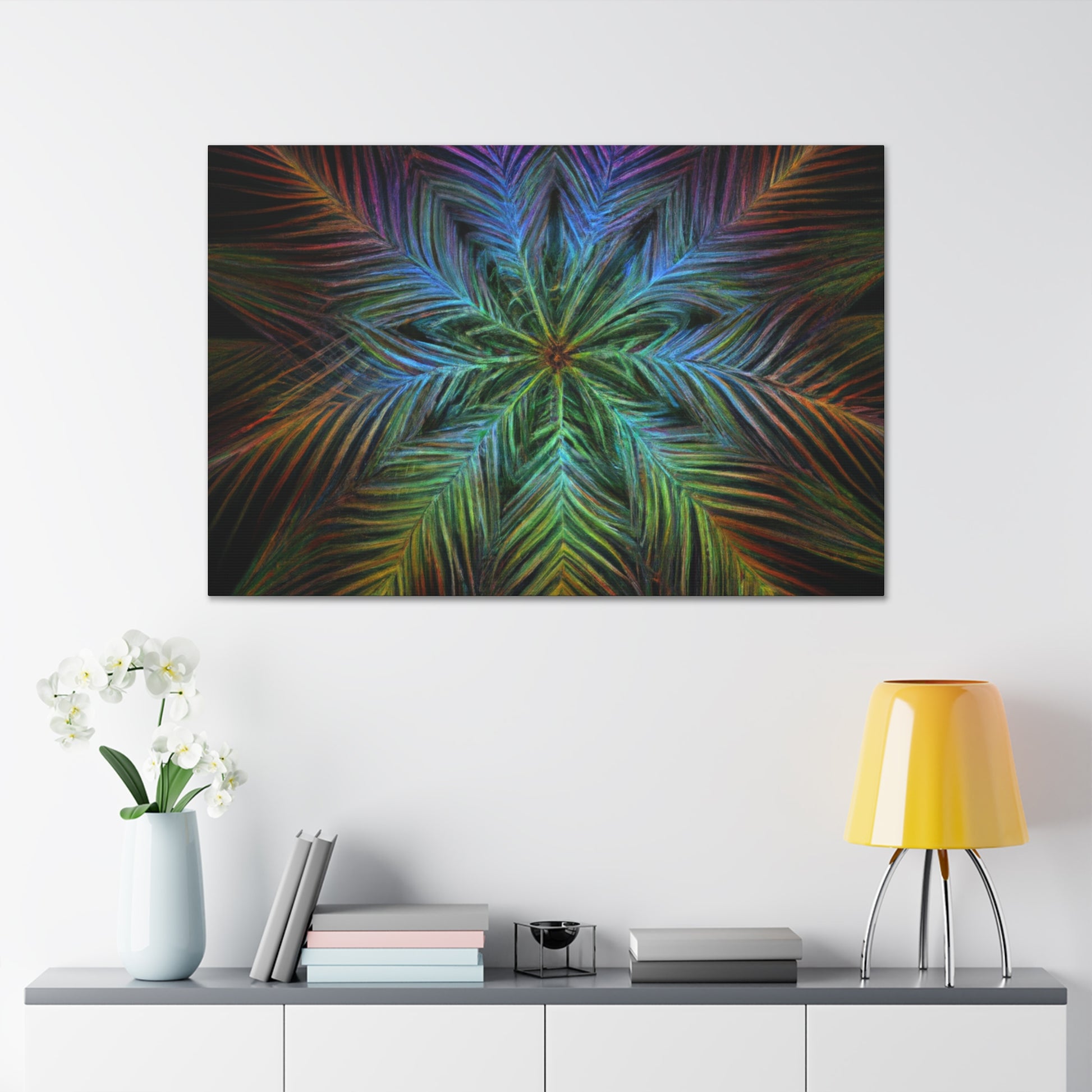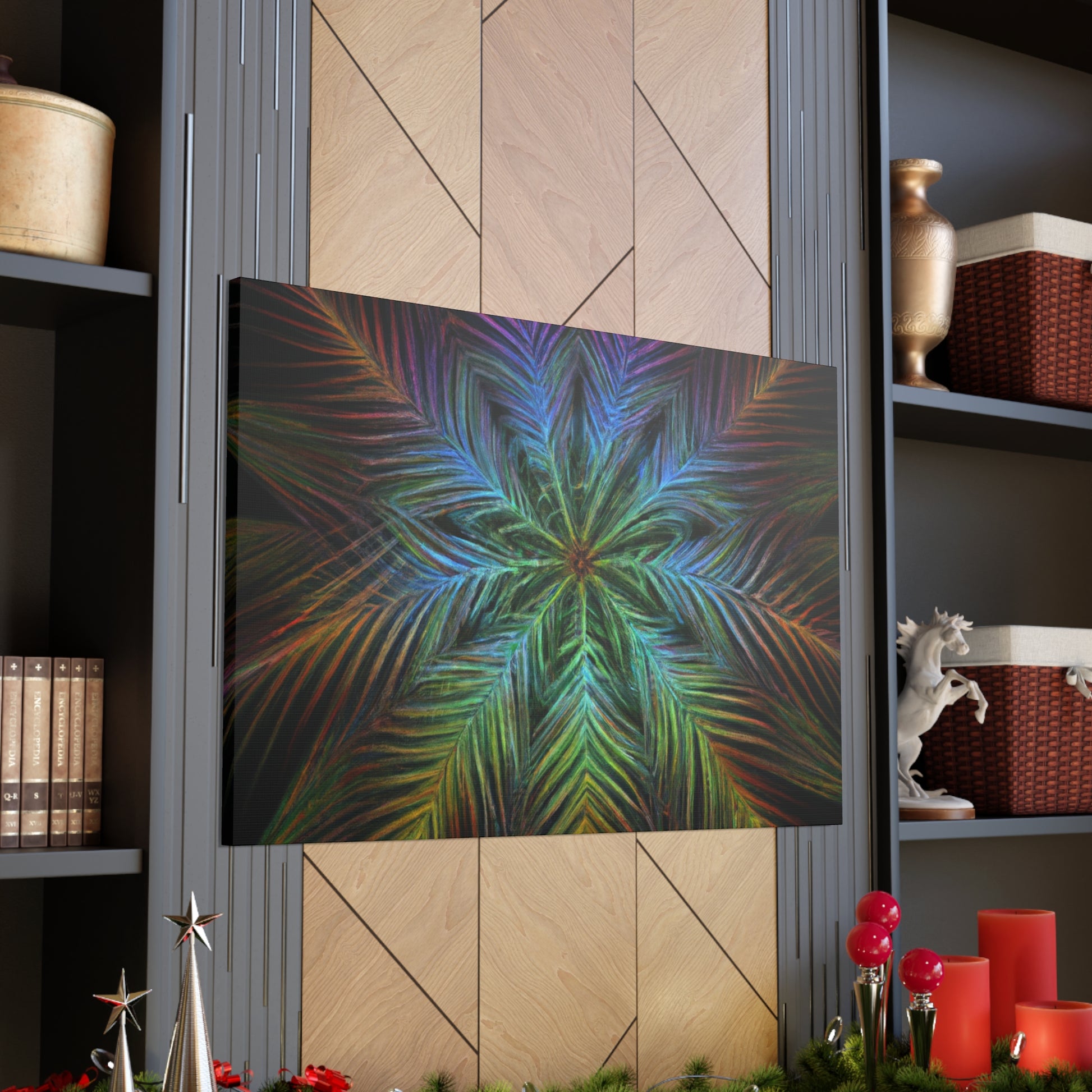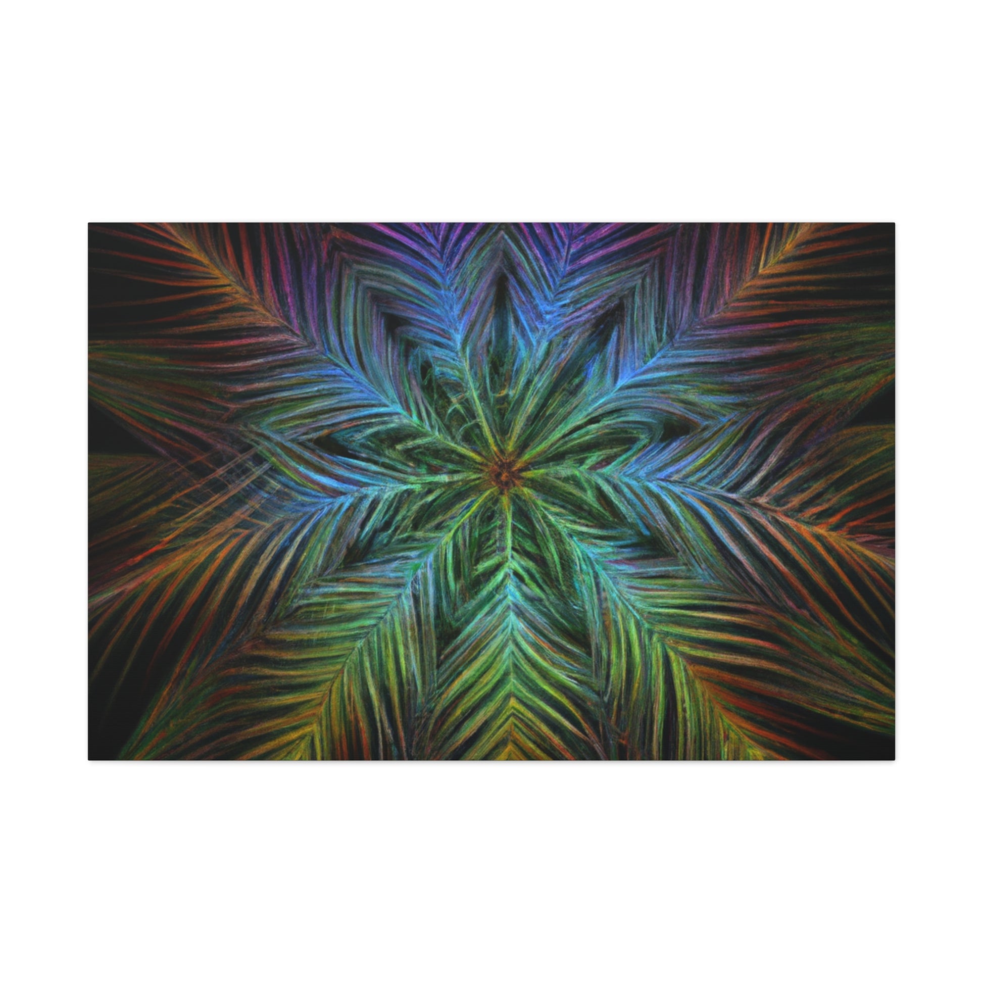 This eye-catching canvas will draw attention wherever it goes. Featuring bright, vivid colors, and abstract patterns, it's a captivating tapestry of geometry and digital art. Trippy geometric palm leaves, kaleidoscope, 3D lines, and fractal structures are digitally printed onto a high-quality canvas, making a dramatic statement piece sure to be the highlight of any room. #3Dart #digitalart #kaleidoscopepattern #geometricart #fractal #abstractart #vibrantcolors #trippy #leaves #canvas #statementpiece