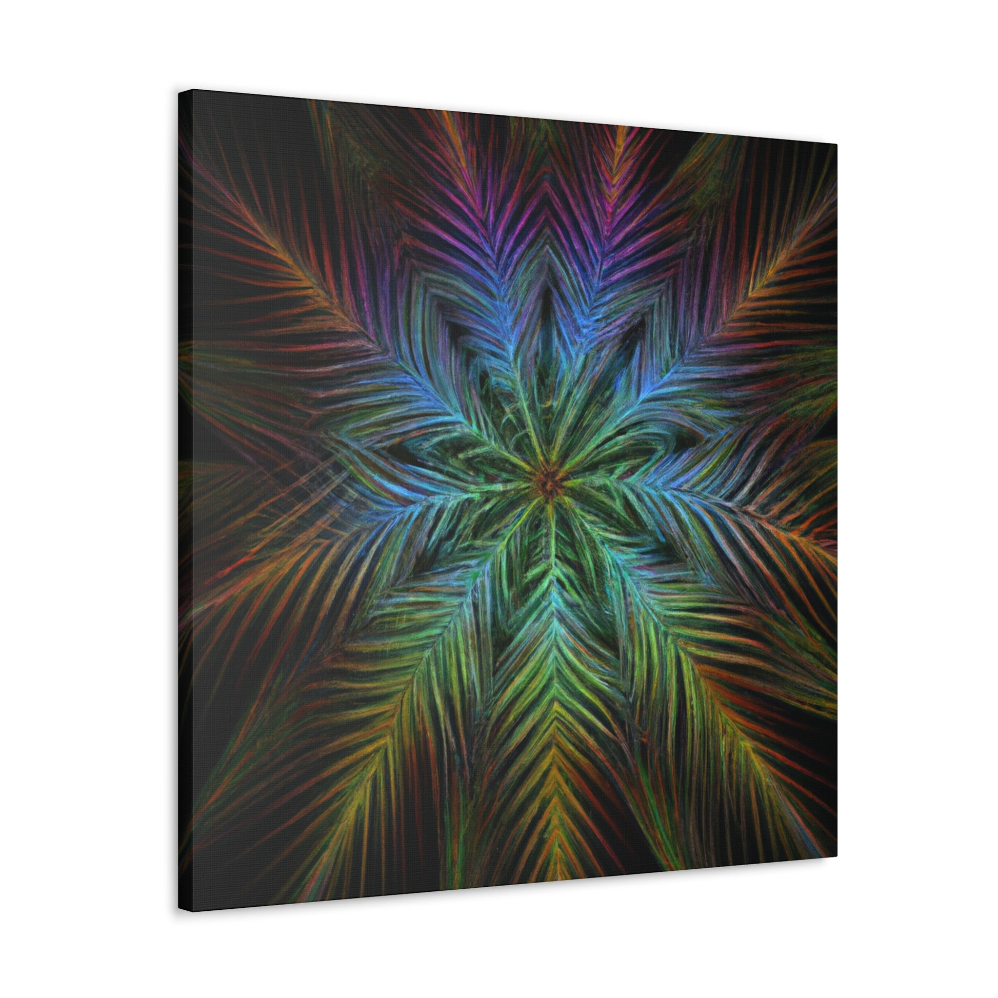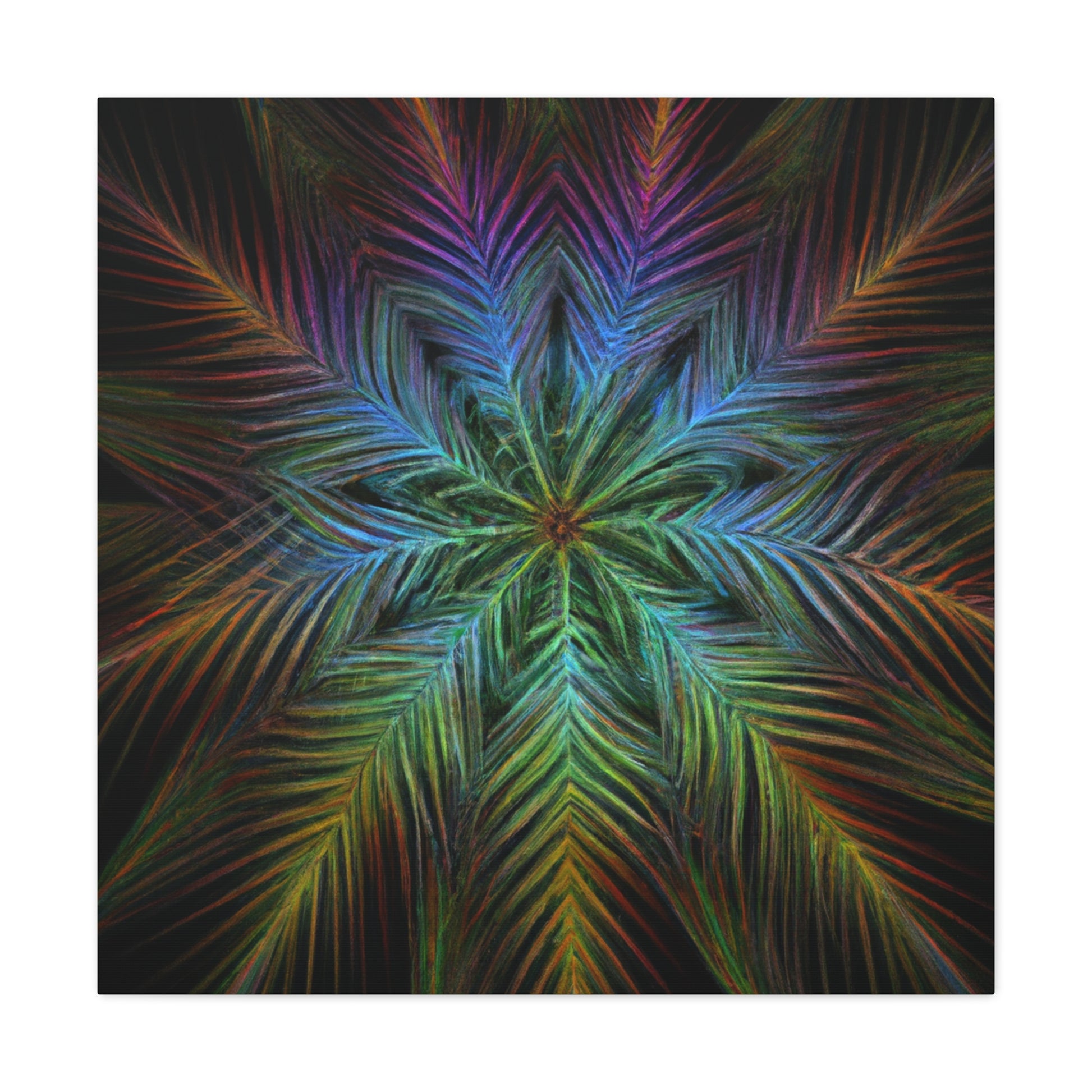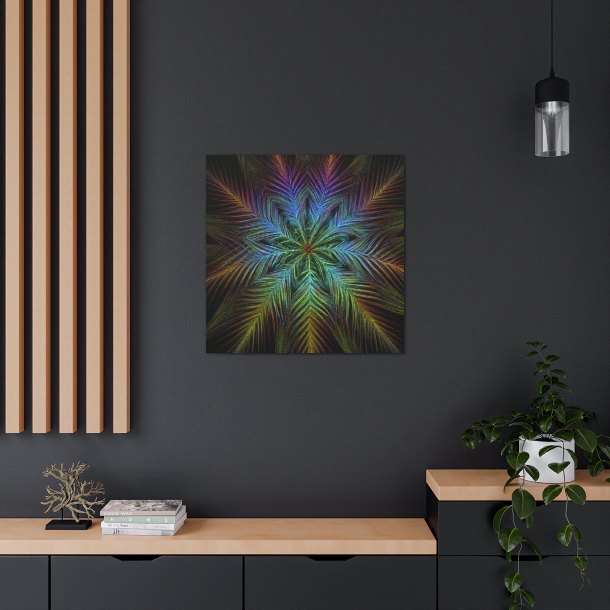 This eye-catching canvas will draw attention wherever it goes. Featuring bright, vivid colors, and abstract patterns, it's a captivating tapestry of geometry and digital art. Trippy geometric palm leaves, kaleidoscope, 3D lines, and fractal structures are digitally printed onto a high-quality canvas, making a dramatic statement piece sure to be the highlight of any room. #3Dart #digitalart #kaleidoscopepattern #geometricart #fractal #abstractart #vibrantcolors #trippy #leaves #canvas #statementpiece