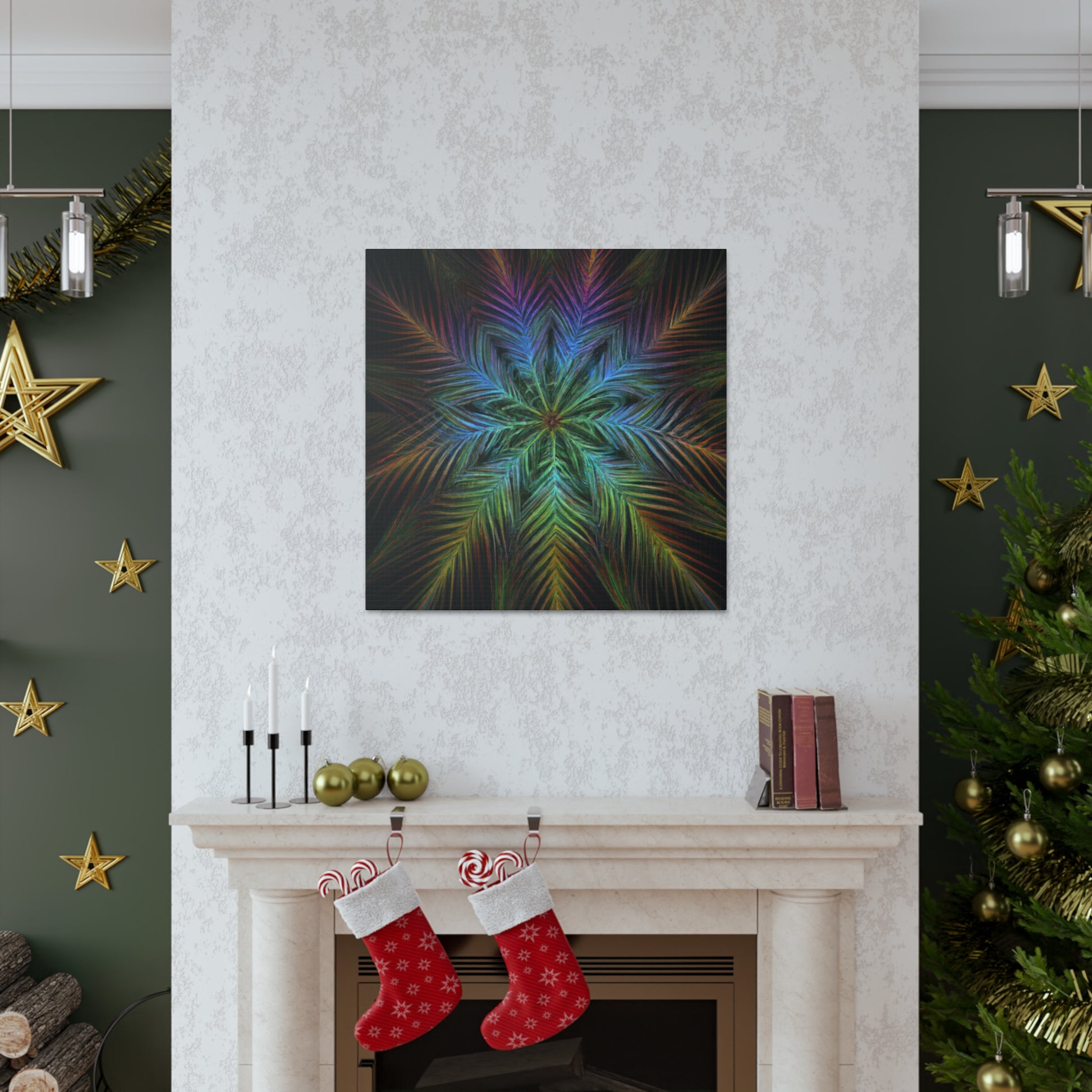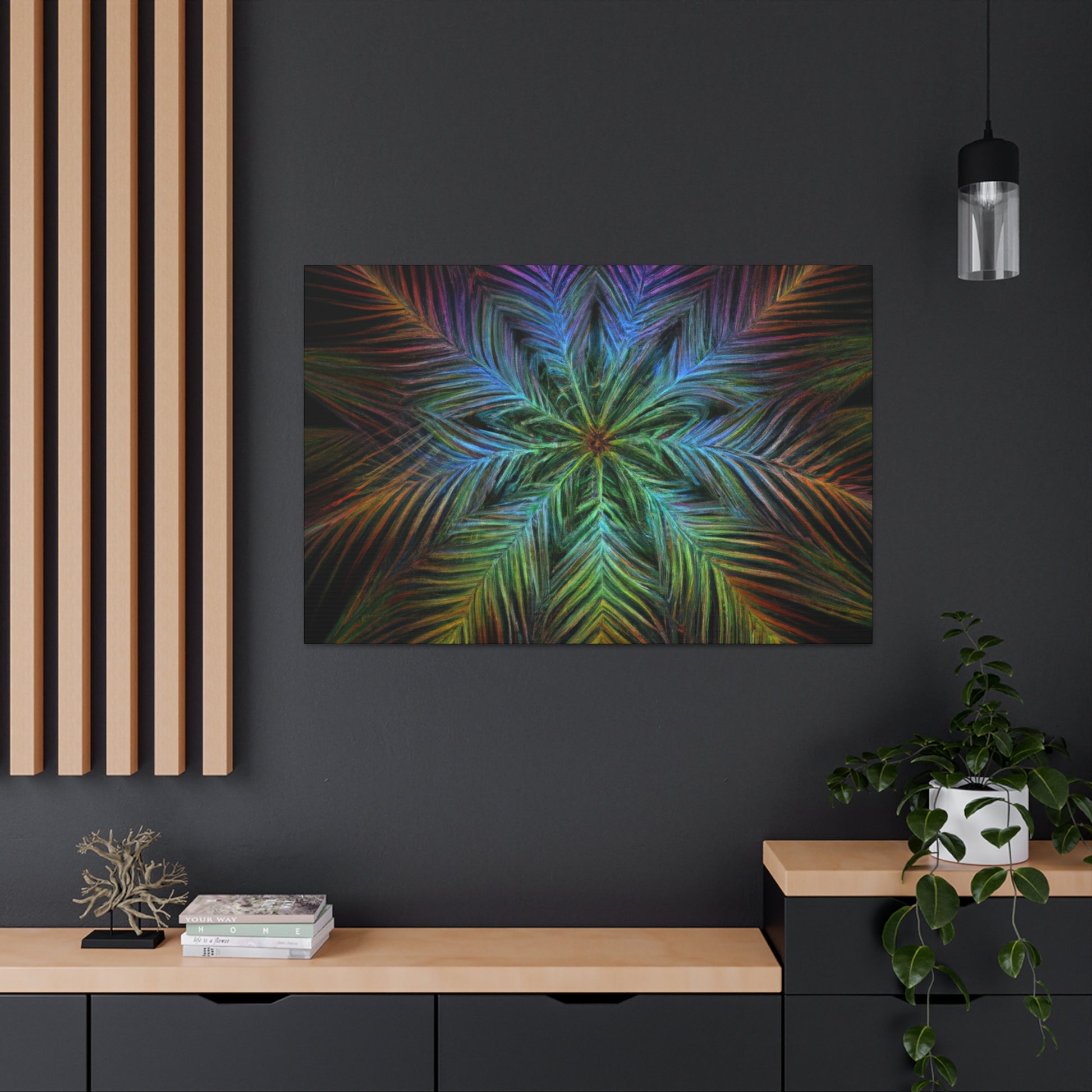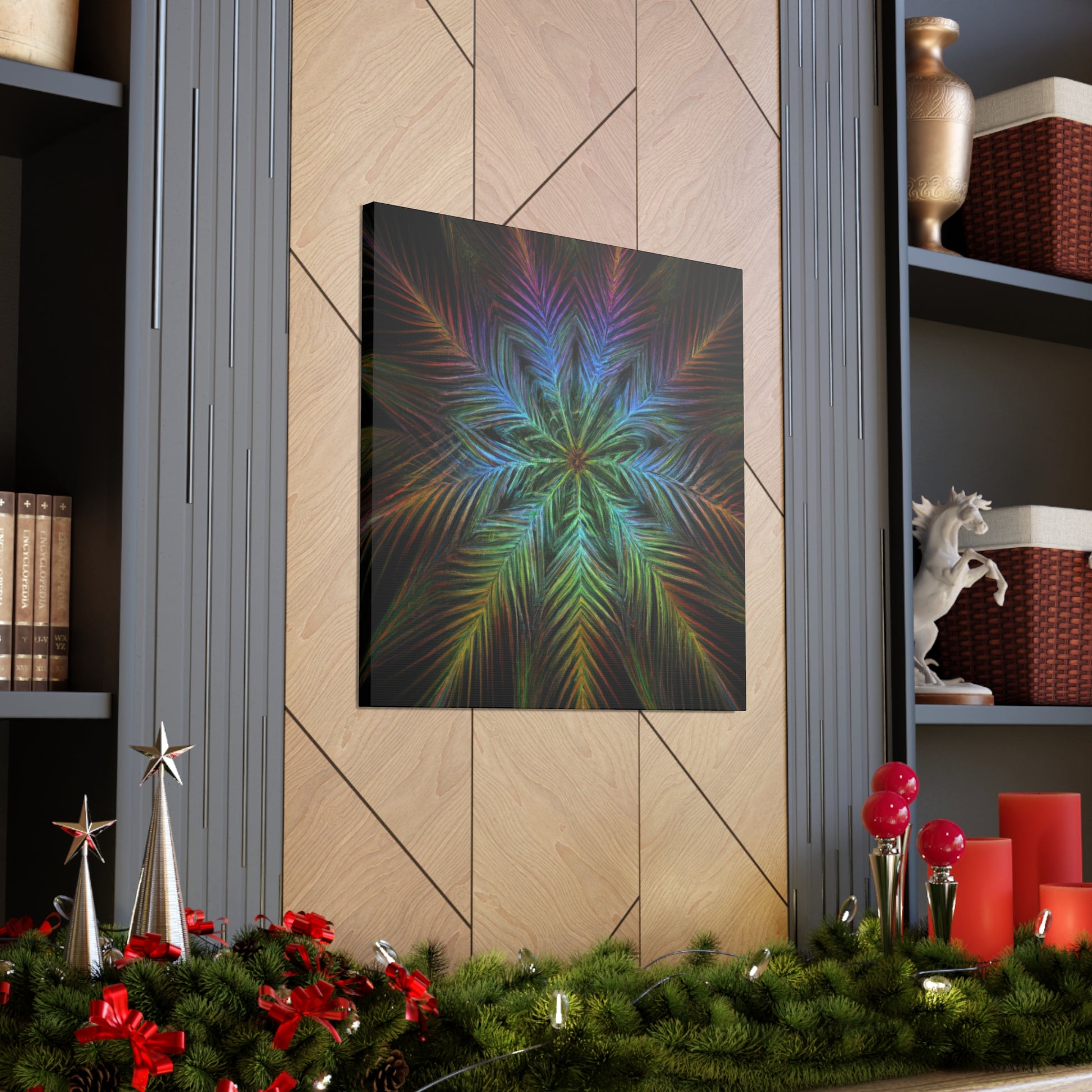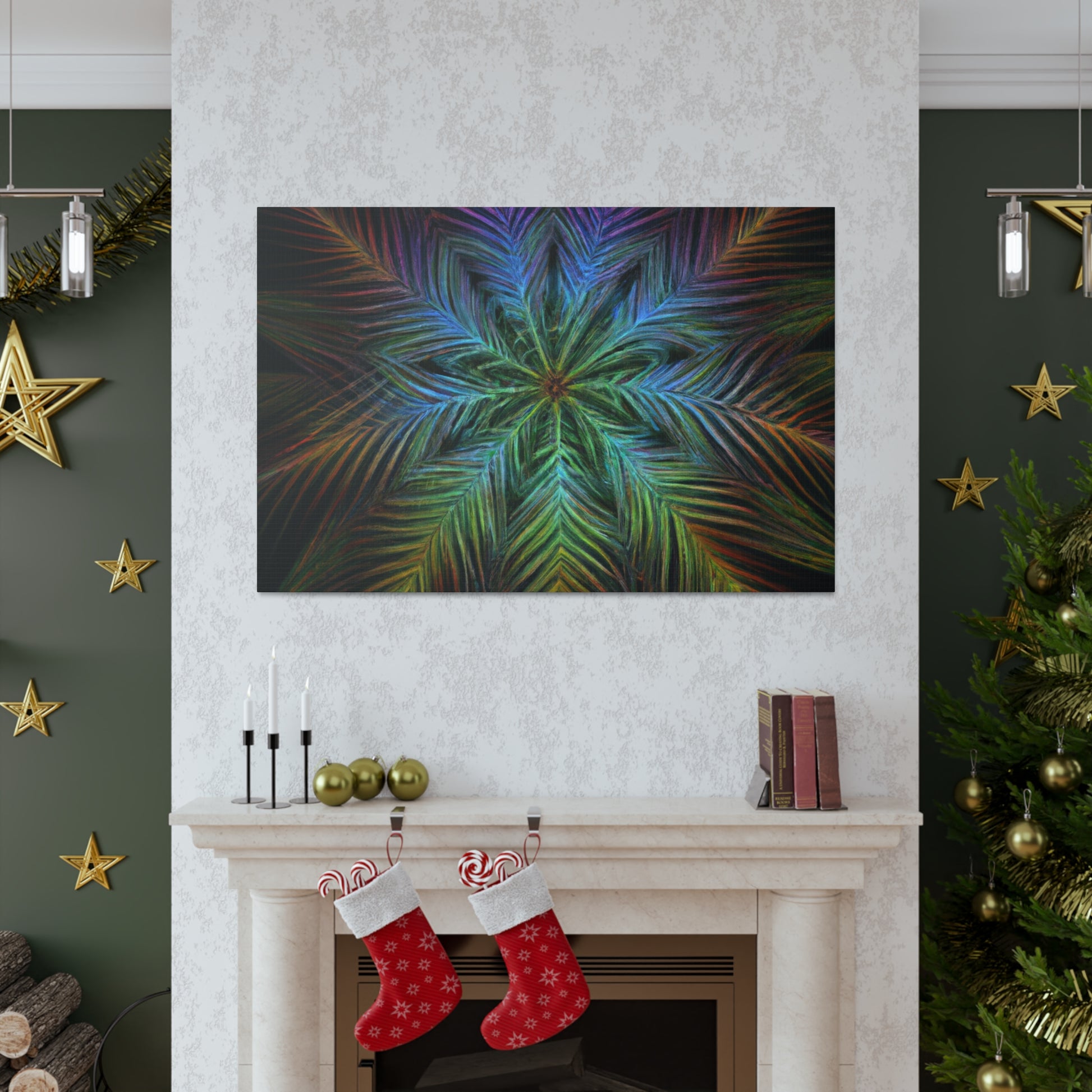 This eye-catching canvas will draw attention wherever it goes. Featuring bright, vivid colors, and abstract patterns, it's a captivating tapestry of geometry and digital art. Trippy geometric palm leaves, kaleidoscope, 3D lines, and fractal structures are digitally printed onto a high-quality canvas, making a dramatic statement piece sure to be the highlight of any room. #3Dart #digitalart #kaleidoscopepattern #geometricart #fractal #abstractart #vibrantcolors #trippy #leaves #canvas #statementpiece