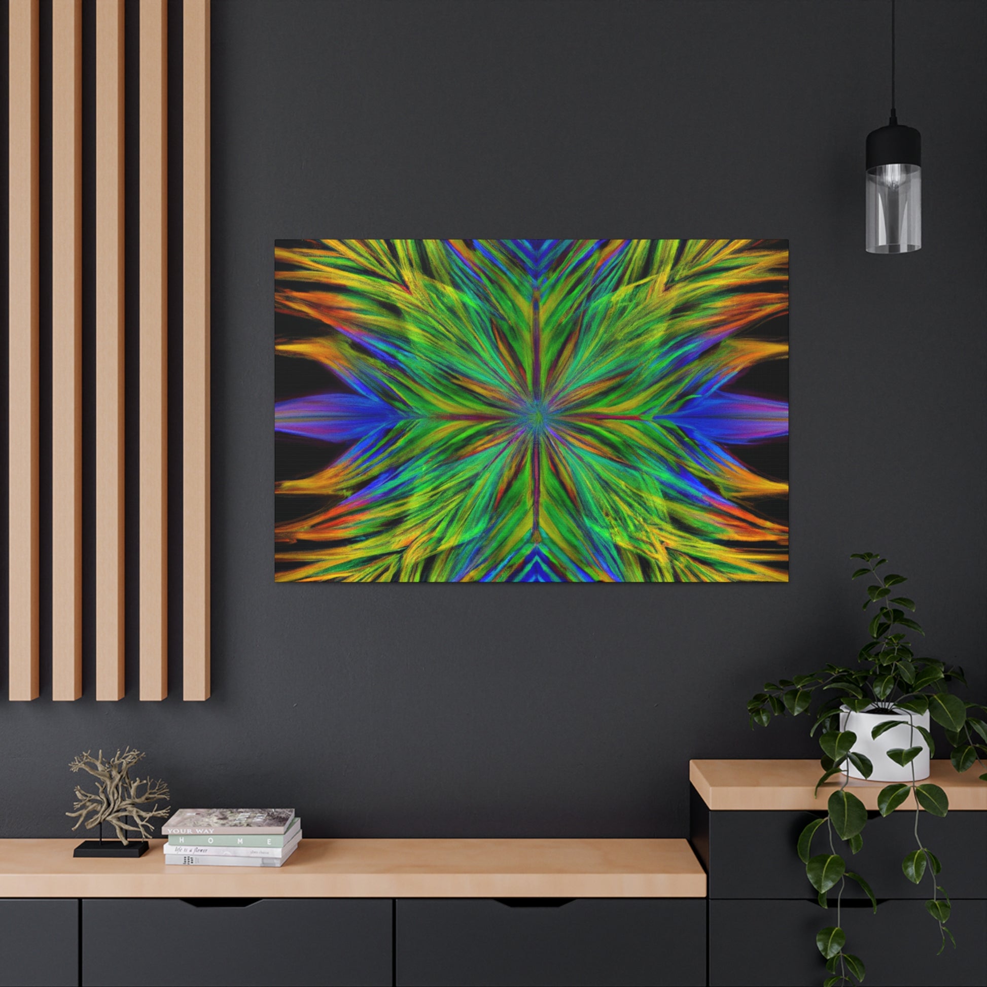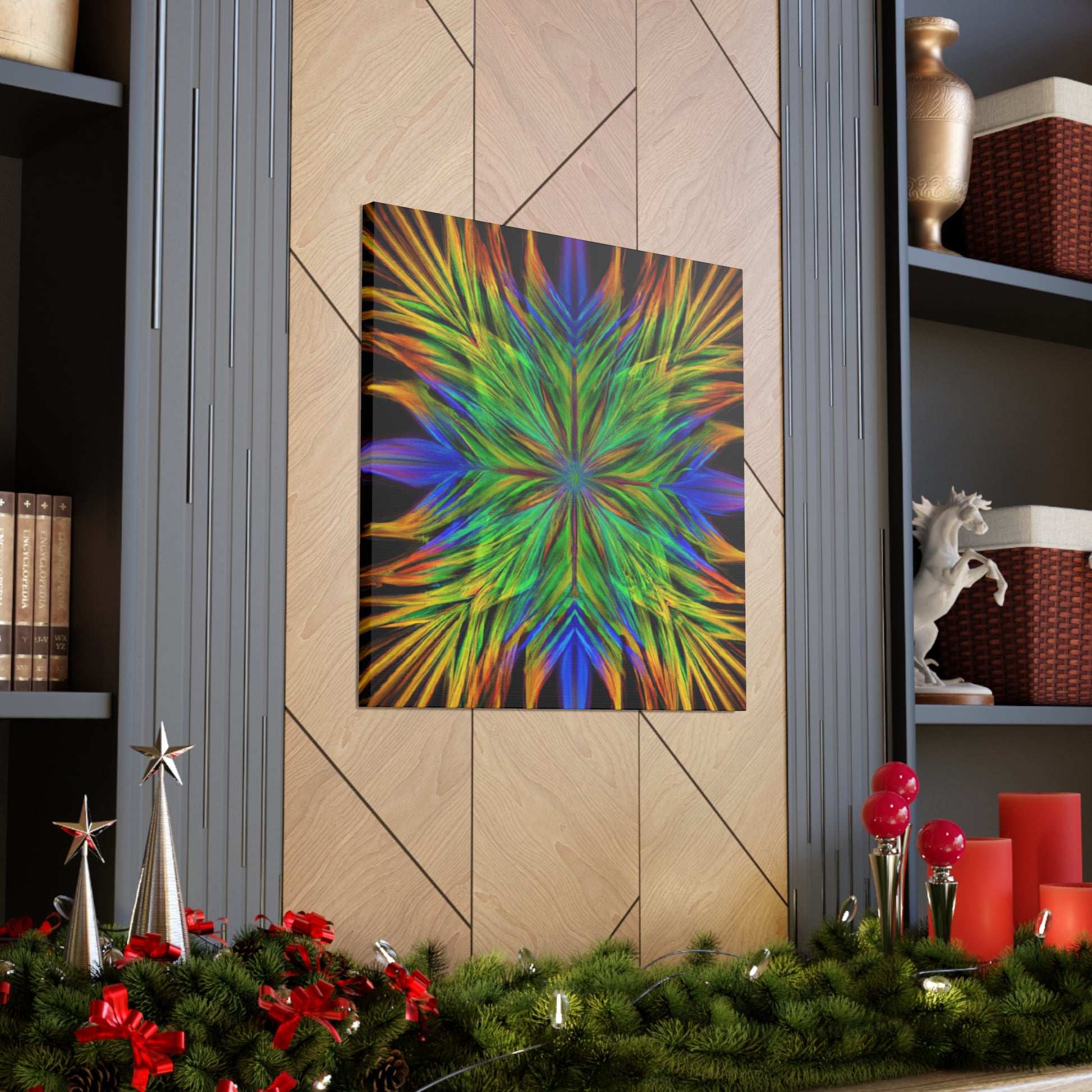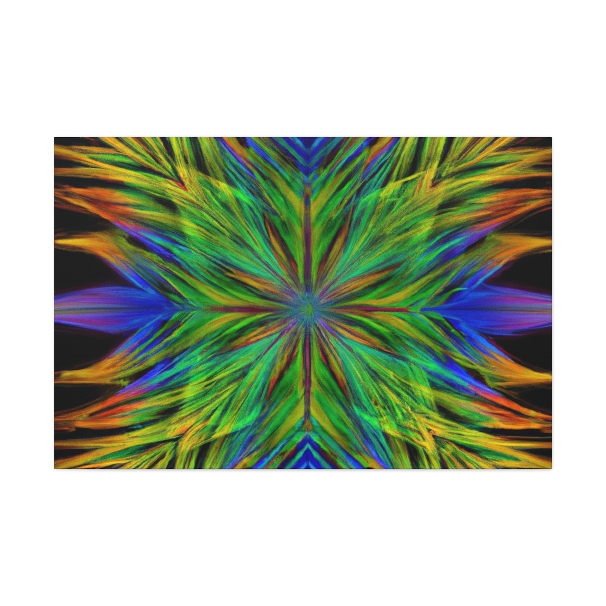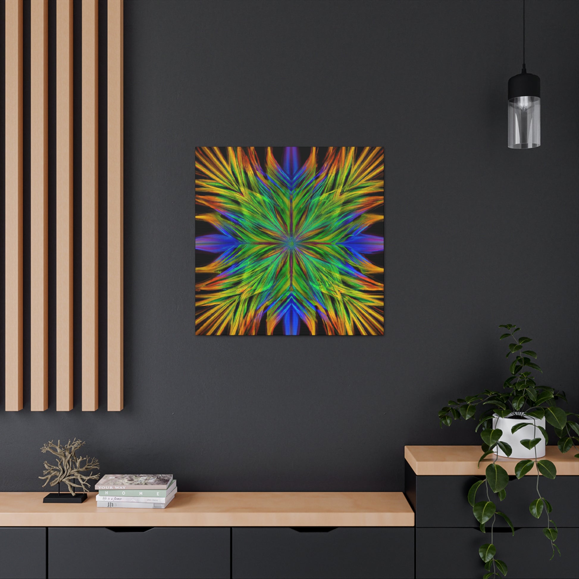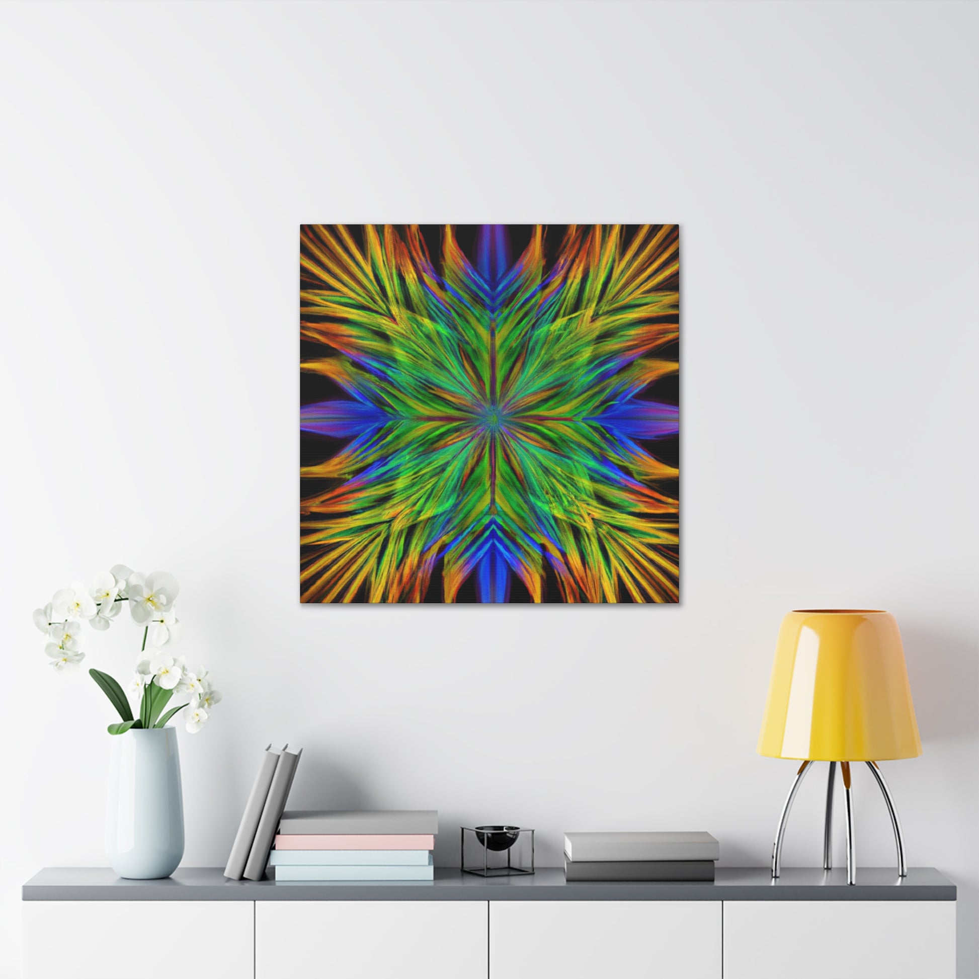 This beautiful canvas of trippy digital art features vivid kaleidoscope colors and 3D lines to create an abstract and fractal-like appearance. The unique design features vibrant palm leaves that seem to come to life with each eye-catching color-shift. The mesmerizing artwork is sure to bring life to any wall. #teal #vibrant #palmleaf #trippy #3d #fractal #geometric #kaleidoscope #abstract #digitalart #colors