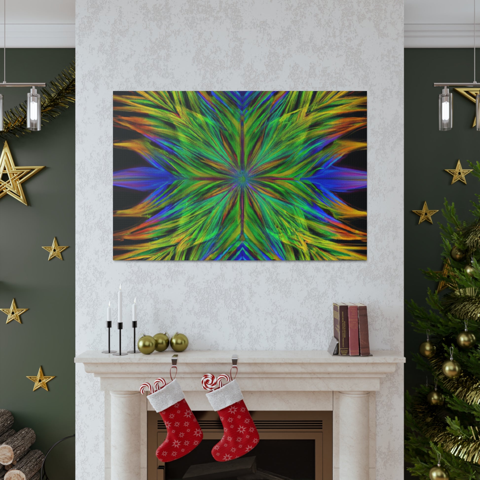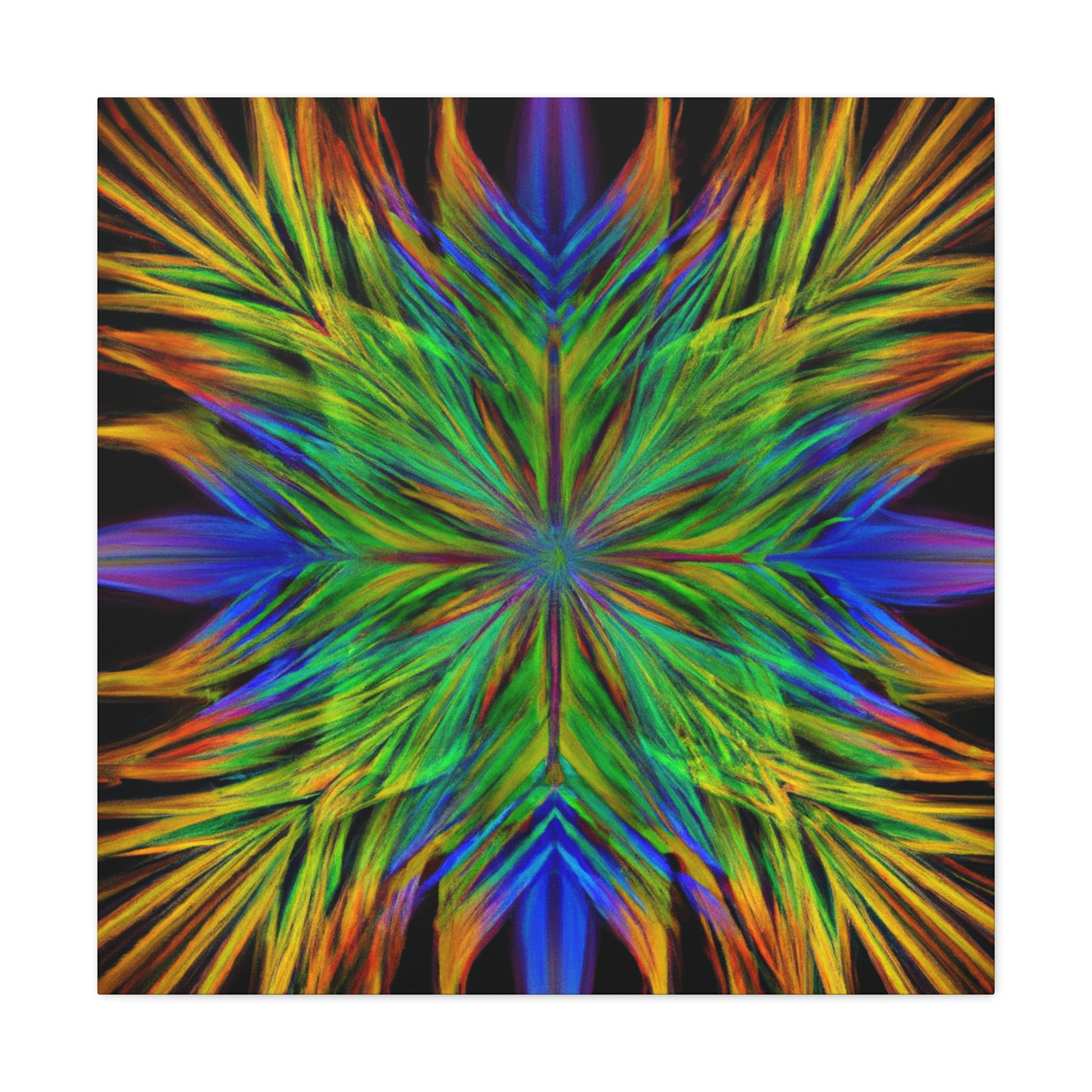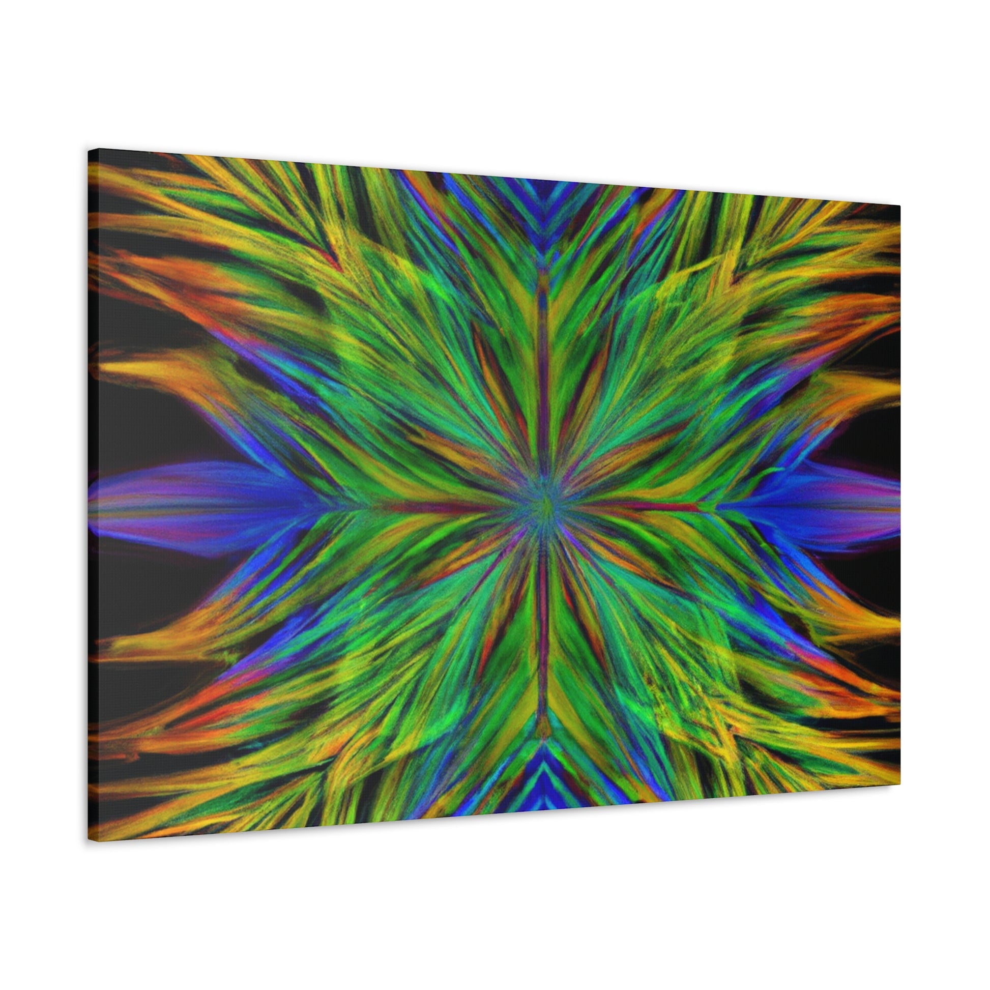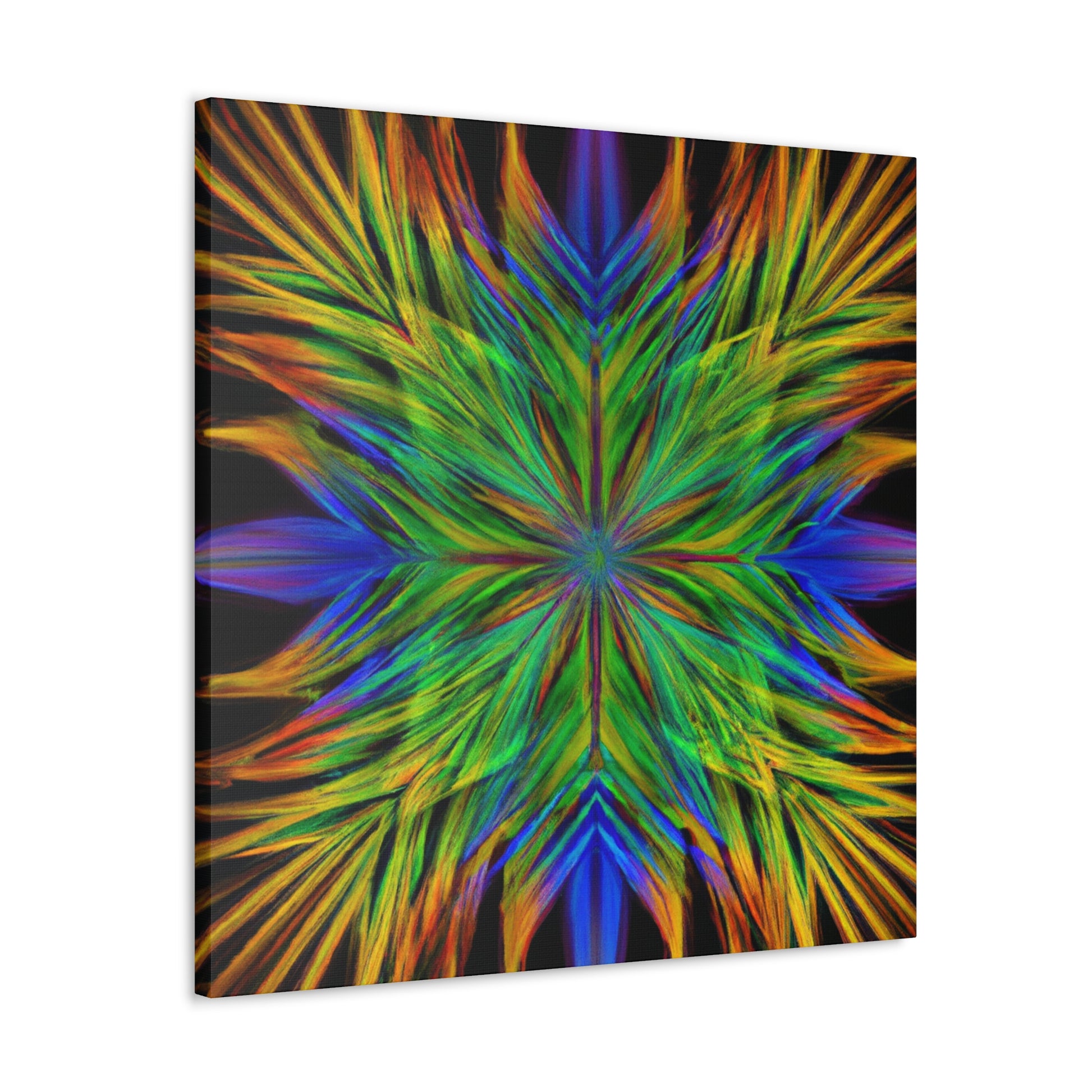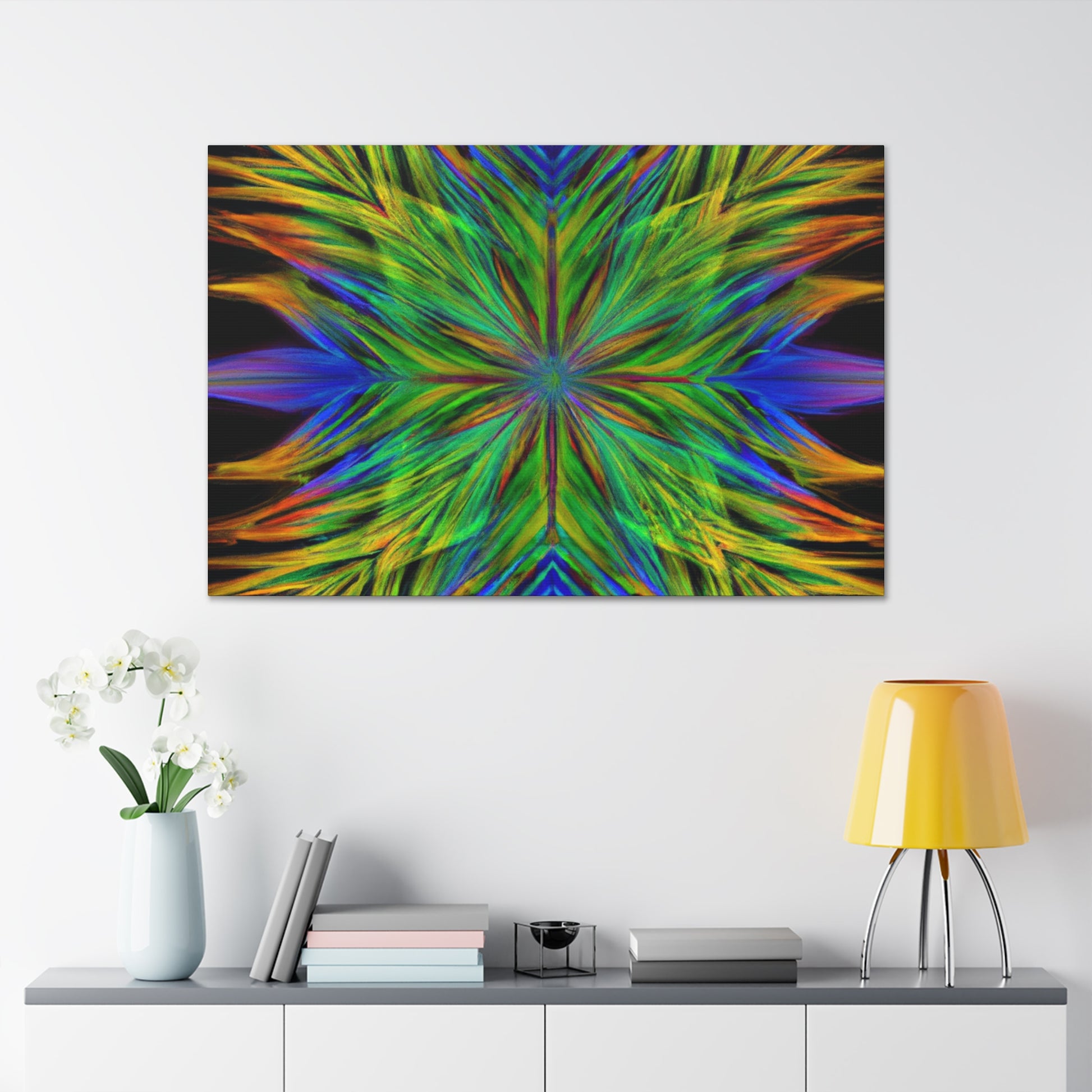 This beautiful canvas of trippy digital art features vivid kaleidoscope colors and 3D lines to create an abstract and fractal-like appearance. The unique design features vibrant palm leaves that seem to come to life with each eye-catching color-shift. The mesmerizing artwork is sure to bring life to any wall. #teal #vibrant #palmleaf #trippy #3d #fractal #geometric #kaleidoscope #abstract #digitalart #colors