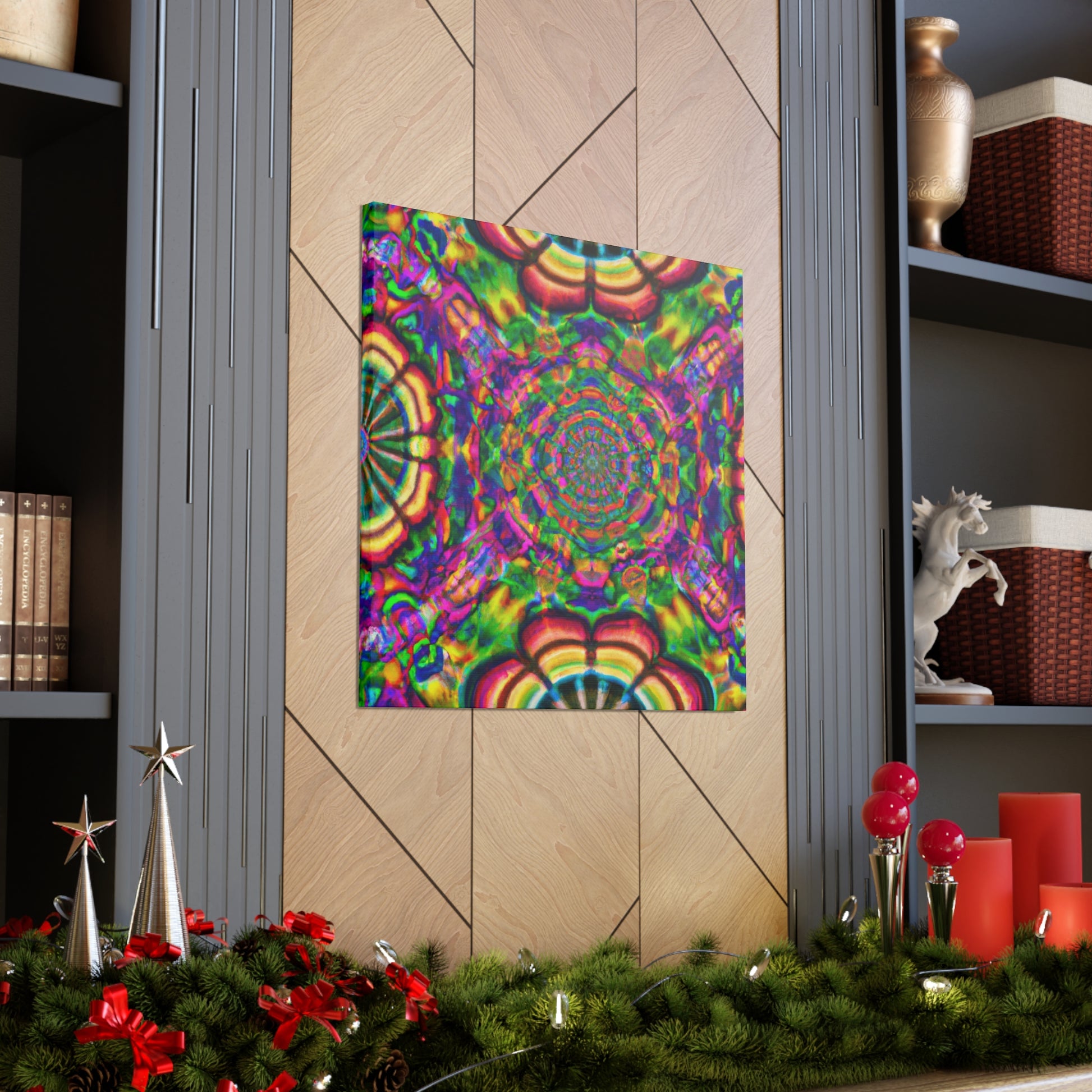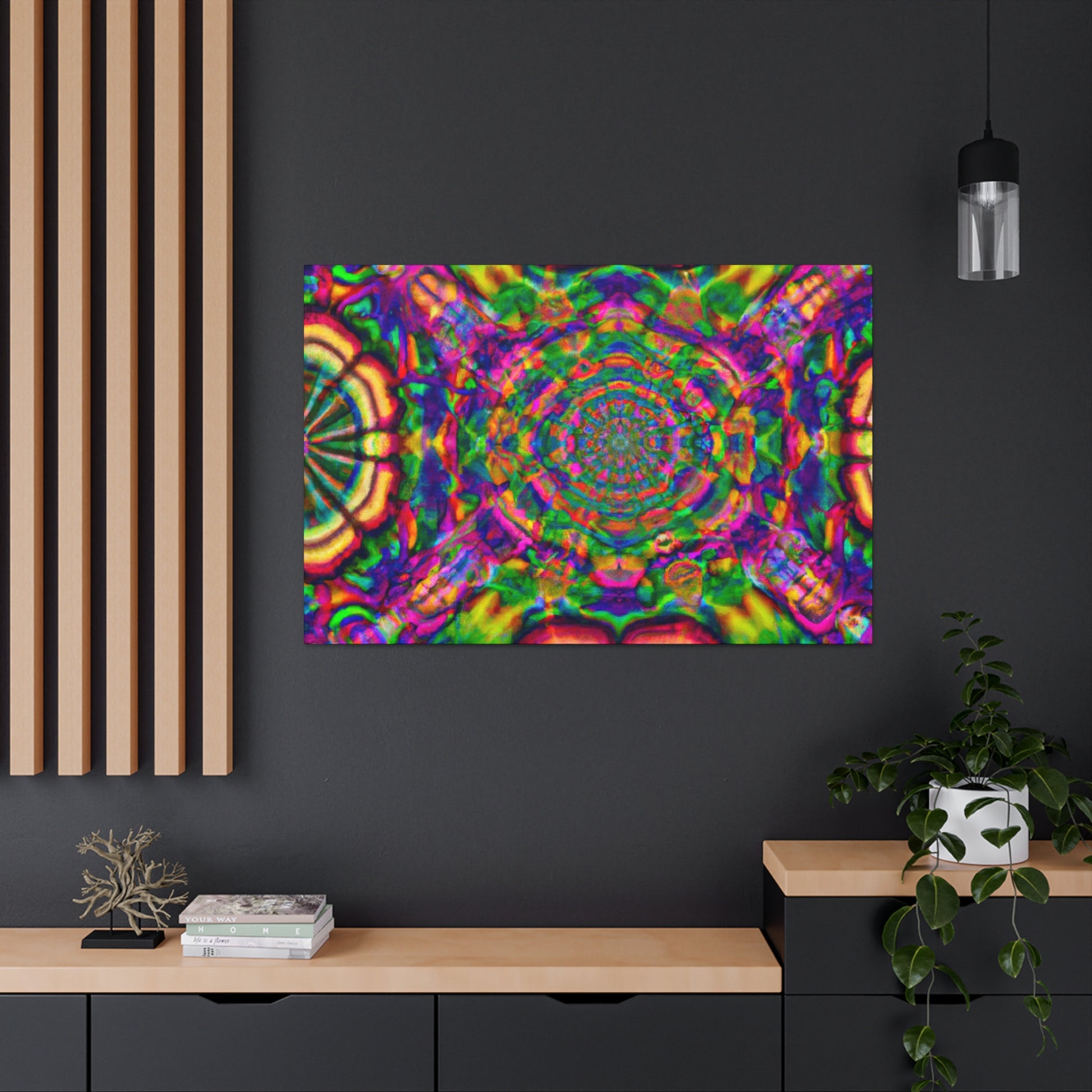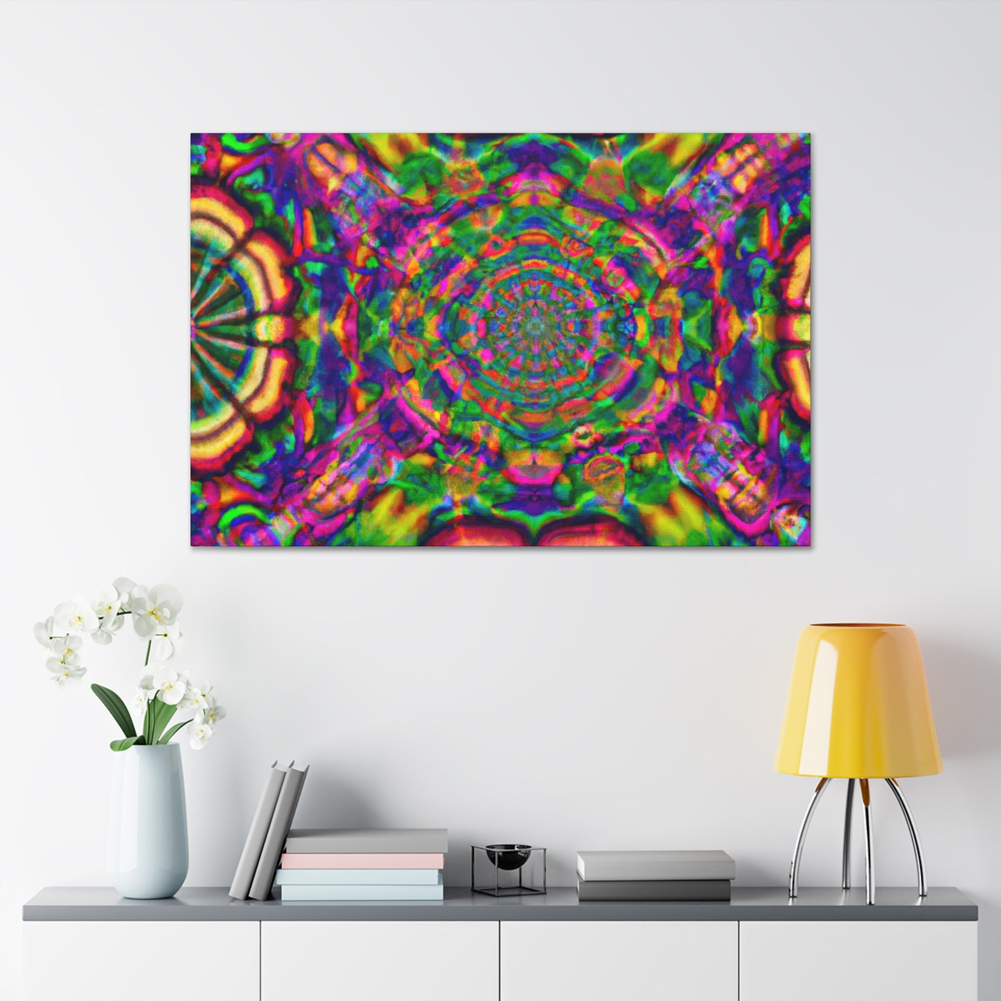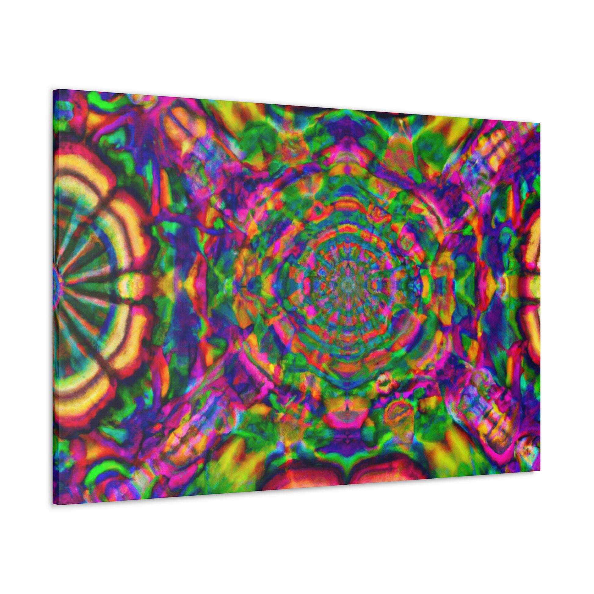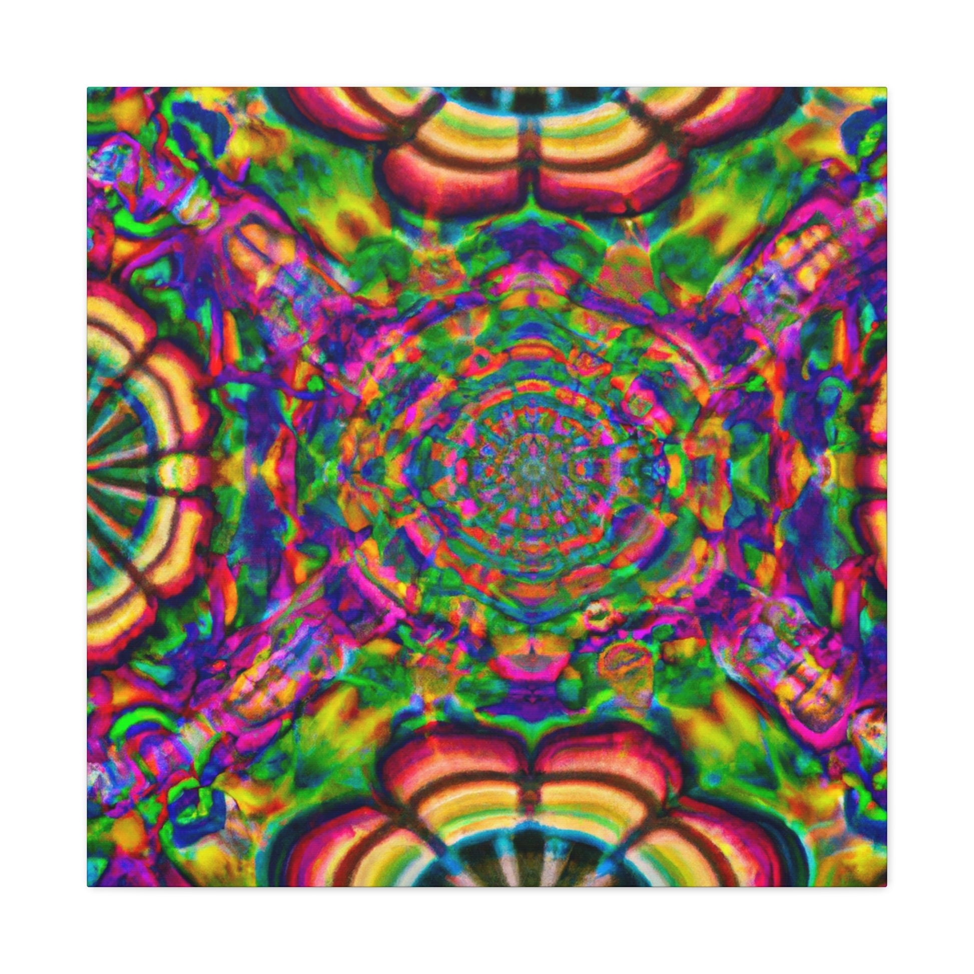 This canvas features a unique, trippy work of art that is sure to make a statement! Display this kaleidoscope of vibrant colors, abstract designs, 3D lines and digitally-rendered mushrooms on your wall. The perfect blend of modern and surreal, it will make any room appear more interesting. #trippy #mushrooms #kaleidoscope #abstract #digitalart #vibrantcolors #3Dlines #modern #surreal #canvas #art