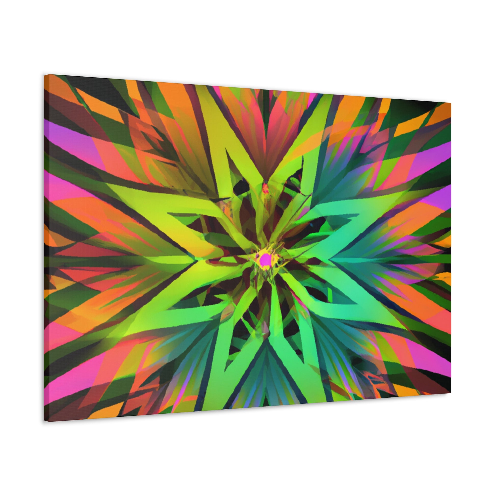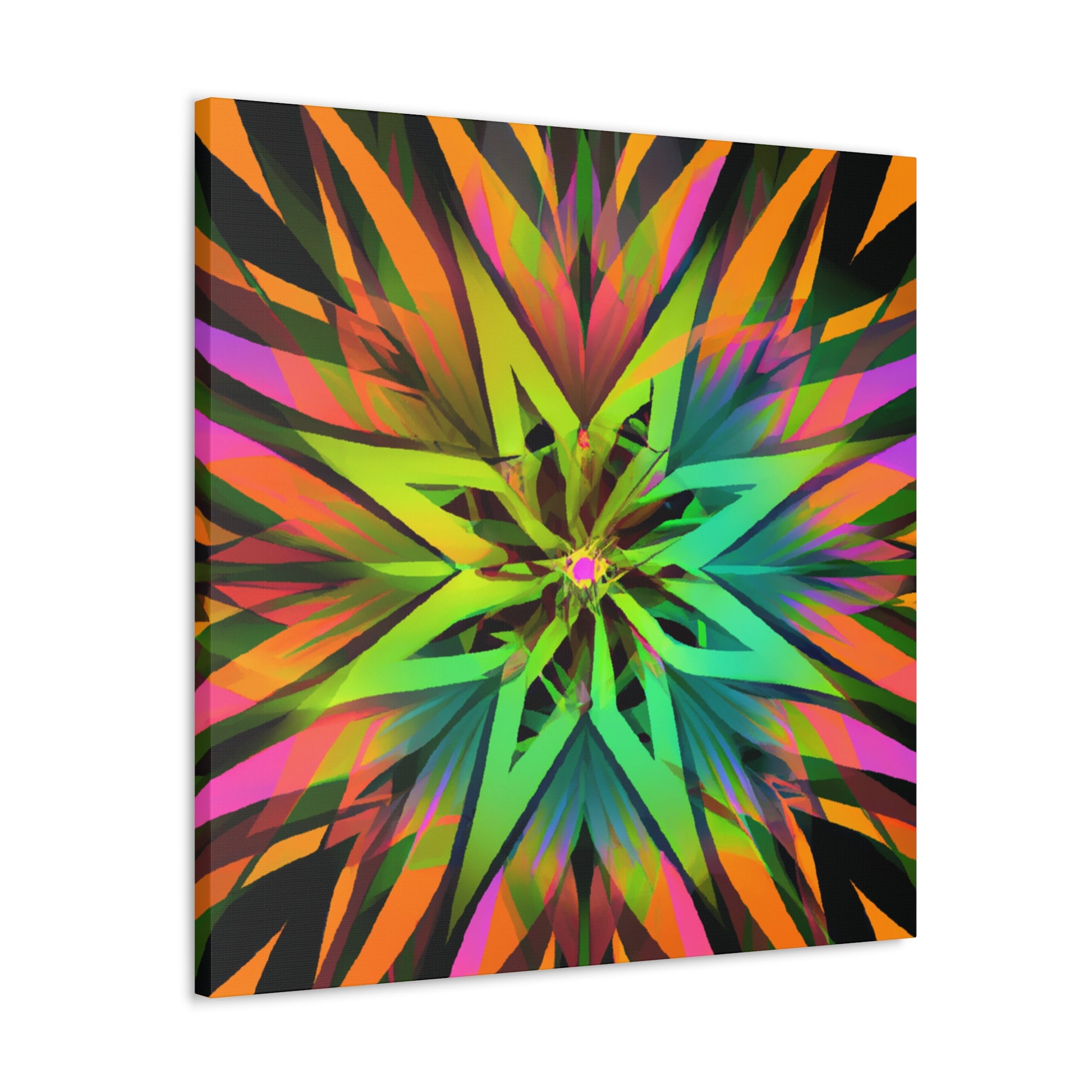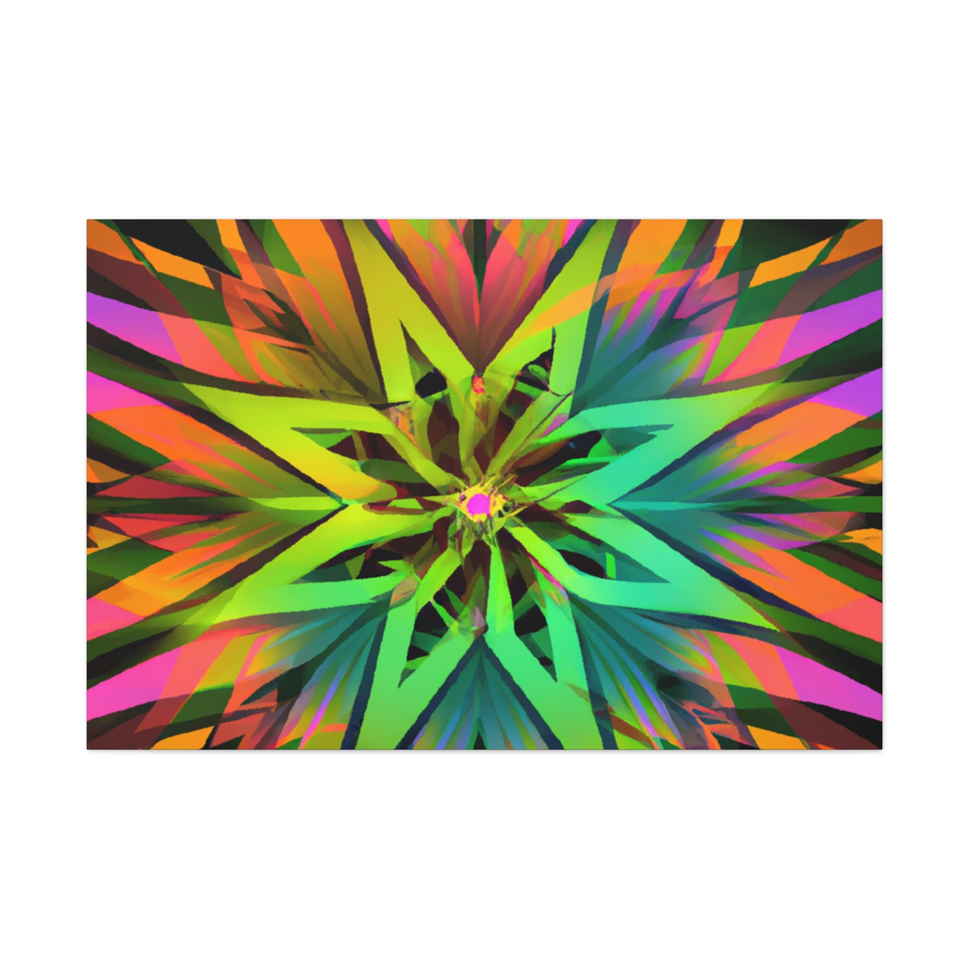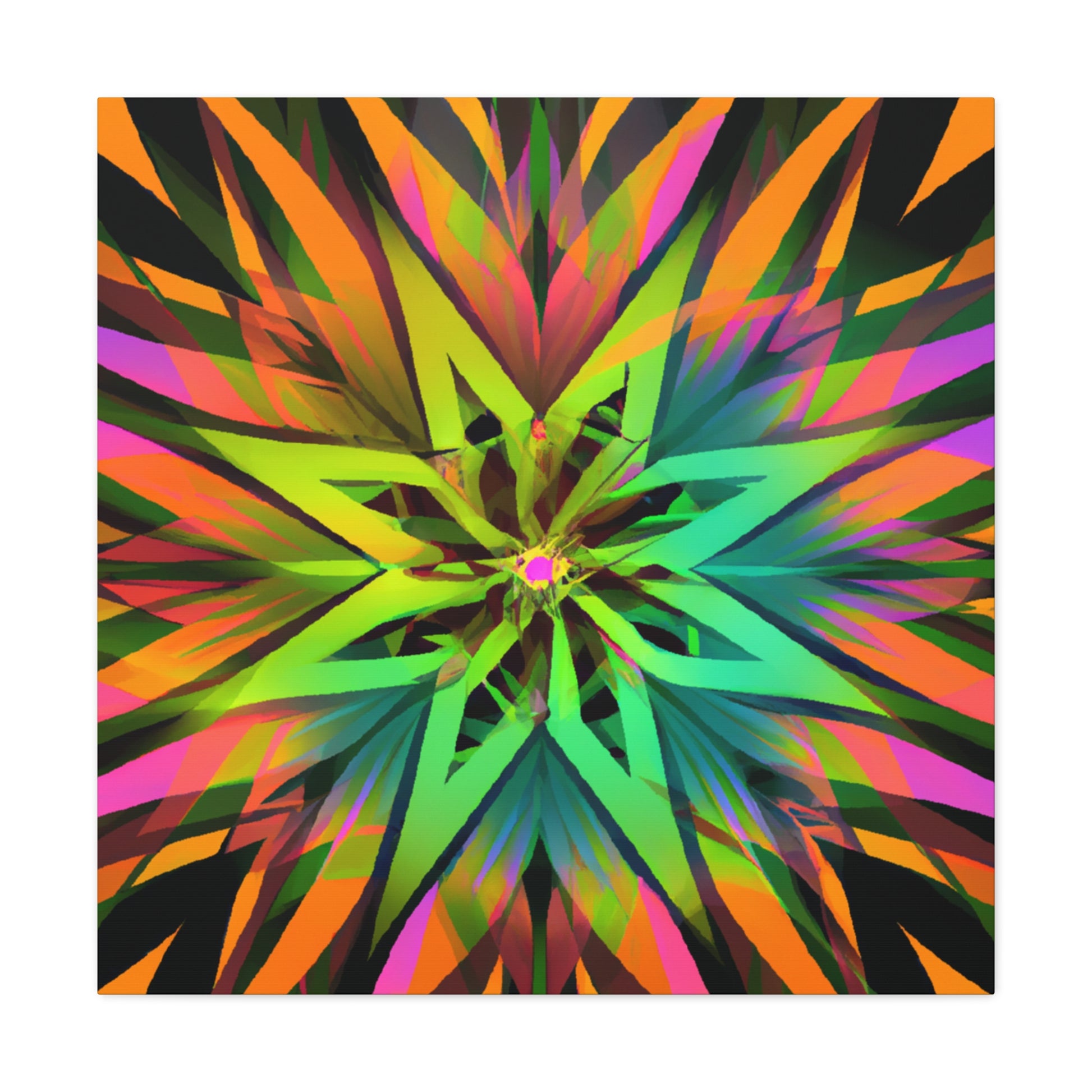This beautiful and vibrant art canvas features an abstract collage of Trippy geometric palm leaves, kaleidoscope, 3D lines, and fractal designs. Embrace digital art with the eye-catching colours and the stunning visual of multiple art styles mixed together into one piece. Perfect for modern, contemporary, or eclectic tastes. #trippyart#geometricpalmleaves#kaleidoscope#abstractart#digialart#vibrantcolors#3dlines#fractal#homedecor#walldecor#artcanvas