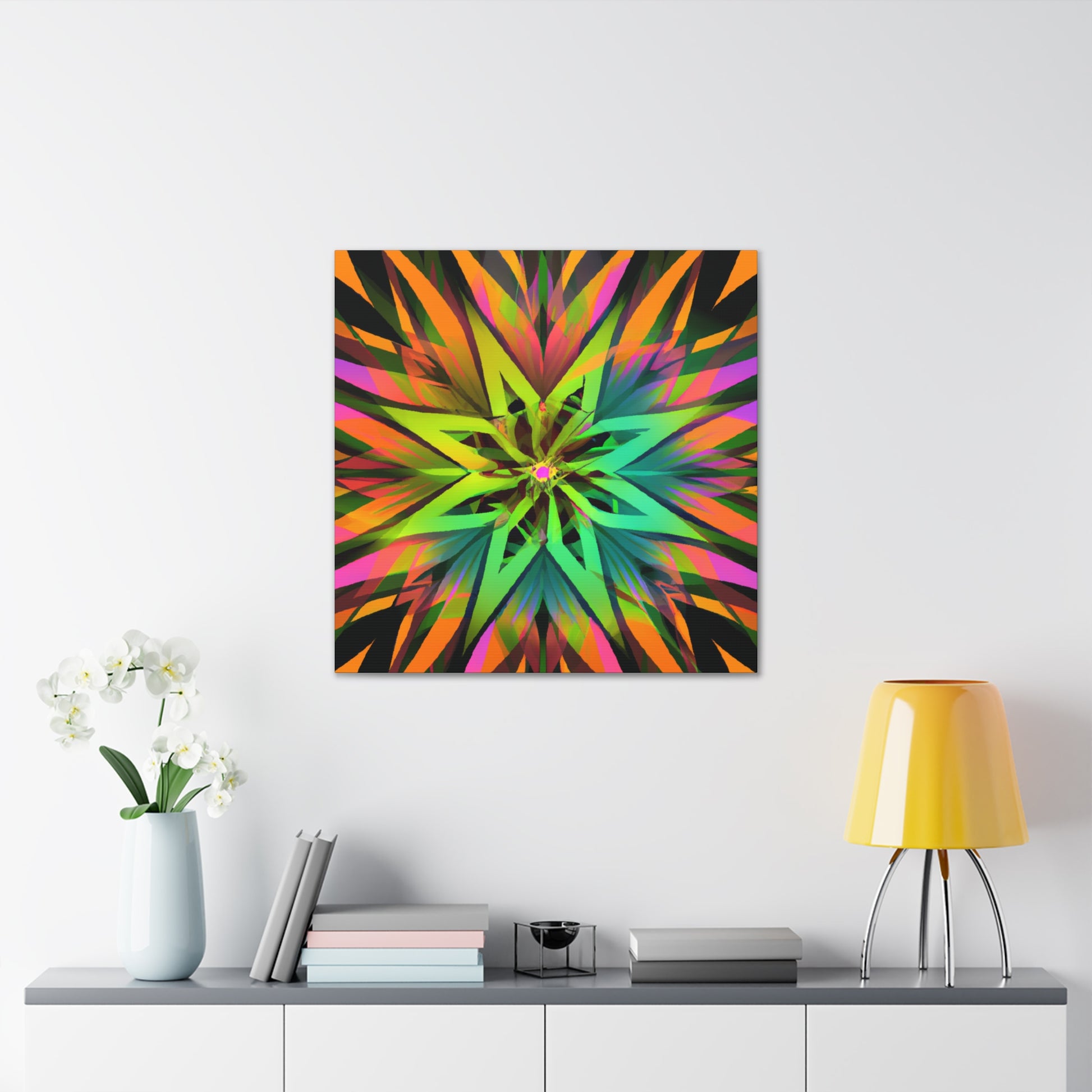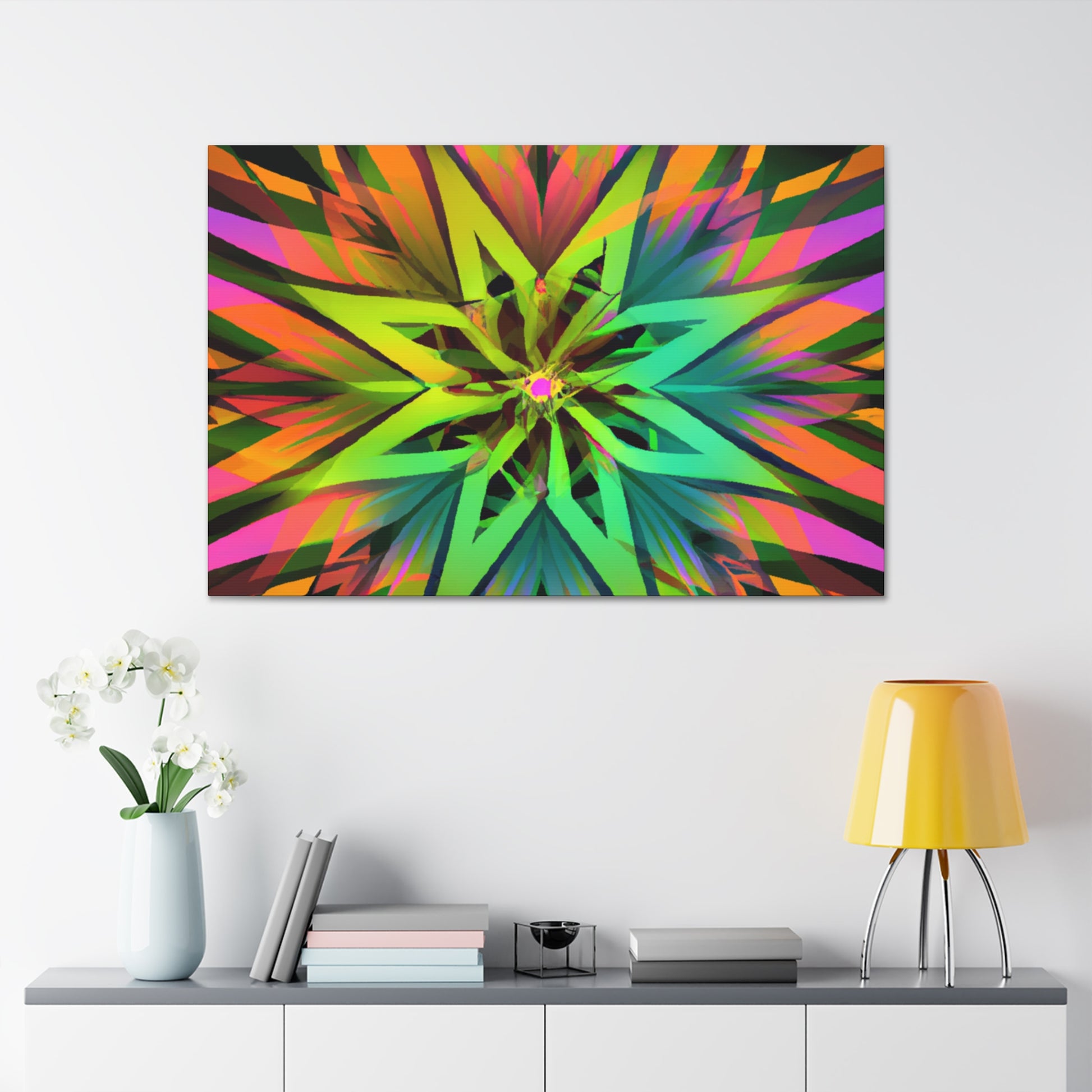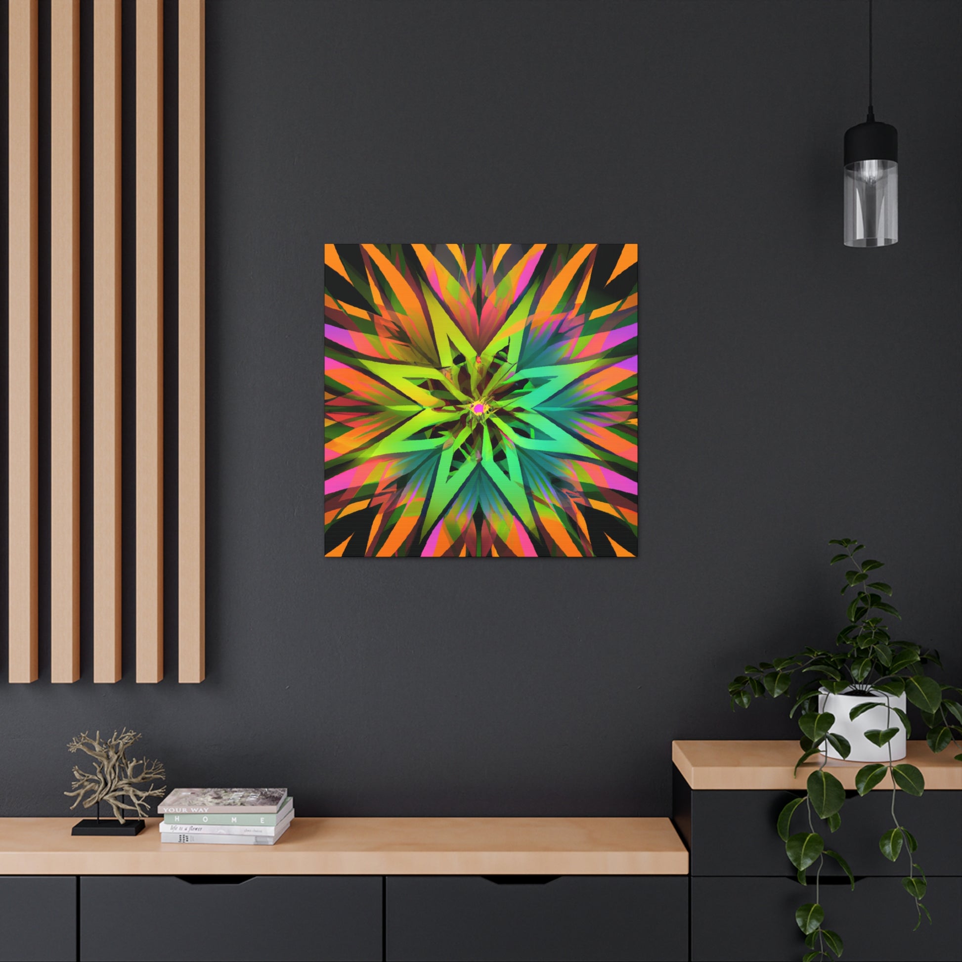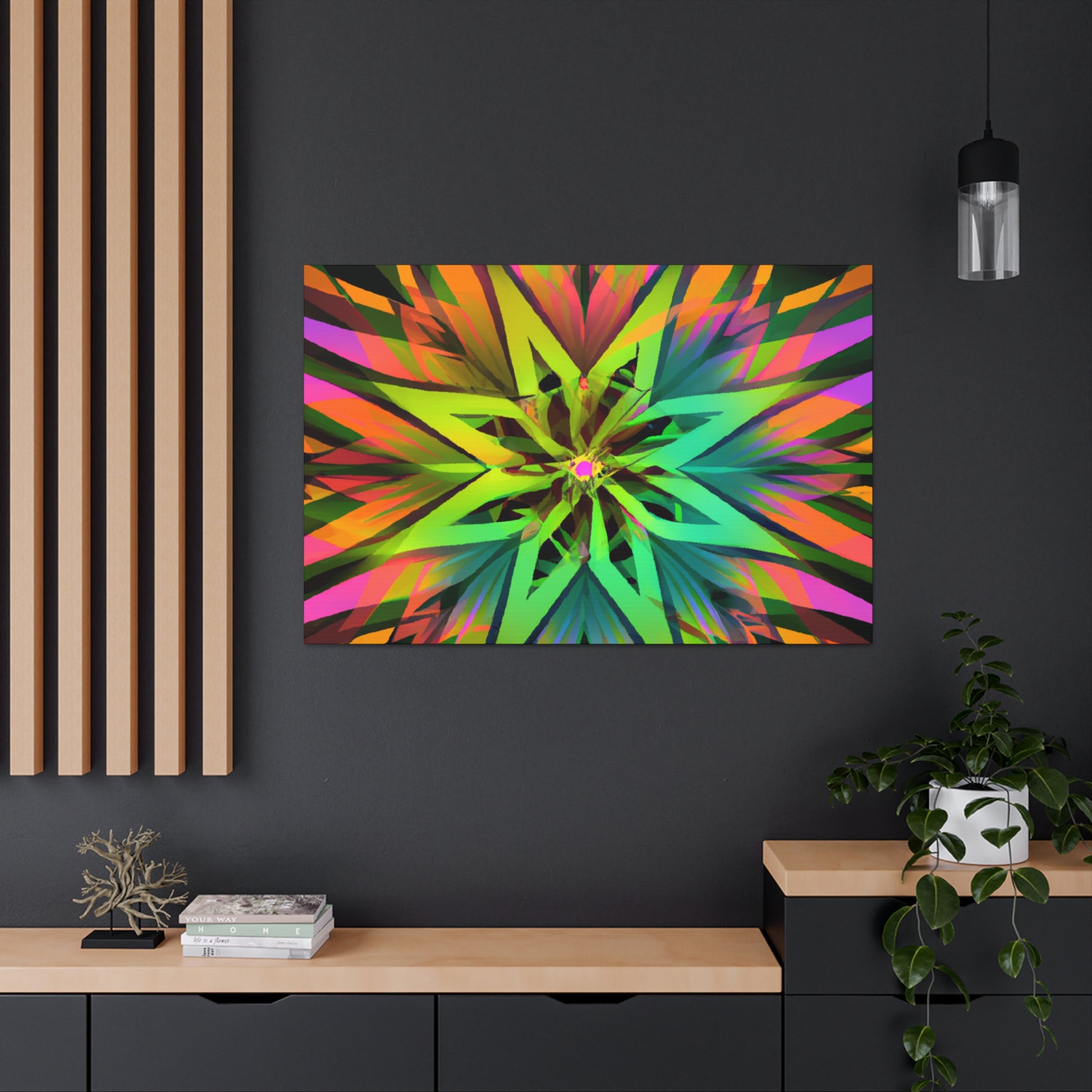 This beautiful and vibrant art canvas features an abstract collage of Trippy geometric palm leaves, kaleidoscope, 3D lines, and fractal designs. Embrace digital art with the eye-catching colours and the stunning visual of multiple art styles mixed together into one piece. Perfect for modern, contemporary, or eclectic tastes. #trippyart#geometricpalmleaves#kaleidoscope#abstractart#digialart#vibrantcolors#3dlines#fractal#homedecor#walldecor#artcanvas