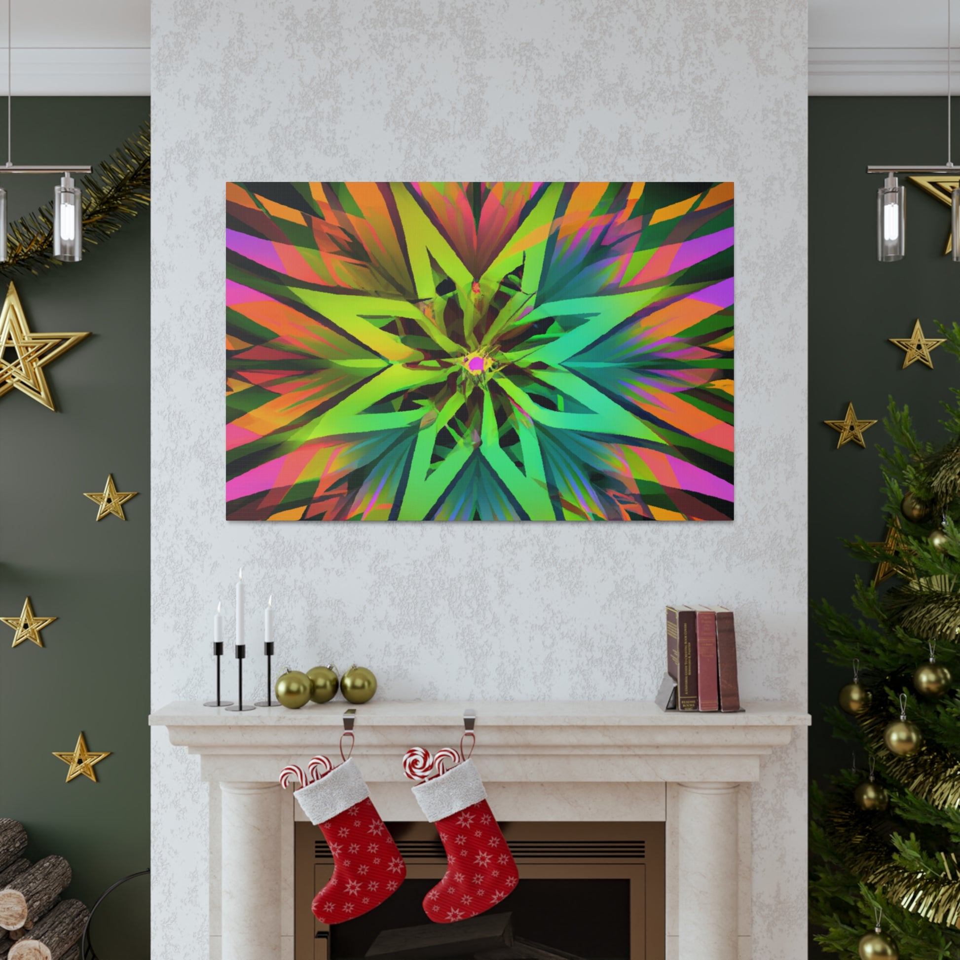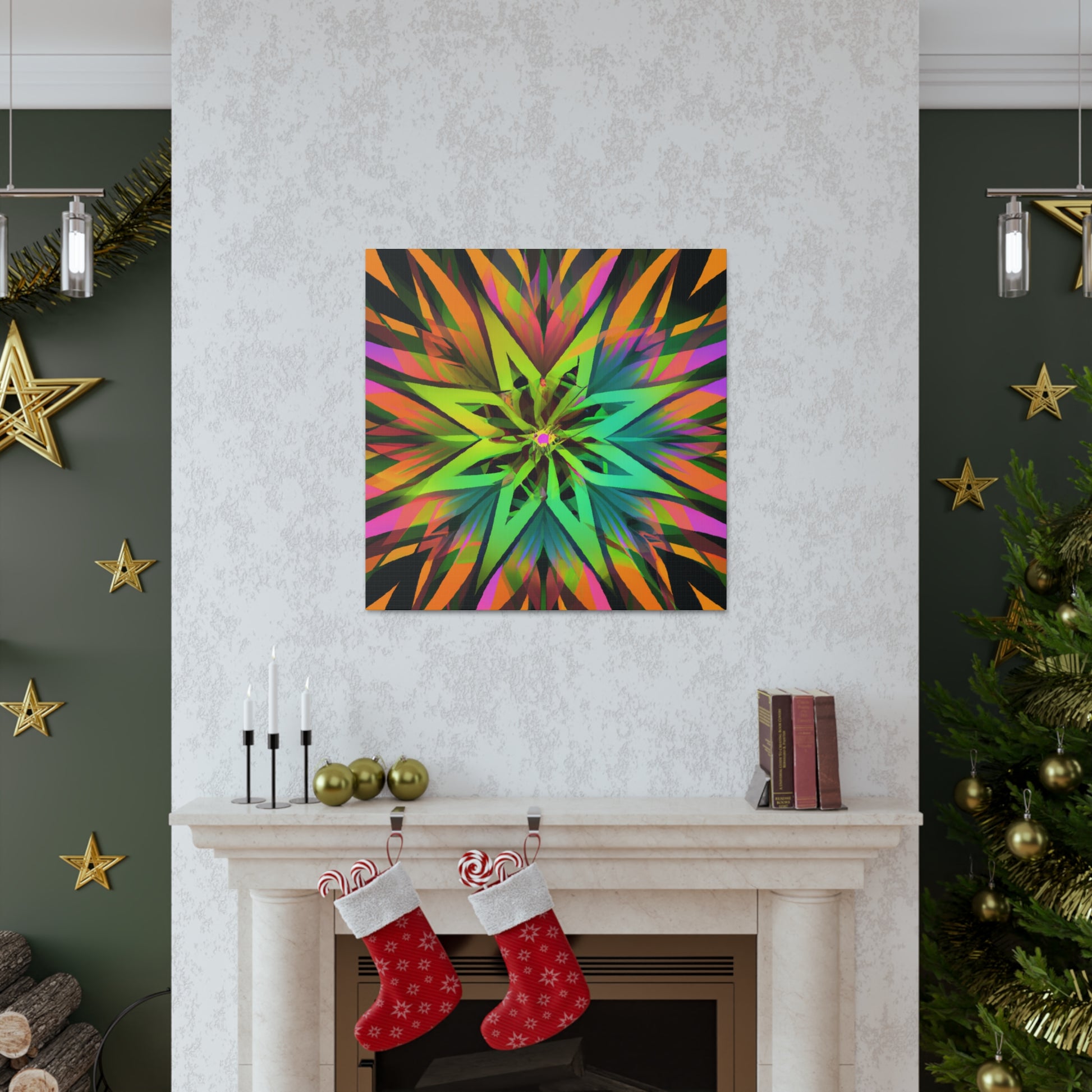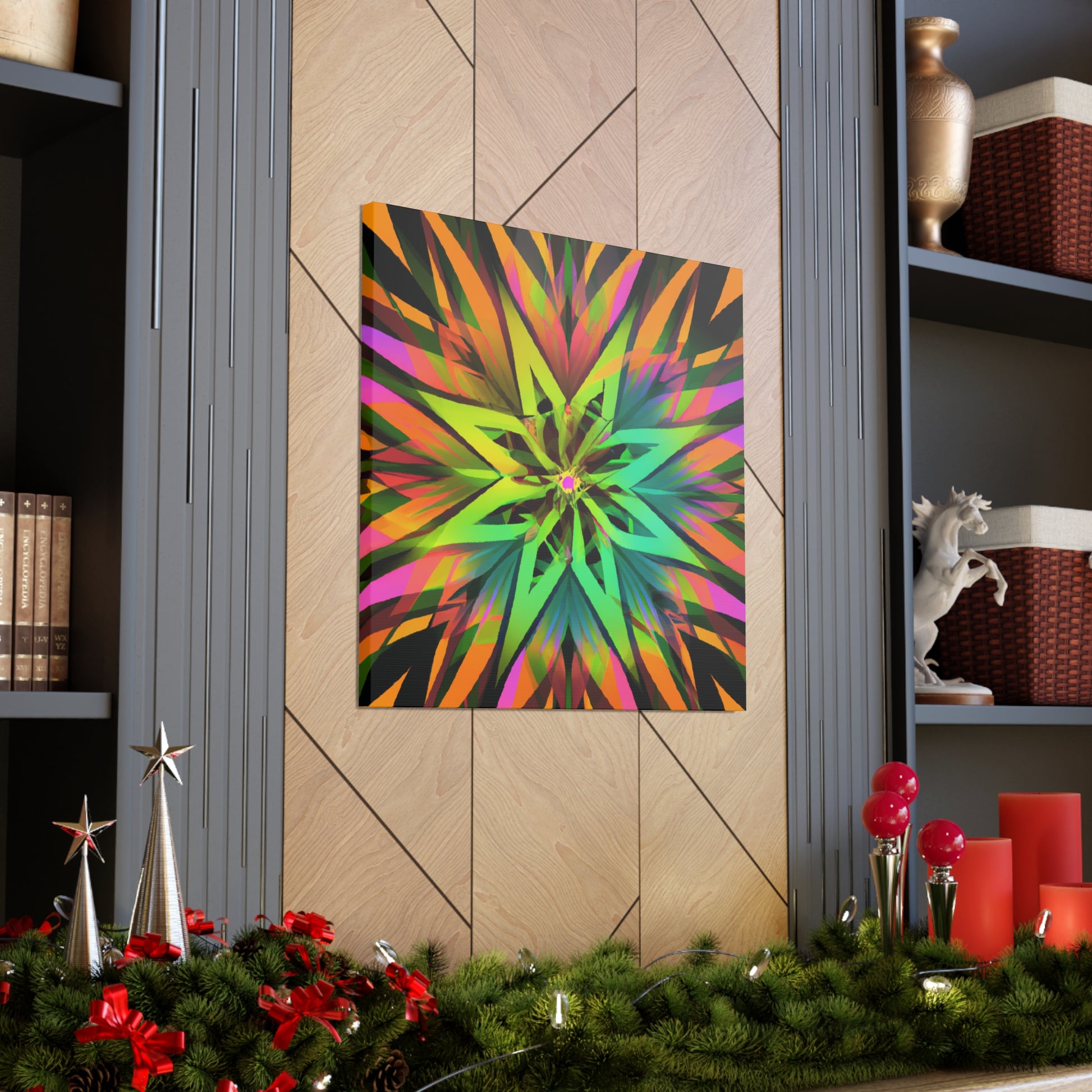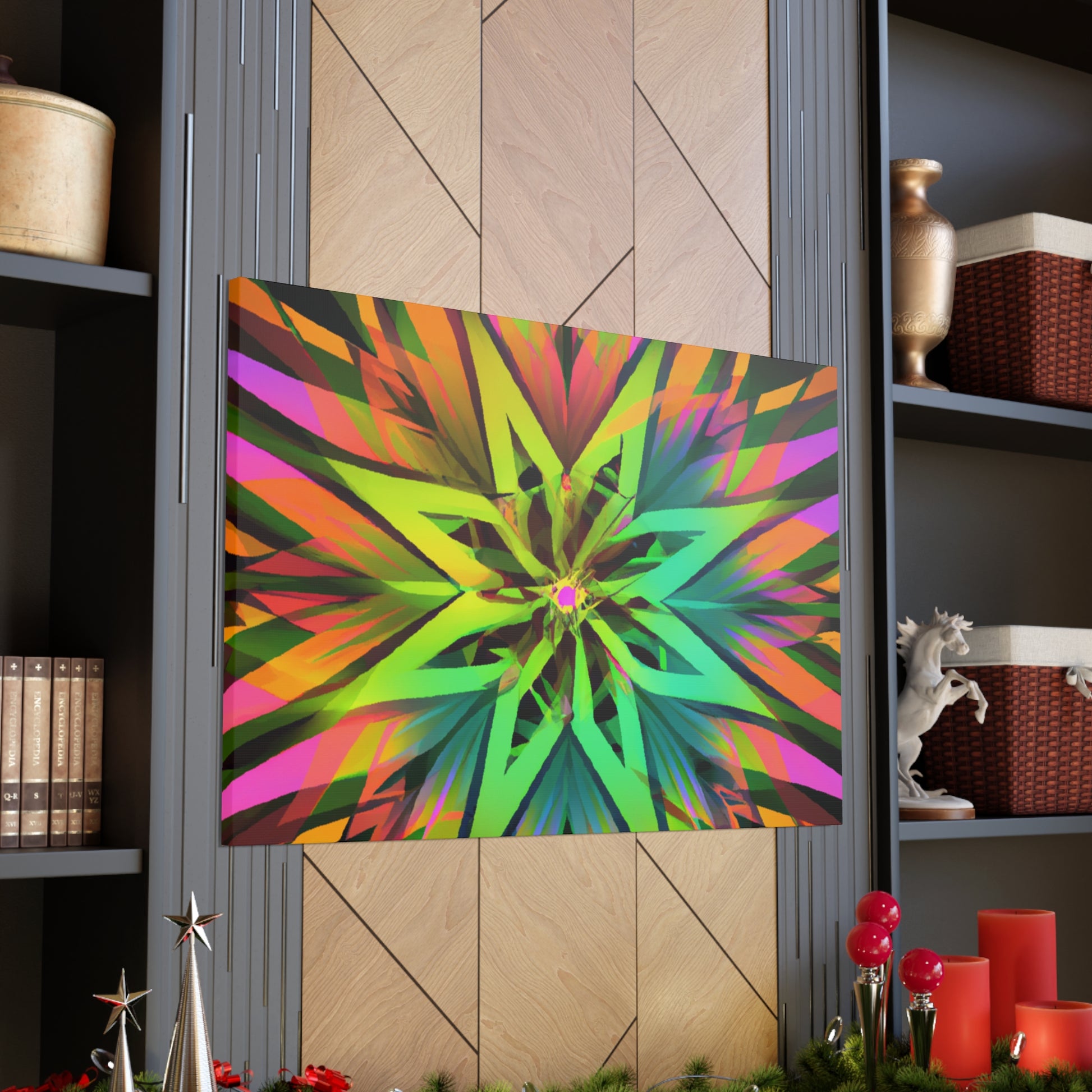 This beautiful and vibrant art canvas features an abstract collage of Trippy geometric palm leaves, kaleidoscope, 3D lines, and fractal designs. Embrace digital art with the eye-catching colours and the stunning visual of multiple art styles mixed together into one piece. Perfect for modern, contemporary, or eclectic tastes. #trippyart#geometricpalmleaves#kaleidoscope#abstractart#digialart#vibrantcolors#3dlines#fractal#homedecor#walldecor#artcanvas