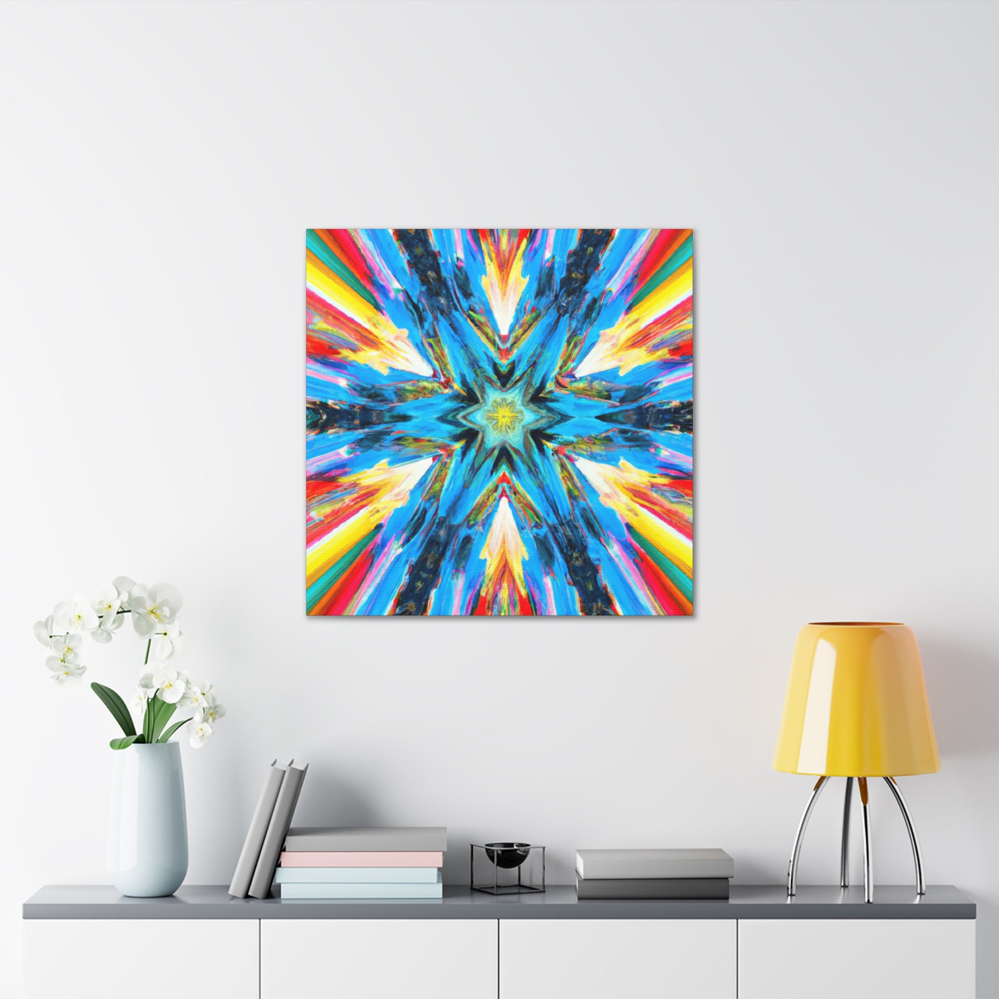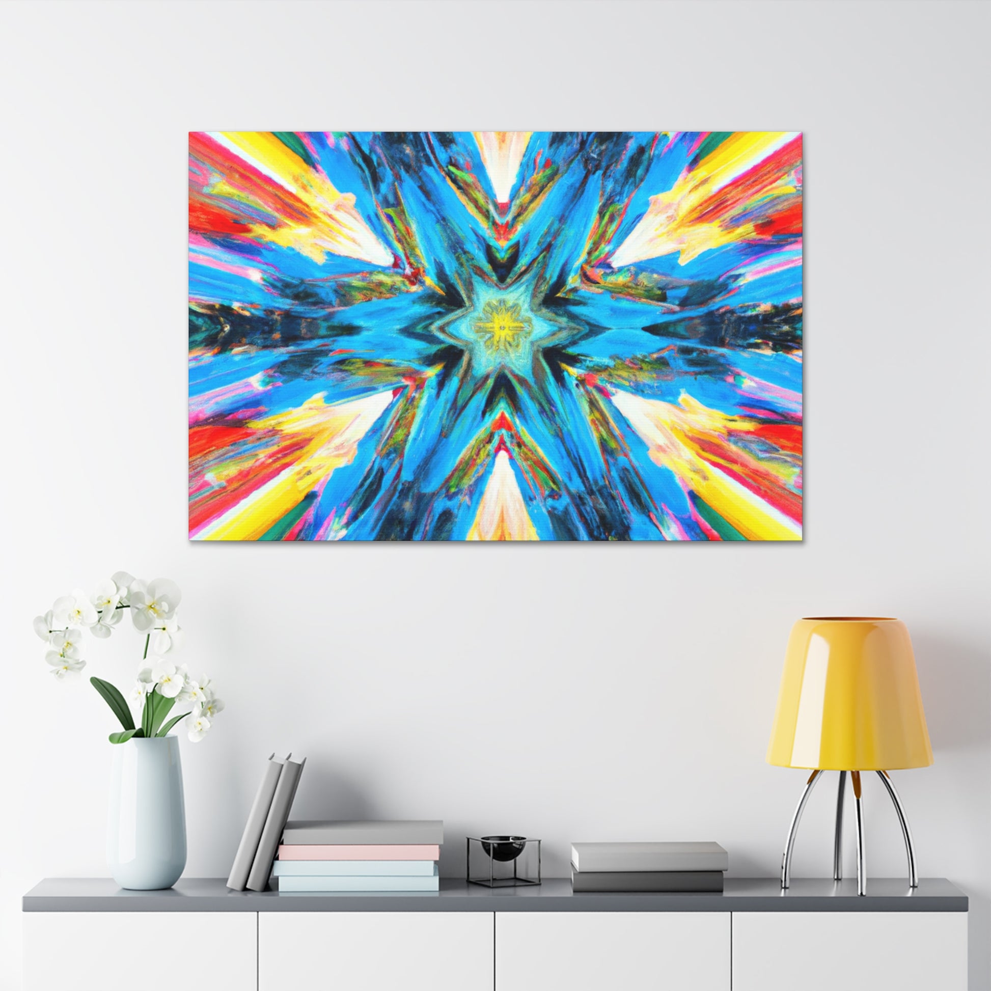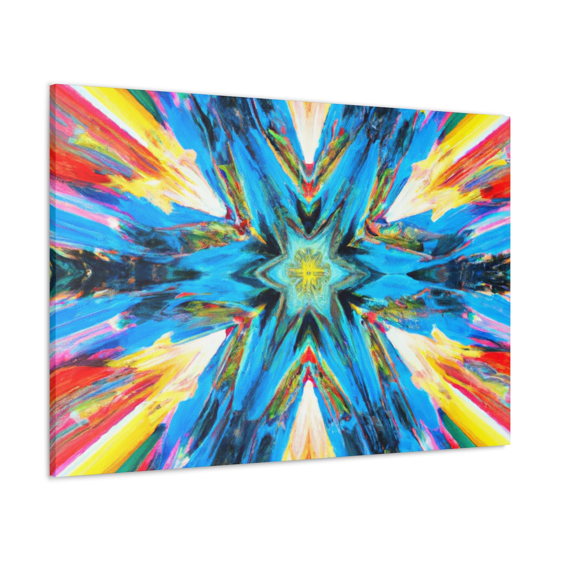 Modernize your decor with this beautiful canvas of abstract digital art featuring trippy stars, a kaleidoscope of vibrant colors and HD image quality. The makeup of the artwork is perfectly symmetrical to create an eye-catching style. So hang this unique canvas and be inspired! #abstractart #digitalart #trippystars #kaleidoscope #vibrantcolors #HDimage #uniqueart #wallartdesign #symmetrical #canvasart #inspiration