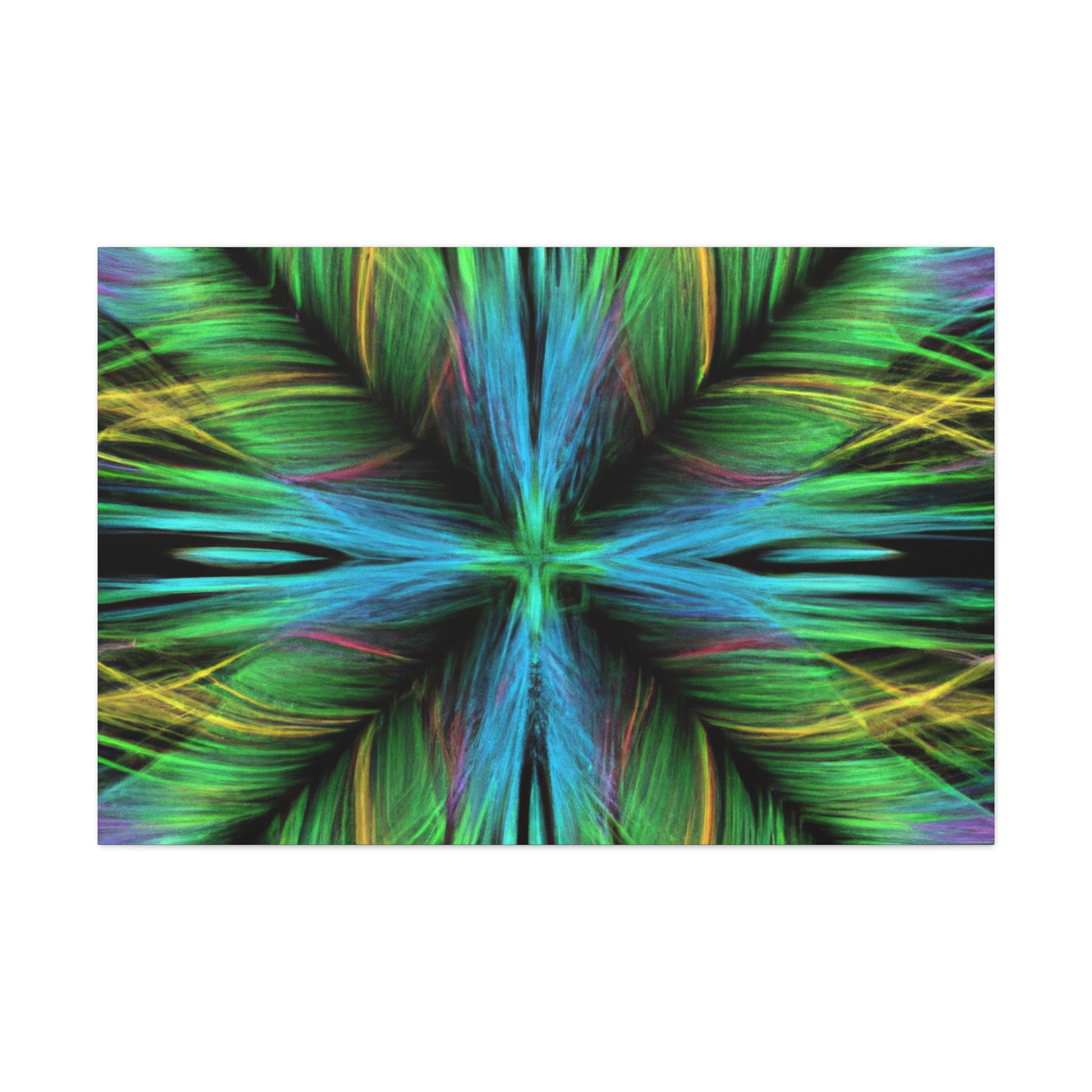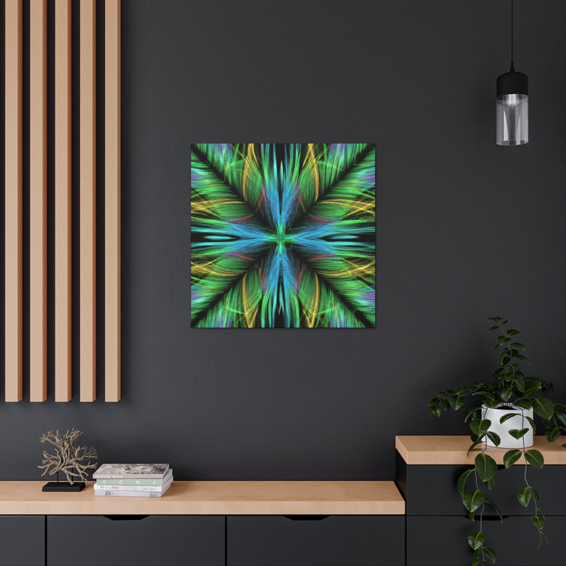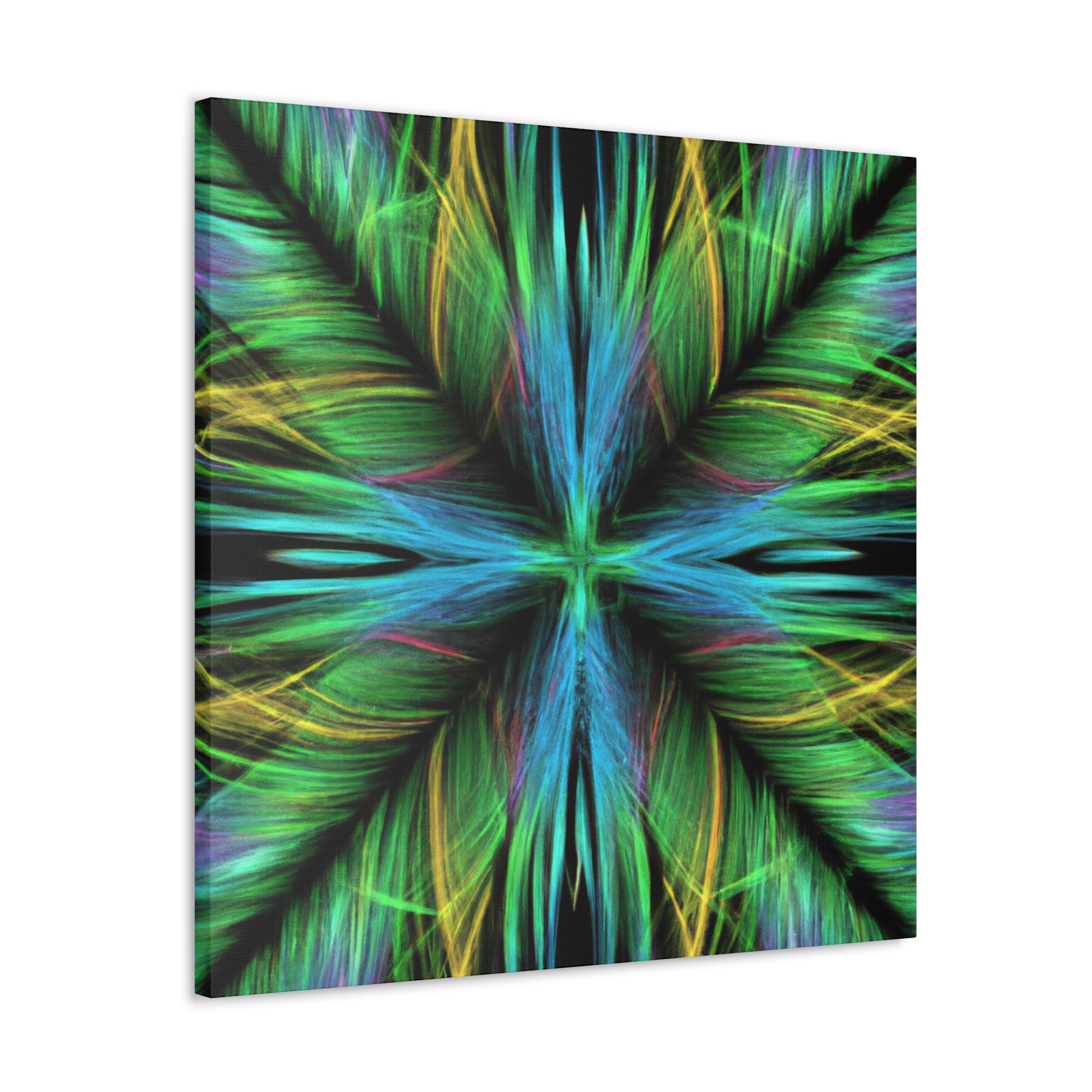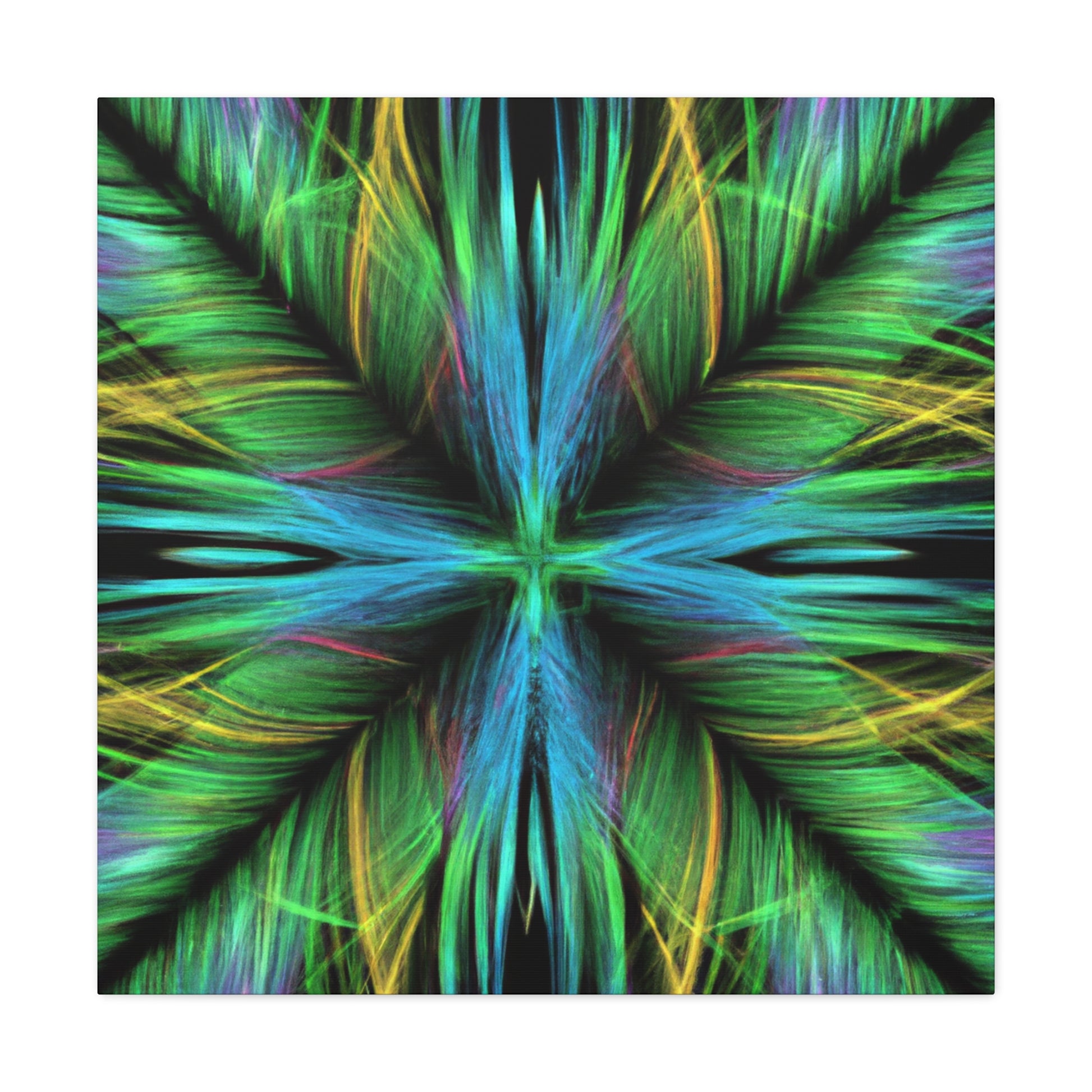 Be captivated by the mesmerizing abstract artwork of this hand-crafted canvas! Trippy geometric palm leaves, kaleidoscope abstract art, vibrant colors and 3D lines create a beautiful fractal pattern. It's sure to capture your guests attention and add a vibrancy to any interior design. #trippy #geometric #palmleaves #kaleidoscope #abstractart #vibrantcolors #3Dlines #fractal #decoration #homedecor #art