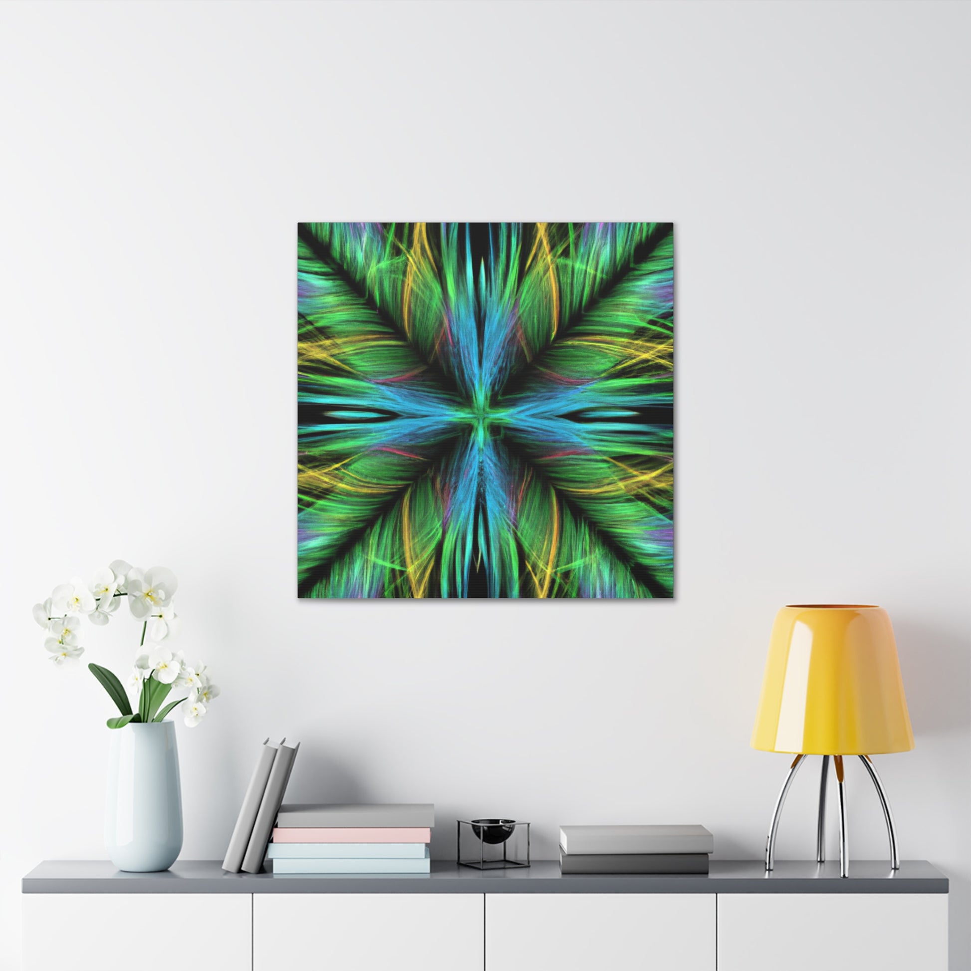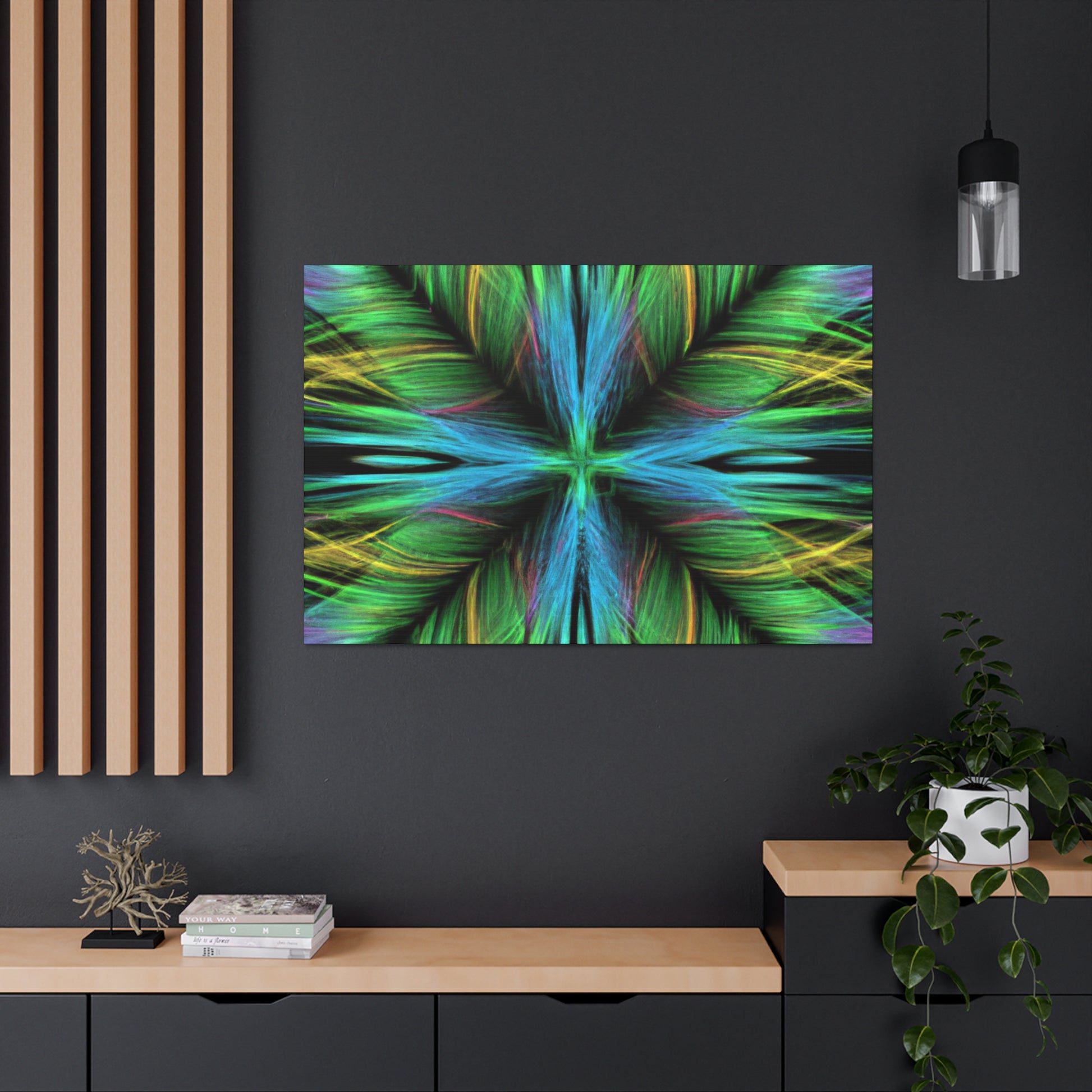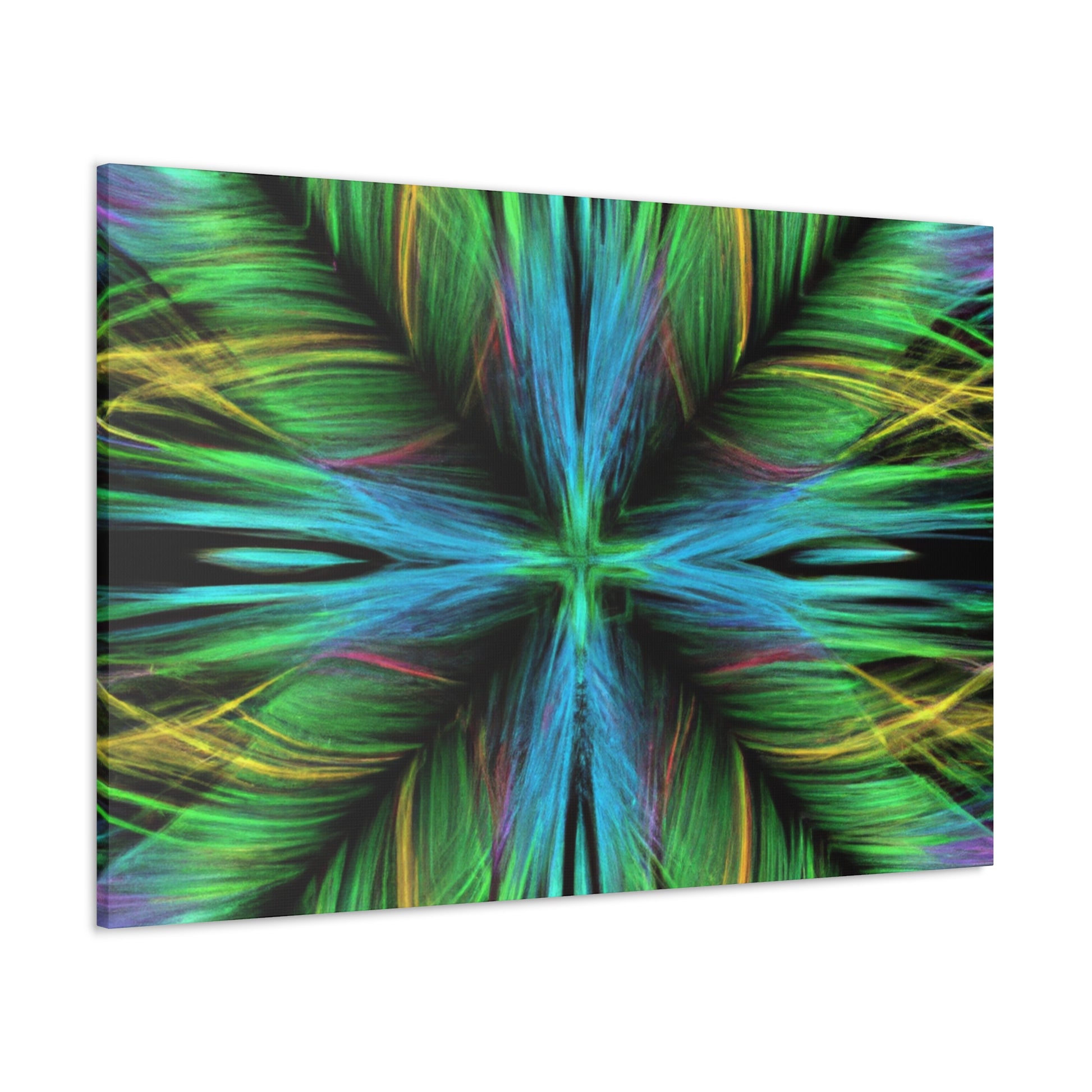 Be captivated by the mesmerizing abstract artwork of this hand-crafted canvas! Trippy geometric palm leaves, kaleidoscope abstract art, vibrant colors and 3D lines create a beautiful fractal pattern. It's sure to capture your guests attention and add a vibrancy to any interior design. #trippy #geometric #palmleaves #kaleidoscope #abstractart #vibrantcolors #3Dlines #fractal #decoration #homedecor #art