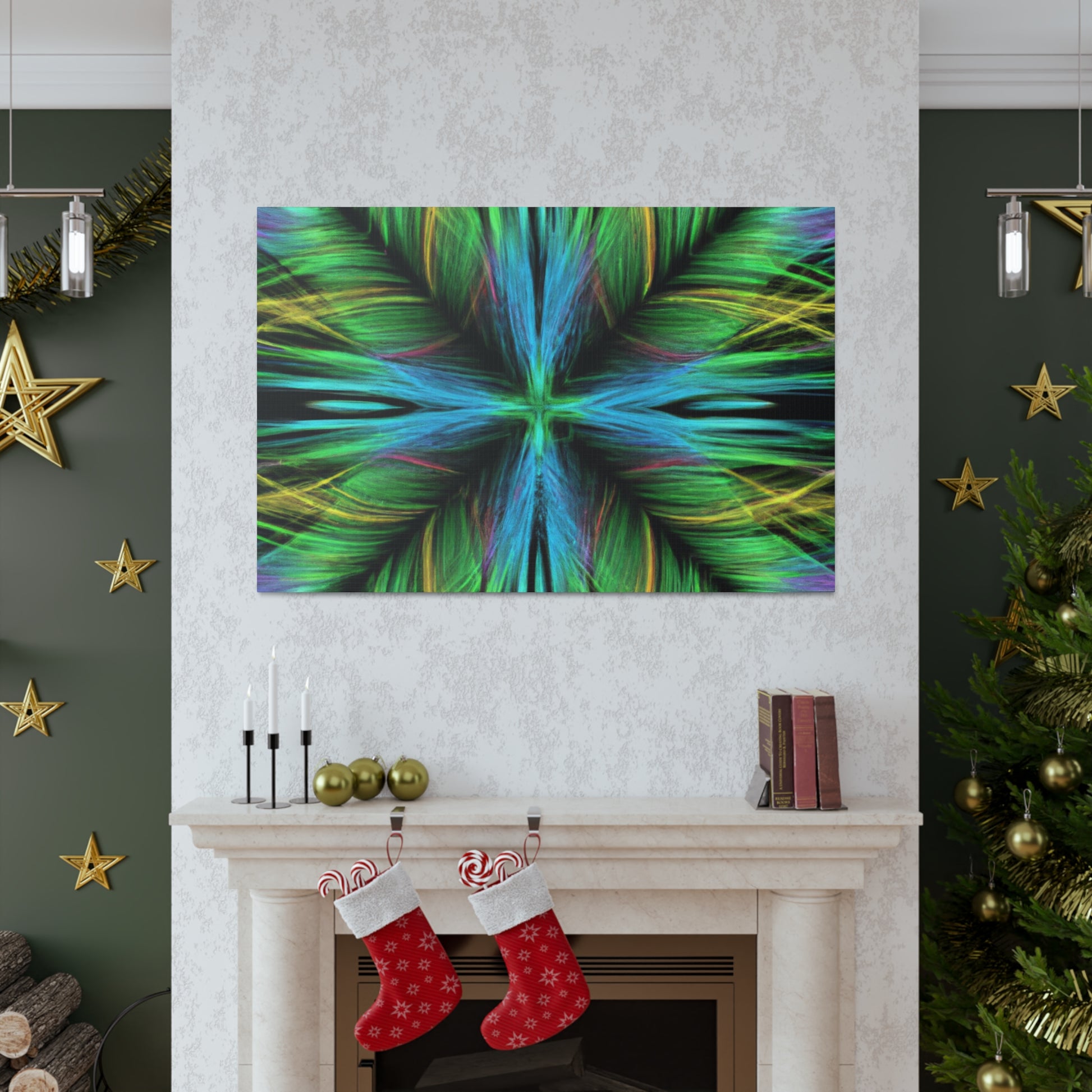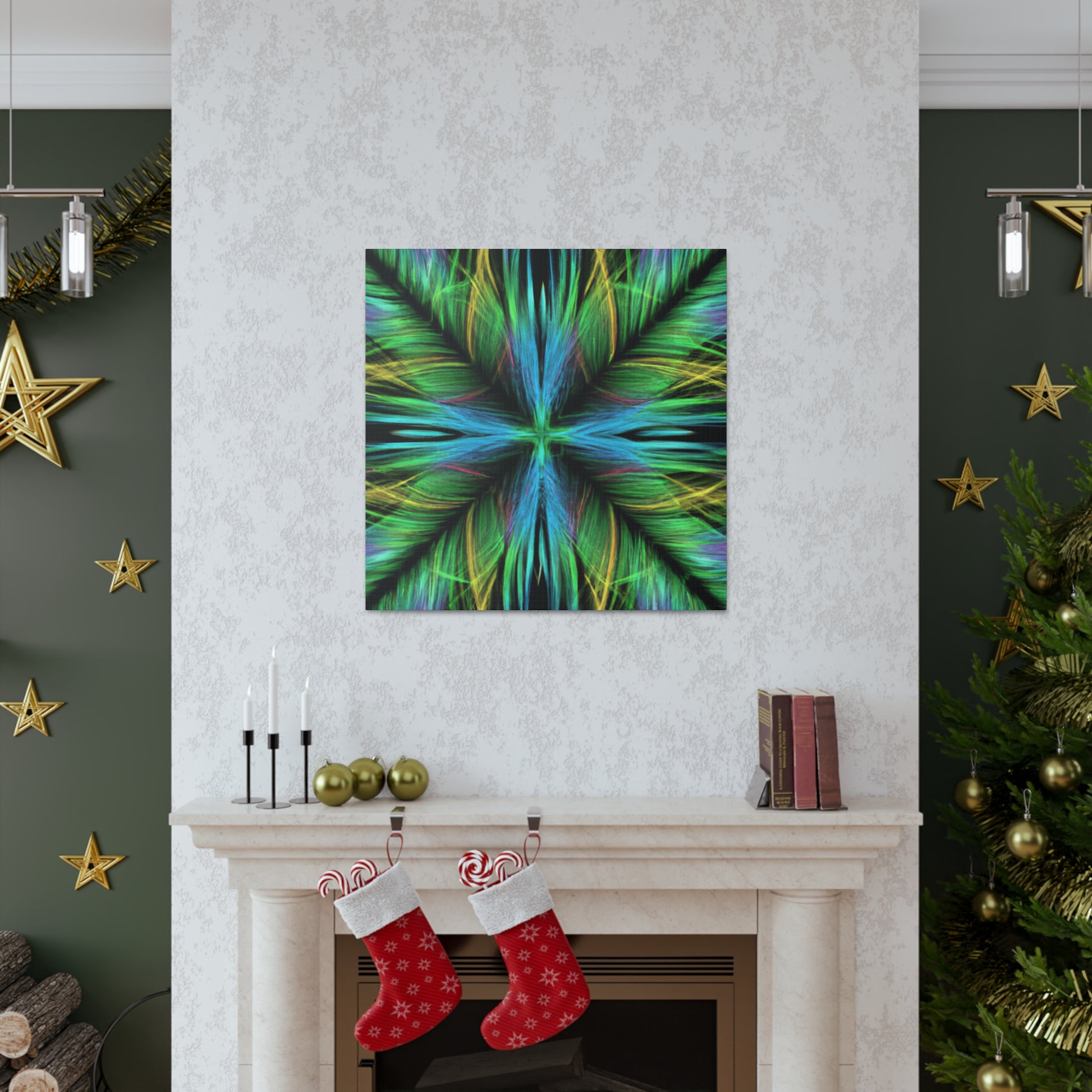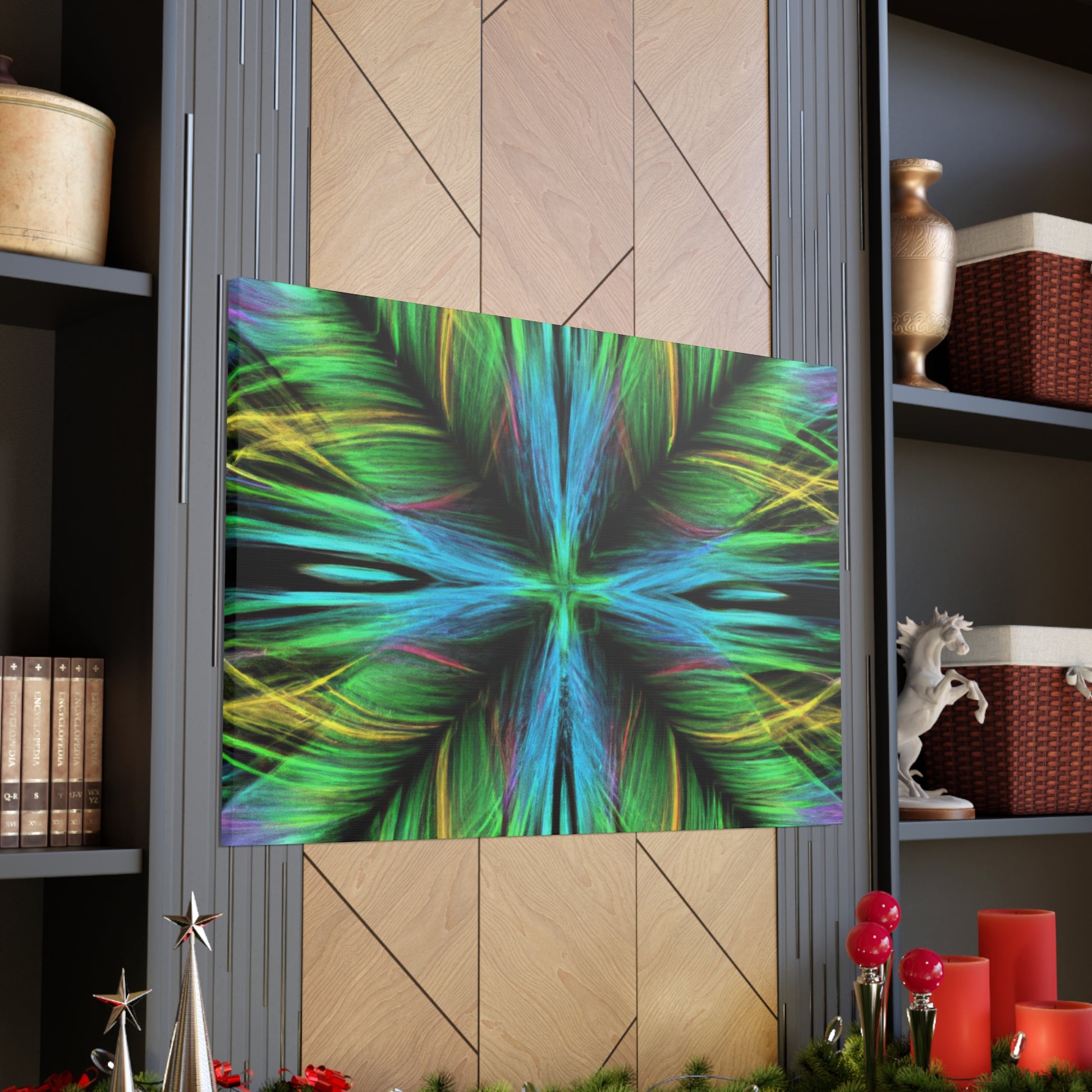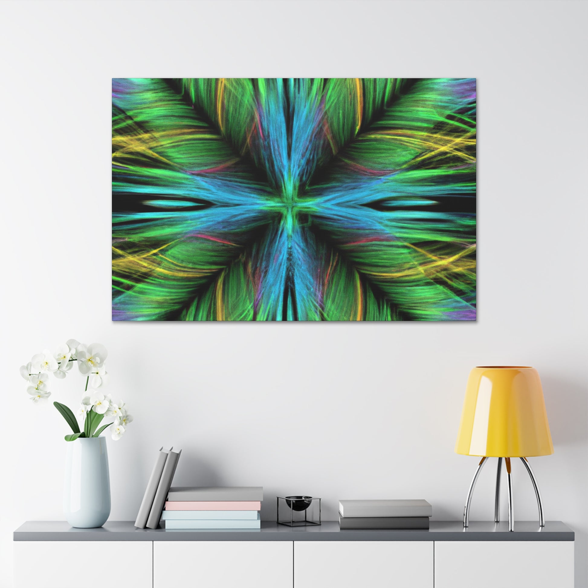 Be captivated by the mesmerizing abstract artwork of this hand-crafted canvas! Trippy geometric palm leaves, kaleidoscope abstract art, vibrant colors and 3D lines create a beautiful fractal pattern. It's sure to capture your guests attention and add a vibrancy to any interior design. #trippy #geometric #palmleaves #kaleidoscope #abstractart #vibrantcolors #3Dlines #fractal #decoration #homedecor #art