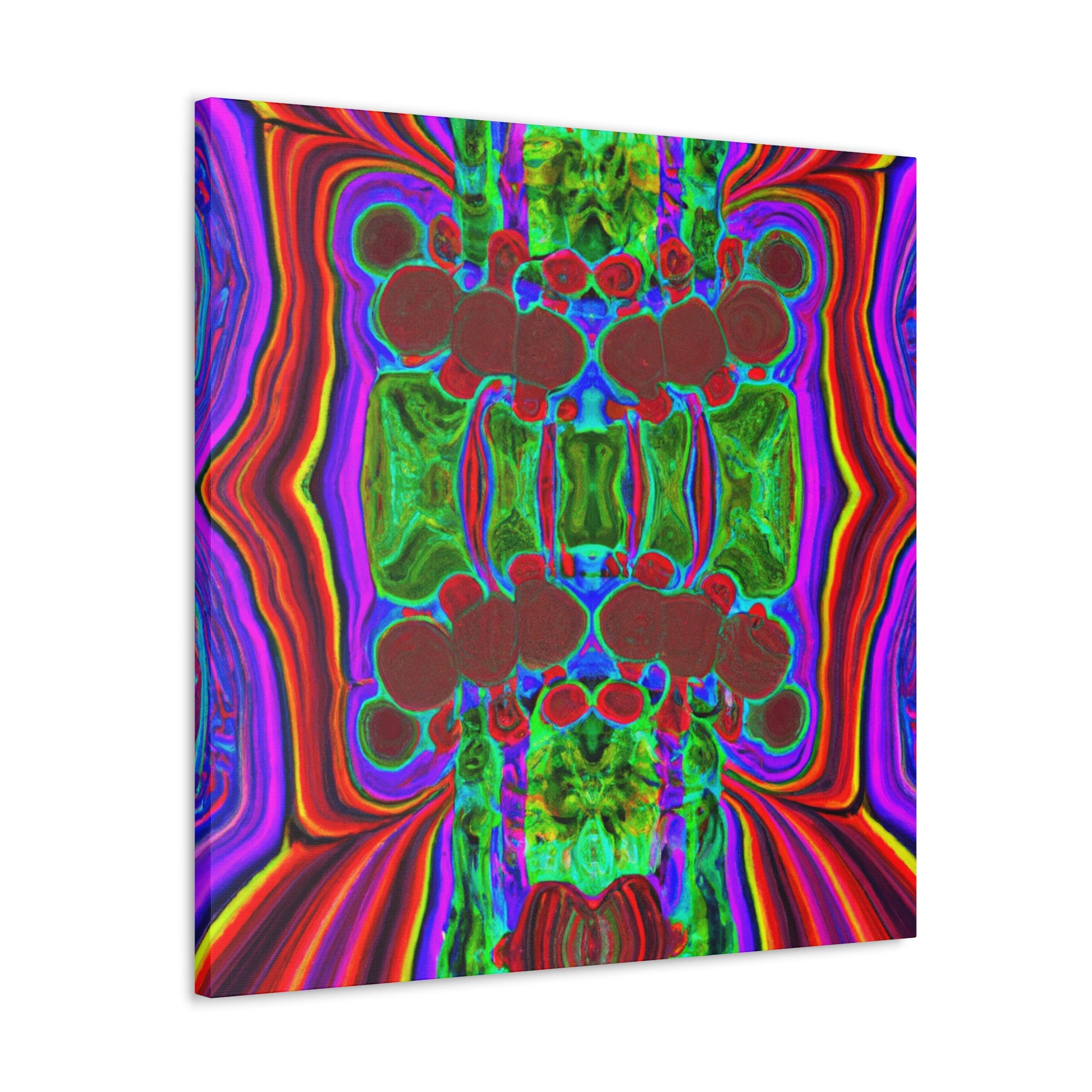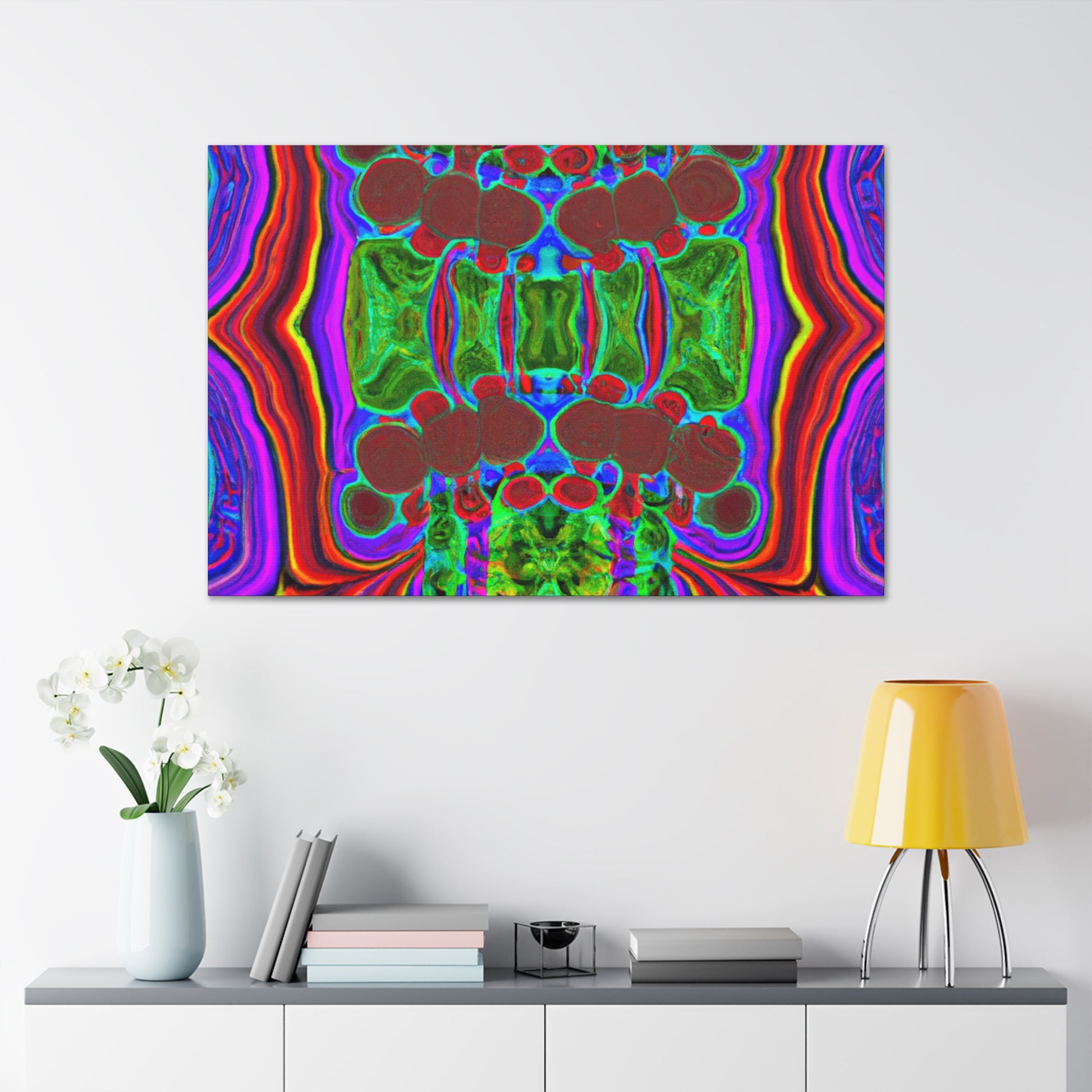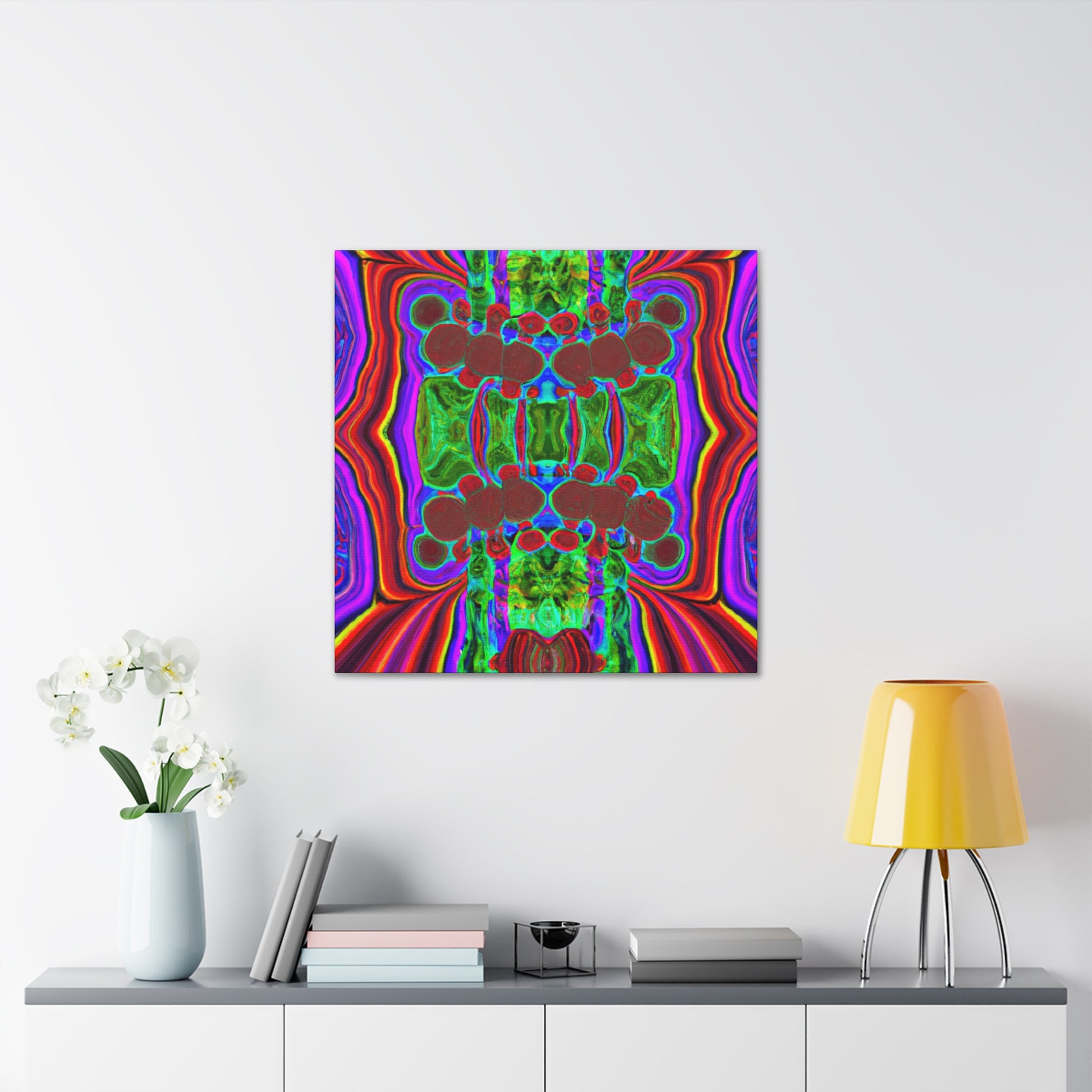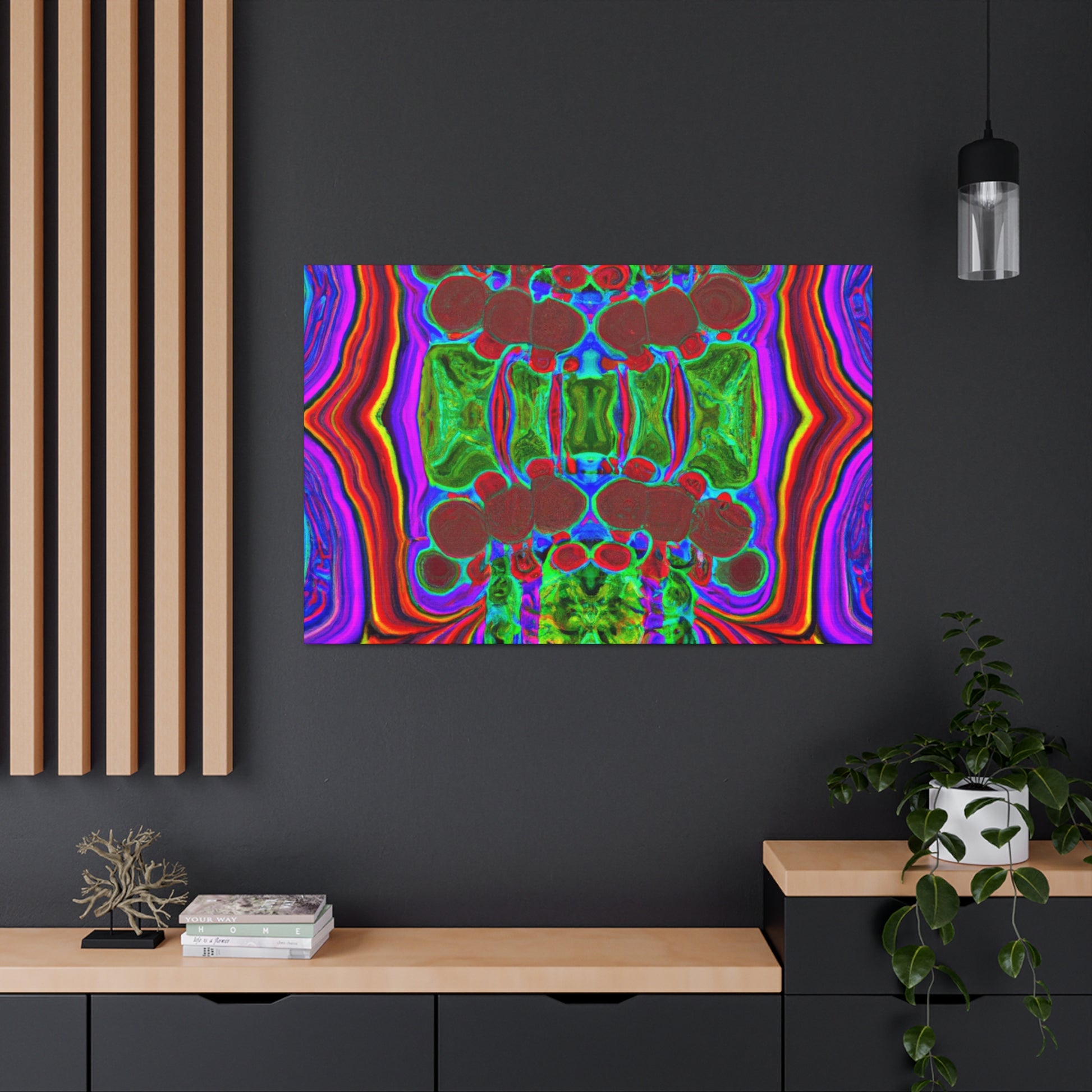 This unique and modern canvas features trippy mushrooms, kaleidoscope, abstract, digital art, and vibrant colors all combined with 3D lines. This mesmerizing and eye-catching piece of art will add a pop of color and texture to your home, and will create a conversation starter every guest will love. #abstractart #vibrantcolors #3Dlines #digitalart #kaleidoscope #trippymushrooms #homedecor #modernart #wallart #canvasart