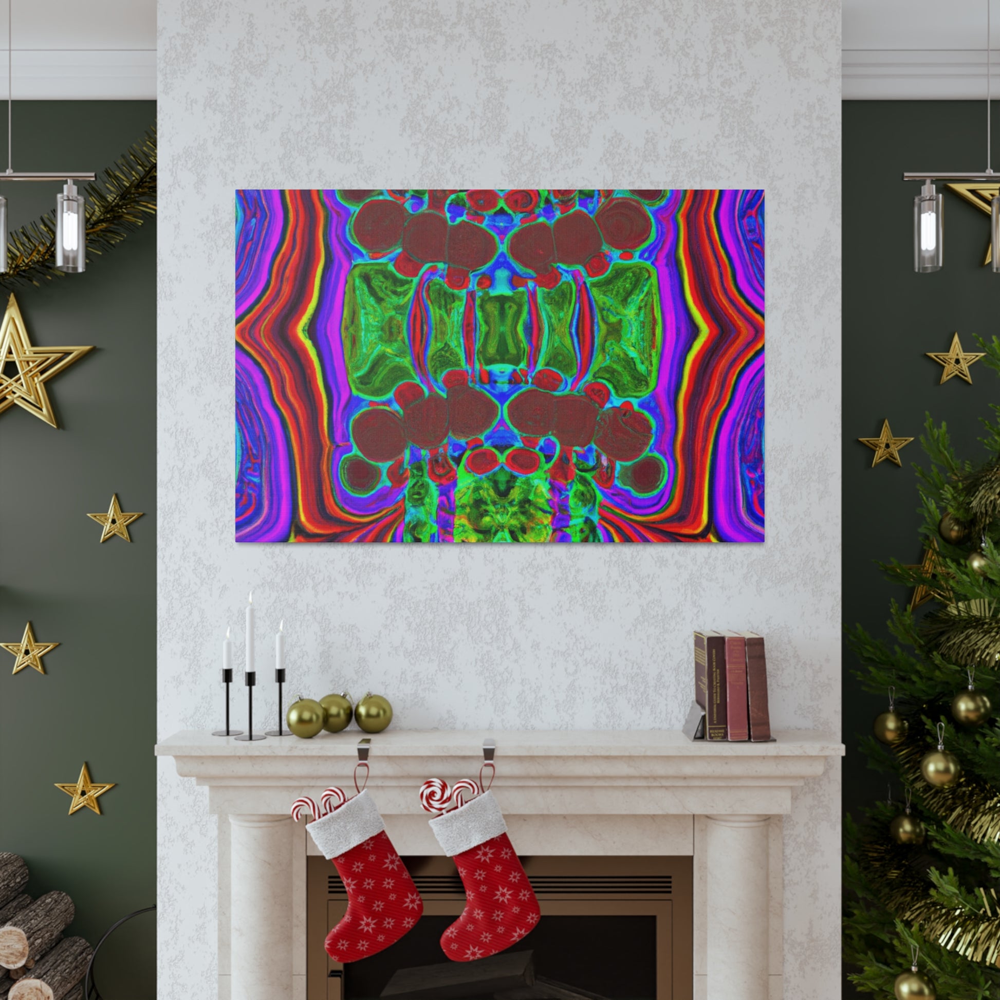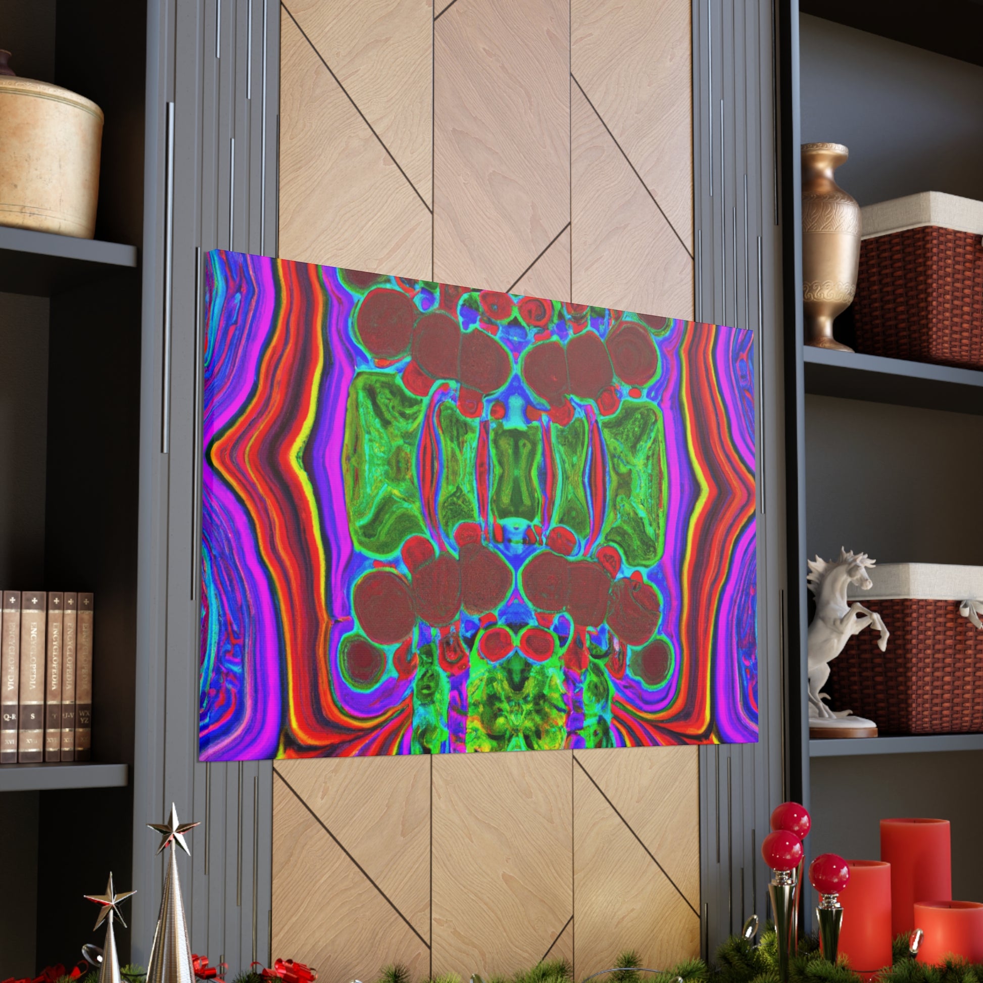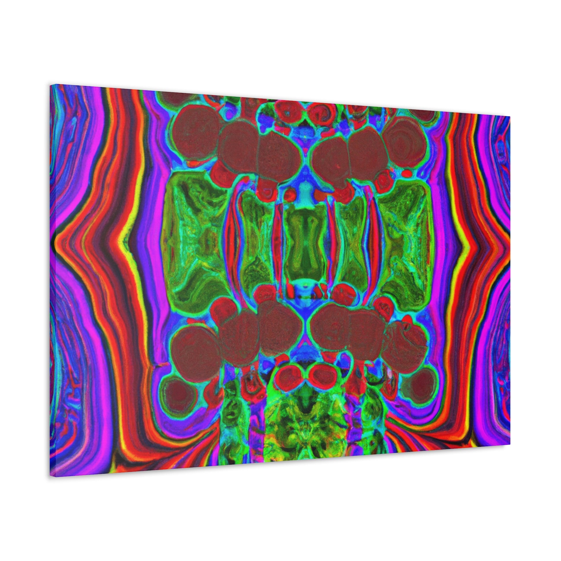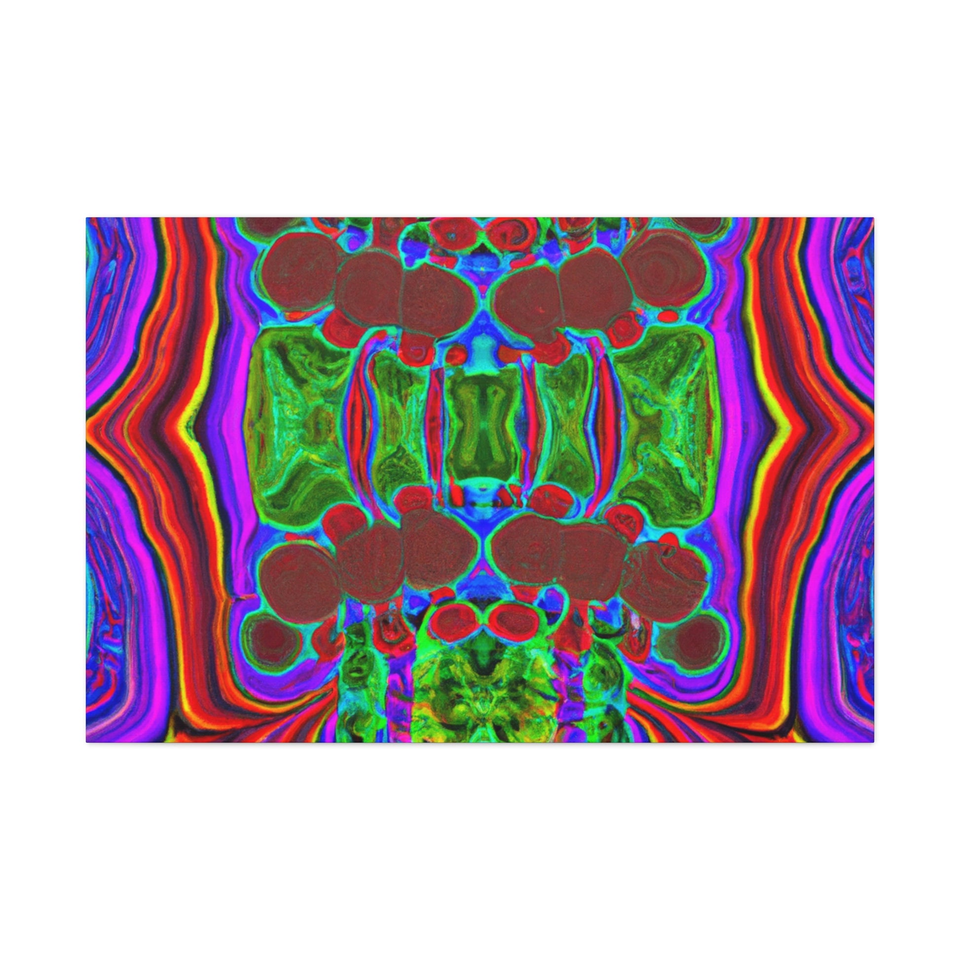 This unique and modern canvas features trippy mushrooms, kaleidoscope, abstract, digital art, and vibrant colors all combined with 3D lines. This mesmerizing and eye-catching piece of art will add a pop of color and texture to your home, and will create a conversation starter every guest will love. #abstractart #vibrantcolors #3Dlines #digitalart #kaleidoscope #trippymushrooms #homedecor #modernart #wallart #canvasart