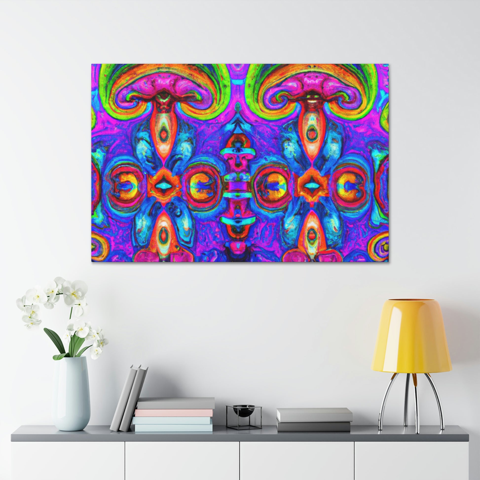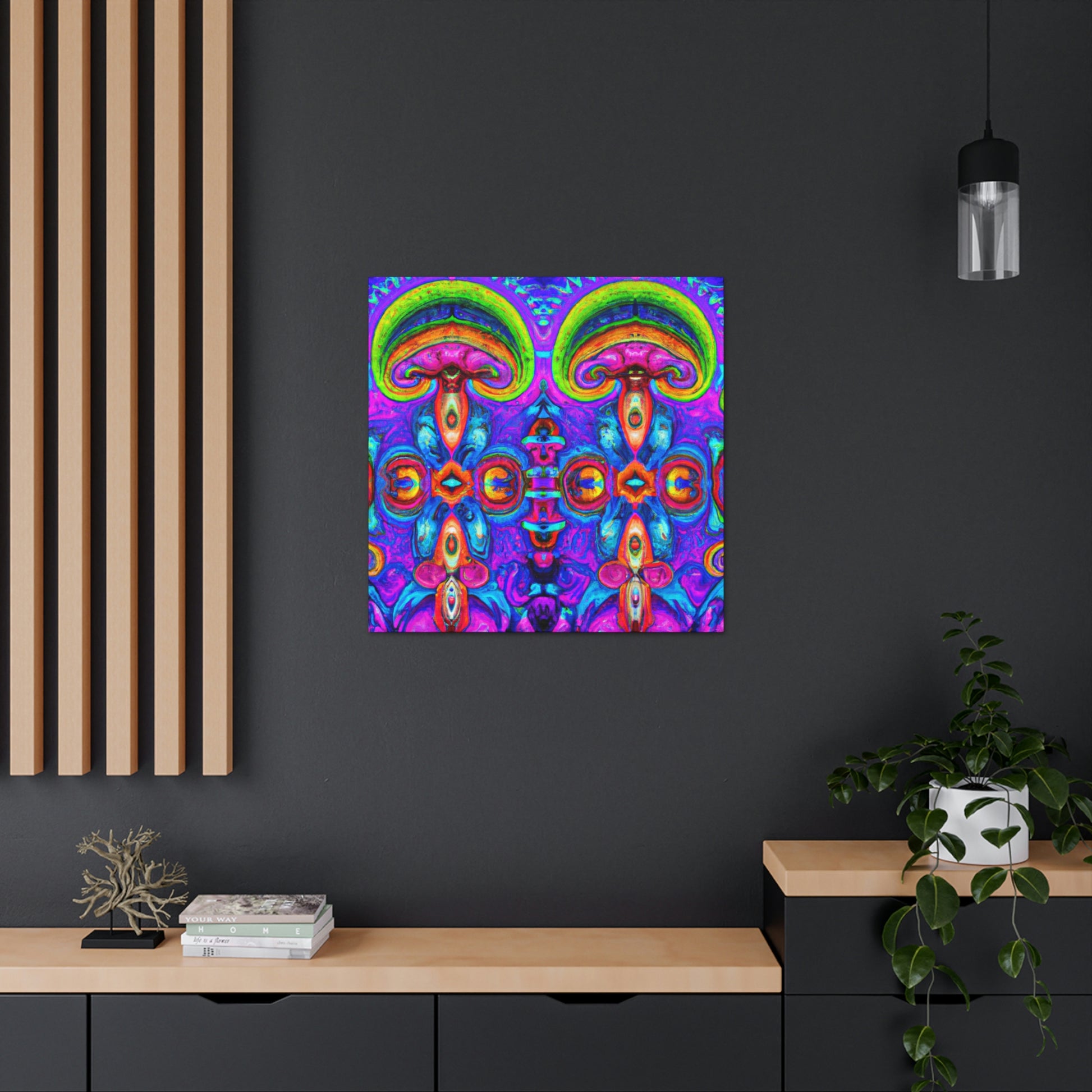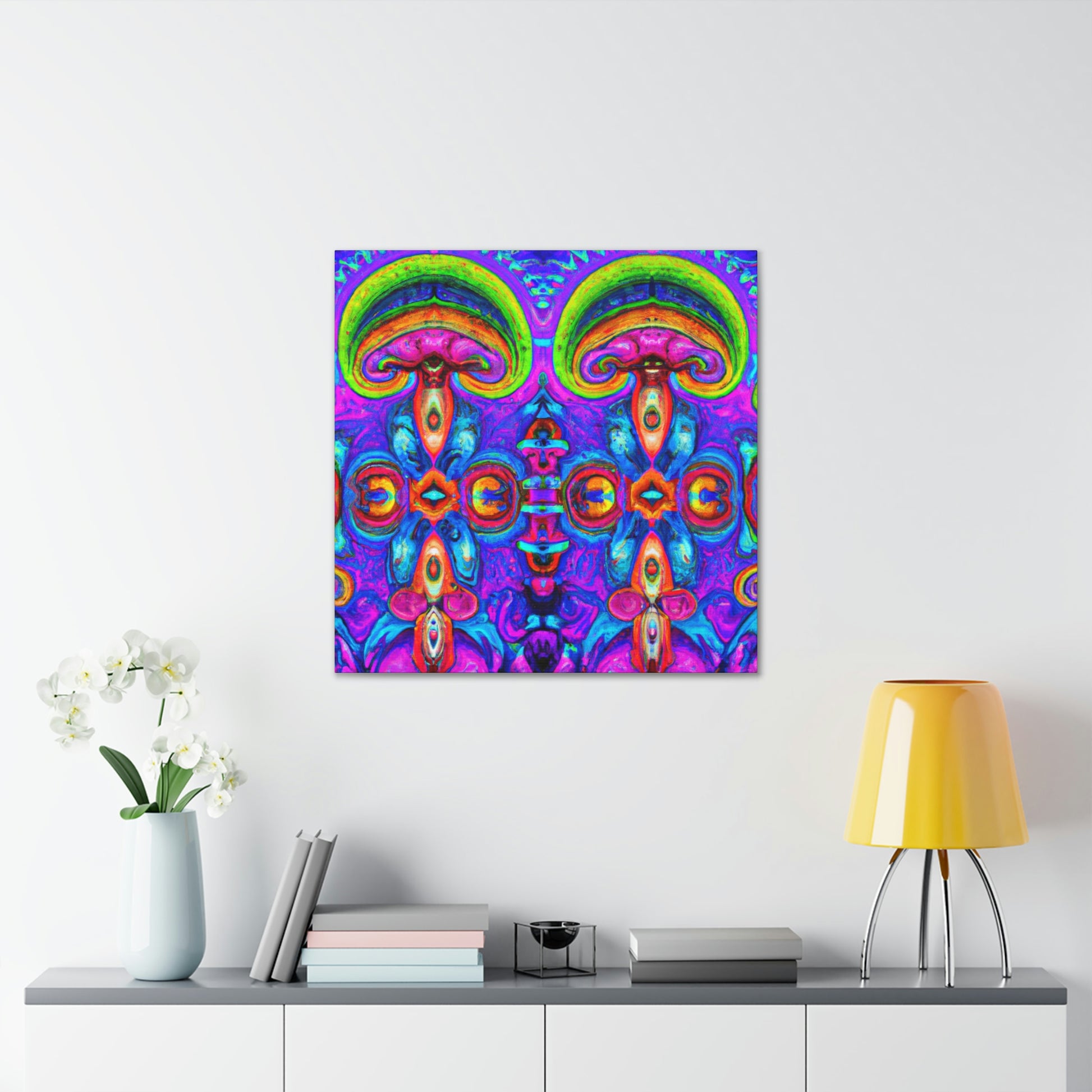 This vibrant digital art canvas features a psychedelic visual of abstract shapes, vibrant colors and intricate 3D lines, all centered around a kaleidoscopic design of trippy mushrooms. With its beautiful, eye-catching detail, this 3D art is sure to be the perfect statement piece in any room. #digitalart #canvas #mushroom #kaleidoscope #trippy #3Dlines #3Dart #abstract #vibrantcolors #psychedelic #statementpiece