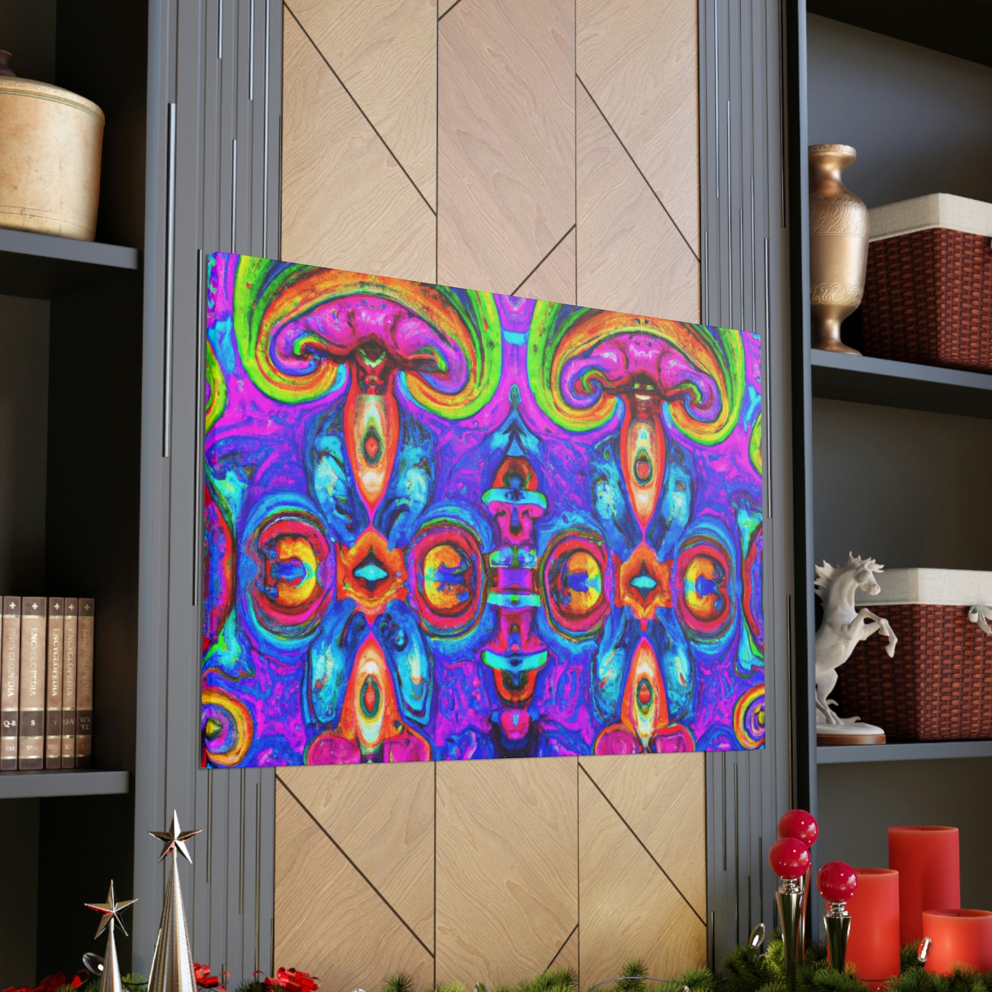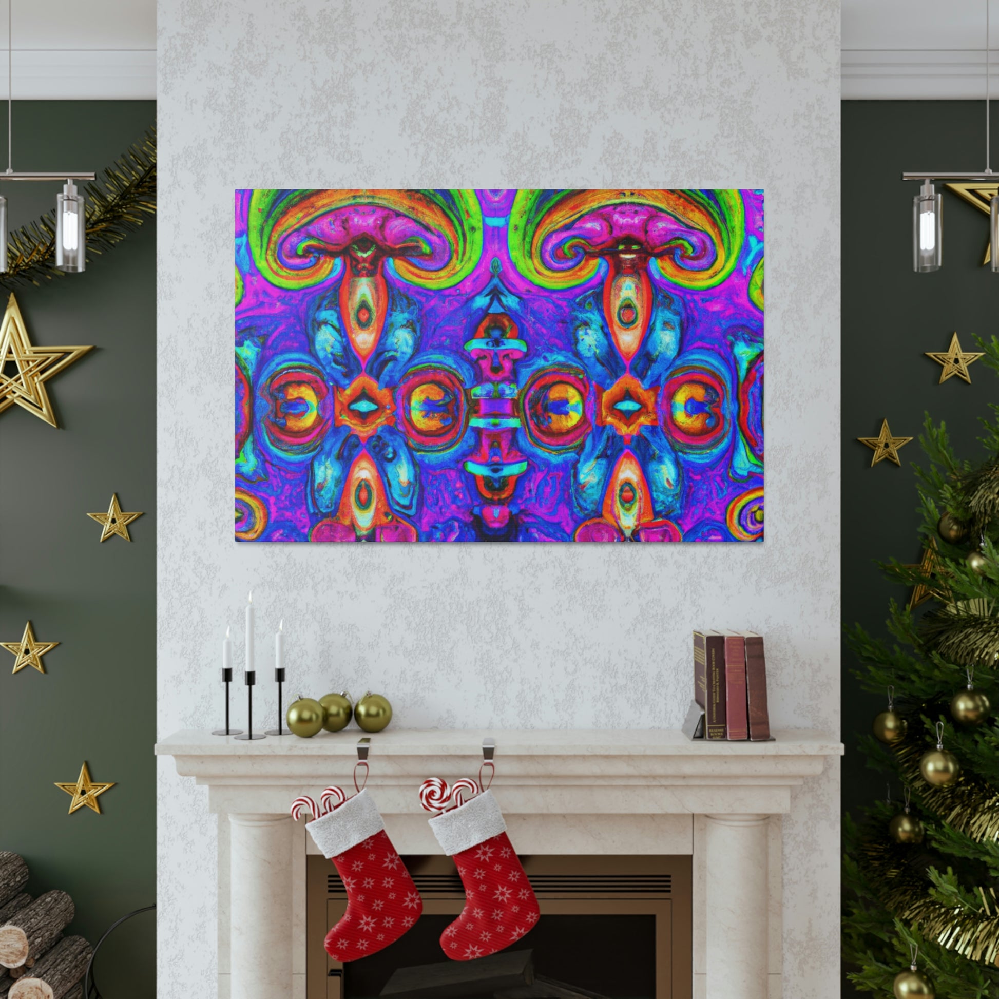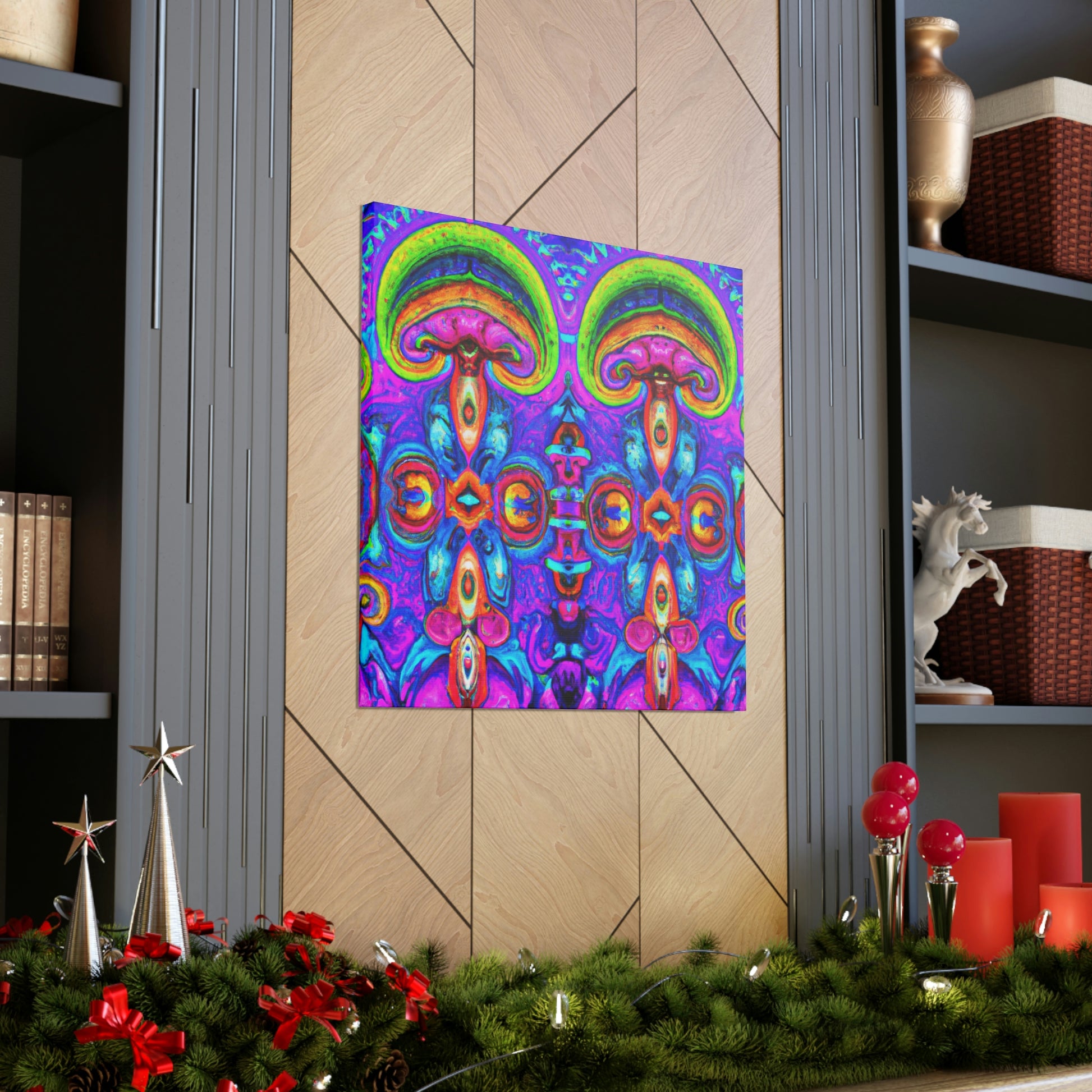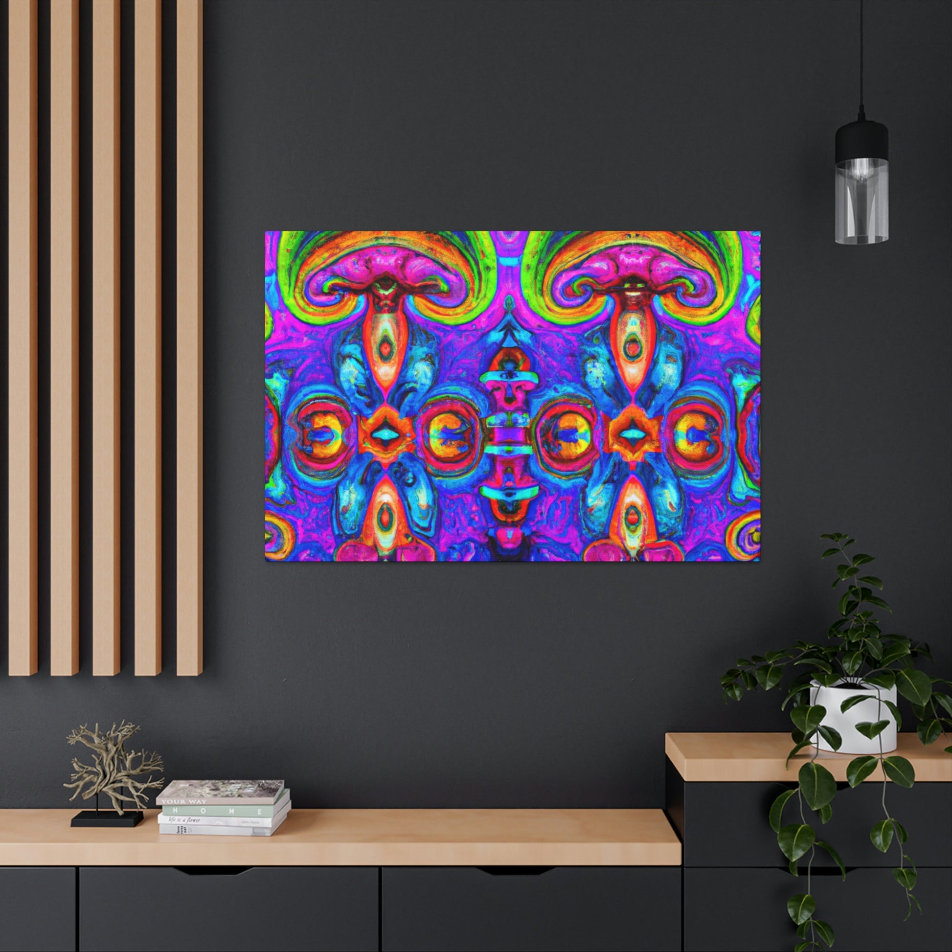 This vibrant digital art canvas features a psychedelic visual of abstract shapes, vibrant colors and intricate 3D lines, all centered around a kaleidoscopic design of trippy mushrooms. With its beautiful, eye-catching detail, this 3D art is sure to be the perfect statement piece in any room. #digitalart #canvas #mushroom #kaleidoscope #trippy #3Dlines #3Dart #abstract #vibrantcolors #psychedelic #statementpiece