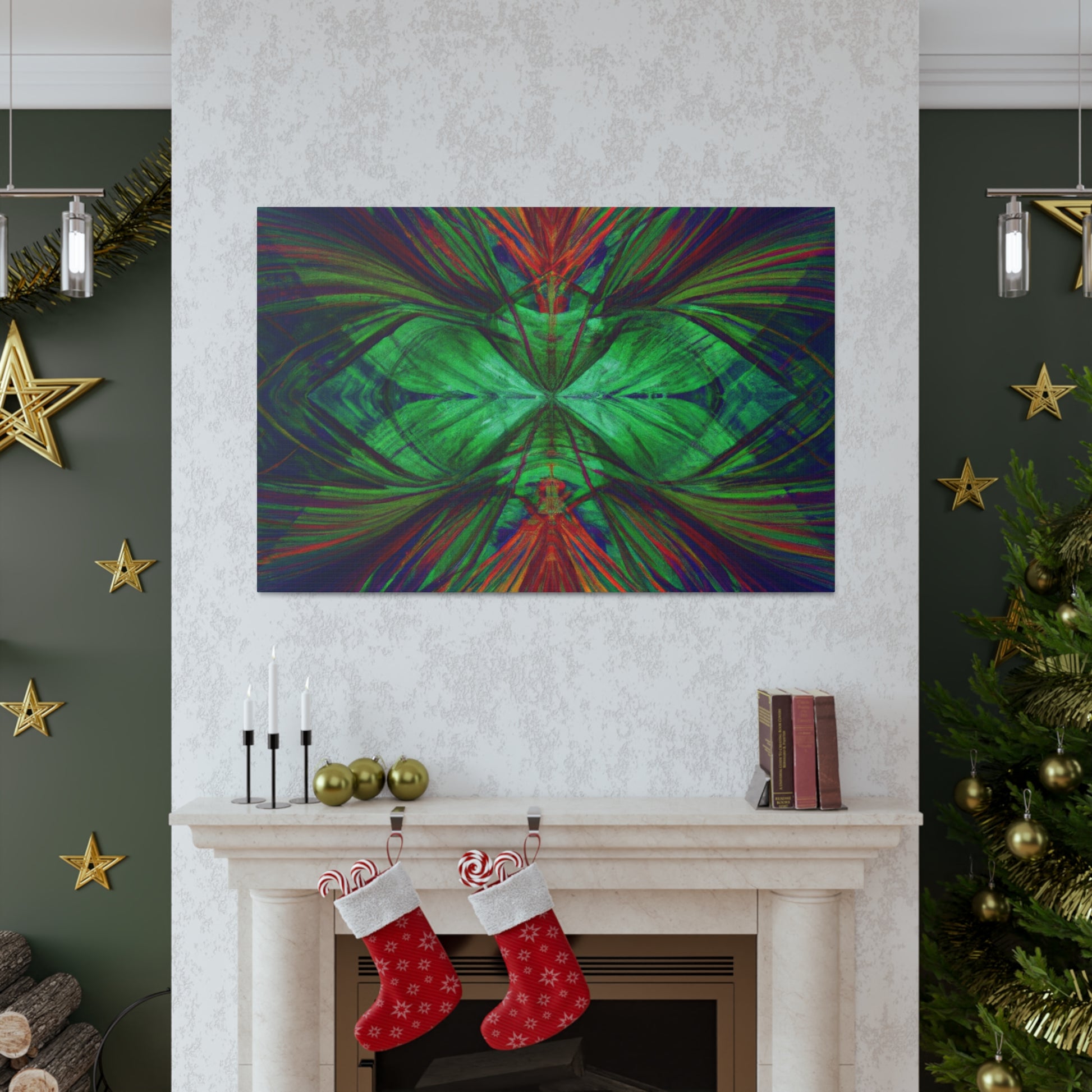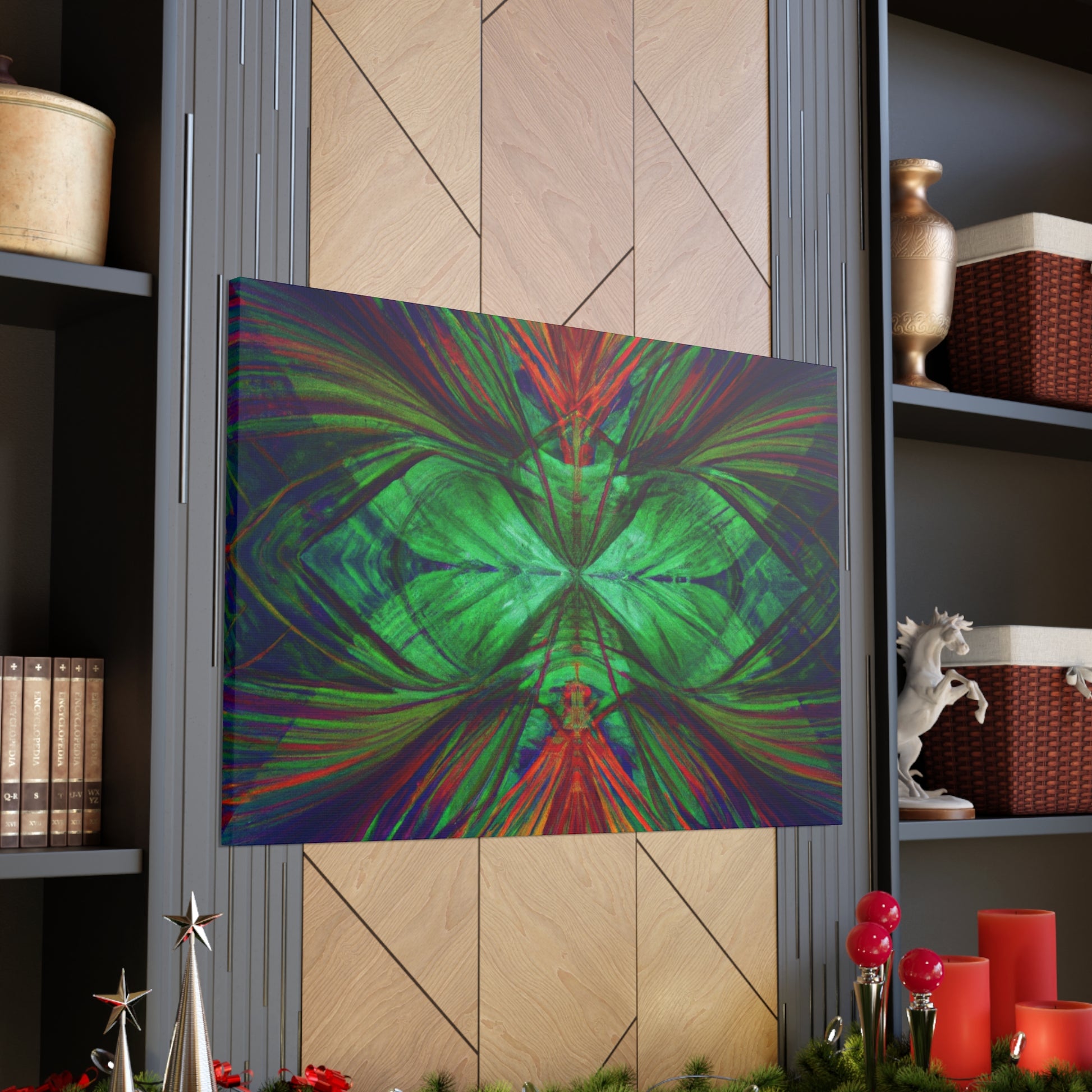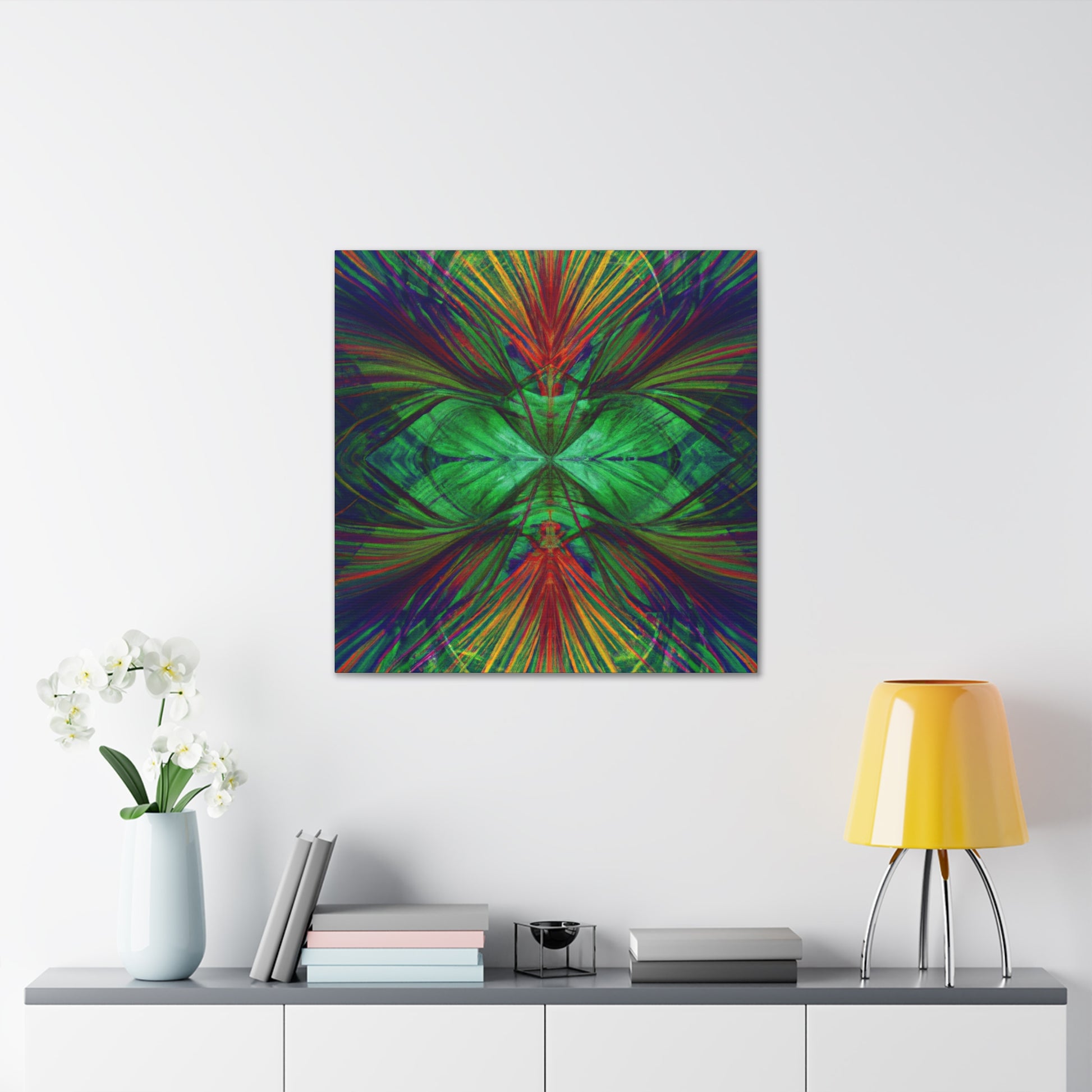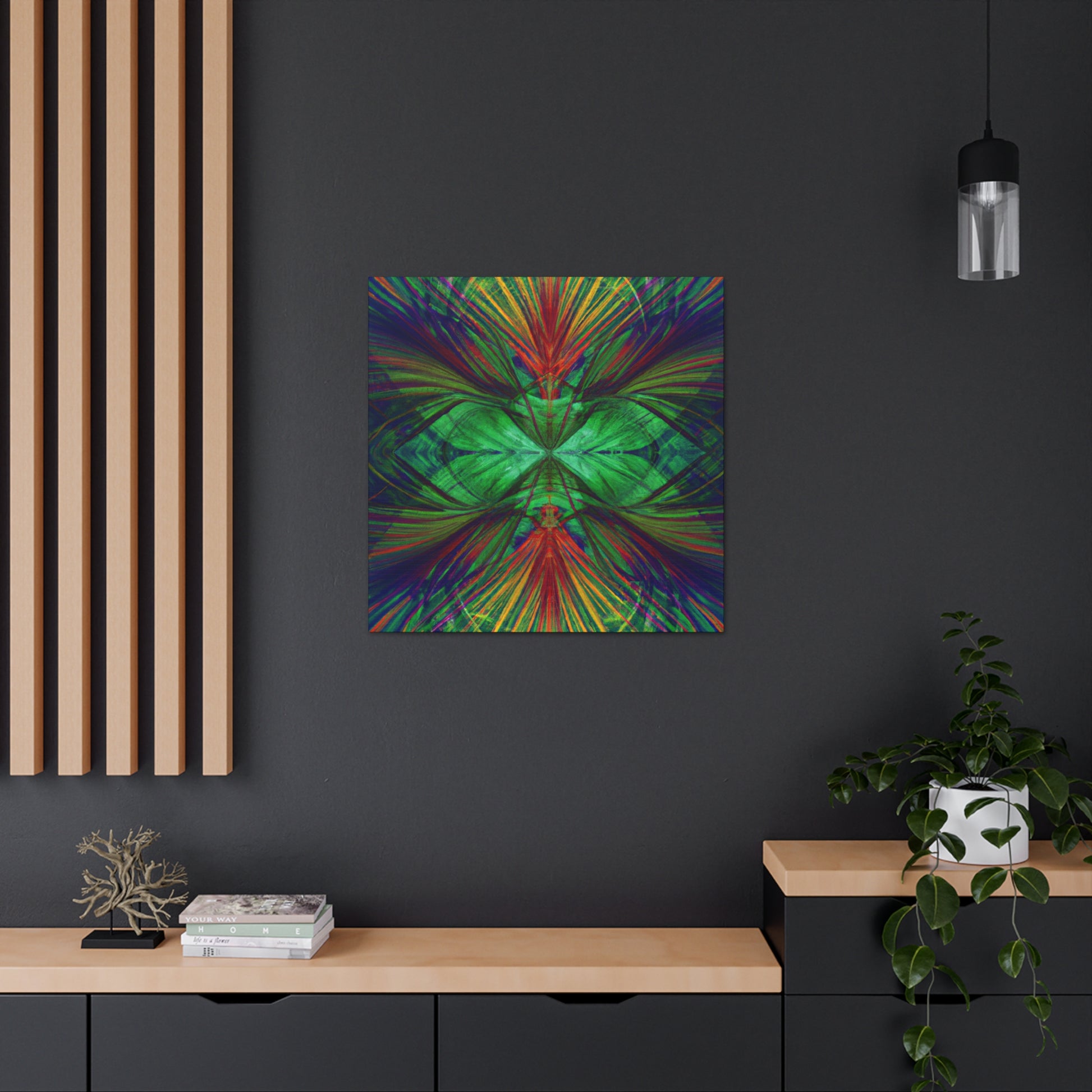 This vibrant canvas art is an amazing and beautiful mix of colors, patterns, and imagery! Trippy geometric palm leaves, kaleidoscope, abstract, digital art, and 3D lines are featured, alongside vibrant colors and a fractal design. This canvas is sure to stand out and add a unique look to any room! #canvasart #homeart #abstractart #geometricart #digitalart #palmleaves #kaleidoscope #vibrantcolors #3dlines #fractalart #vibrantart