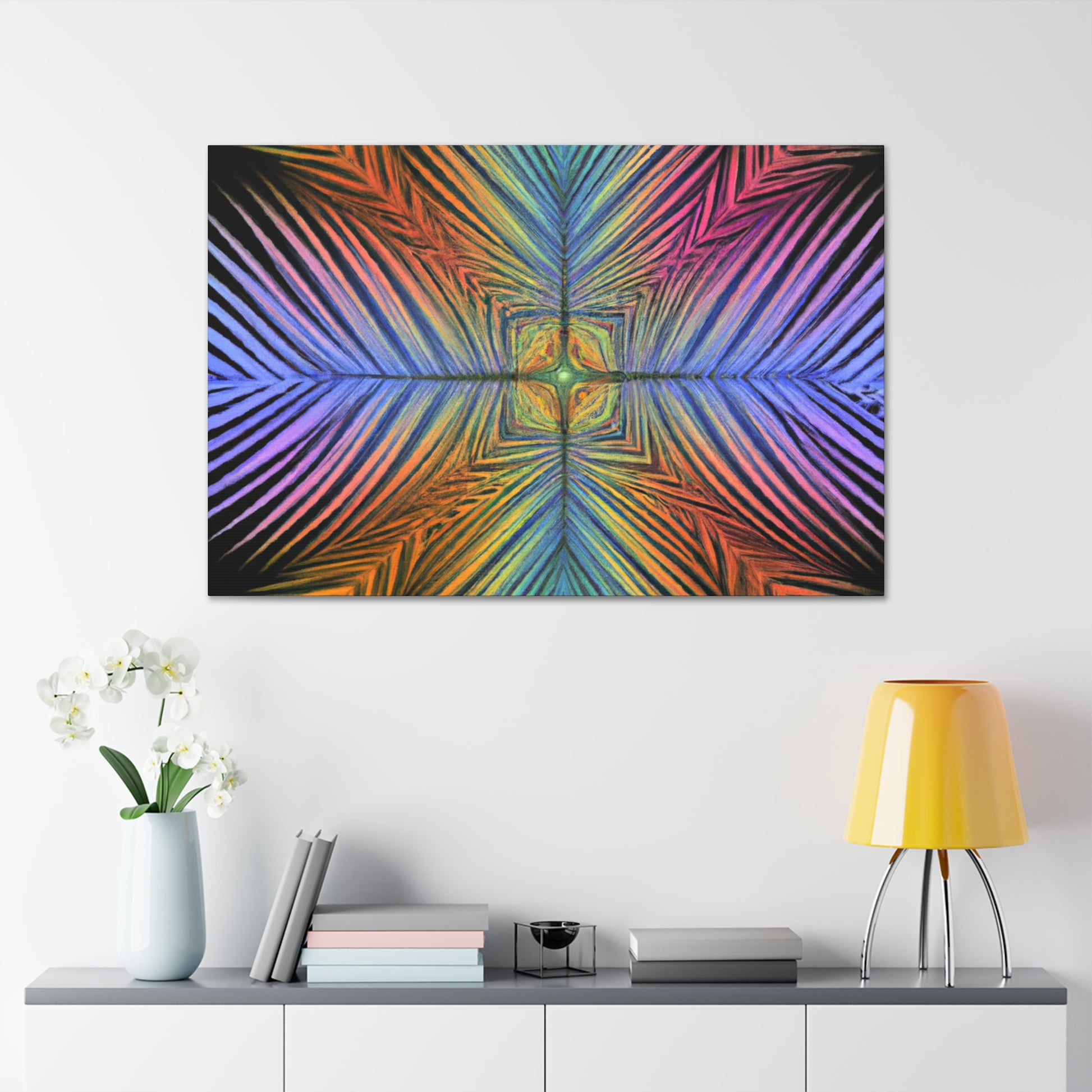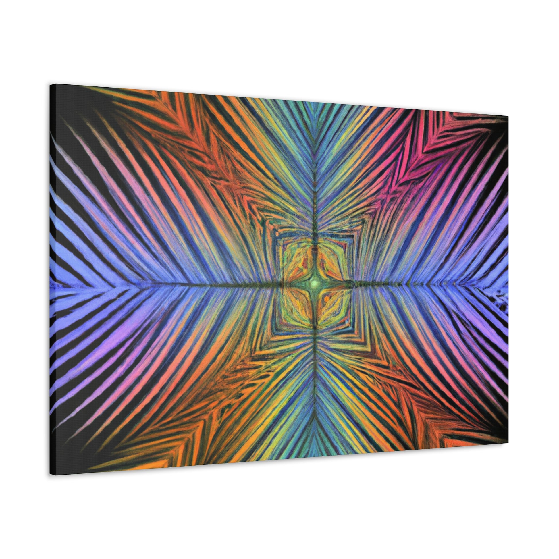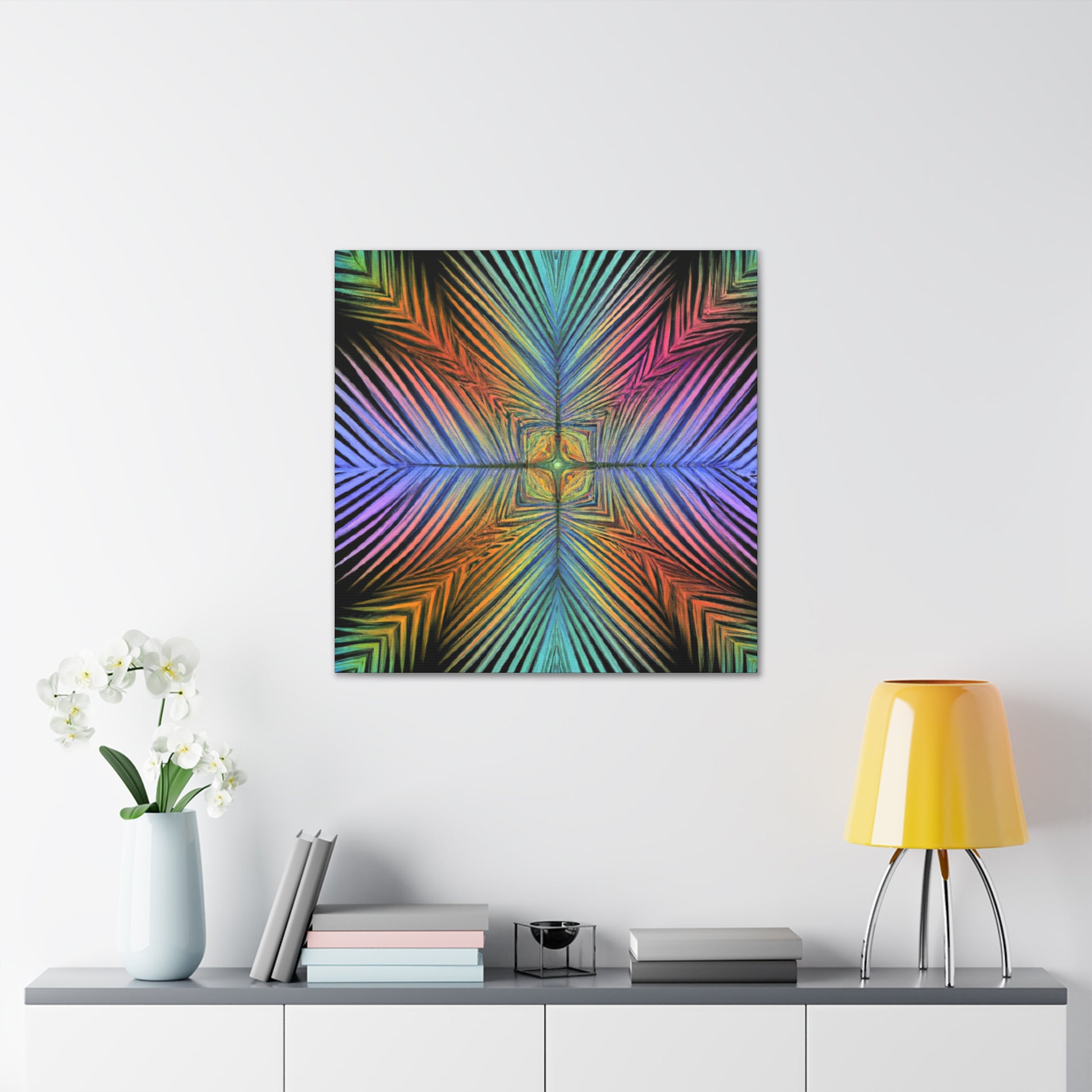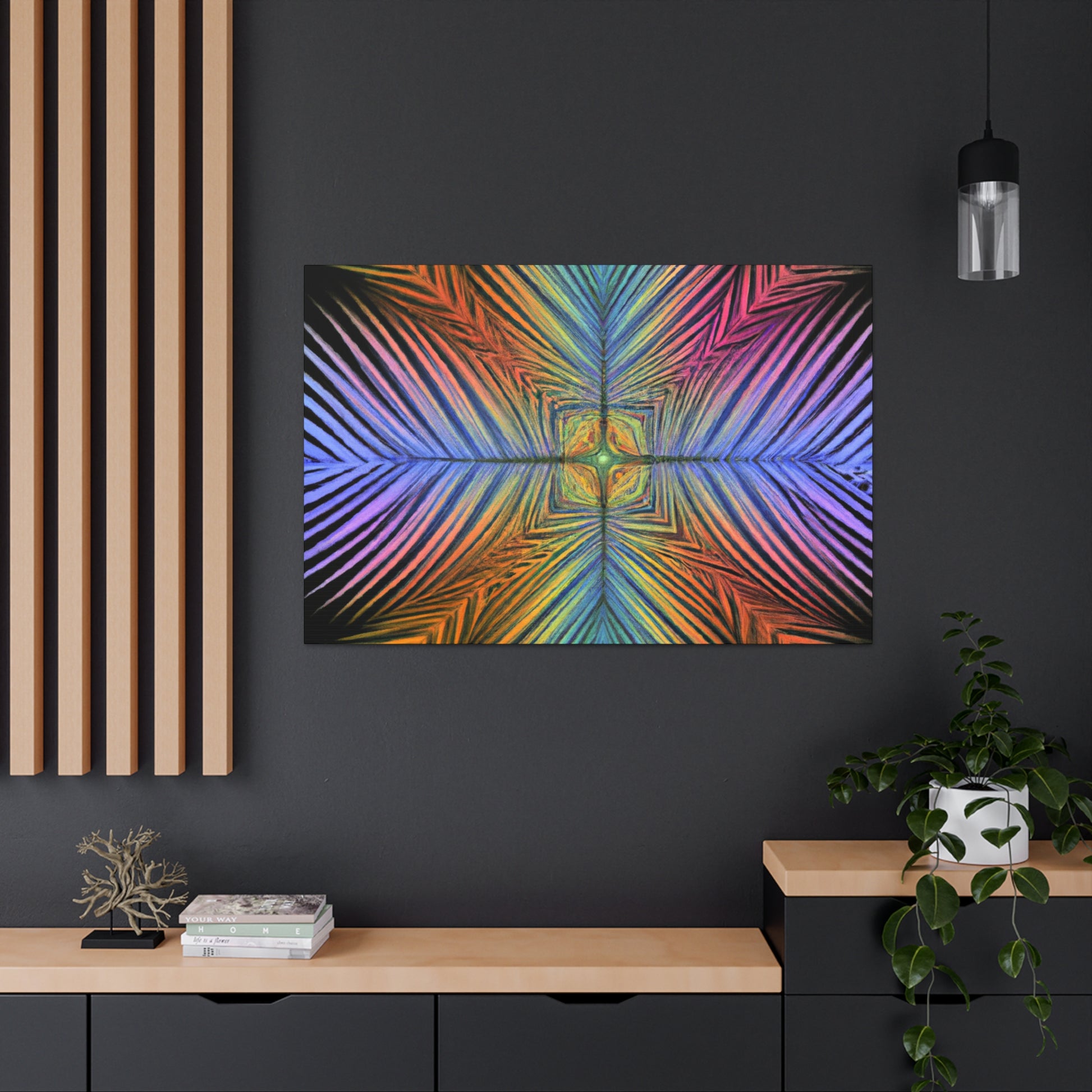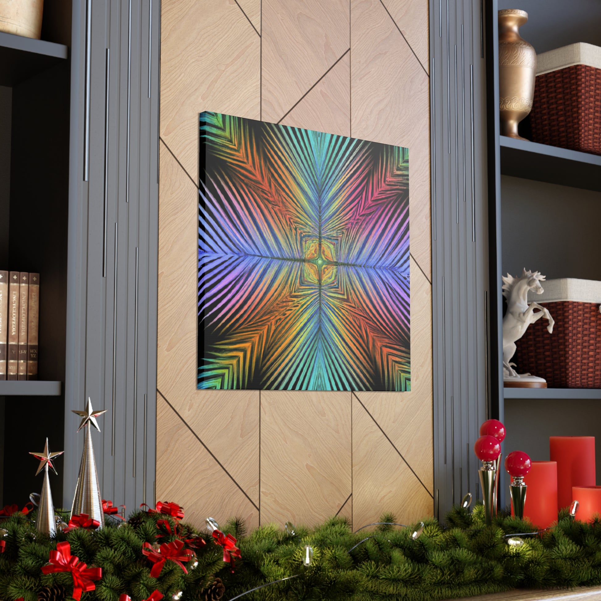 This canvas is a vivid expression of creativity, combining kaleidoscope, abstract expression, digital art, and vibrant colors. Take your decor to a new interactive level with this mesmerizing artwork featuring 3D lines and fractal patterns that create a trippy, geometric palm leaf pattern. Increase the artistic quality of any interior space with this exquisite canvas. #3dlines #fractal #canvasart #abstract #digitalart #trippyart #vibrantcolors #kaleidoscope #geometricpalmleaves #3dfractal #interactiveart