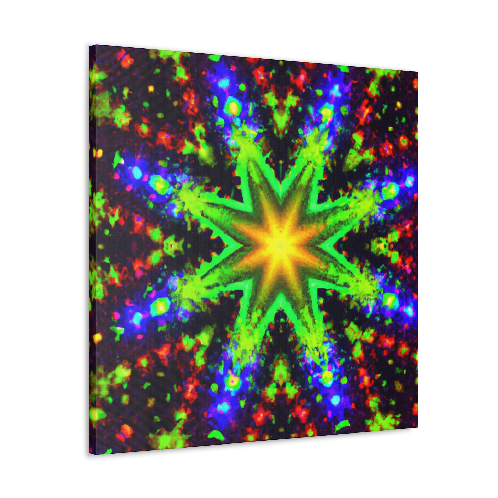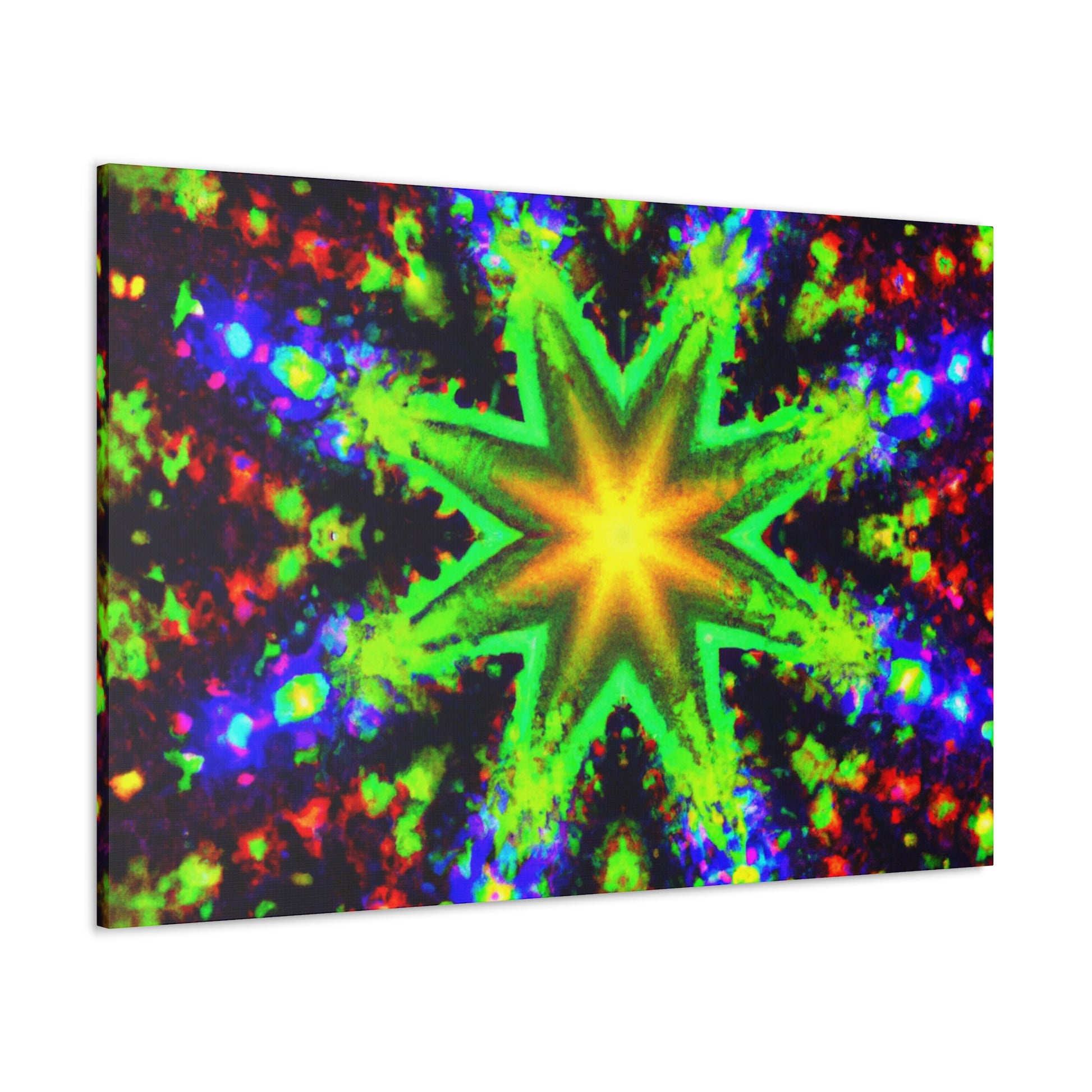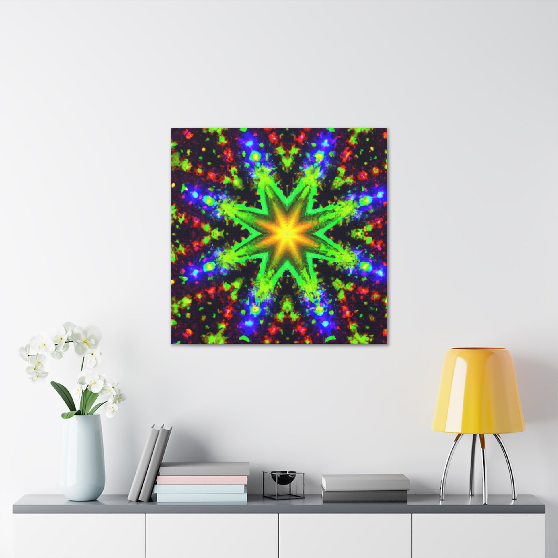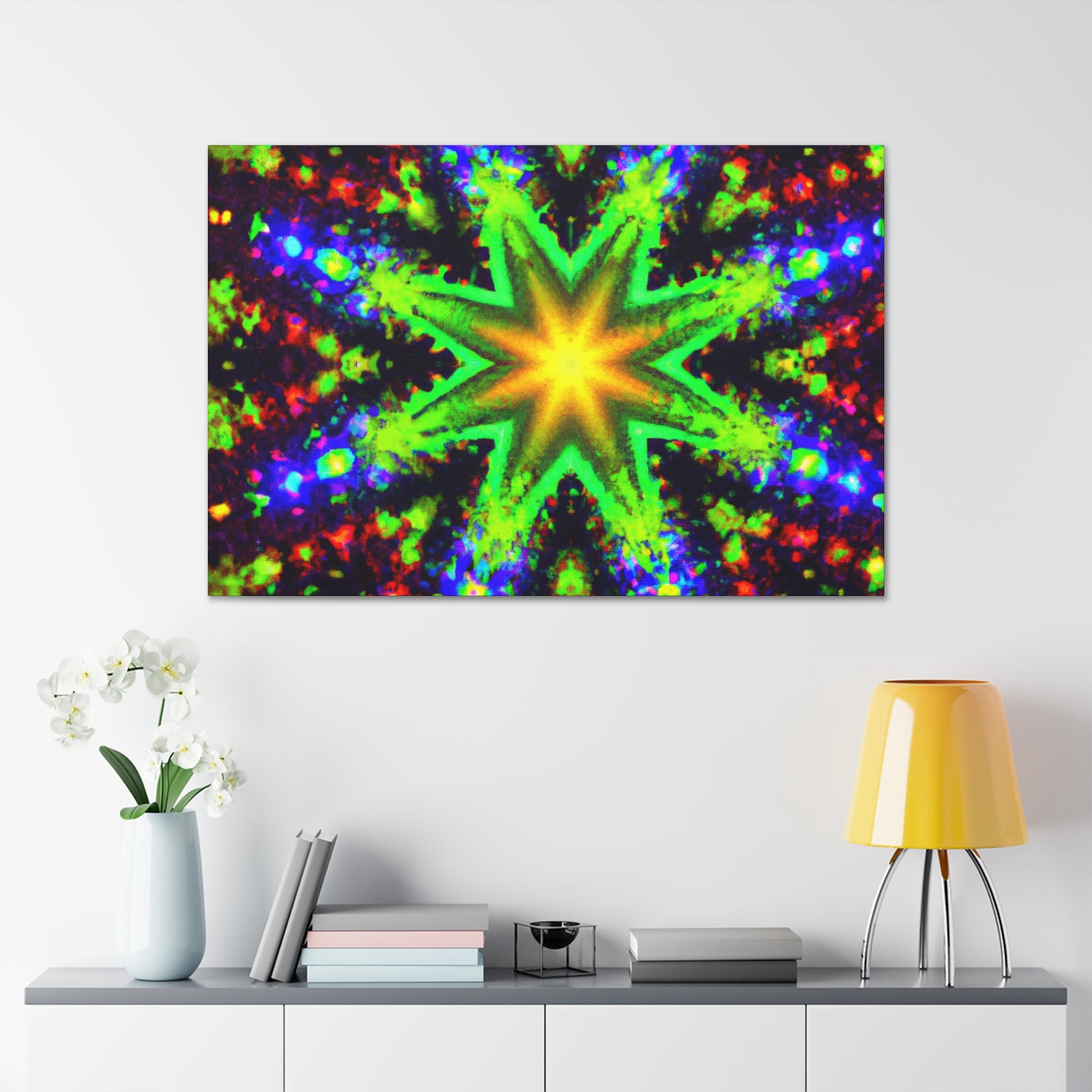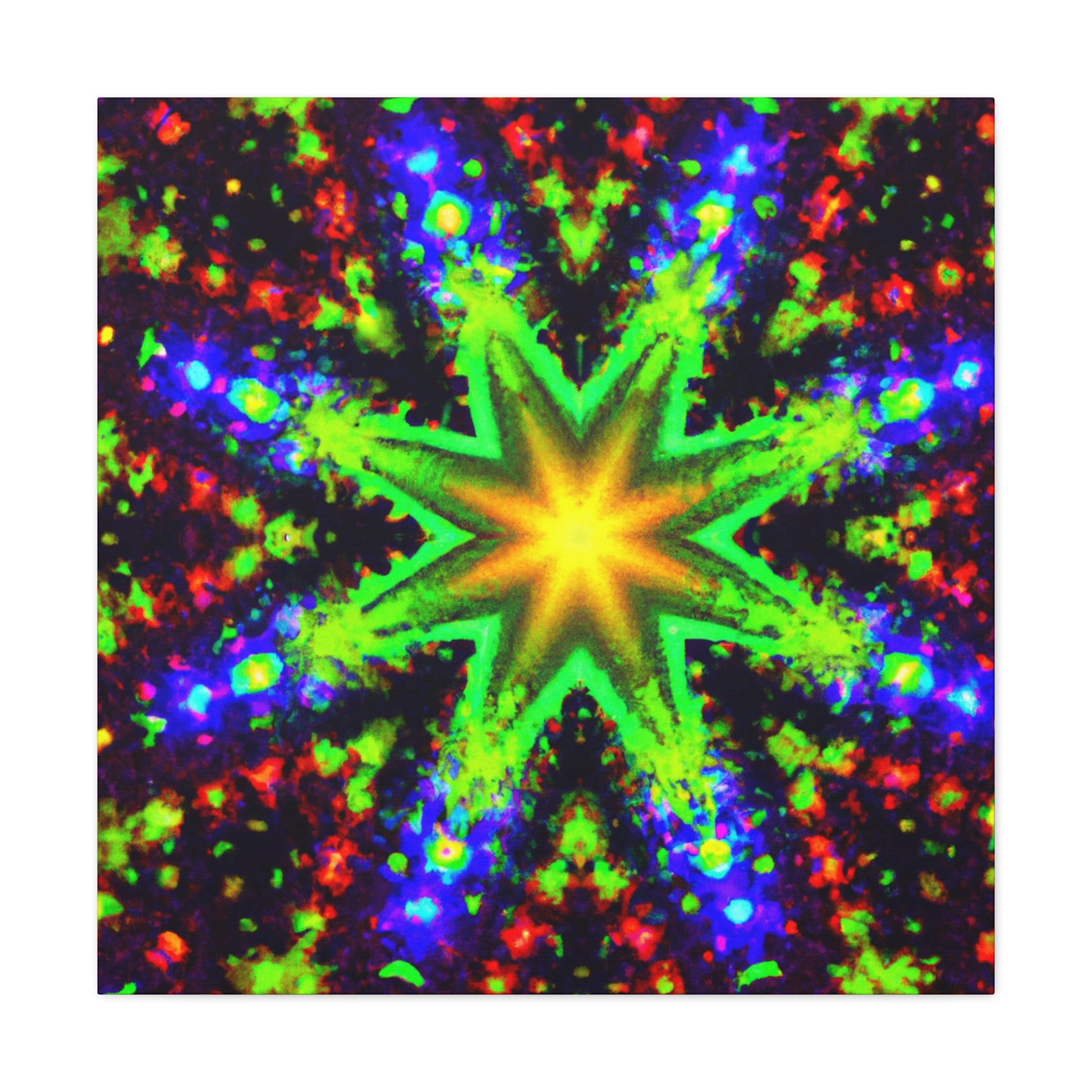 This canvas features trippy stars, abstract and kaleidoscope shapes, and digital art with vivid colors that appear in HD to make a beautiful, symmetrical artwork. Hang this beautiful canvas anywhere and it will light up the whole room. #abstractart #kaleidoscope #trispystars #digitalart #vibrantcolors #HD #symmertrical #canvas #wallart #creative #beautiful
