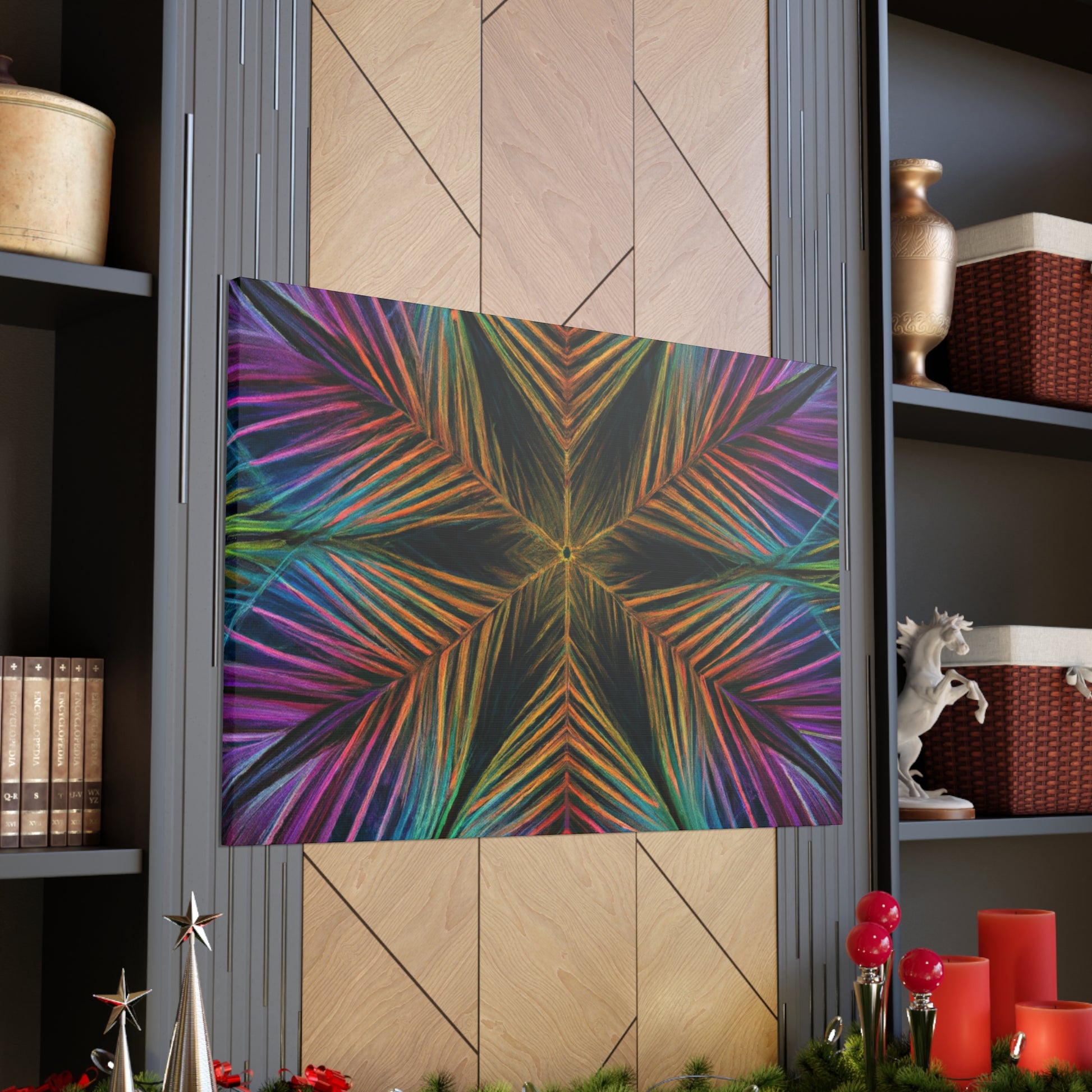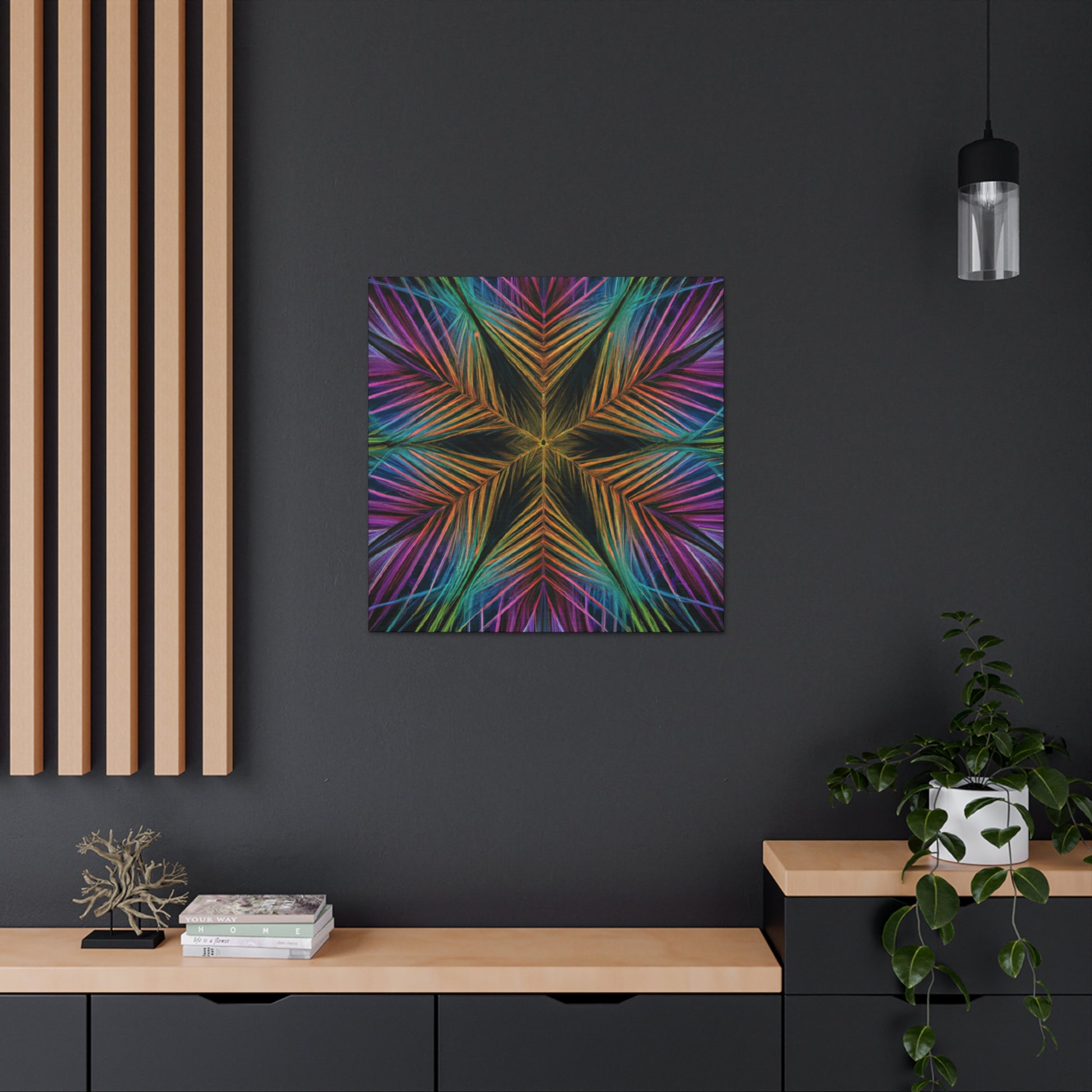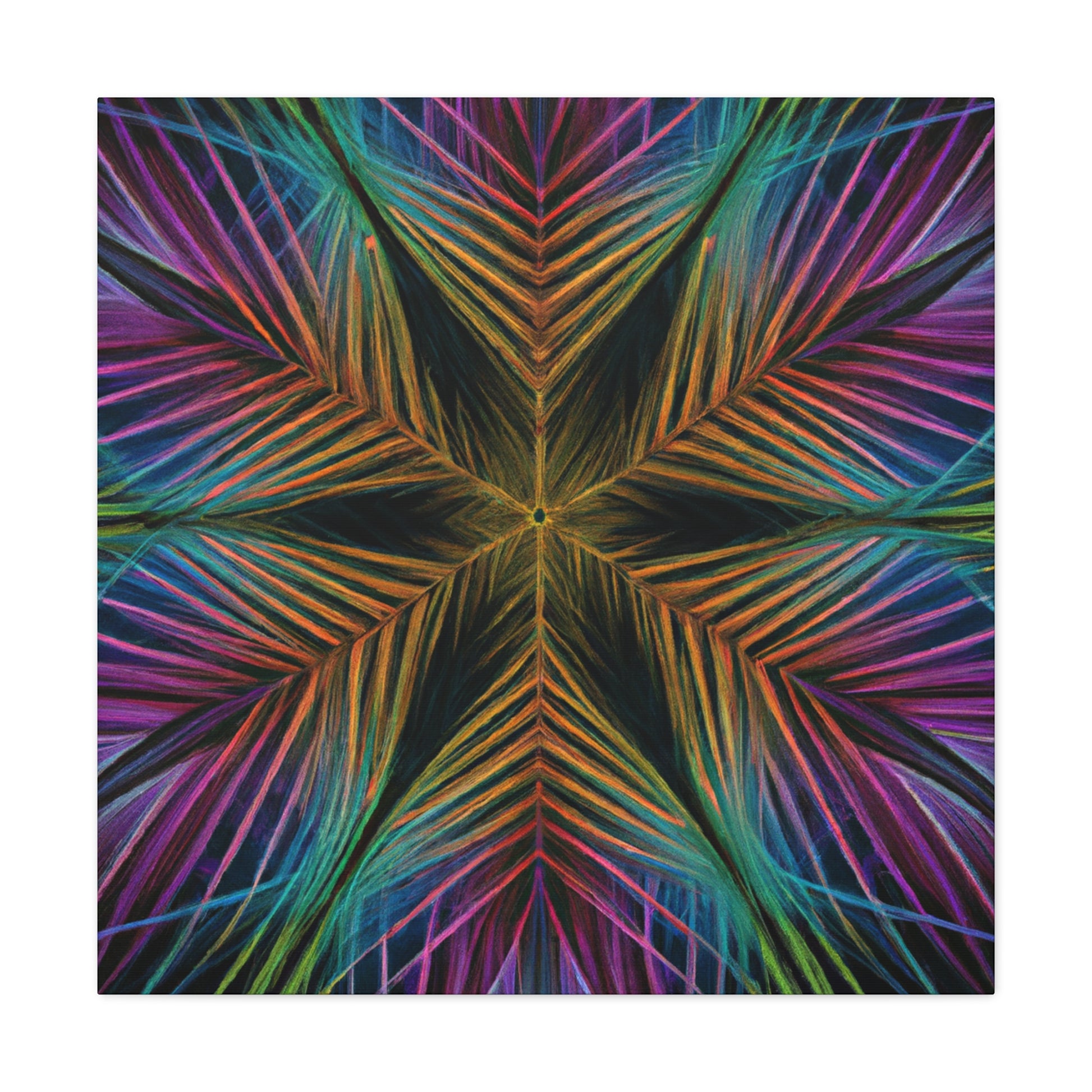 This stunning canvas features vivid colors, abstract lines, trippy geometric palm leaves, and 3D fractals all blended together in a kaleidoscopic display that is sure to add a unique touch to any modern home. Its unique use of vibrant colors and shapes makes this art truly stand out! Add an eye-catching element to your living space with this masterpiece. #abstractart #fractalart #geometricart #kaleidoscope #colorfulart #vibrantcolors #3Dlines #trippyart #digitalart #palmleaves #modernart