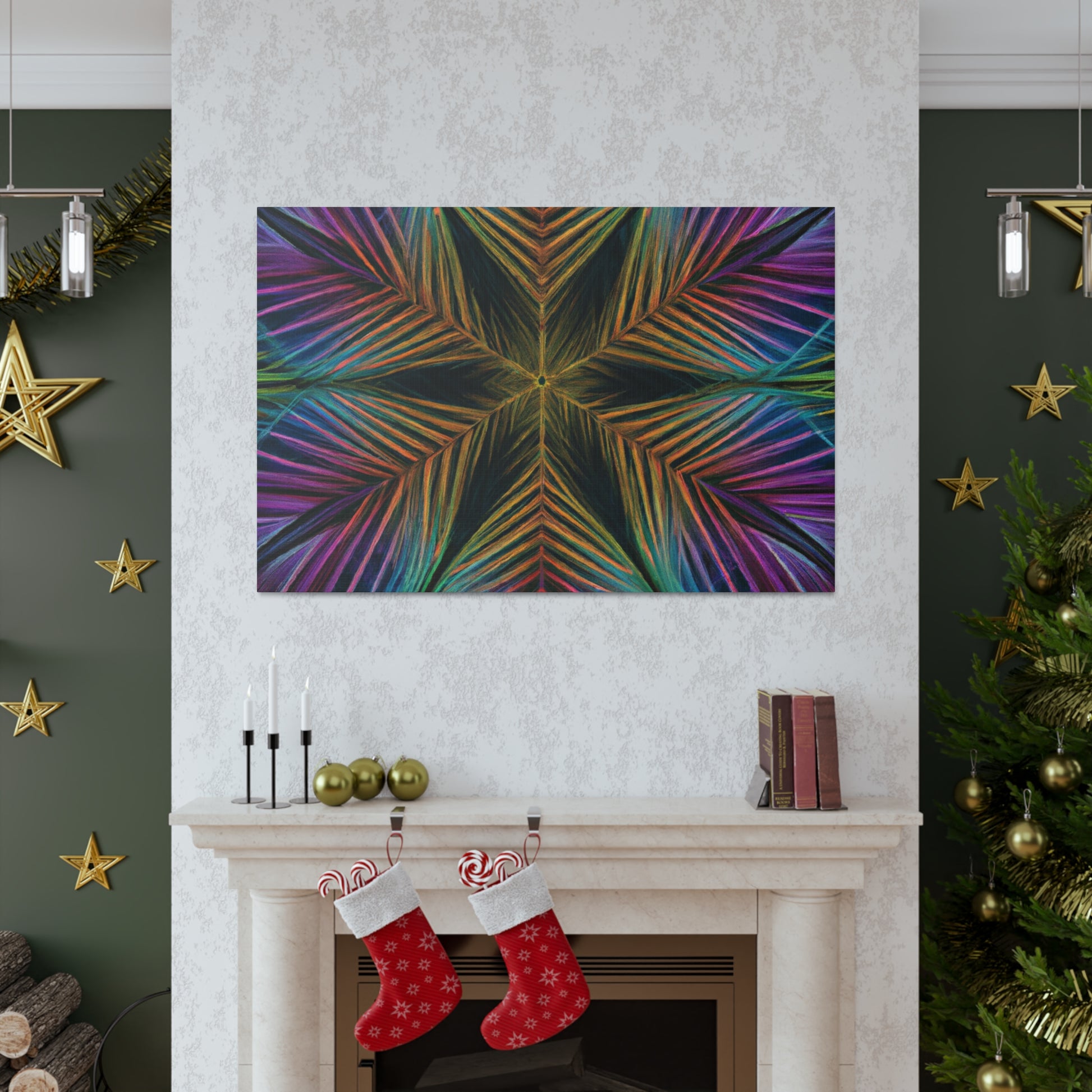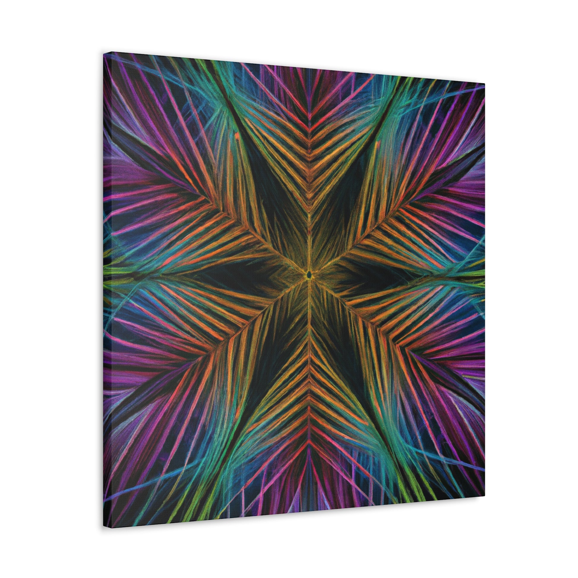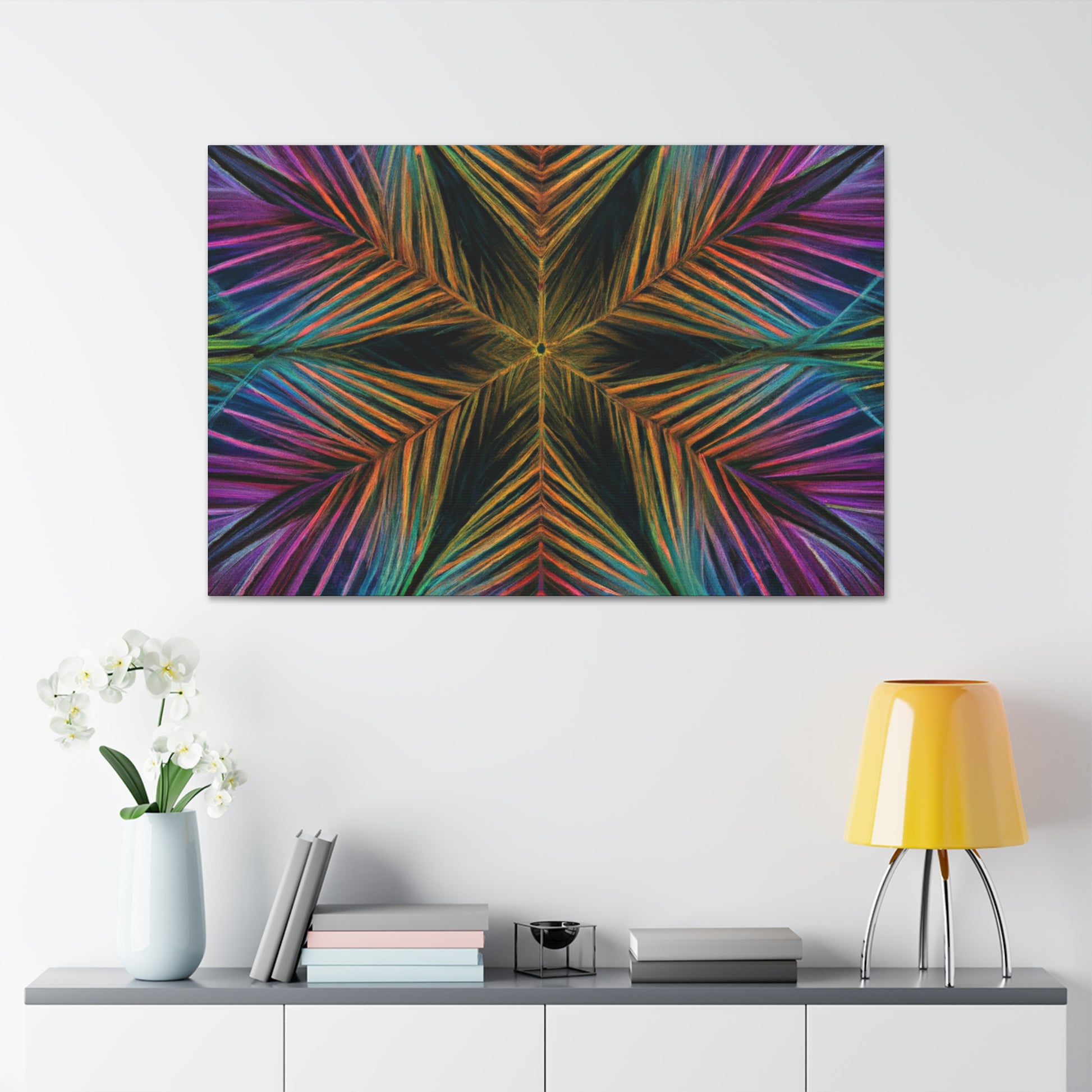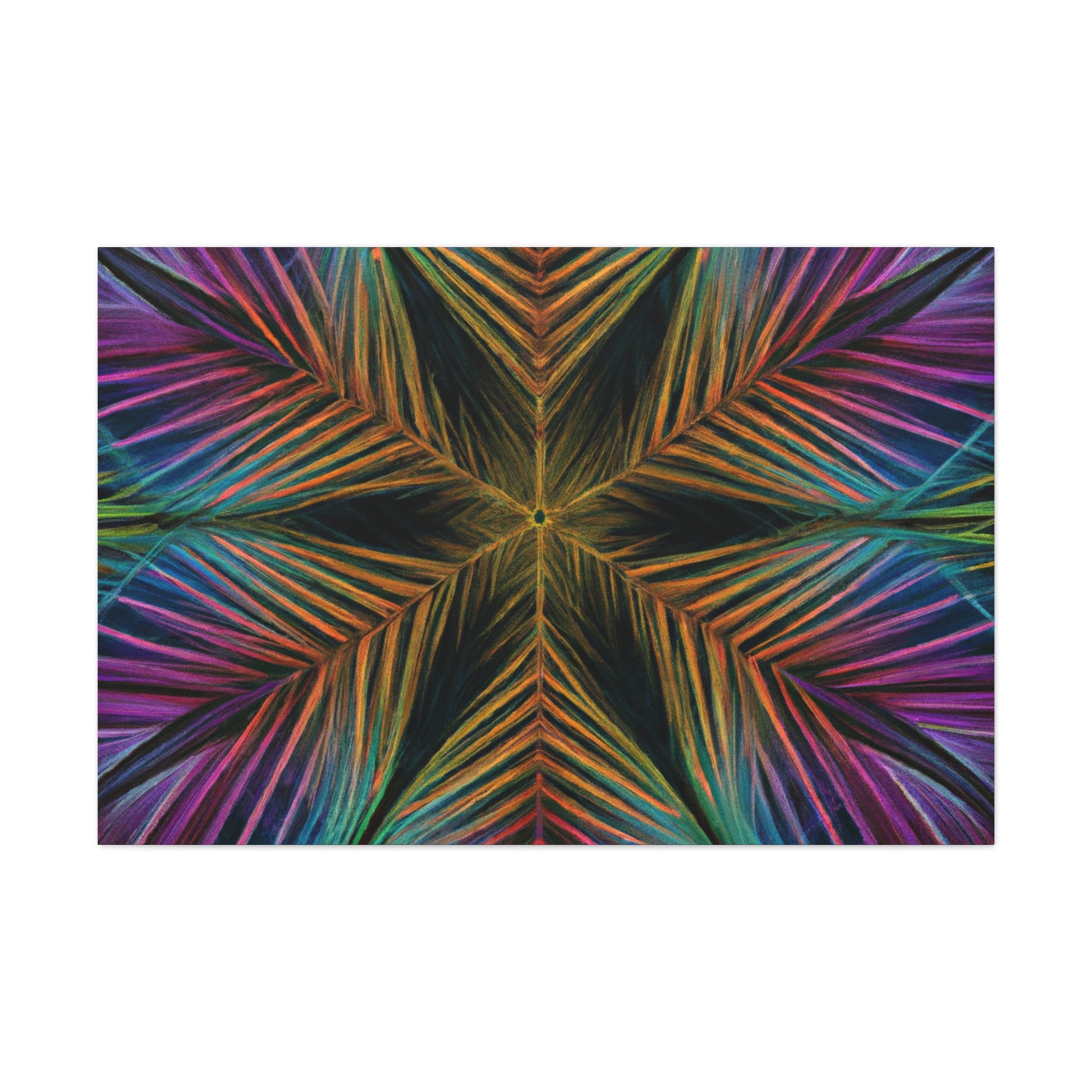 This stunning canvas features vivid colors, abstract lines, trippy geometric palm leaves, and 3D fractals all blended together in a kaleidoscopic display that is sure to add a unique touch to any modern home. Its unique use of vibrant colors and shapes makes this art truly stand out! Add an eye-catching element to your living space with this masterpiece. #abstractart #fractalart #geometricart #kaleidoscope #colorfulart #vibrantcolors #3Dlines #trippyart #digitalart #palmleaves #modernart