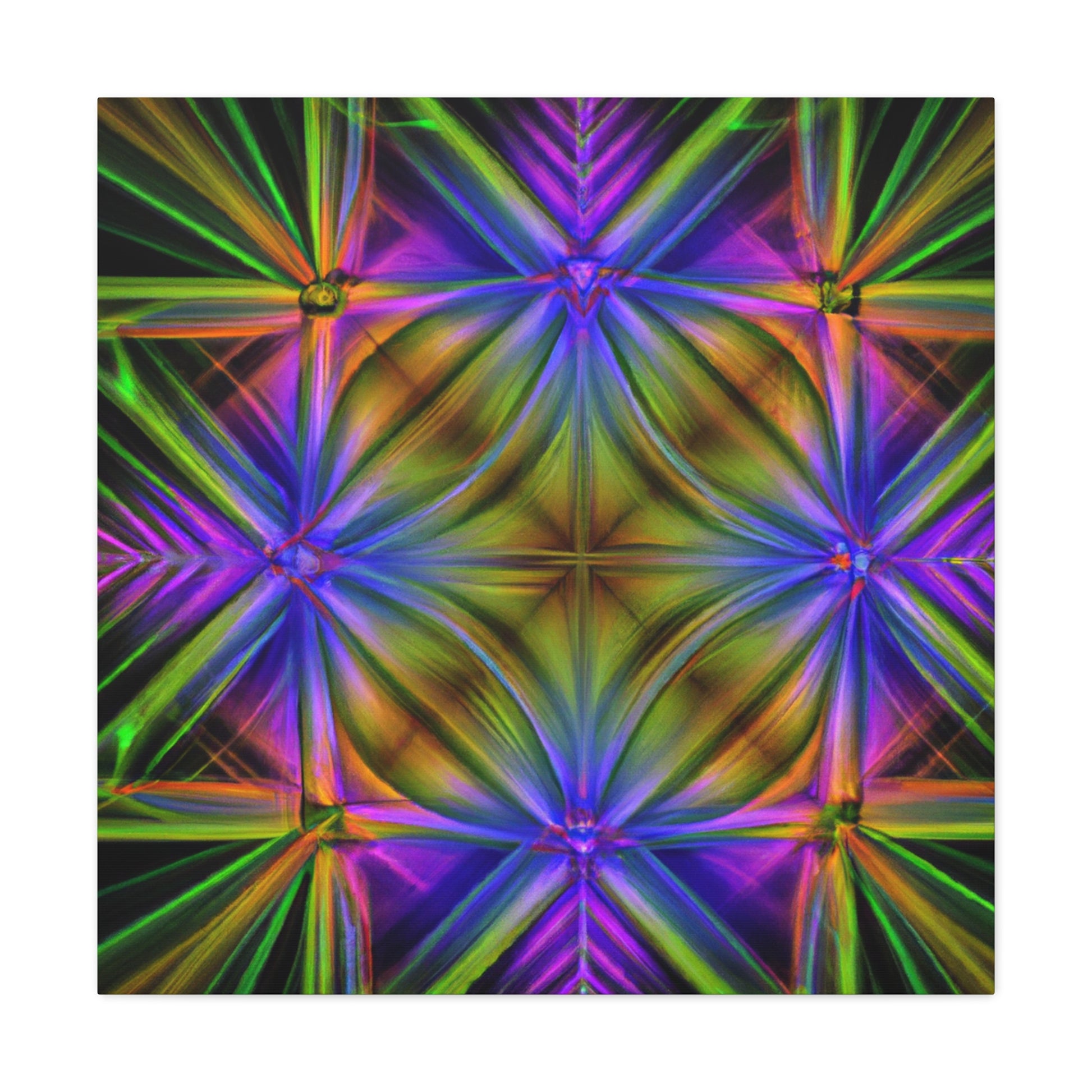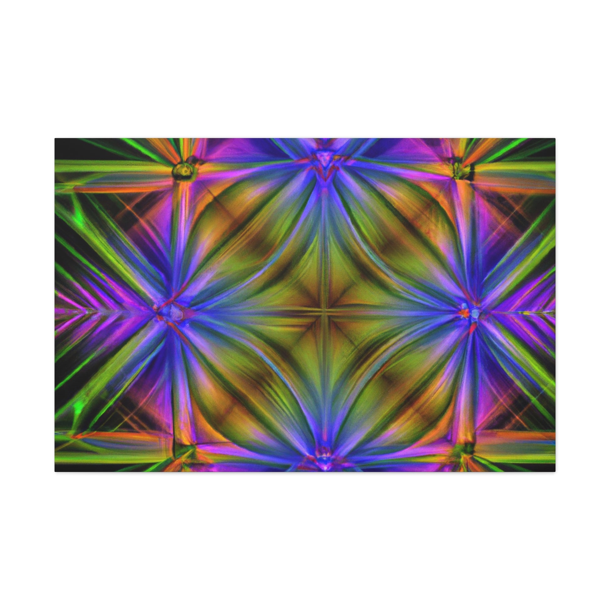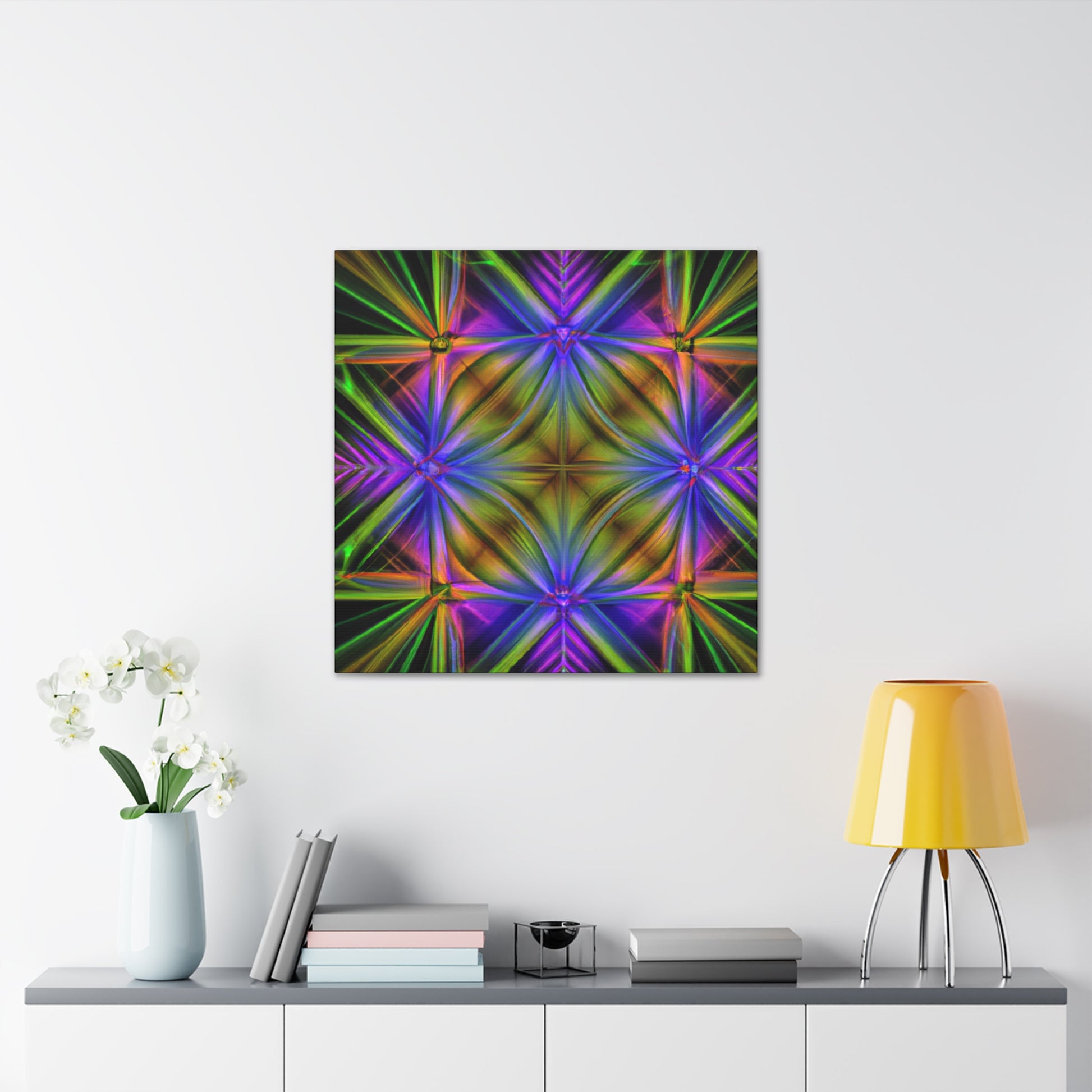 Frank and bold, vibrant colors with a captivating pattern of intertwining abstract shapes, make this canvas the perfect room piece. Trippy geometric palm leaves, corroded kaleidoscope 3D lines, and sweeping fractal shapes make this an eye-catching piece of art perfect for adding a touch of modern style to any room. #palmleaves #kaleidoscope #abstractart #bohodecor #vividcolors #3Dlines #fractal #canvasart #trippydecor #peacockore #bohemianvibes
