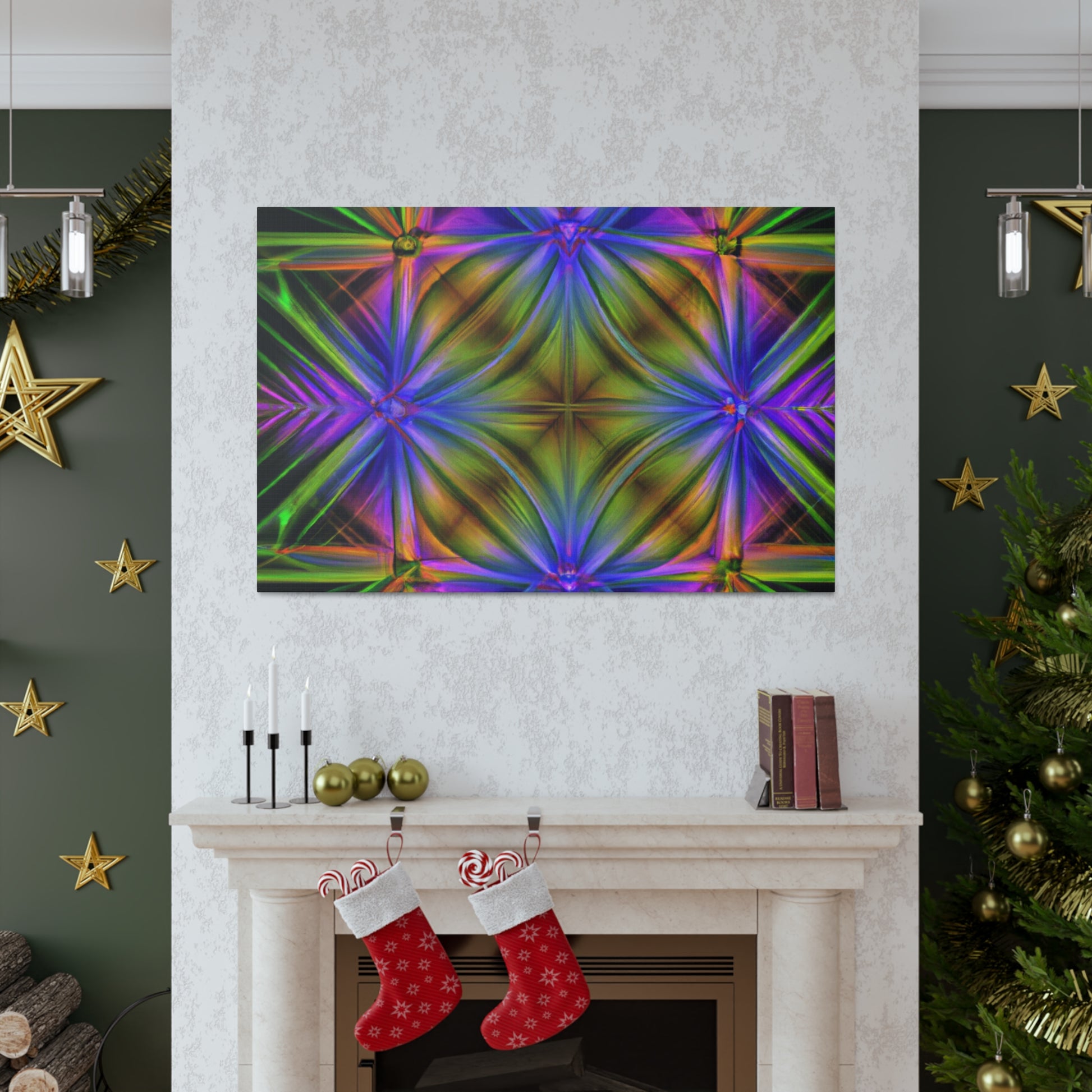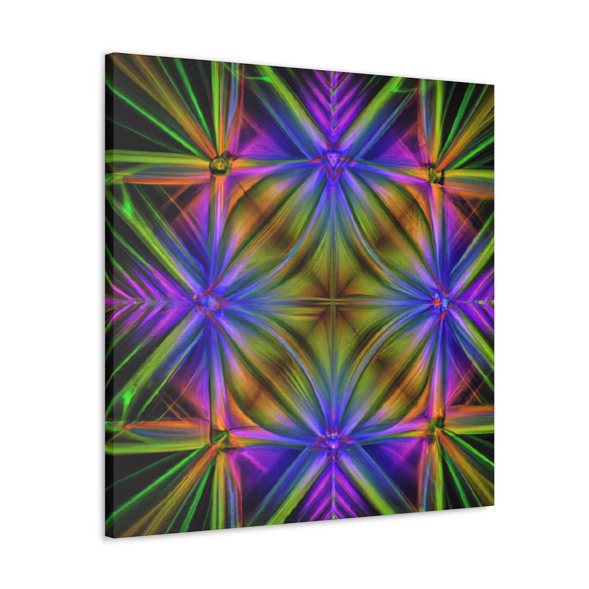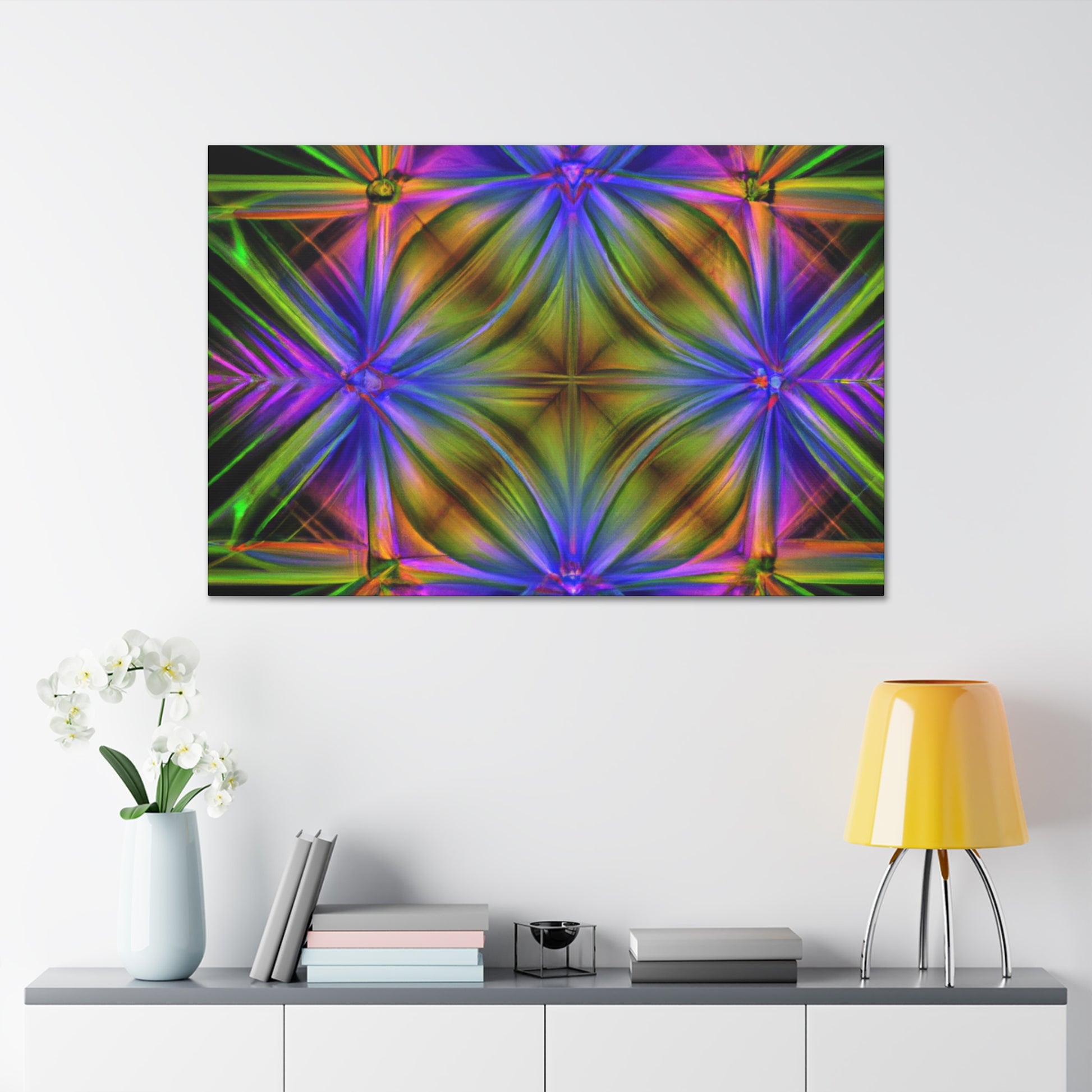 Frank and bold, vibrant colors with a captivating pattern of intertwining abstract shapes, make this canvas the perfect room piece. Trippy geometric palm leaves, corroded kaleidoscope 3D lines, and sweeping fractal shapes make this an eye-catching piece of art perfect for adding a touch of modern style to any room. #palmleaves #kaleidoscope #abstractart #bohodecor #vividcolors #3Dlines #fractal #canvasart #trippydecor #peacockore #bohemianvibes