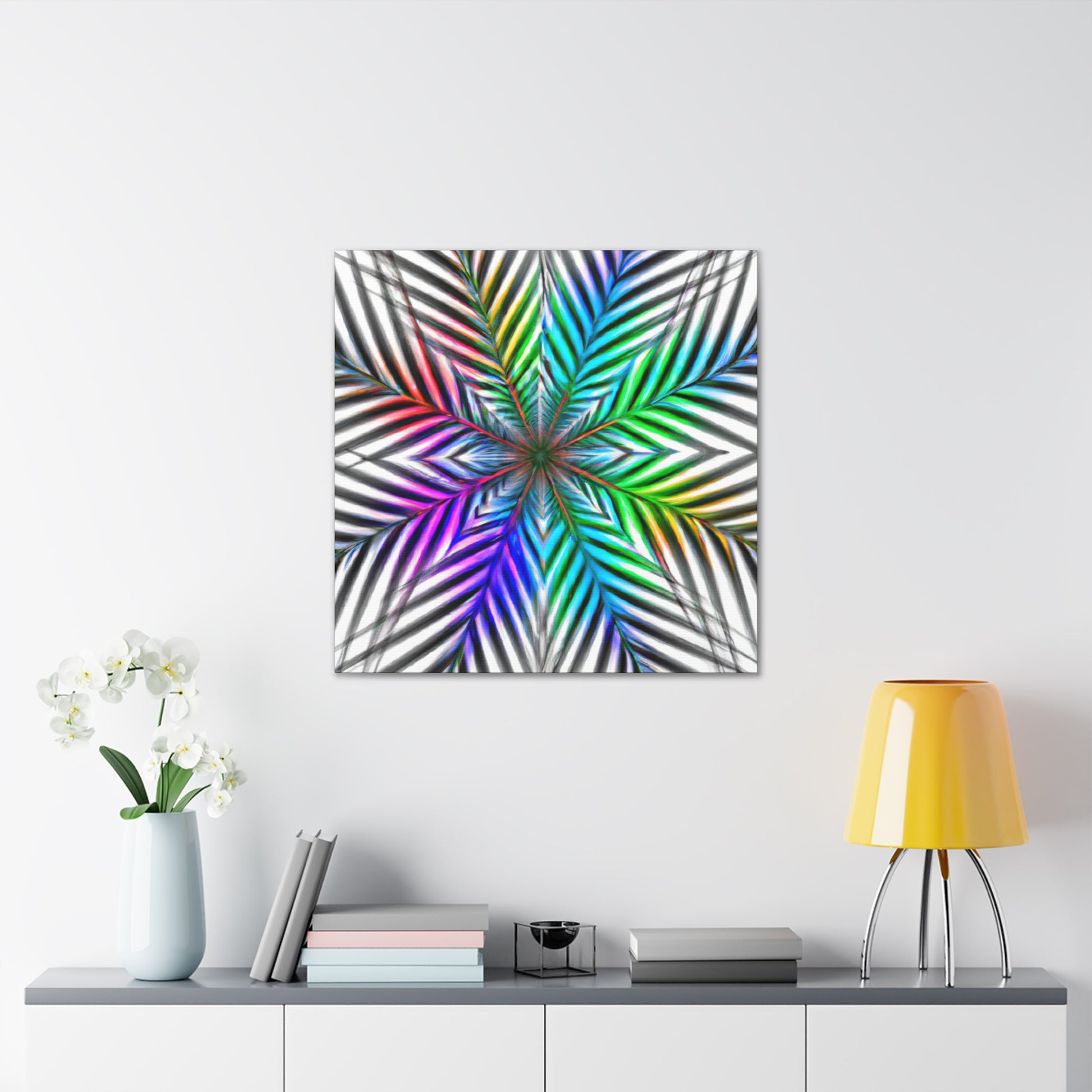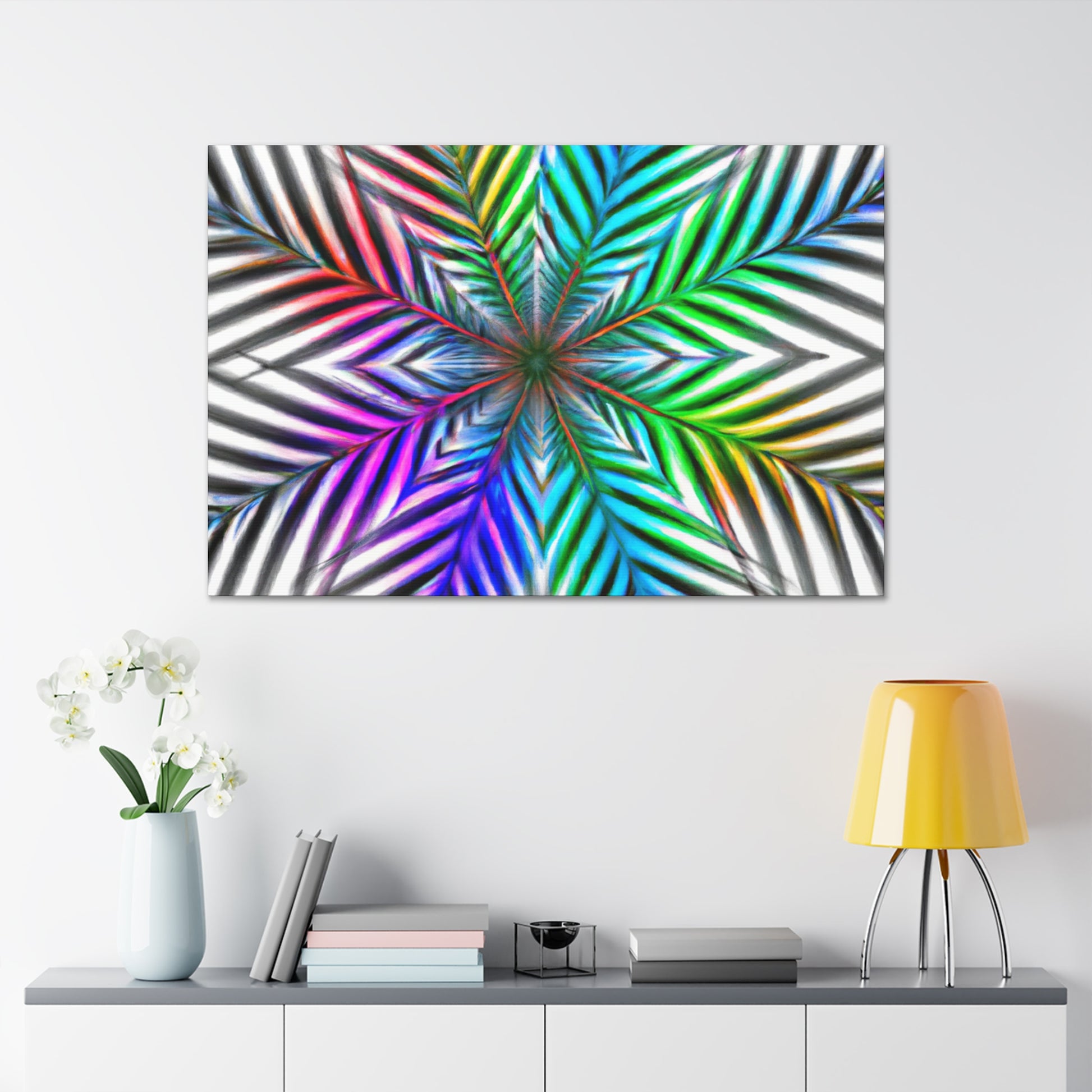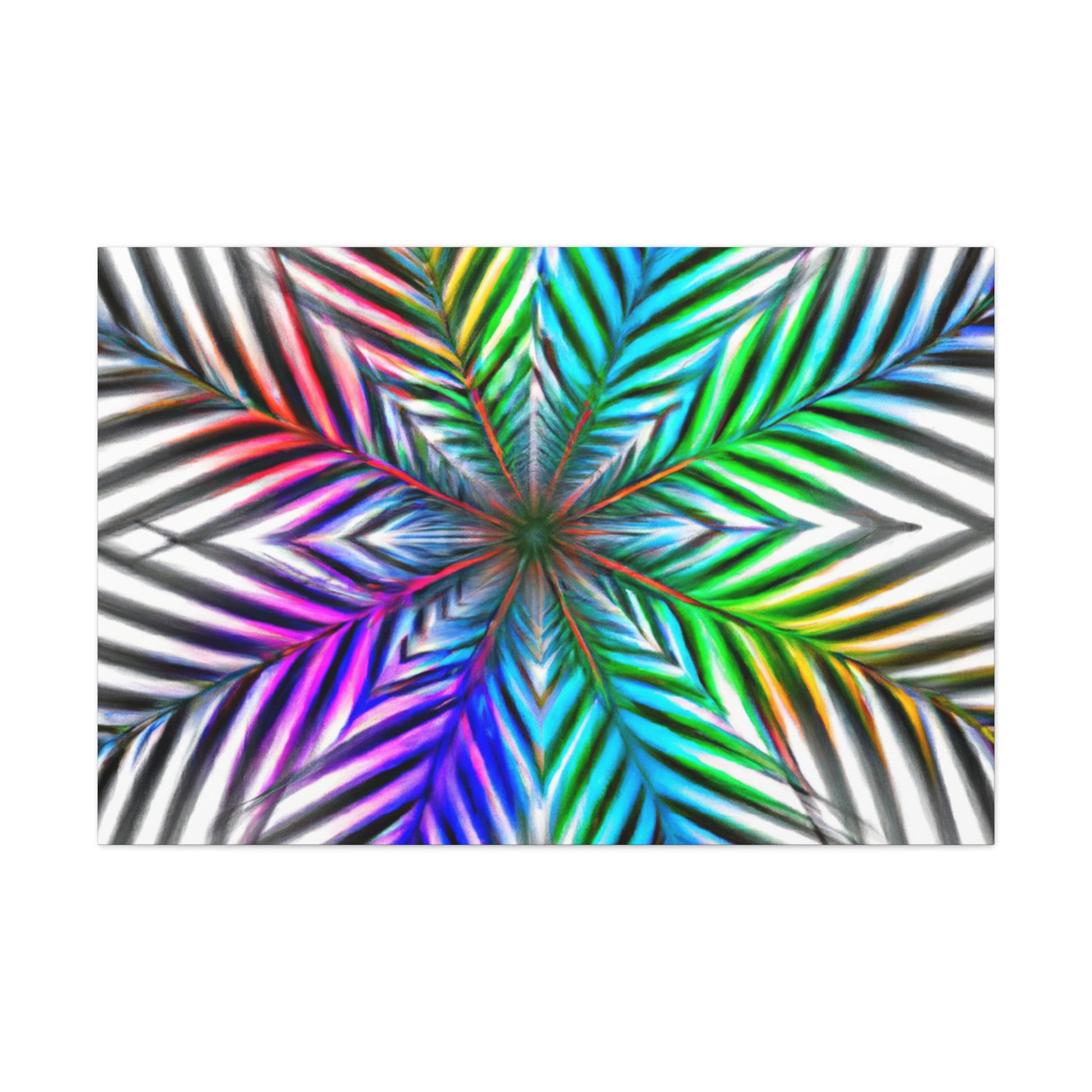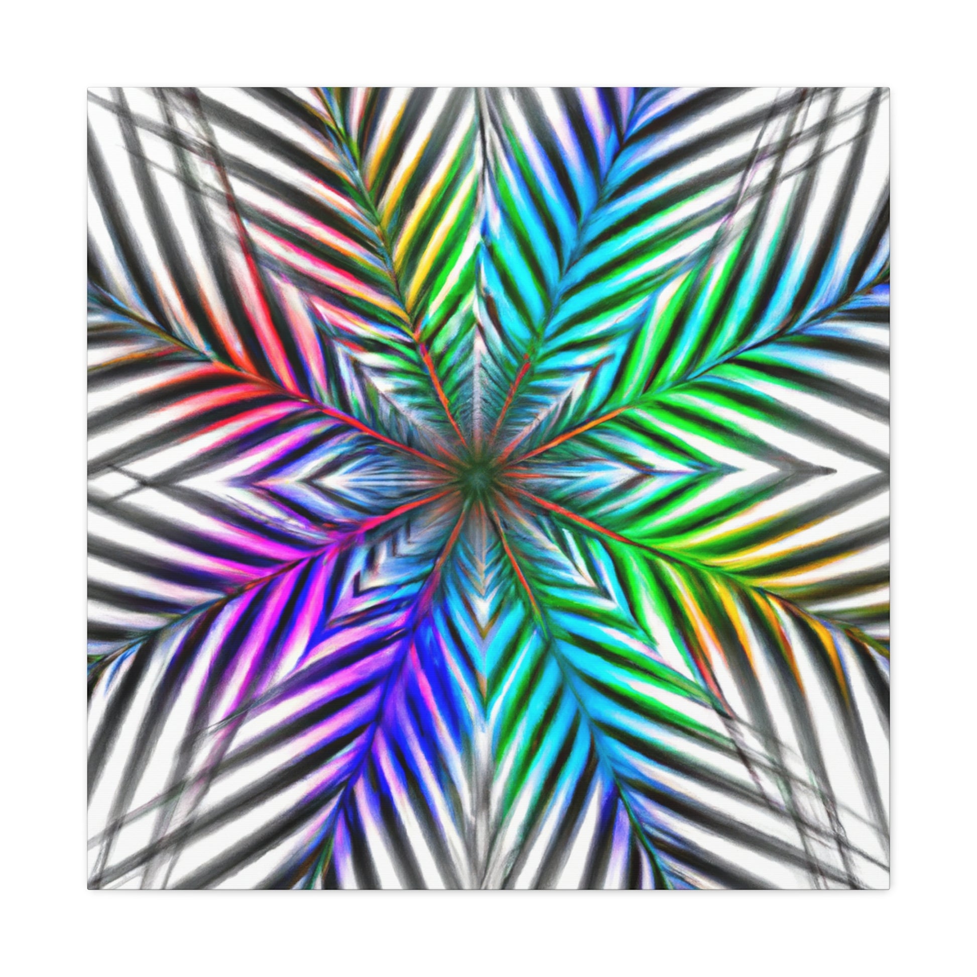 Celebrate the beauty of vibrant colors and abstract digital shapes with this mesmerizing canvas featuring 'Trippy Geometric Palm Leaves Kaleidoscope'. Featuring 3D lines, fractals and a spectacular kaleidoscope design, this wall art shows off an impressive palette of lively colors that will brighten up any space. #3Dlines #fractals #kaleidoscope #palmleaves #abstractart #digitalart #vibrantcolor #geometry #trippyart #wallart #brightcolors