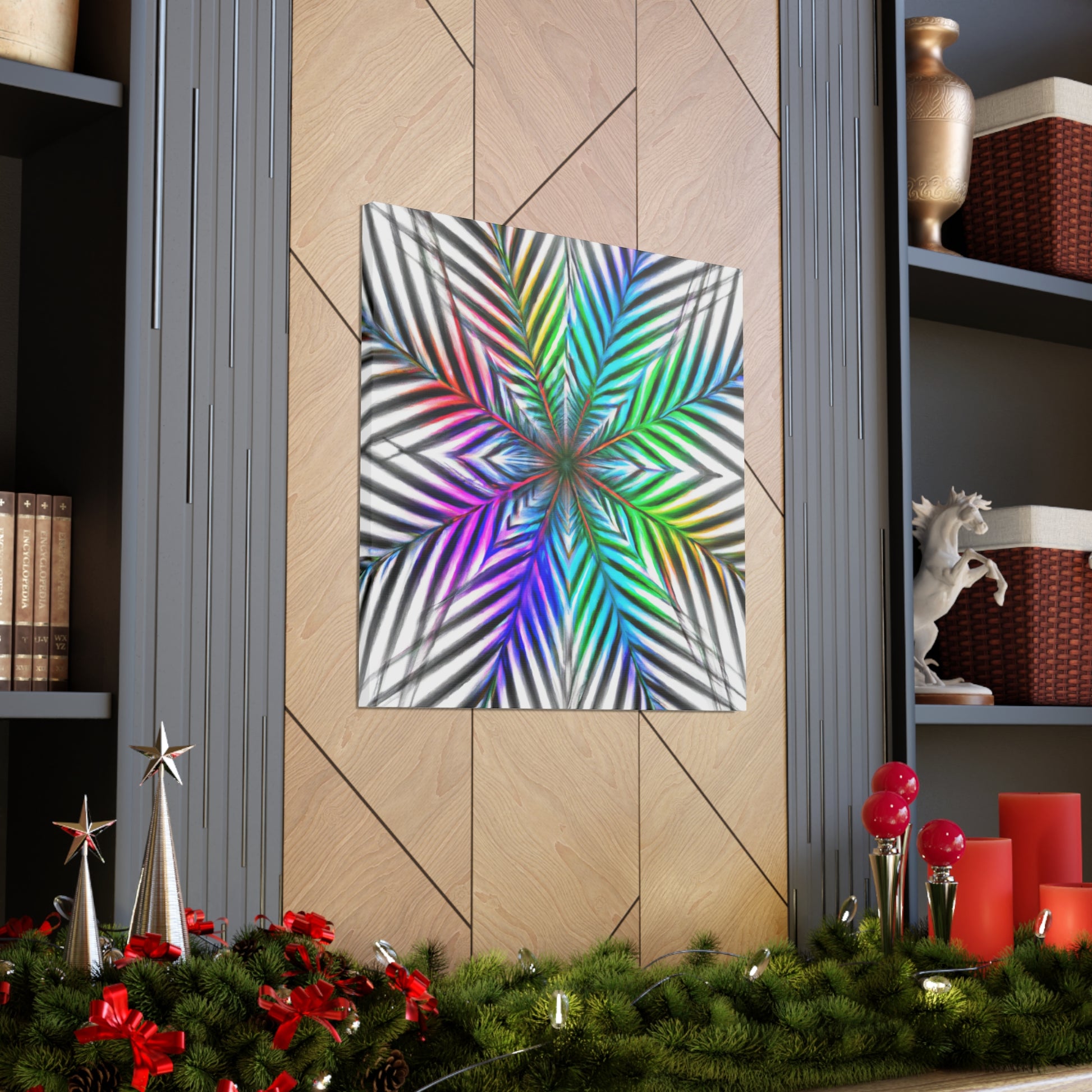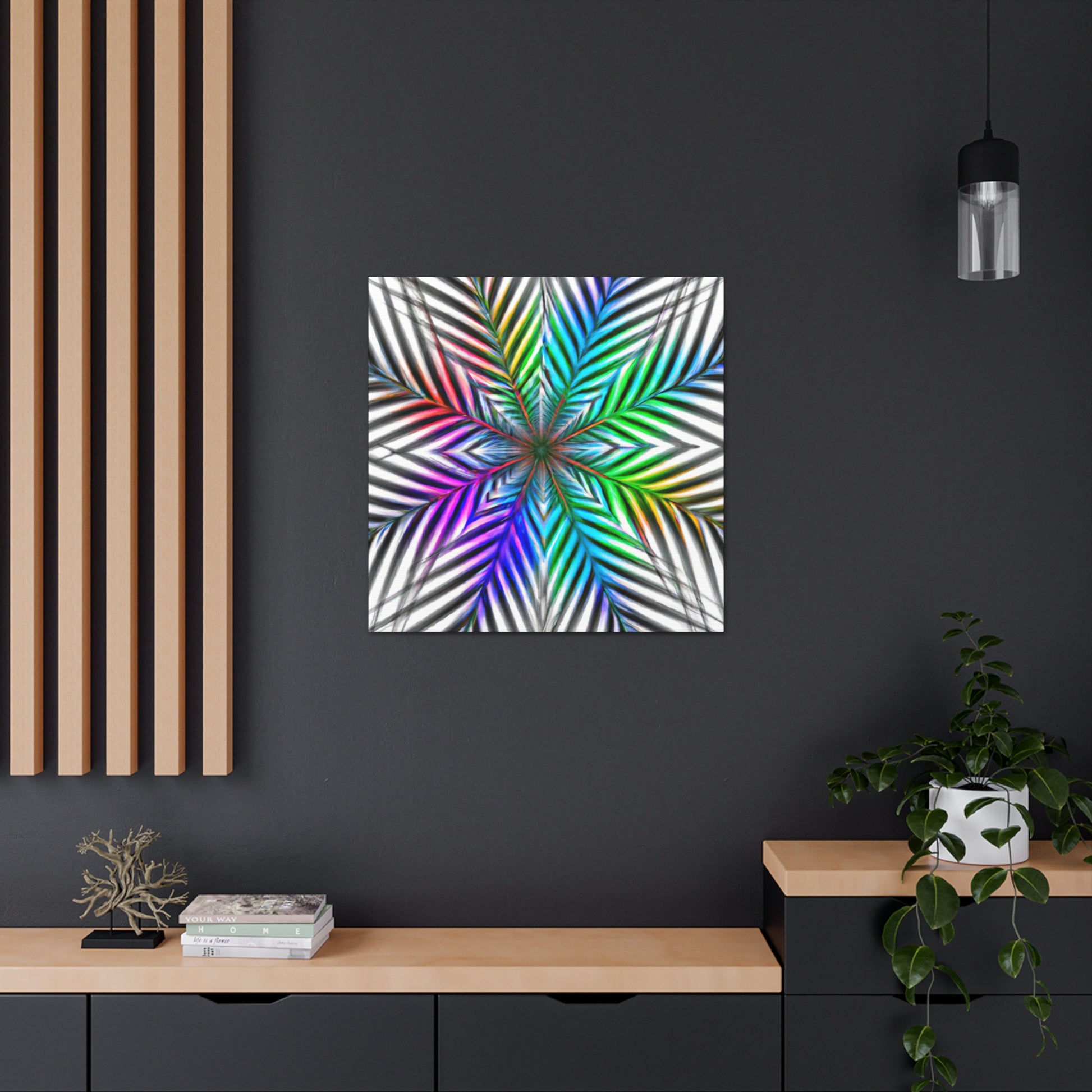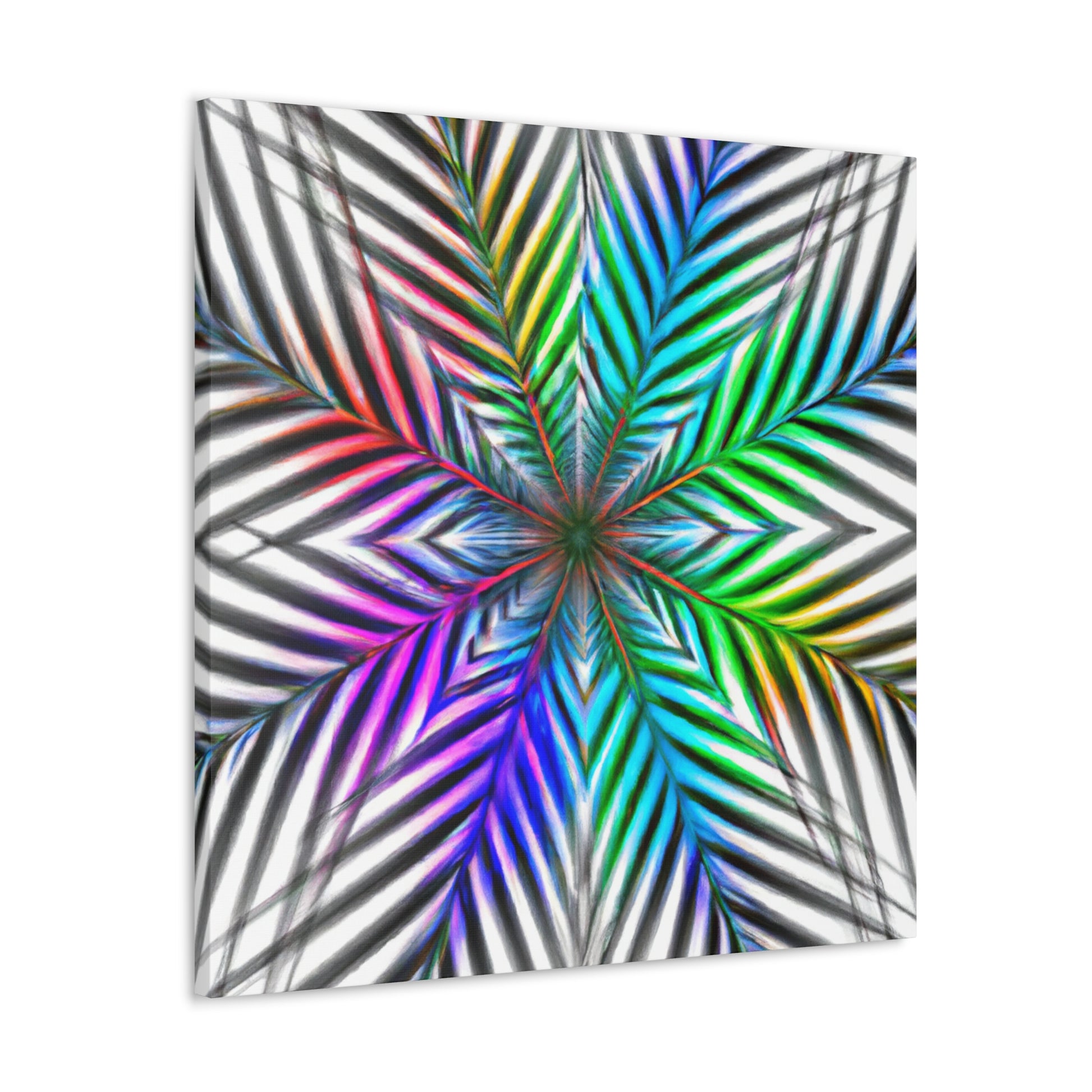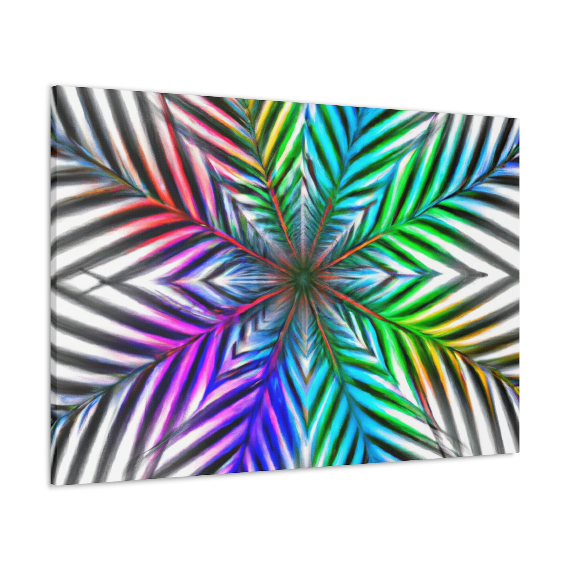 Celebrate the beauty of vibrant colors and abstract digital shapes with this mesmerizing canvas featuring 'Trippy Geometric Palm Leaves Kaleidoscope'. Featuring 3D lines, fractals and a spectacular kaleidoscope design, this wall art shows off an impressive palette of lively colors that will brighten up any space. #3Dlines #fractals #kaleidoscope #palmleaves #abstractart #digitalart #vibrantcolor #geometry #trippyart #wallart #brightcolors