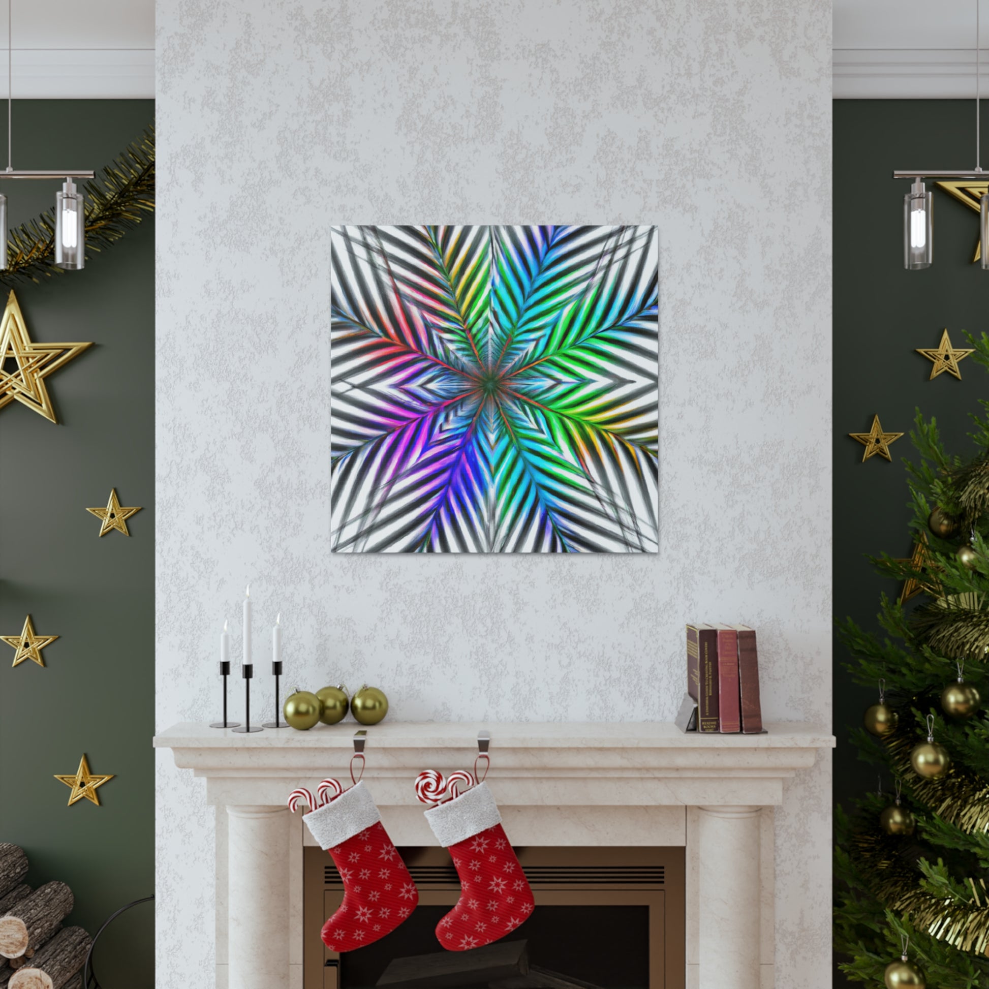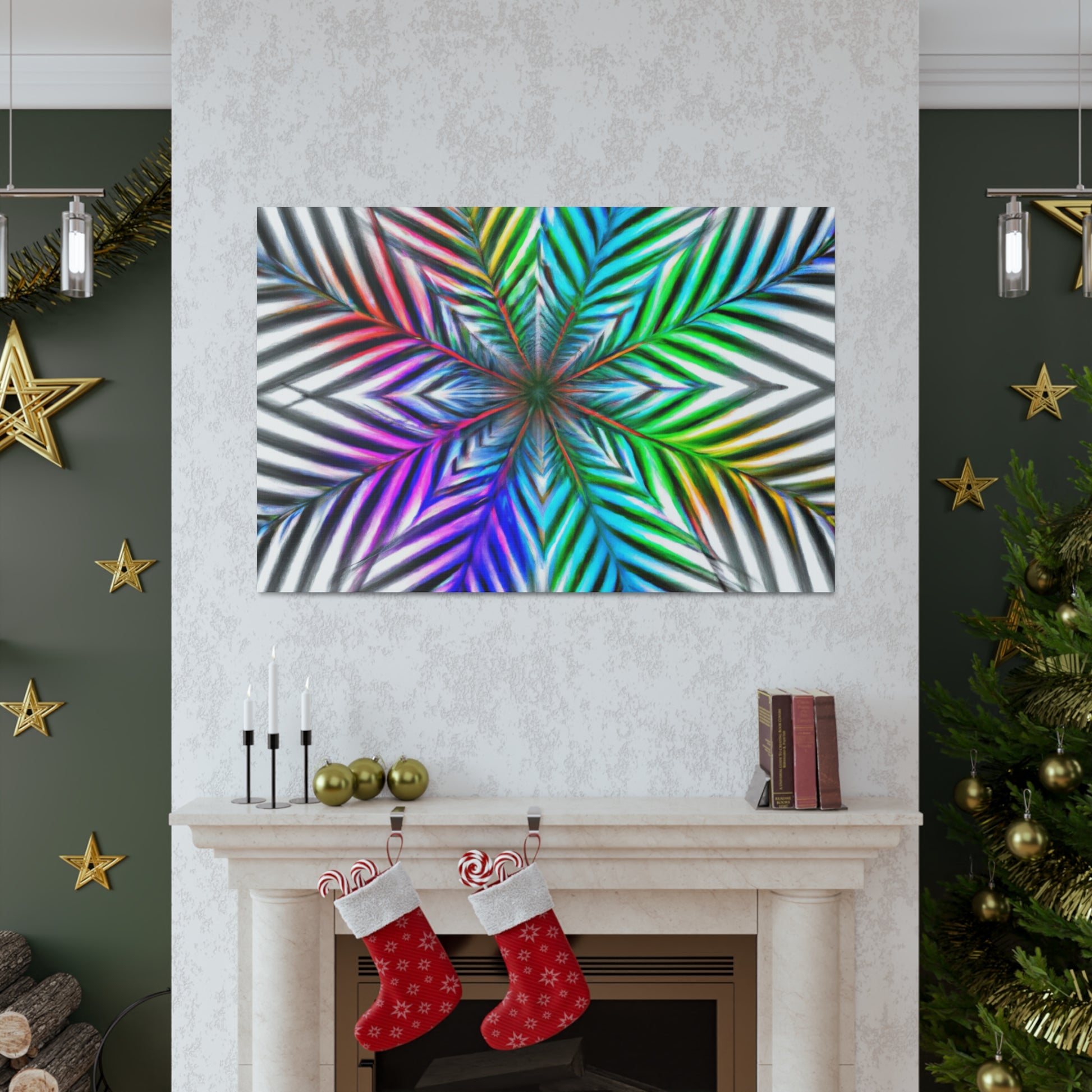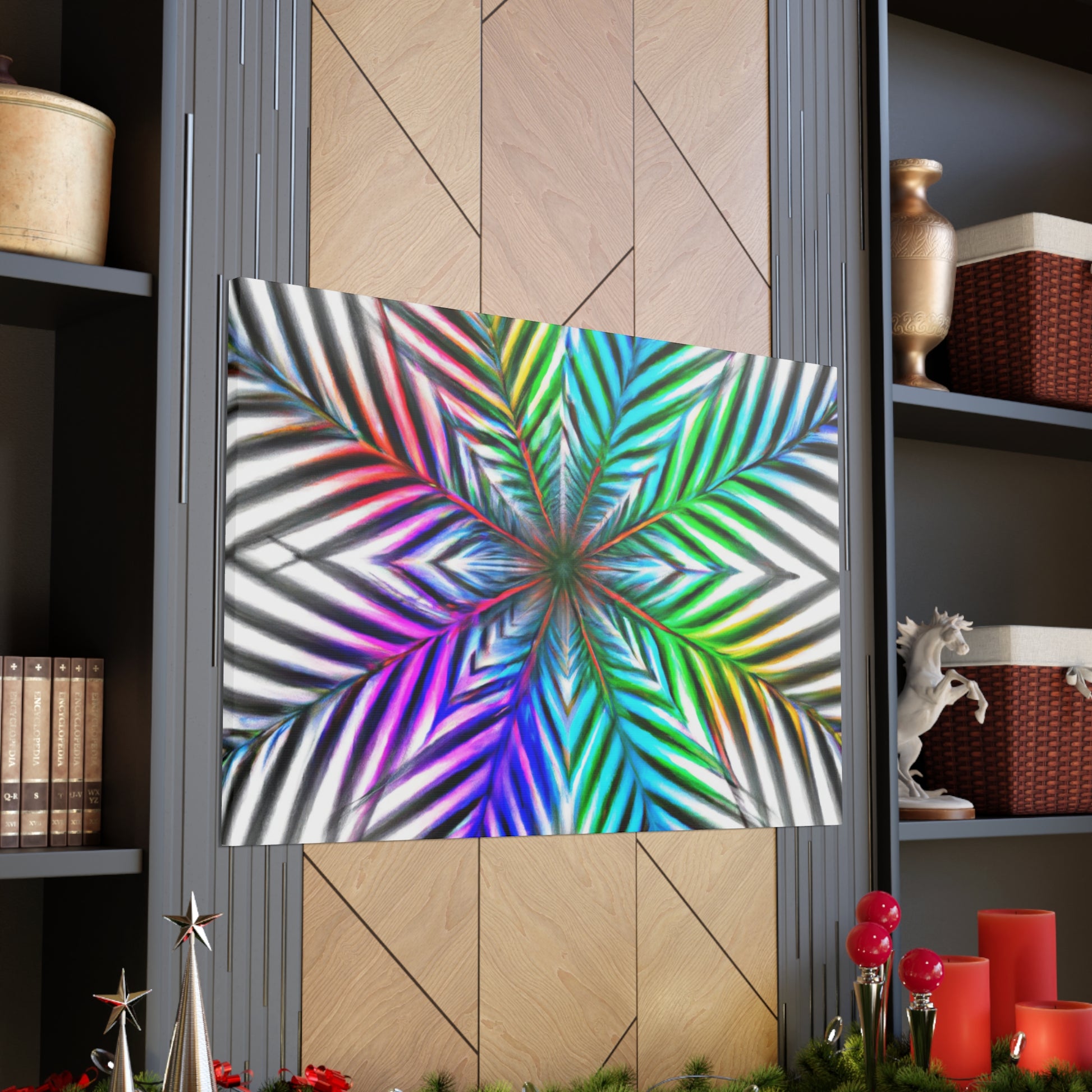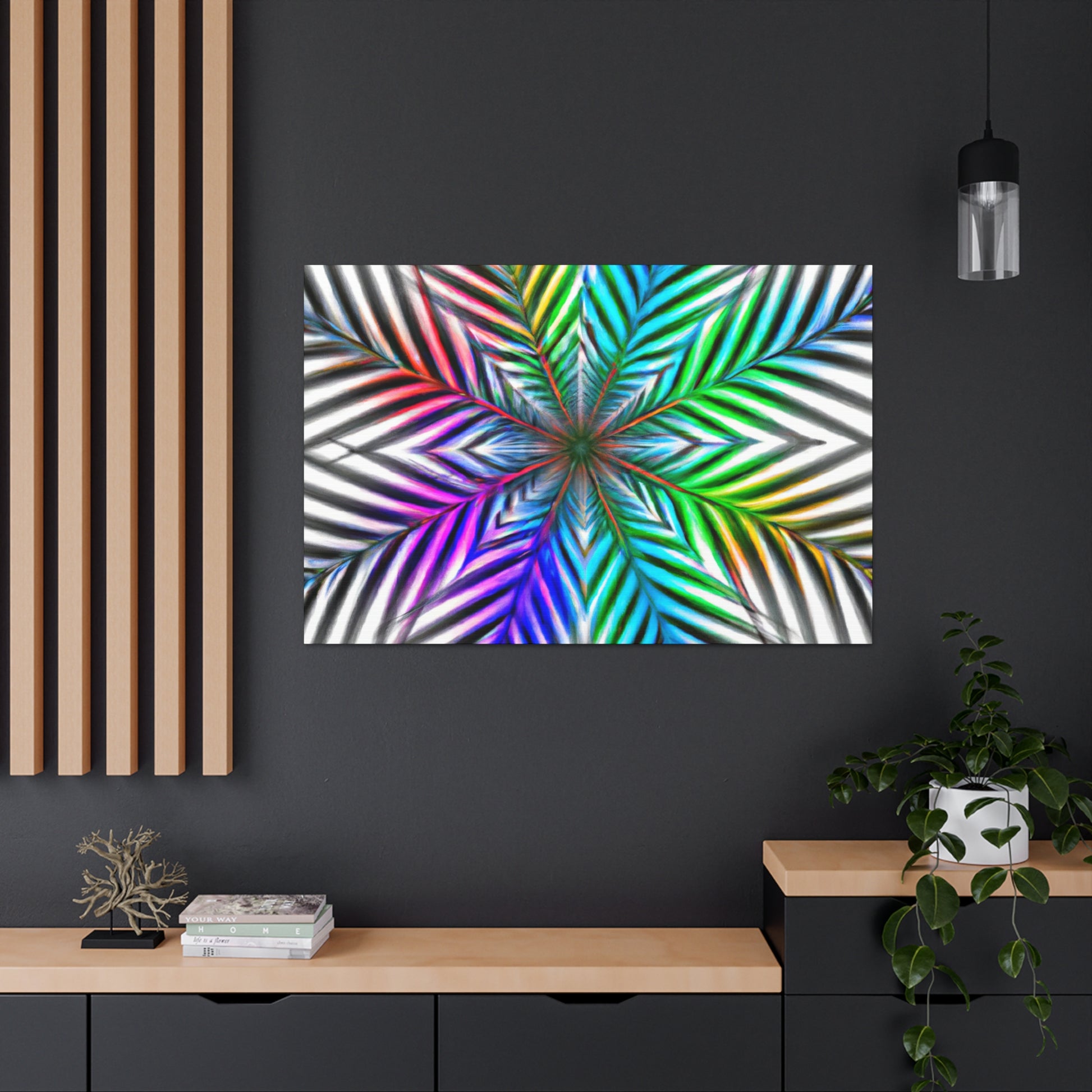 Celebrate the beauty of vibrant colors and abstract digital shapes with this mesmerizing canvas featuring 'Trippy Geometric Palm Leaves Kaleidoscope'. Featuring 3D lines, fractals and a spectacular kaleidoscope design, this wall art shows off an impressive palette of lively colors that will brighten up any space. #3Dlines #fractals #kaleidoscope #palmleaves #abstractart #digitalart #vibrantcolor #geometry #trippyart #wallart #brightcolors