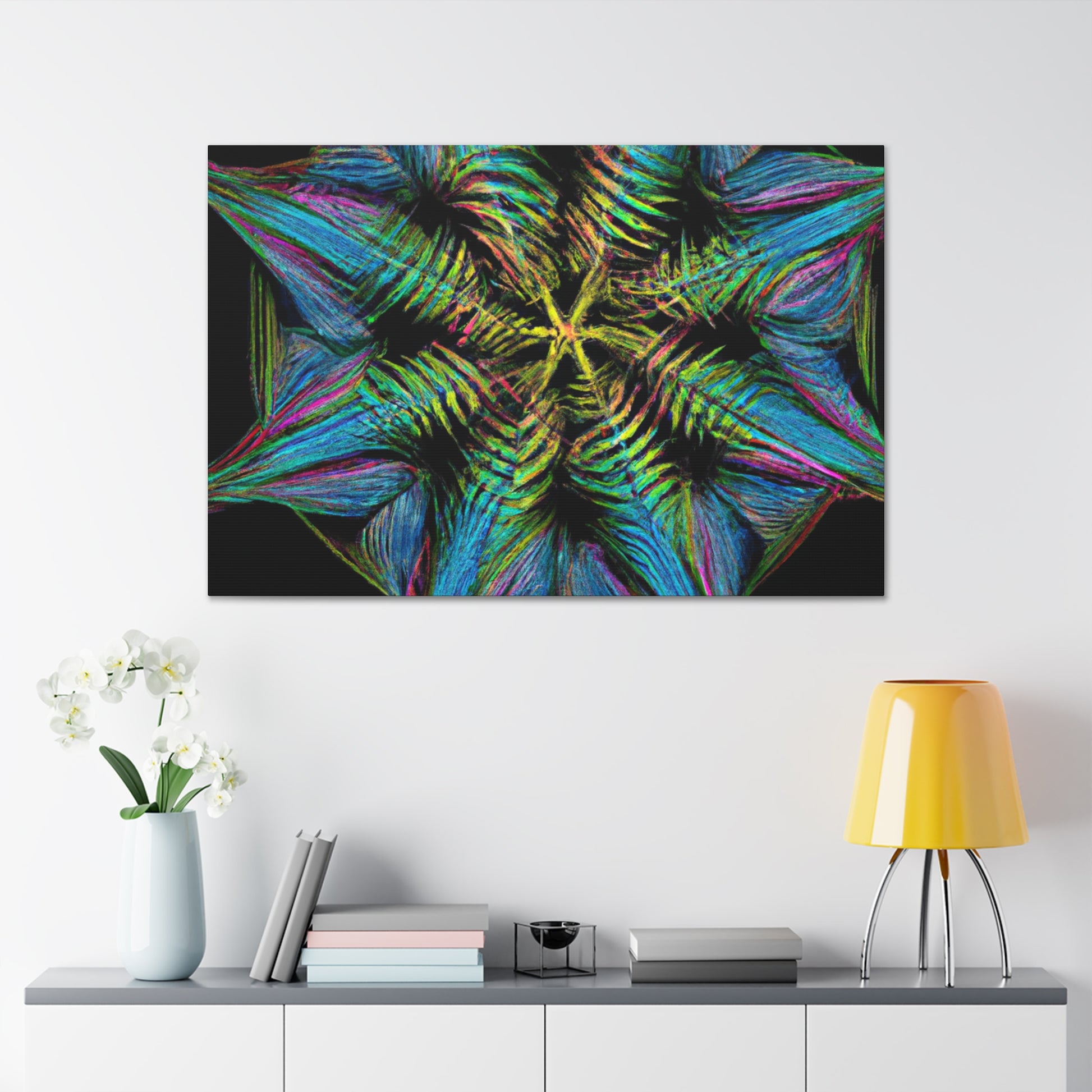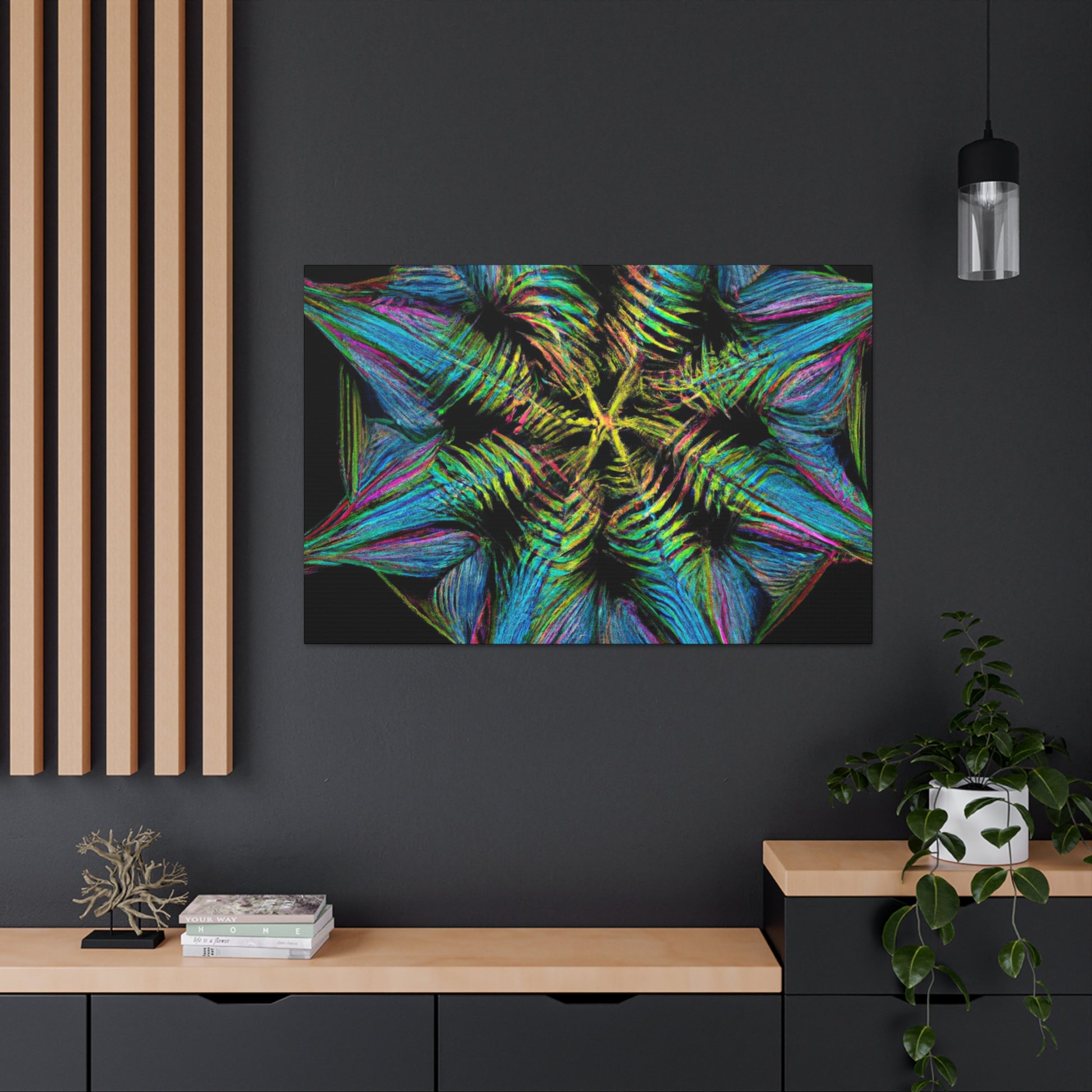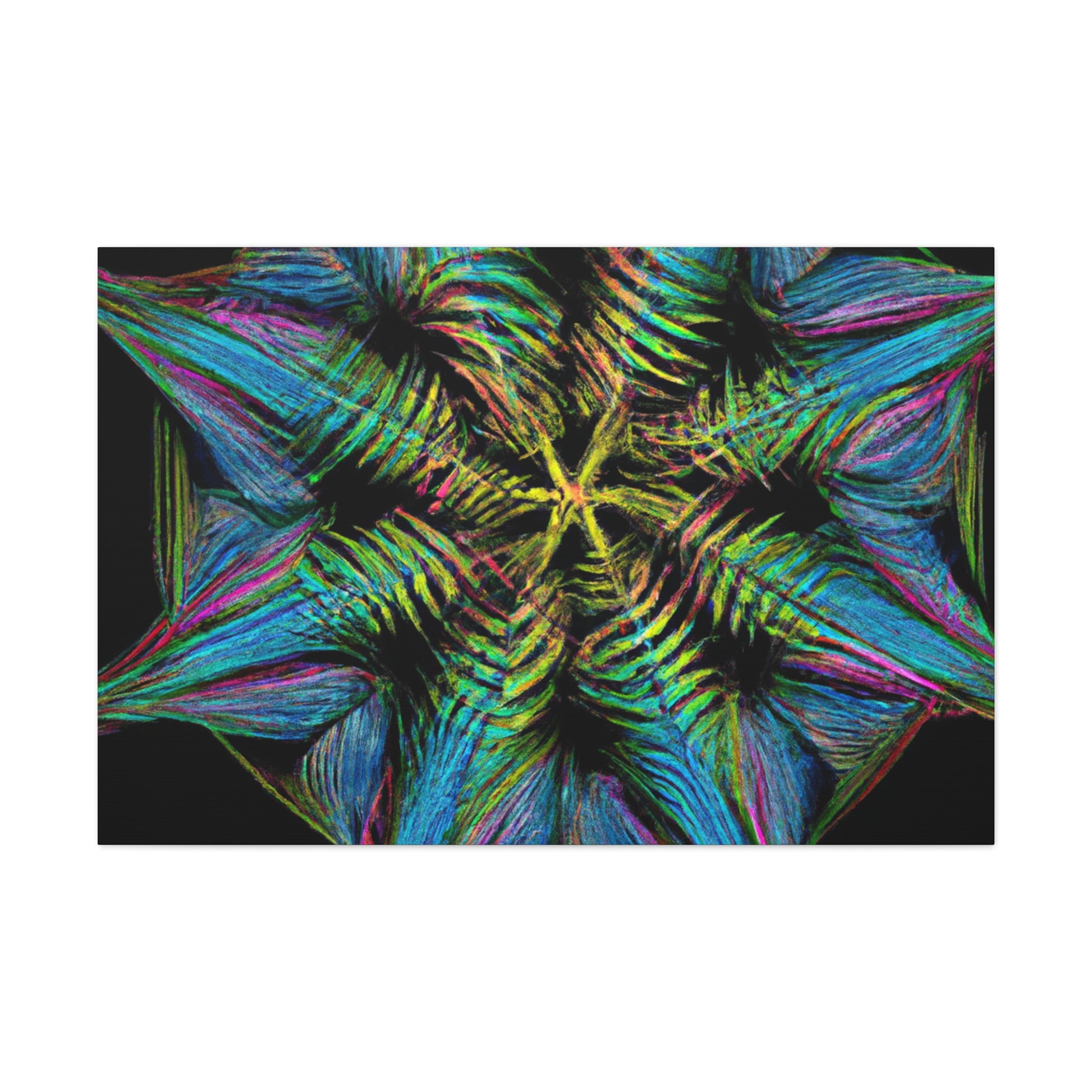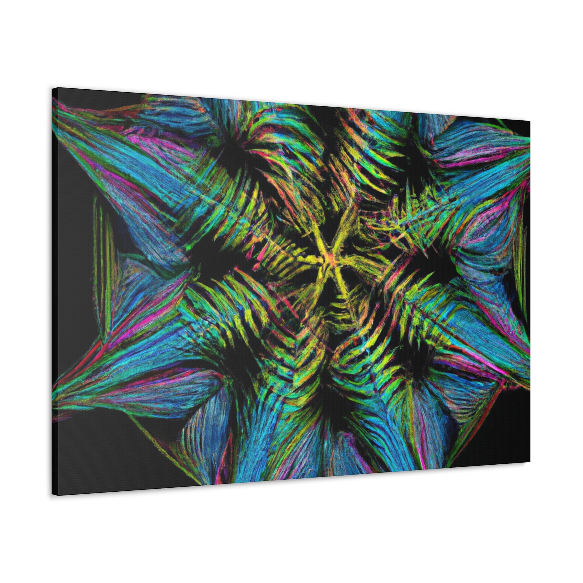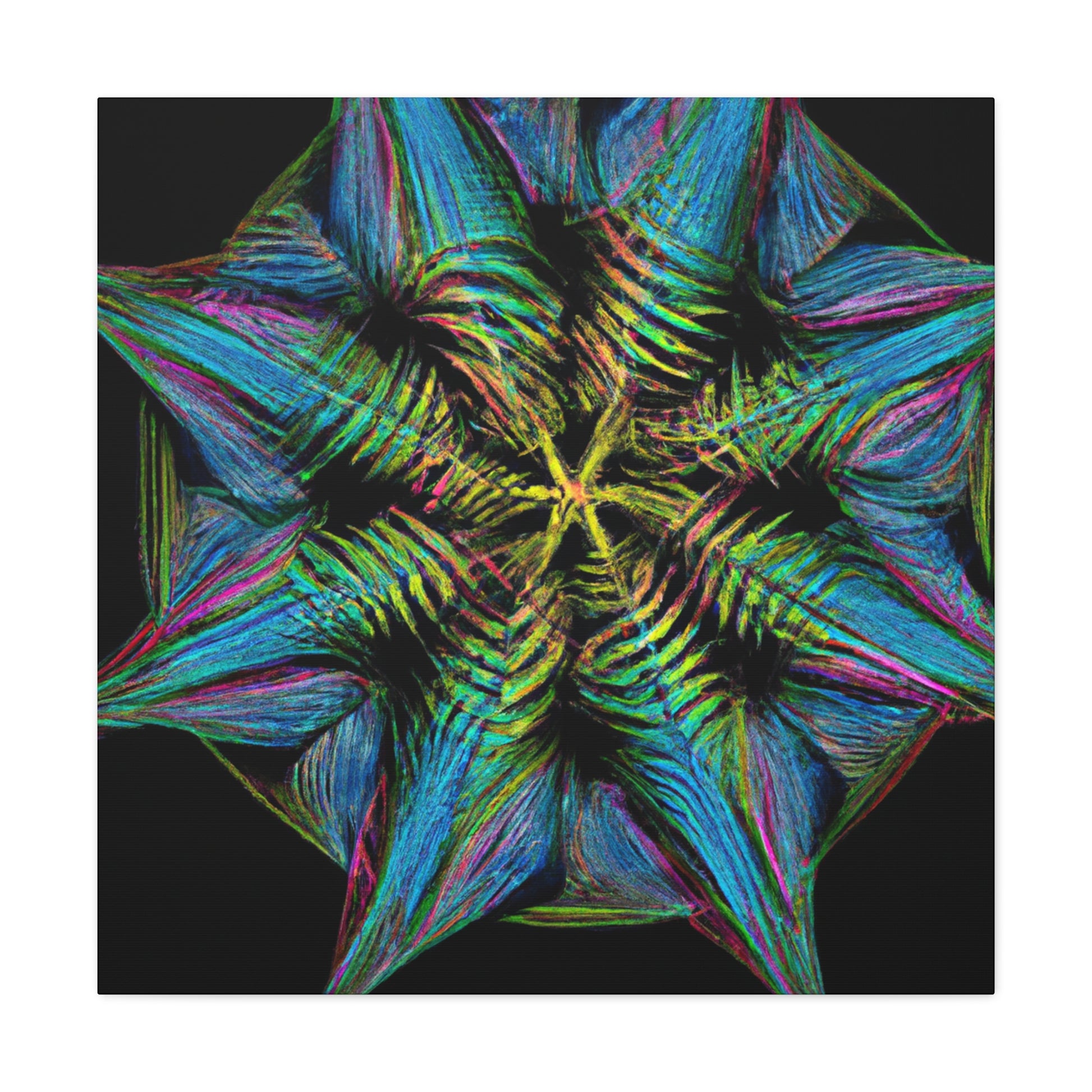 This vibrant, abstract canvas features a stunning geometric palm leaf design. Combining digital art, kaleidoscope patterns, 3D lines, fractal shapes, and gorgeous colors, this unique work of art is the perfect addition to any home! Bring a fun and modern look to any space with this digital masterpiece! #abstractcanvas #palmleaves #geometricart #digitalpainting #vibrantcolors #homeaccessories #3Dlines #fractal #kaleidoscope #artdecor #trippyart