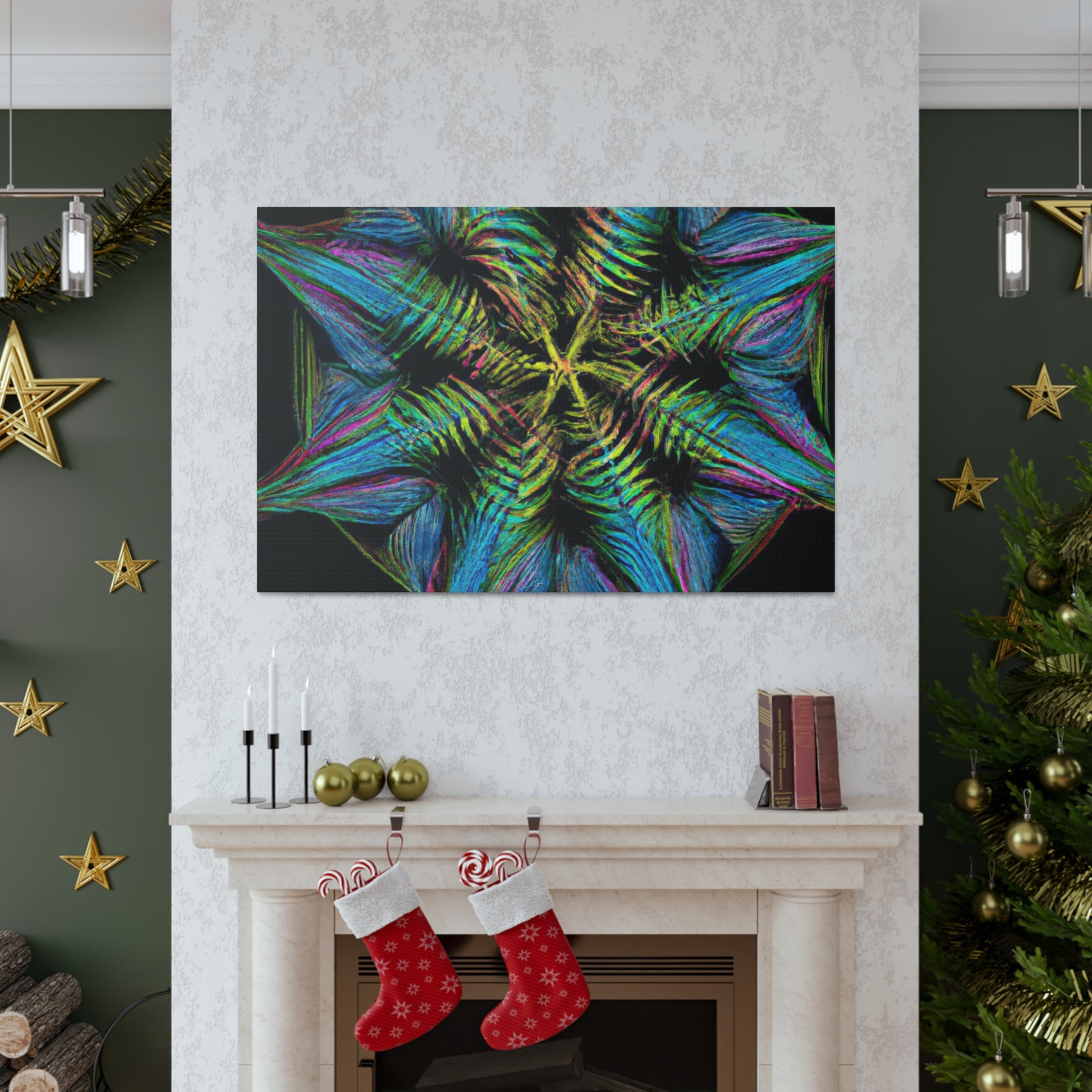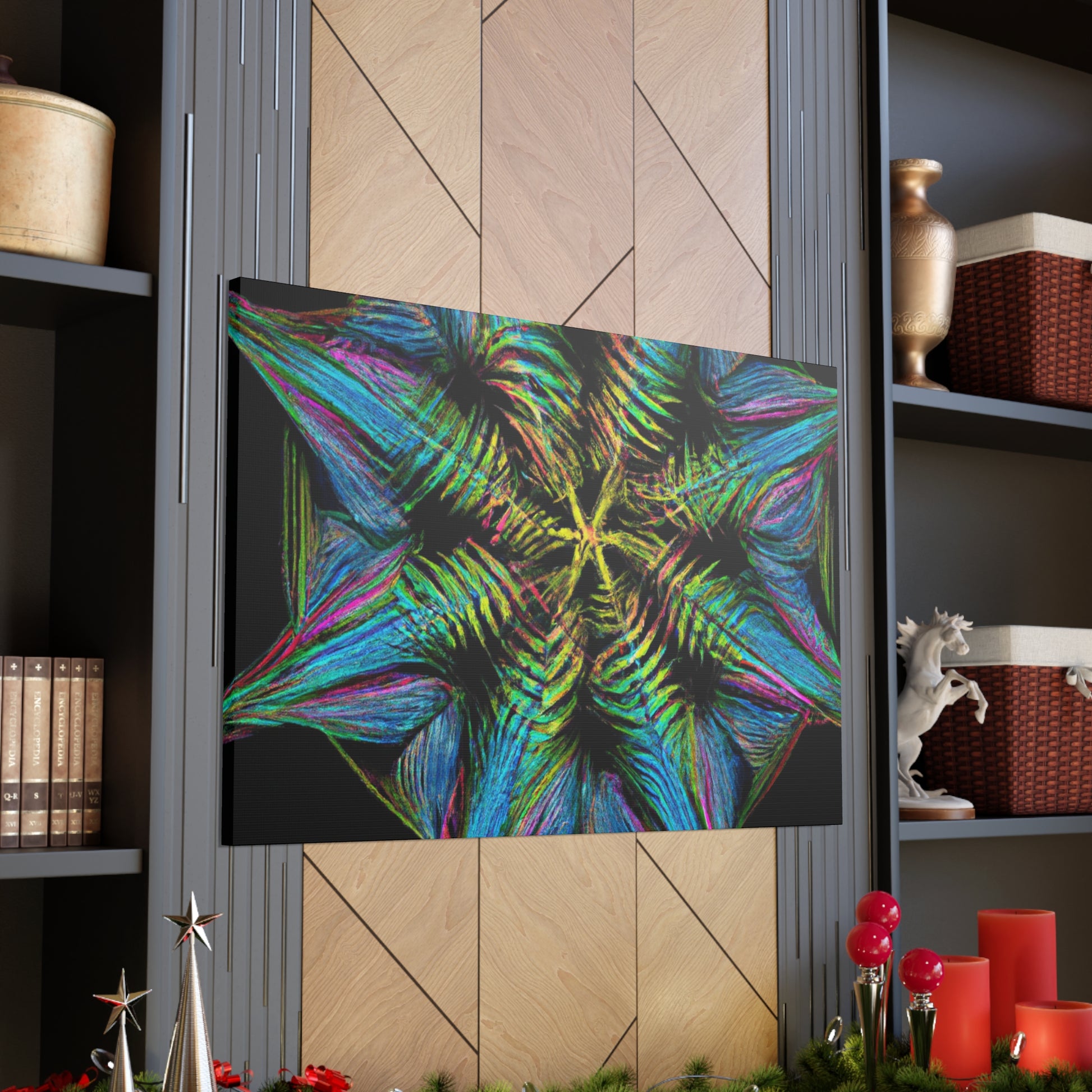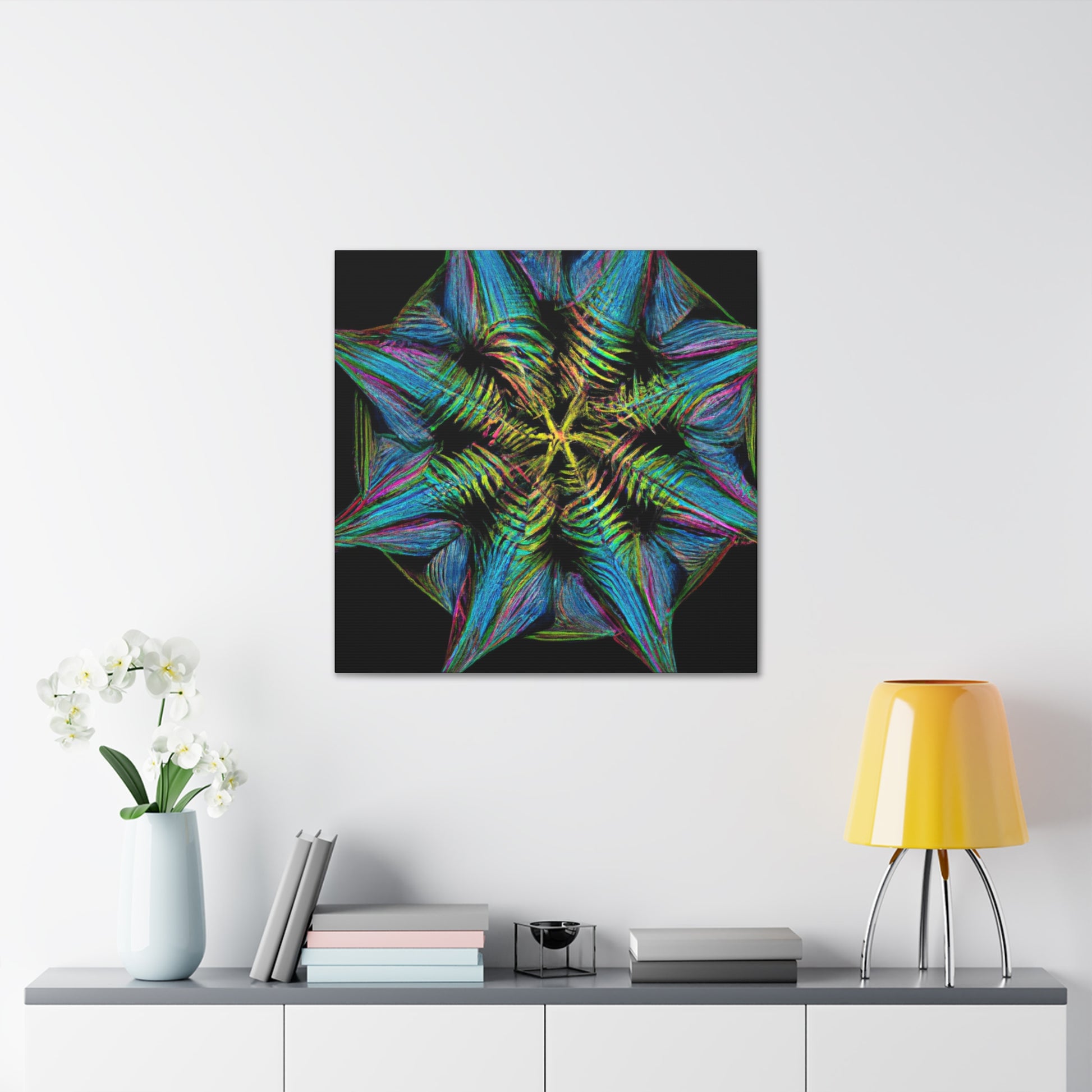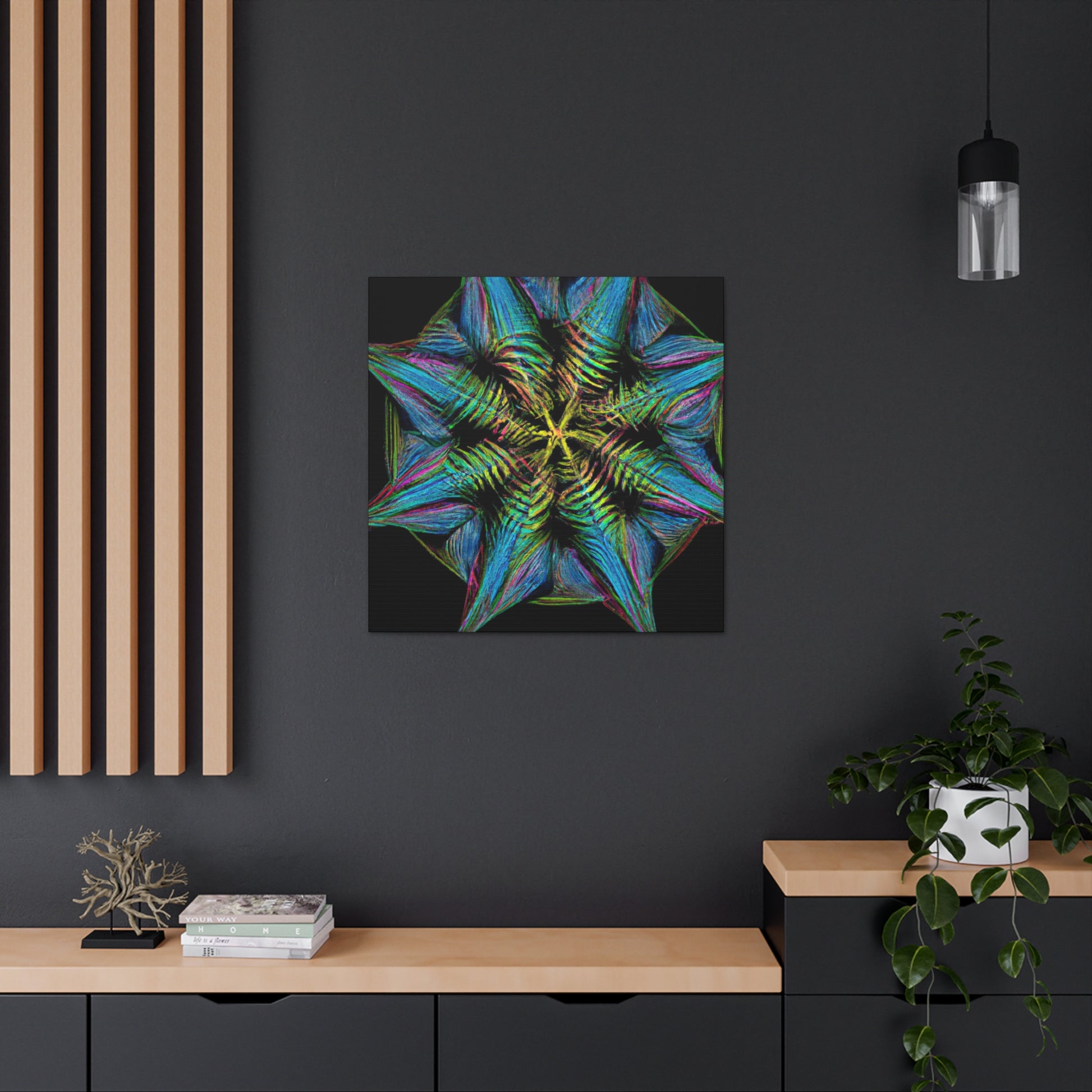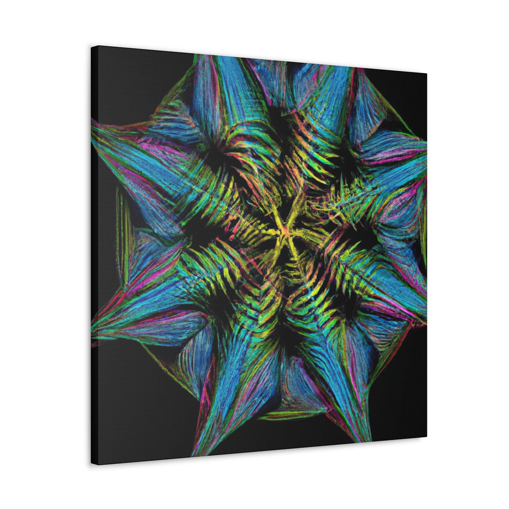 This vibrant, abstract canvas features a stunning geometric palm leaf design. Combining digital art, kaleidoscope patterns, 3D lines, fractal shapes, and gorgeous colors, this unique work of art is the perfect addition to any home! Bring a fun and modern look to any space with this digital masterpiece! #abstractcanvas #palmleaves #geometricart #digitalpainting #vibrantcolors #homeaccessories #3Dlines #fractal #kaleidoscope #artdecor #trippyart