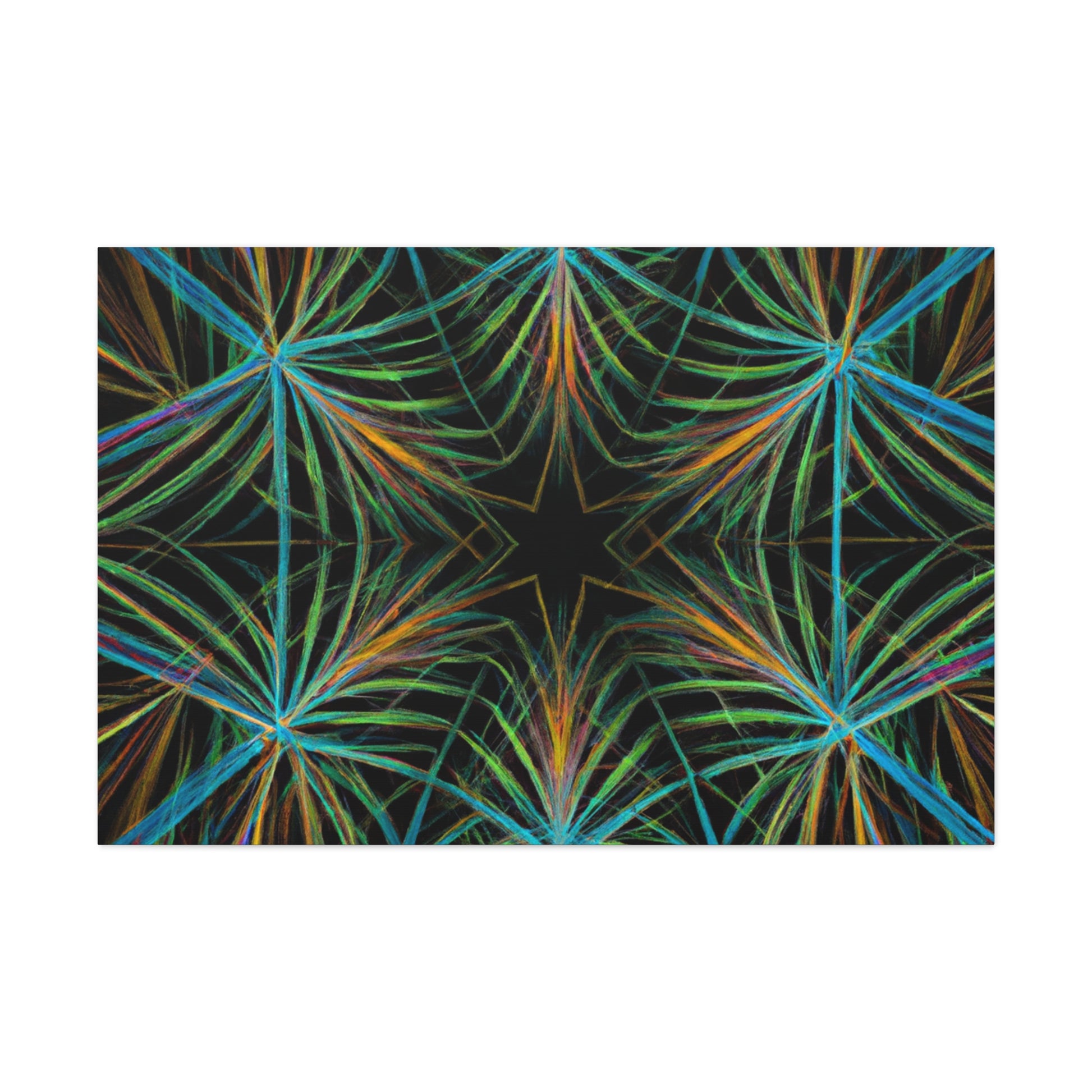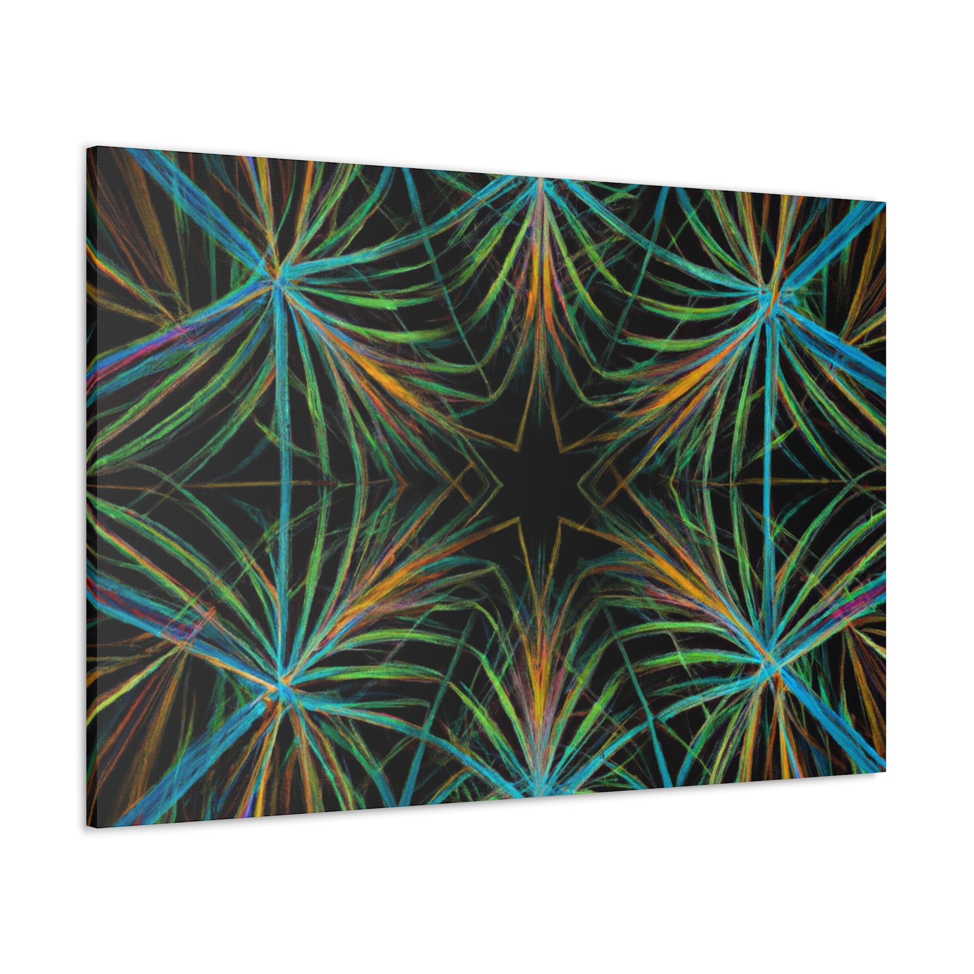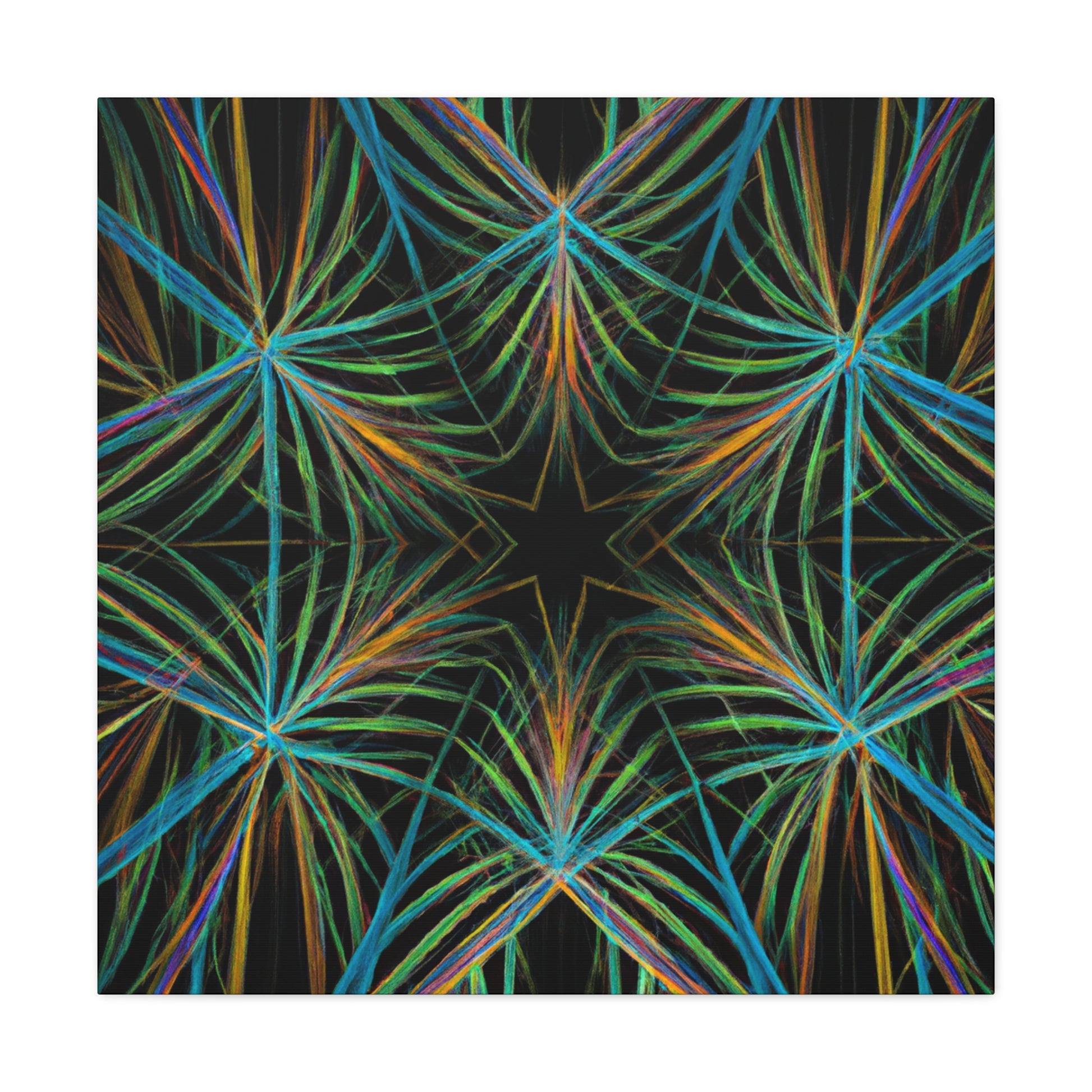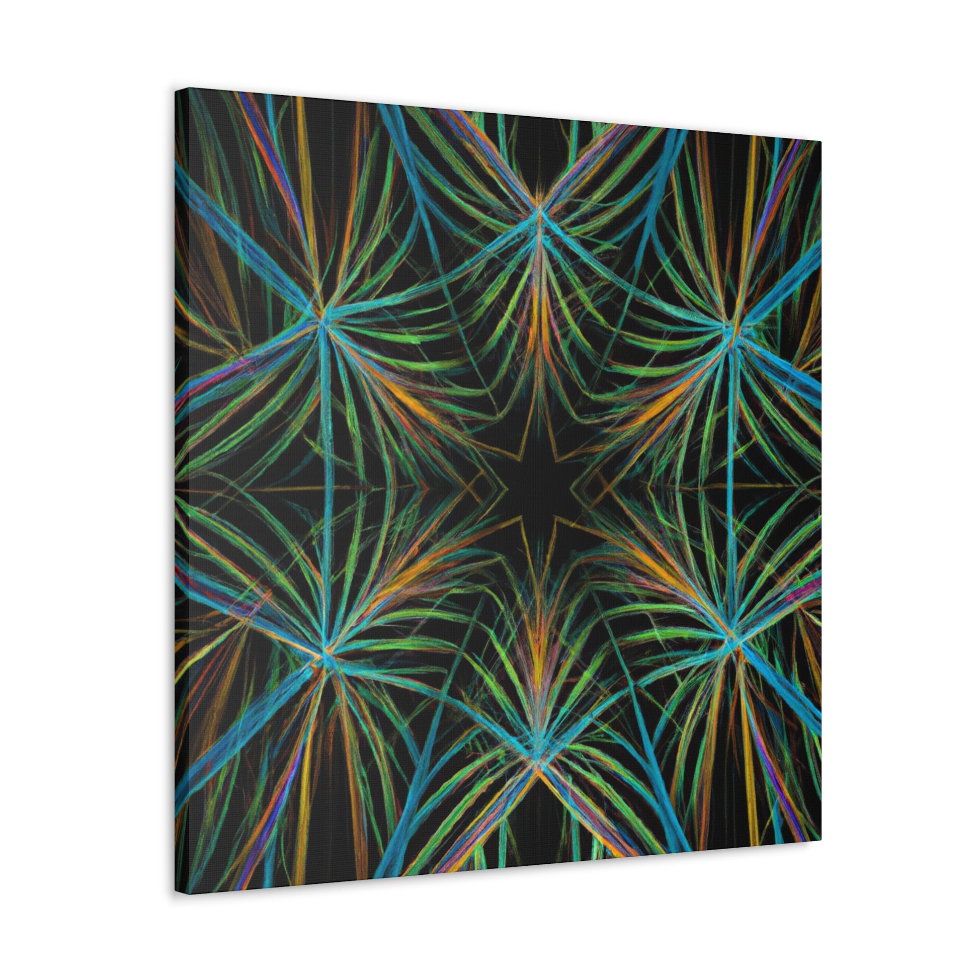 Vibrant and psychedelic! This digital art canvas features a magnificent kaleidoscope of abstract geometric palm leaves, triangular fractals, and 3D lines. An infusion of delightful colors make this artwork truly unique. Add a modern, vibrant atmosphere to your home today! #trippy #geometric #palmleaves #kaleidoscope #abstract #digitalart #vibrantcolors #3Dlines #fractal #uniqueart #atmosphere