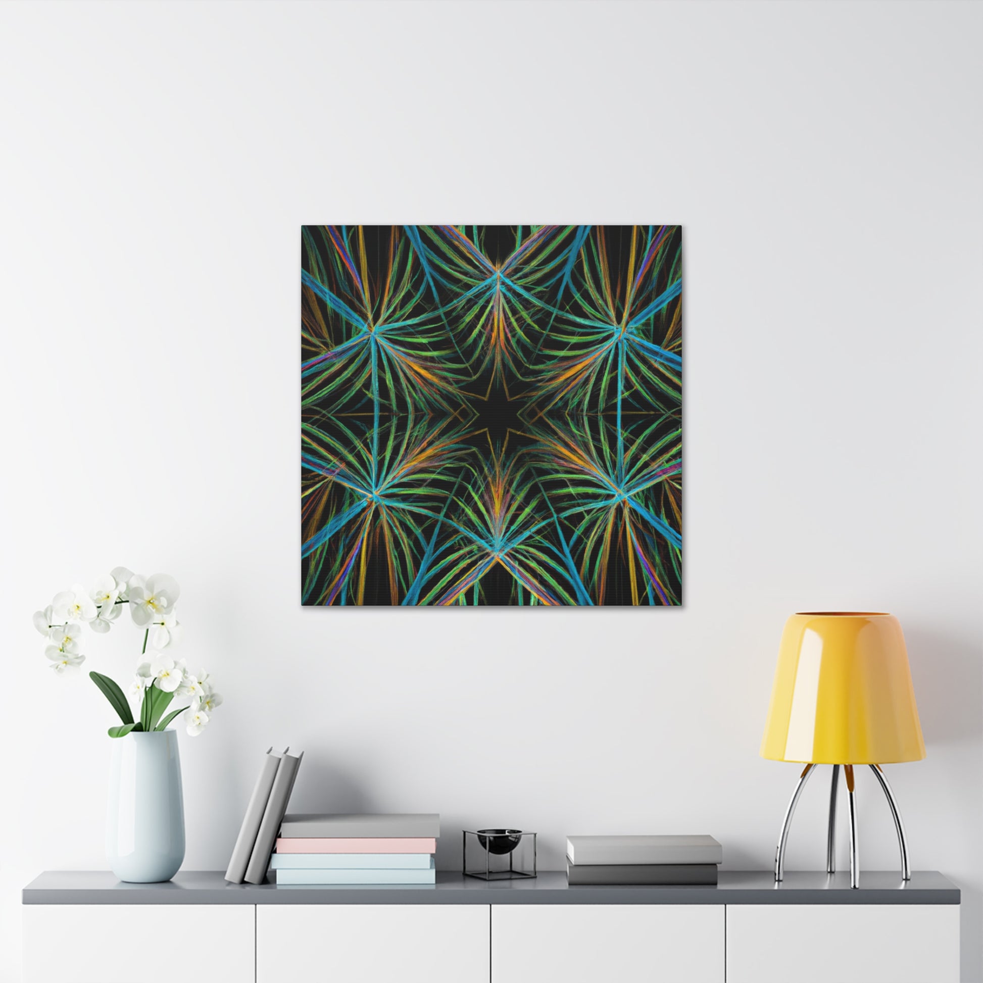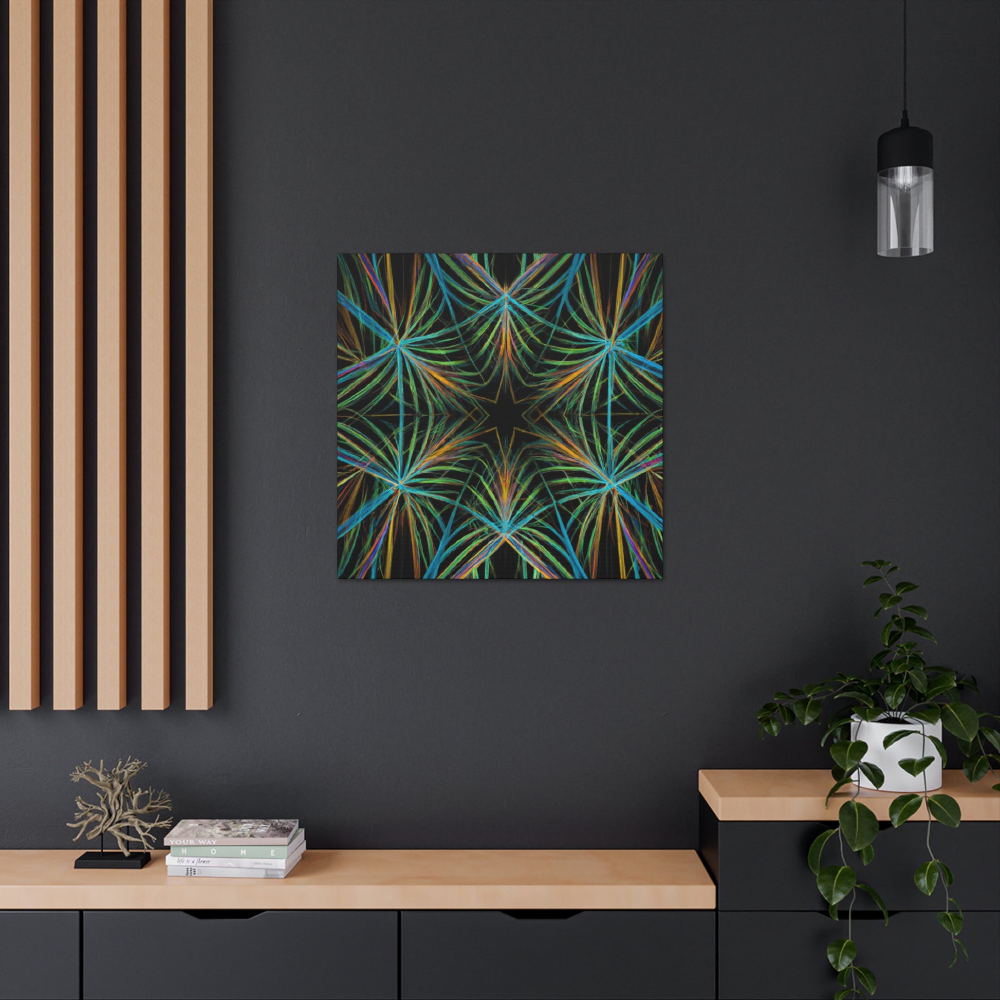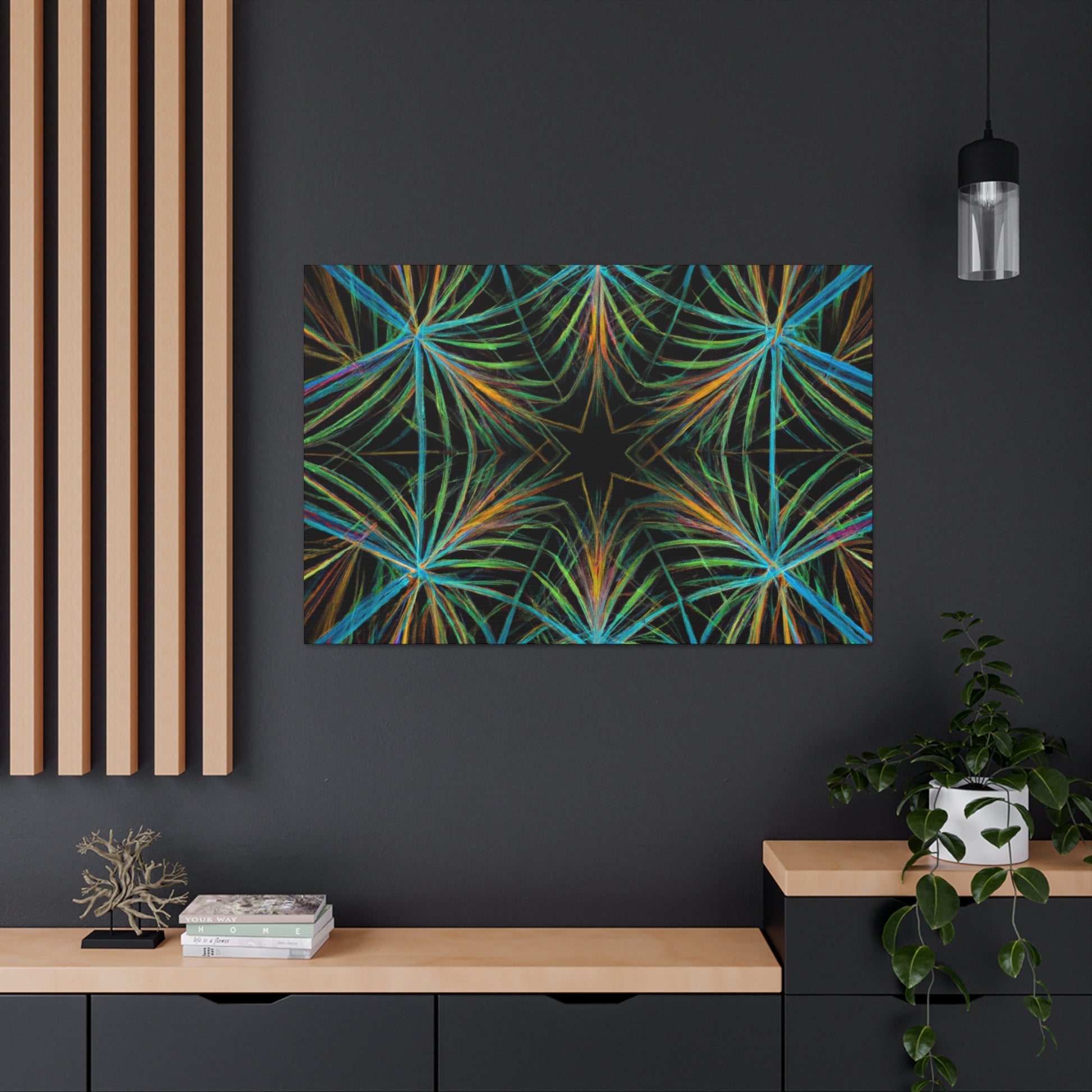 Vibrant and psychedelic! This digital art canvas features a magnificent kaleidoscope of abstract geometric palm leaves, triangular fractals, and 3D lines. An infusion of delightful colors make this artwork truly unique. Add a modern, vibrant atmosphere to your home today! #trippy #geometric #palmleaves #kaleidoscope #abstract #digitalart #vibrantcolors #3Dlines #fractal #uniqueart #atmosphere