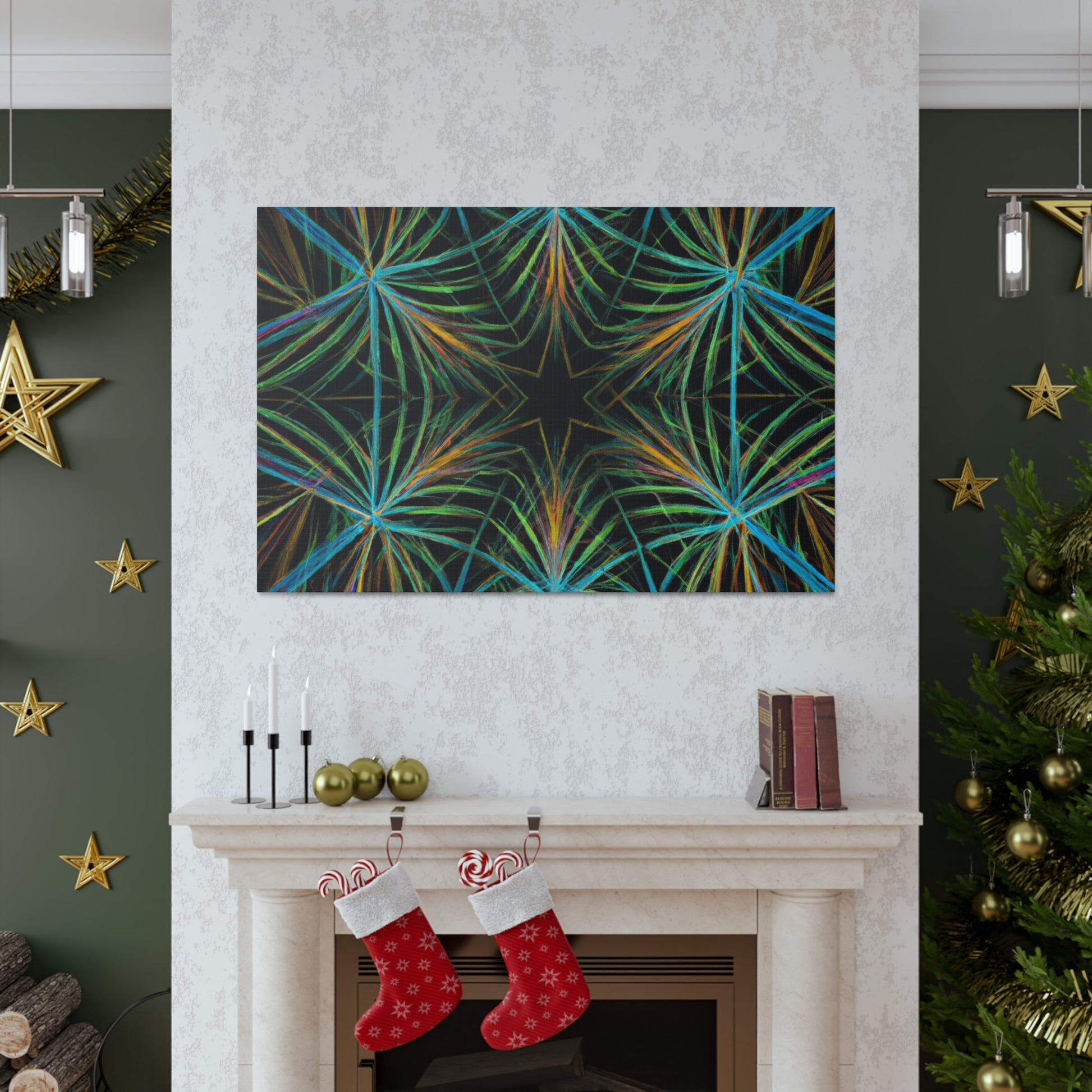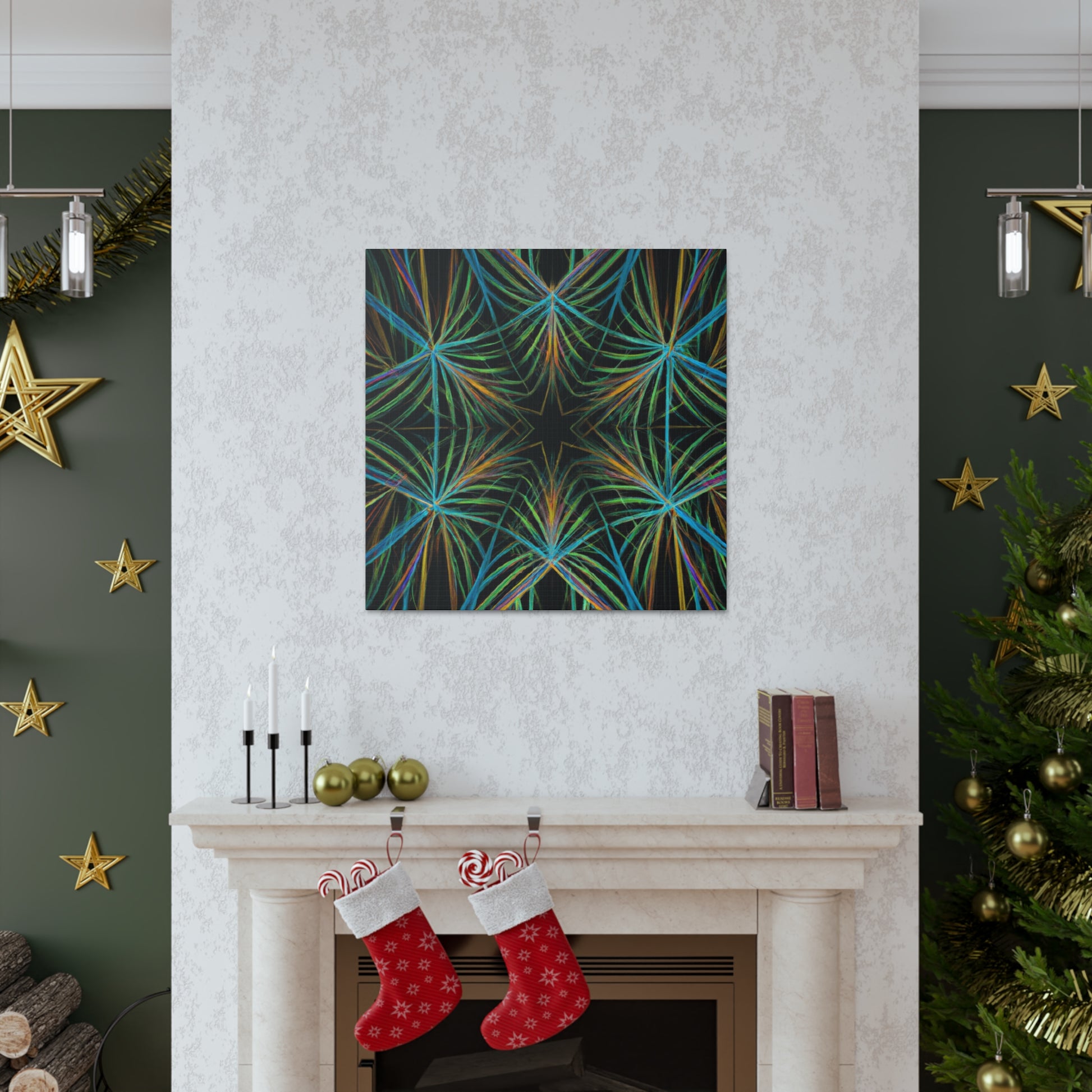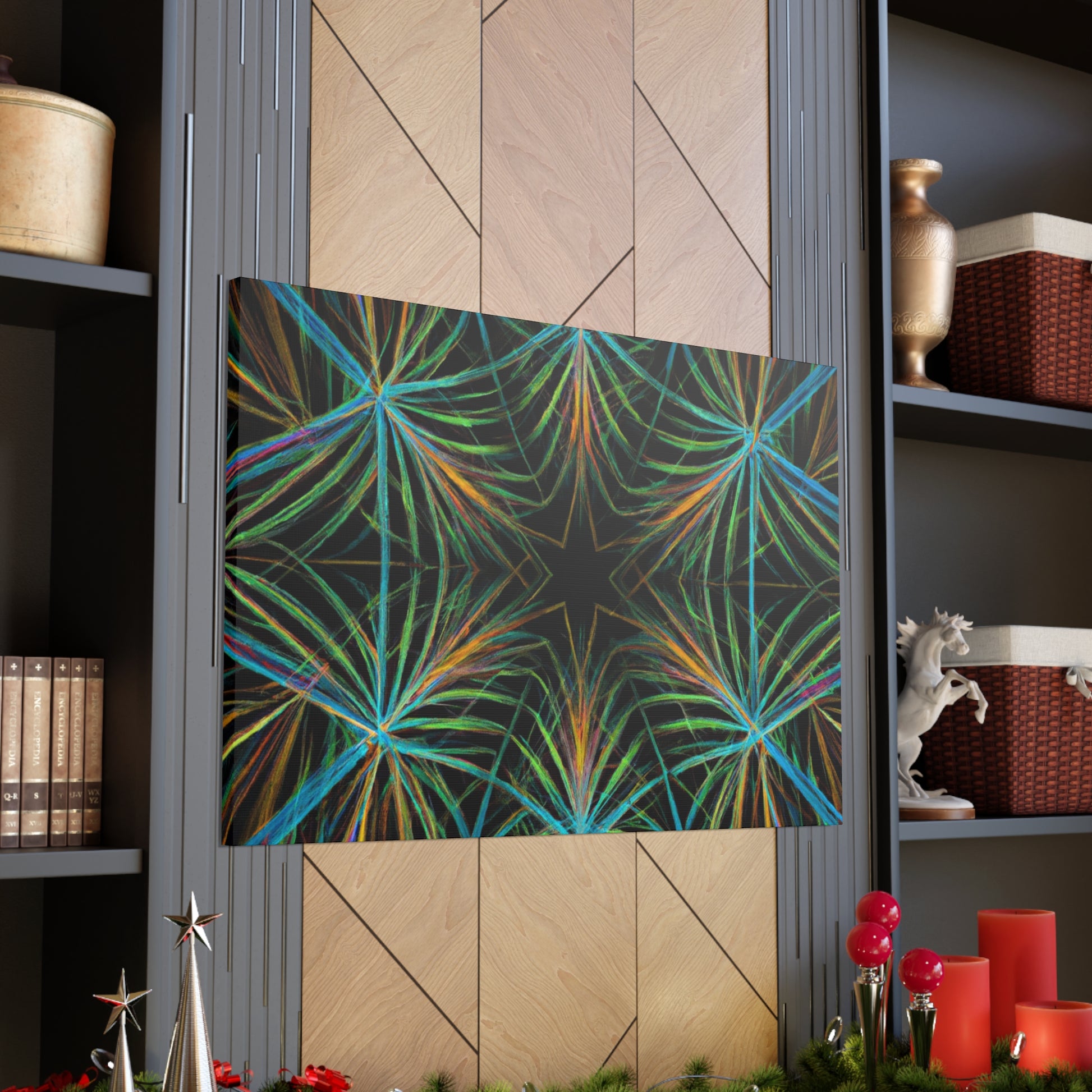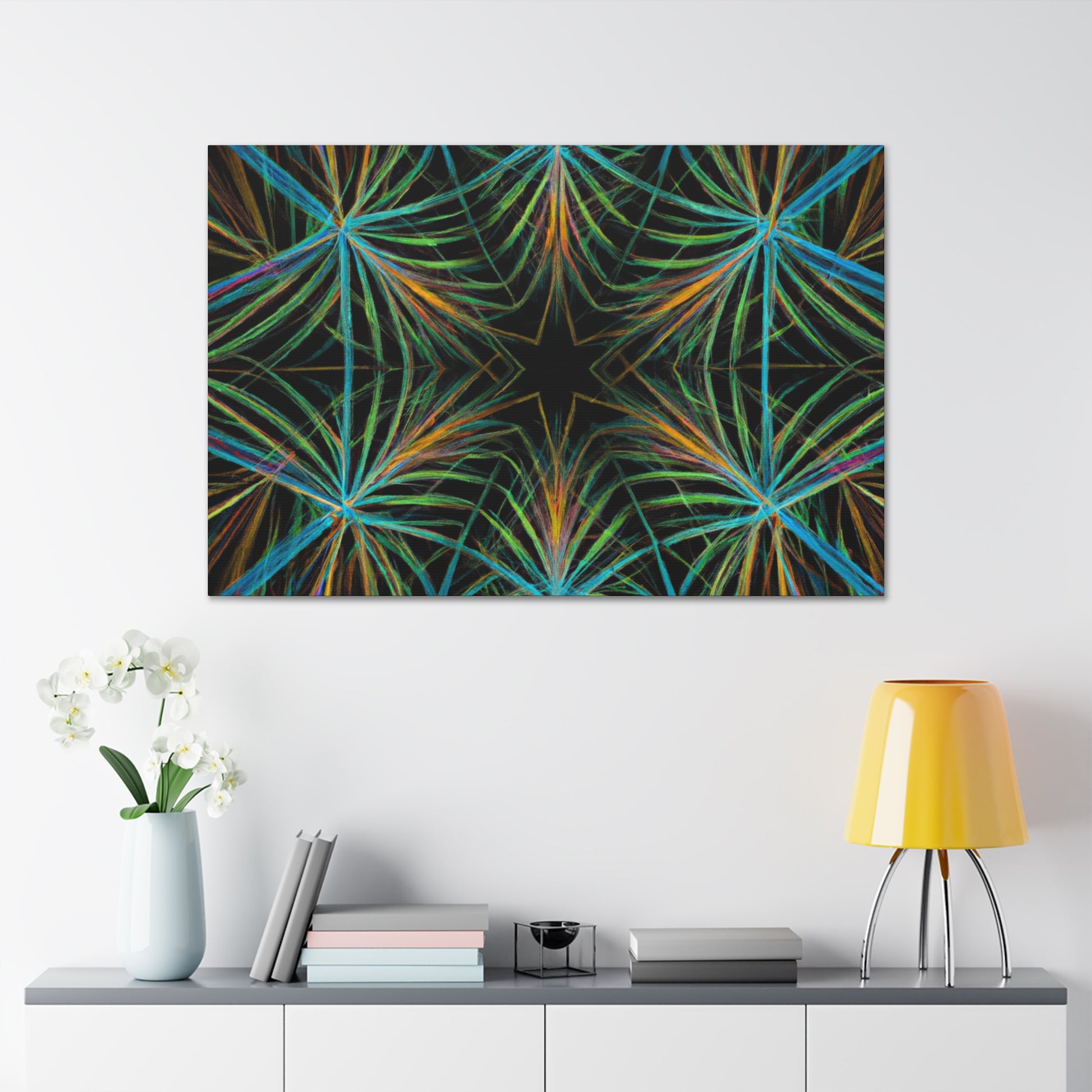 Vibrant and psychedelic! This digital art canvas features a magnificent kaleidoscope of abstract geometric palm leaves, triangular fractals, and 3D lines. An infusion of delightful colors make this artwork truly unique. Add a modern, vibrant atmosphere to your home today! #trippy #geometric #palmleaves #kaleidoscope #abstract #digitalart #vibrantcolors #3Dlines #fractal #uniqueart #atmosphere