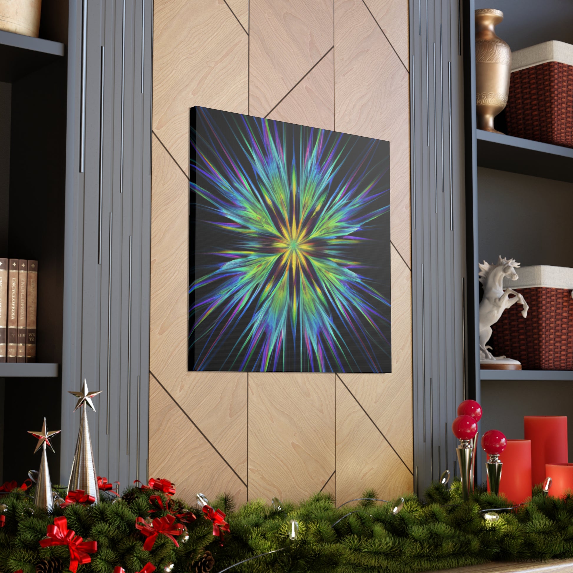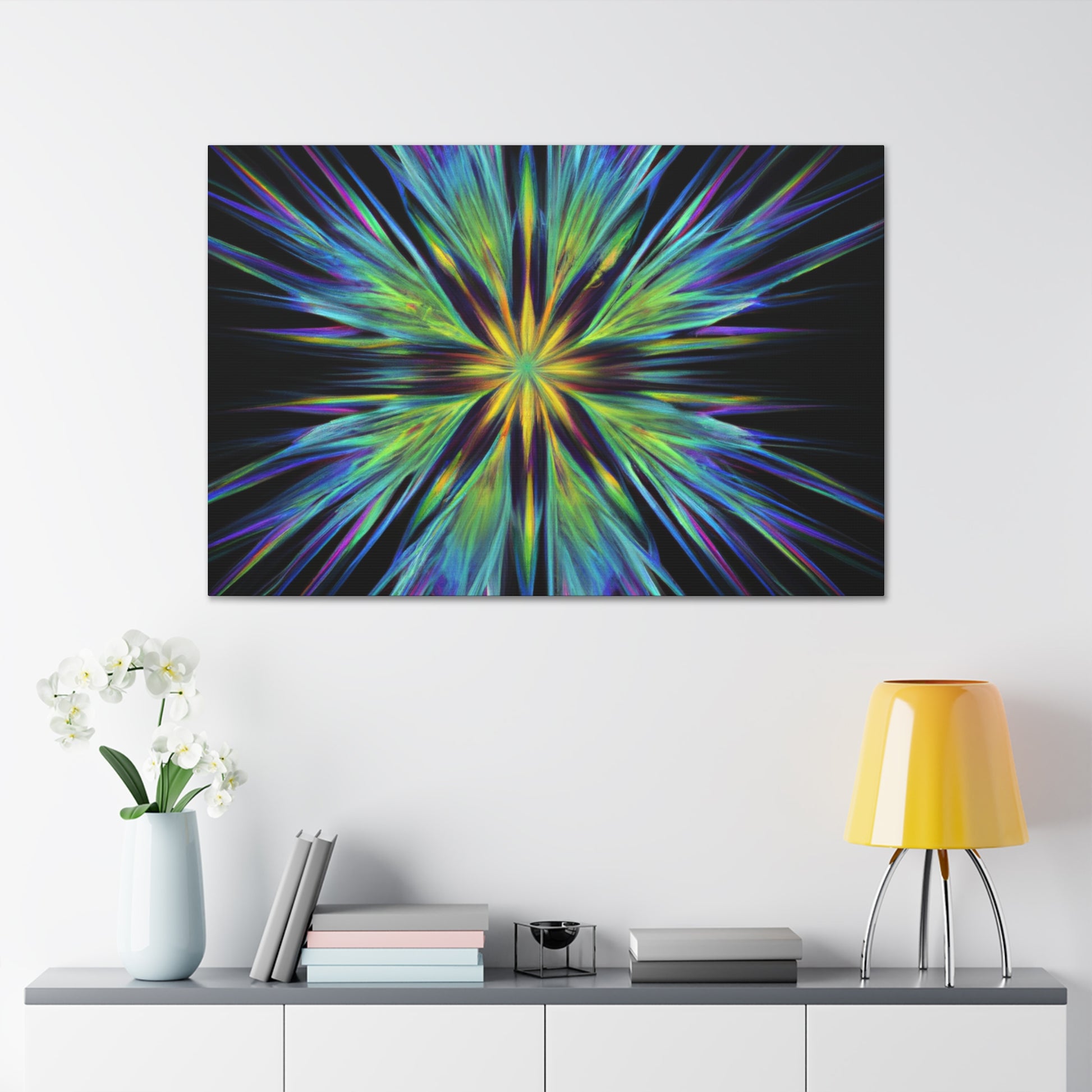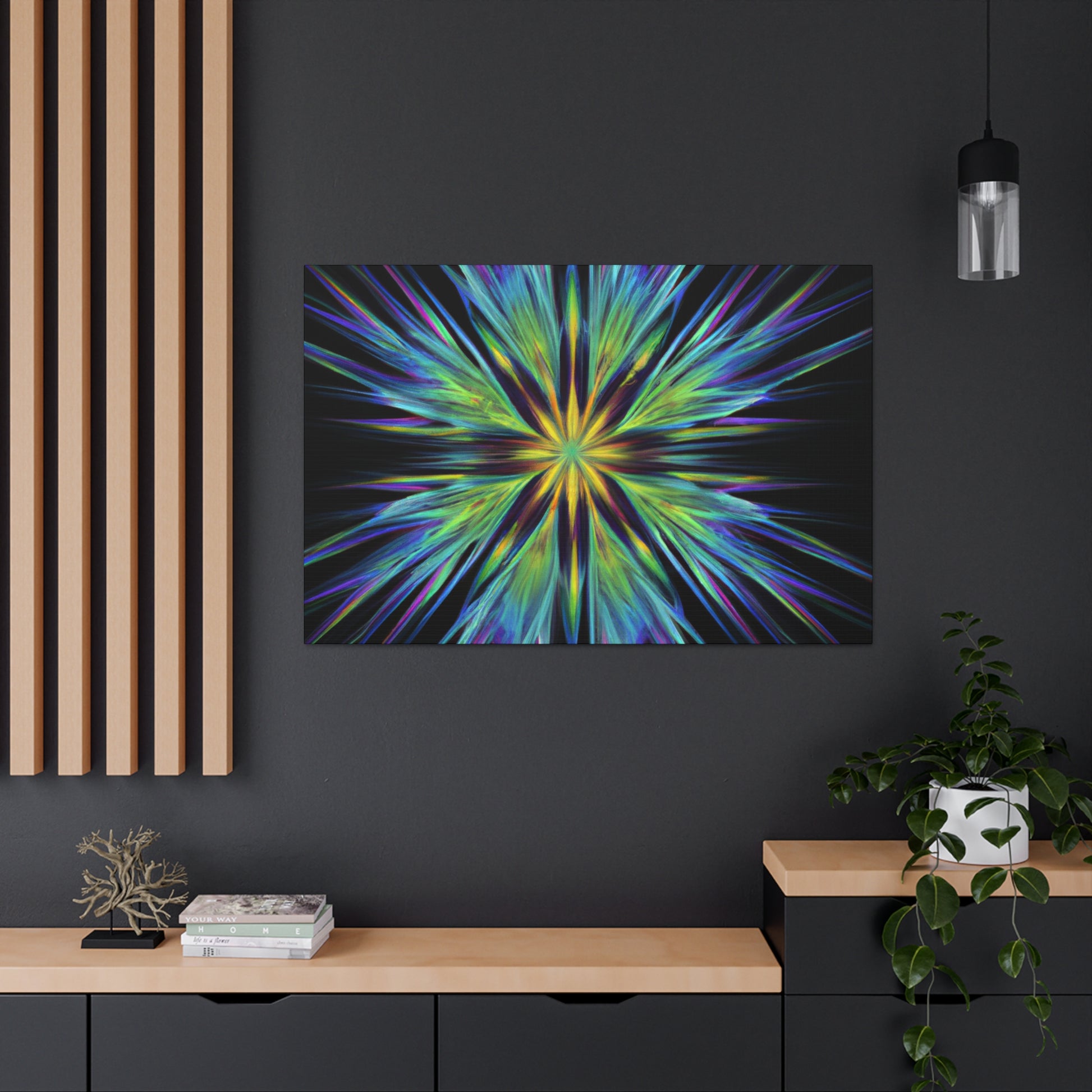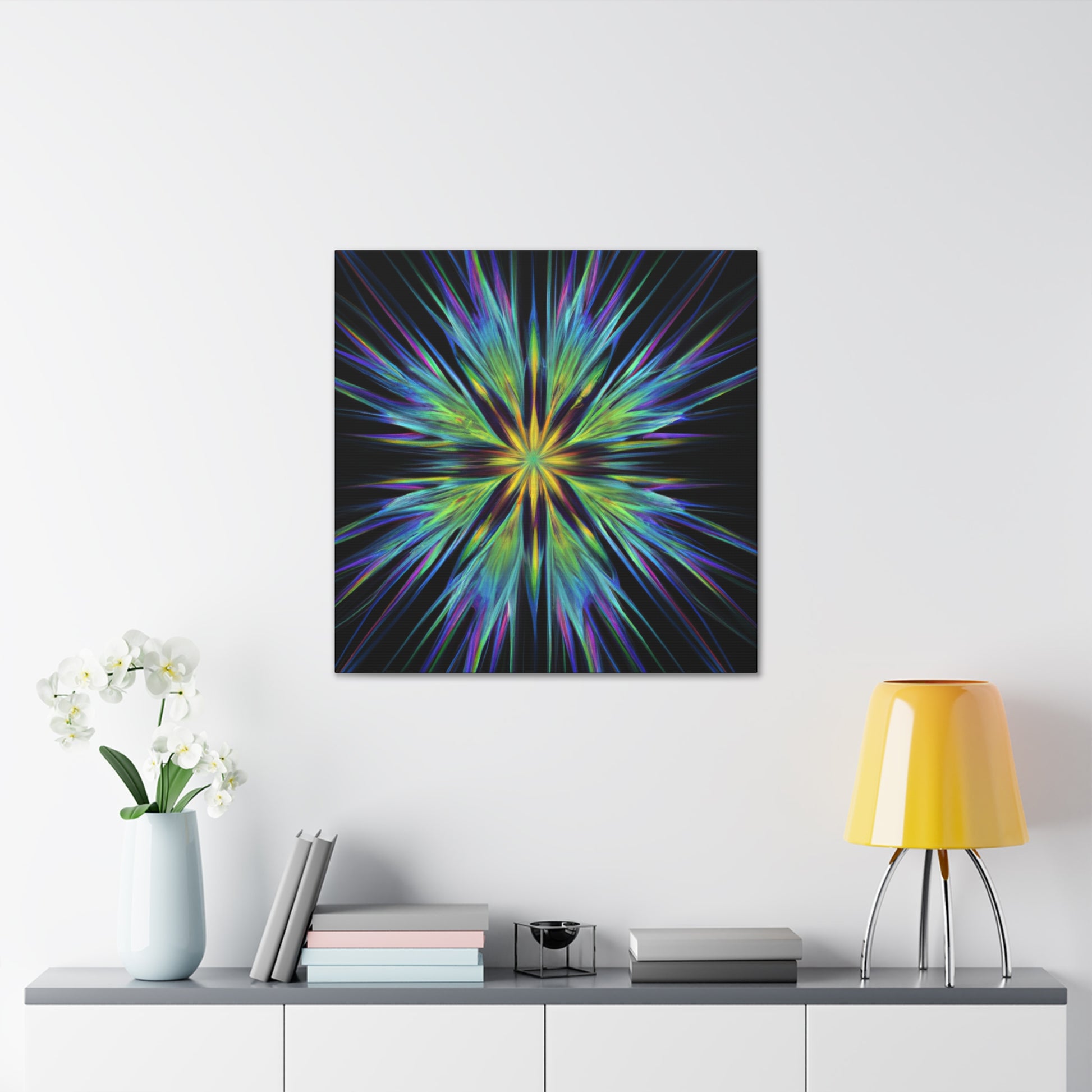 Brighten up your home with this vibrant, one-of-a-kind canvas. Digital art featuring trippy geometric palm leaves, kaleidoscope and 3D lines fills the frame with abstract fractal shapes. This piece will liven up any room with our bold and beautiful colors. #indigodecor #3Dlines #canvasart #fractal #kaleidoscope #trippygeoart #palmleaves #abstractart #digitalart #vibrantcolors #3Dartwork