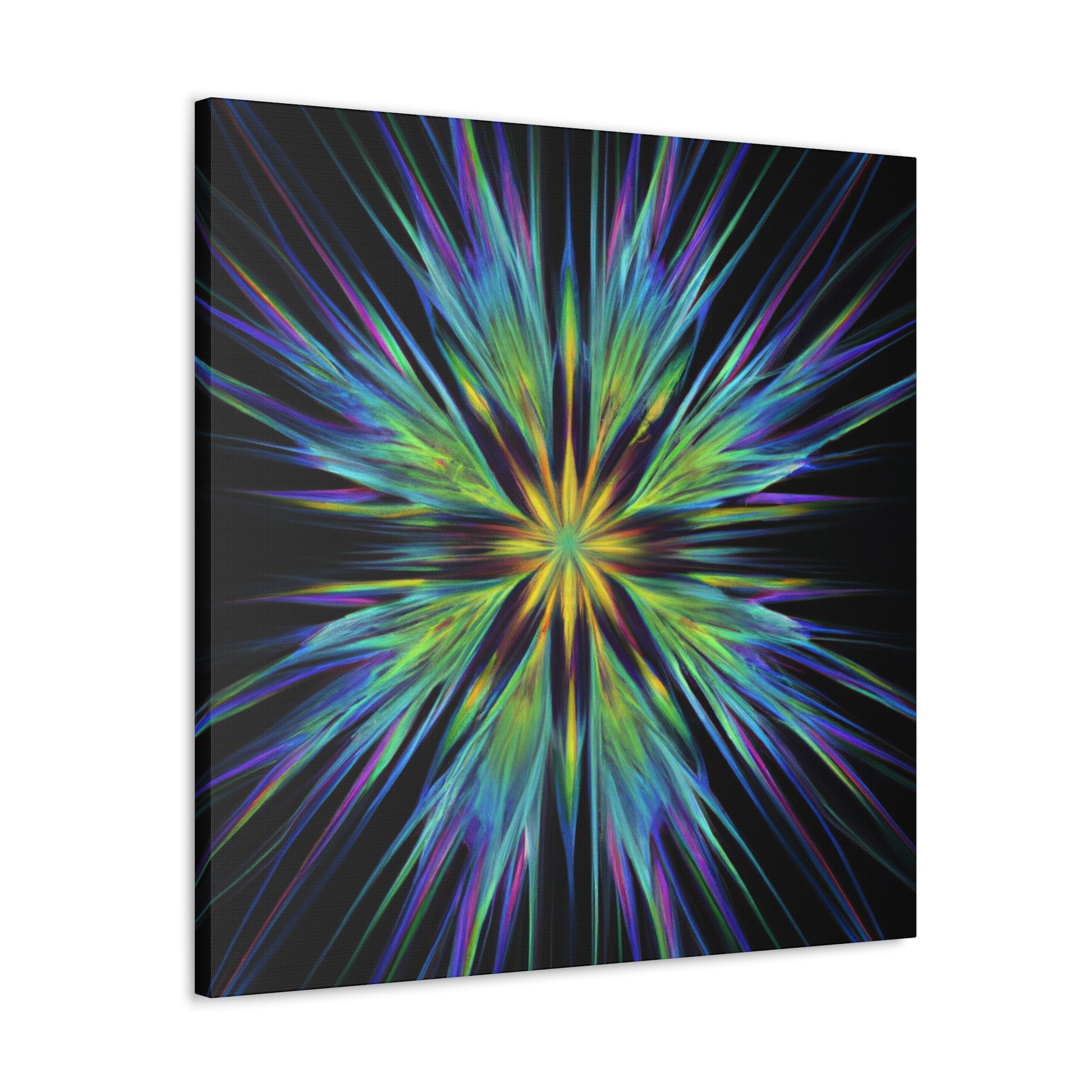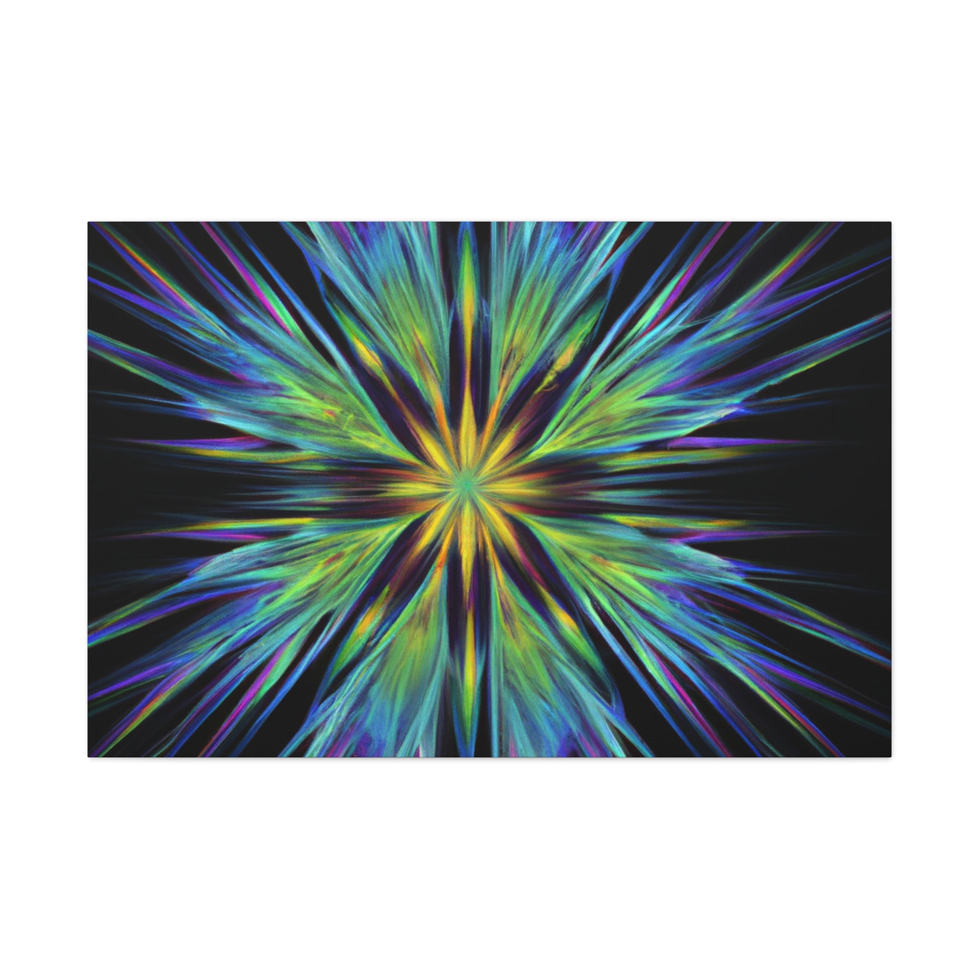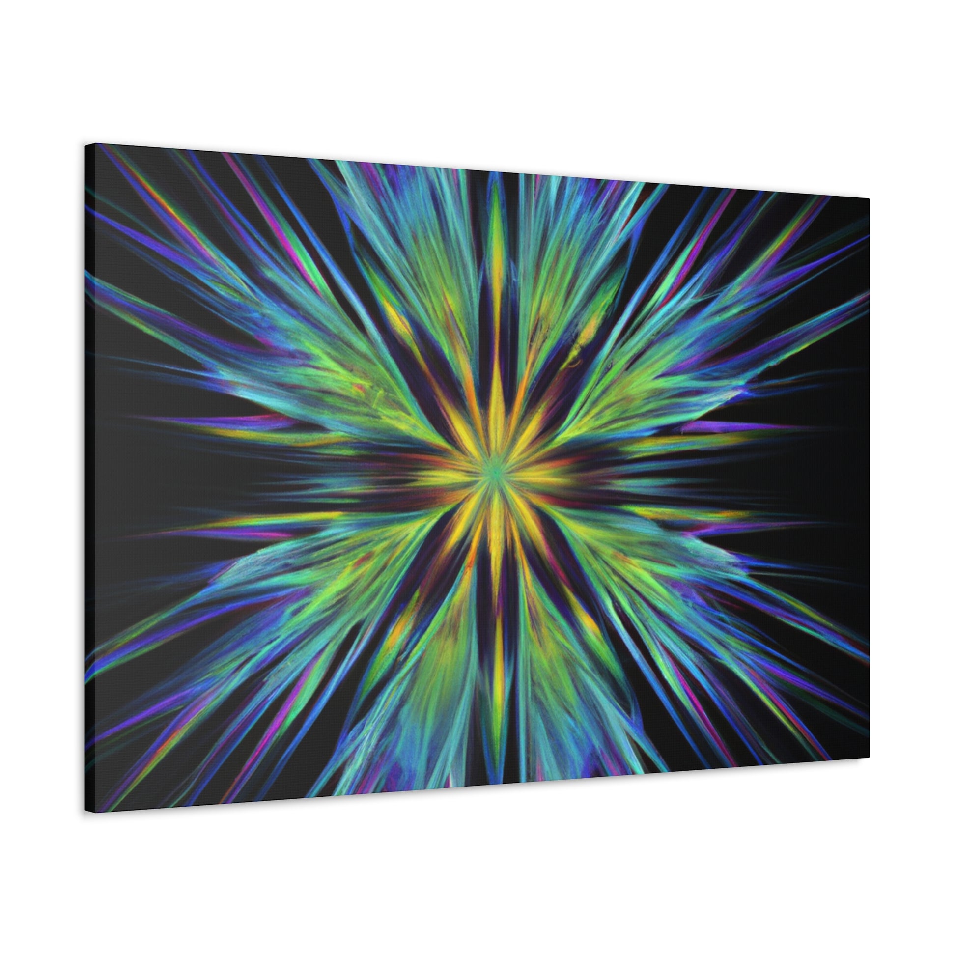 Brighten up your home with this vibrant, one-of-a-kind canvas. Digital art featuring trippy geometric palm leaves, kaleidoscope and 3D lines fills the frame with abstract fractal shapes. This piece will liven up any room with our bold and beautiful colors. #indigodecor #3Dlines #canvasart #fractal #kaleidoscope #trippygeoart #palmleaves #abstractart #digitalart #vibrantcolors #3Dartwork