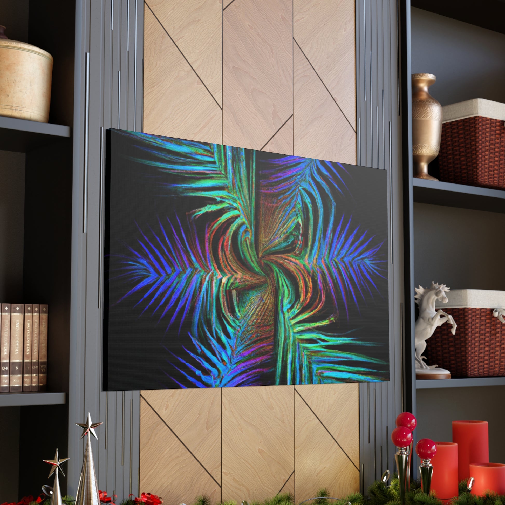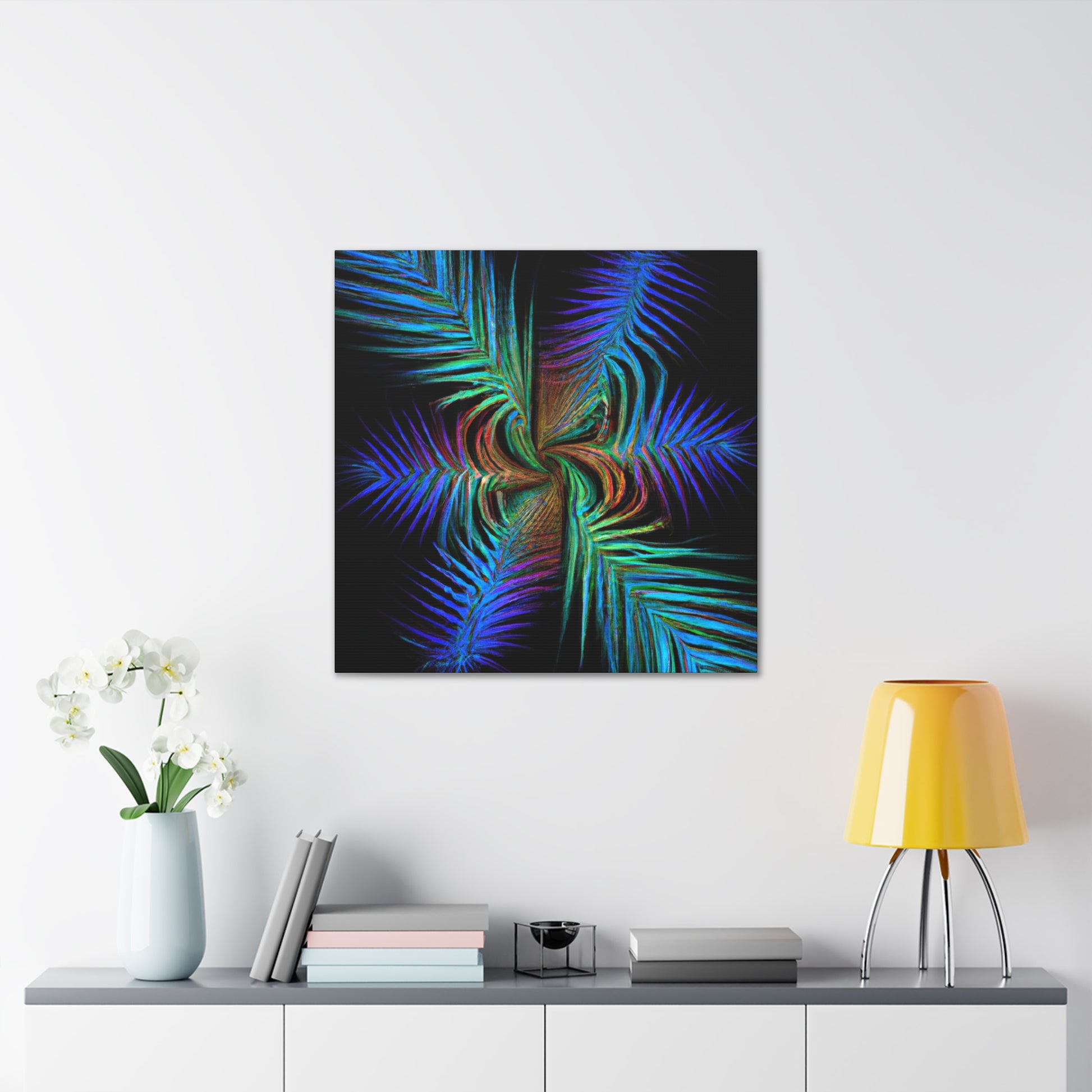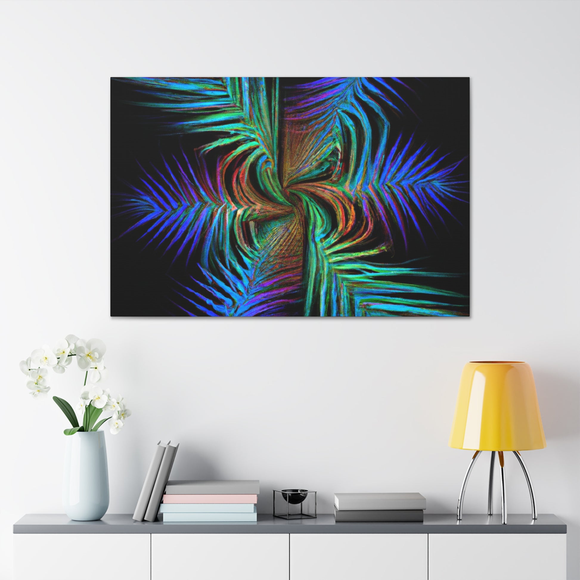 Bring life and color to your walls with this mind boggling canvas! This abstract, digital art features trippy geometric palm leaves, kaleidoscope-like patterns, vibrant hues, 3D lines, fractals, and more. Let your walls become alive with this mesmerizing stone-look artwork. #interiorstyling #artdecor #canvasprint #palmleaves #3dlines #kaleidoscope #fractal #abstractart #vibrantcolors #digitalart #trippygeometricart