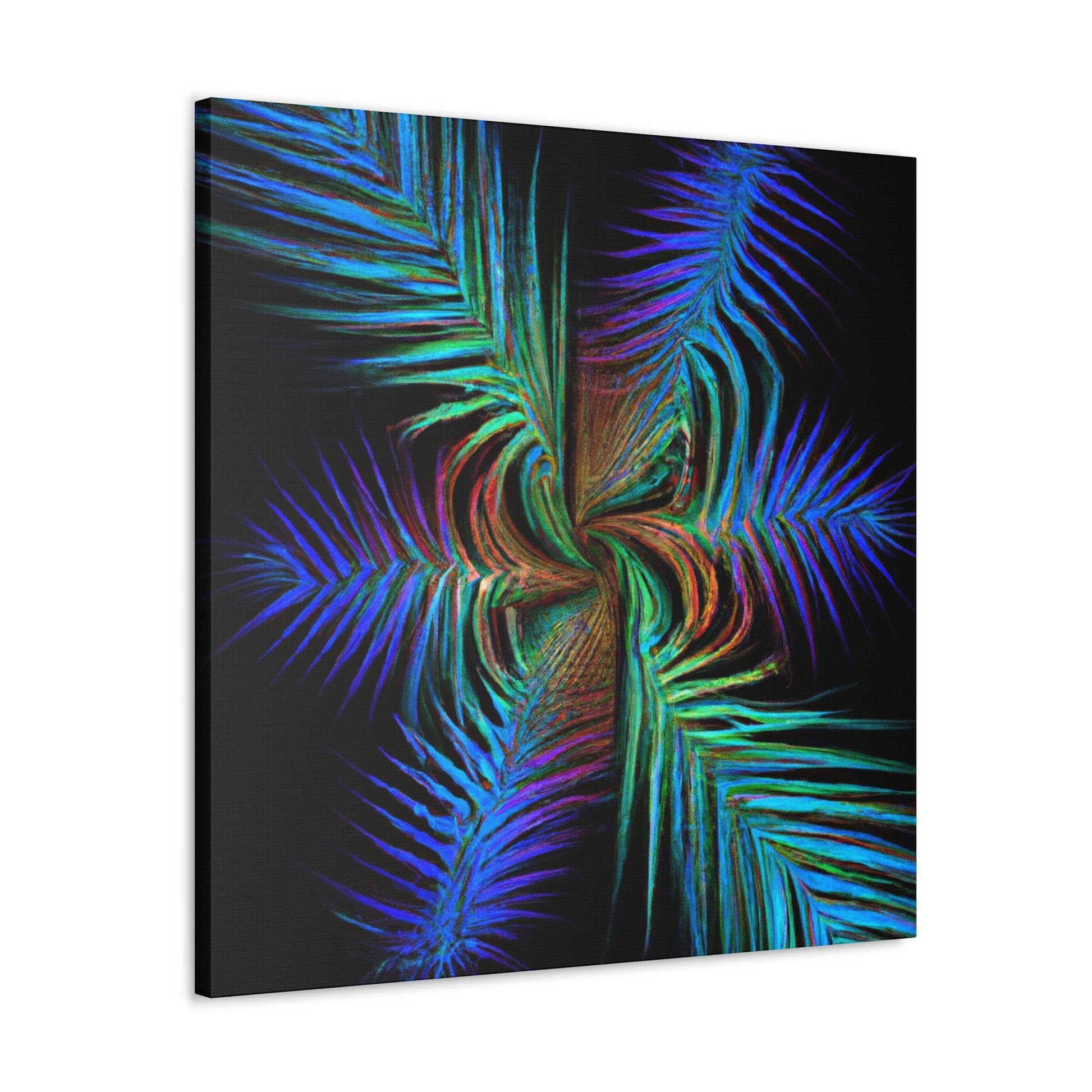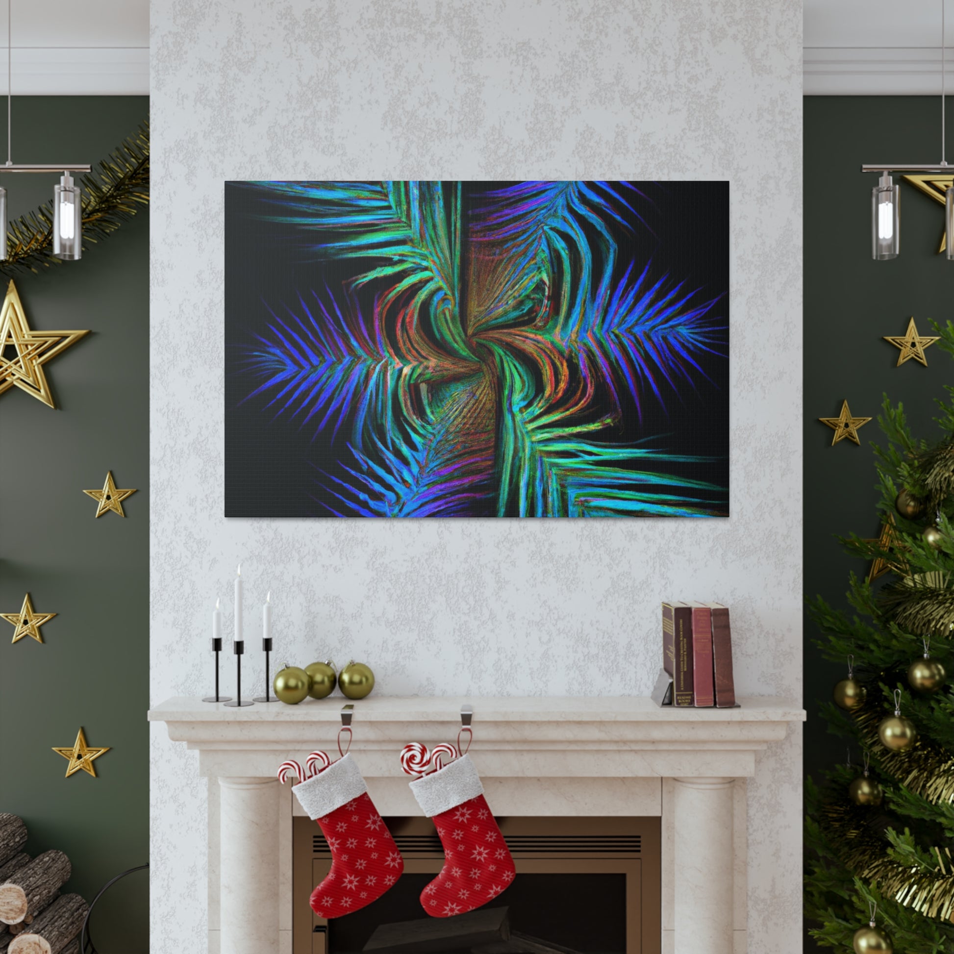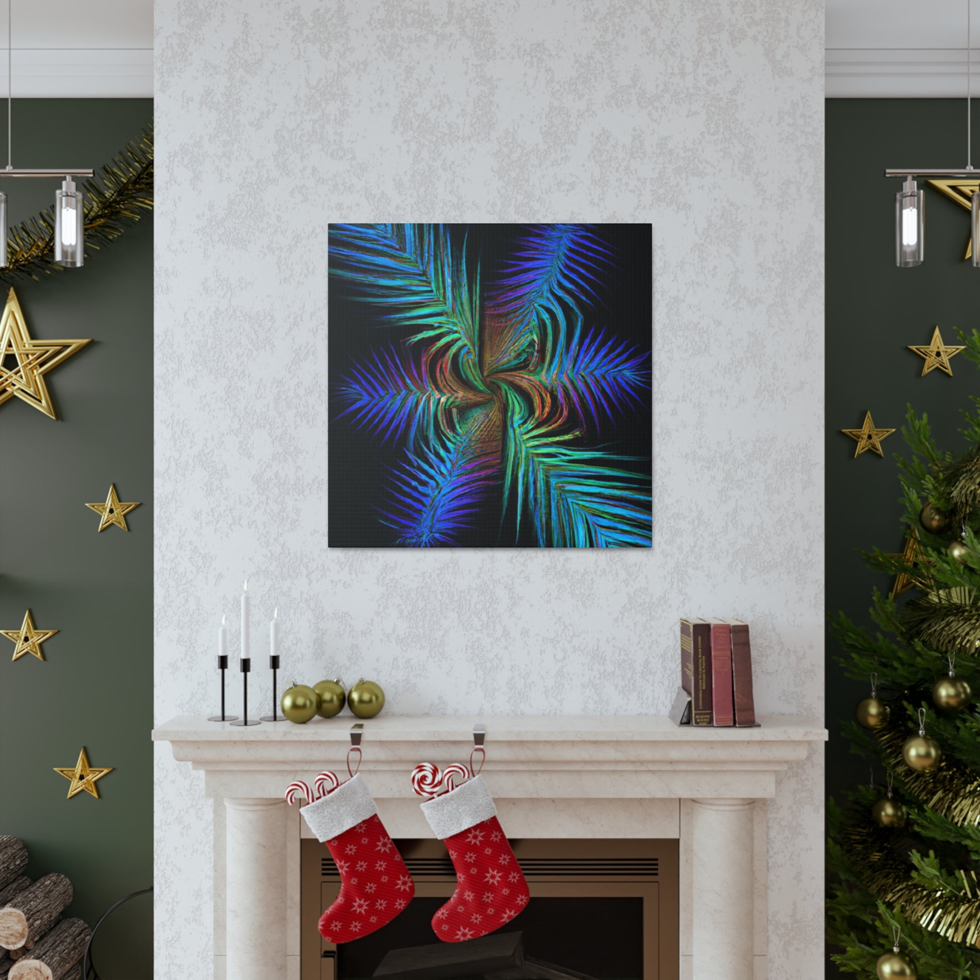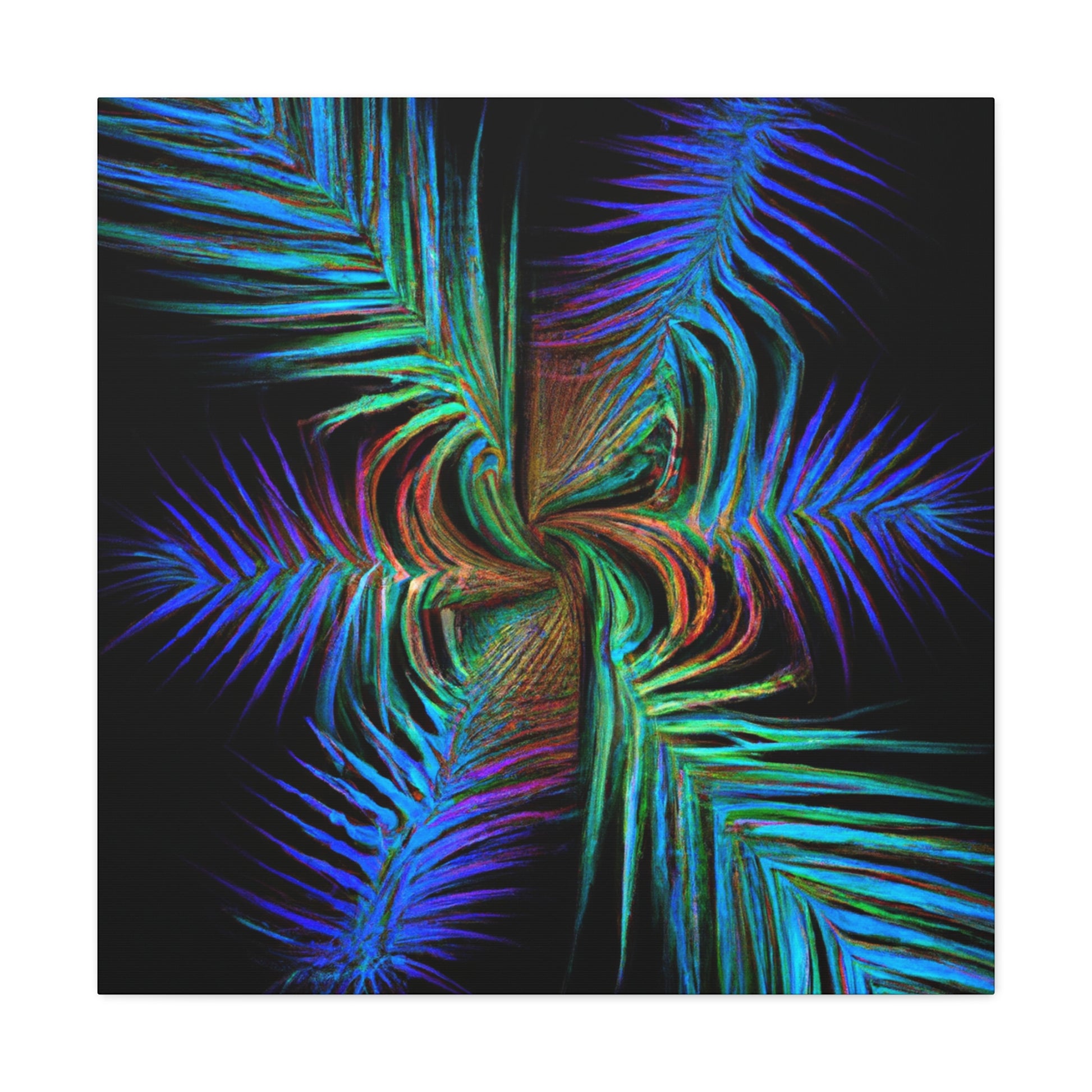 Bring life and color to your walls with this mind boggling canvas! This abstract, digital art features trippy geometric palm leaves, kaleidoscope-like patterns, vibrant hues, 3D lines, fractals, and more. Let your walls become alive with this mesmerizing stone-look artwork. #interiorstyling #artdecor #canvasprint #palmleaves #3dlines #kaleidoscope #fractal #abstractart #vibrantcolors #digitalart #trippygeometricart