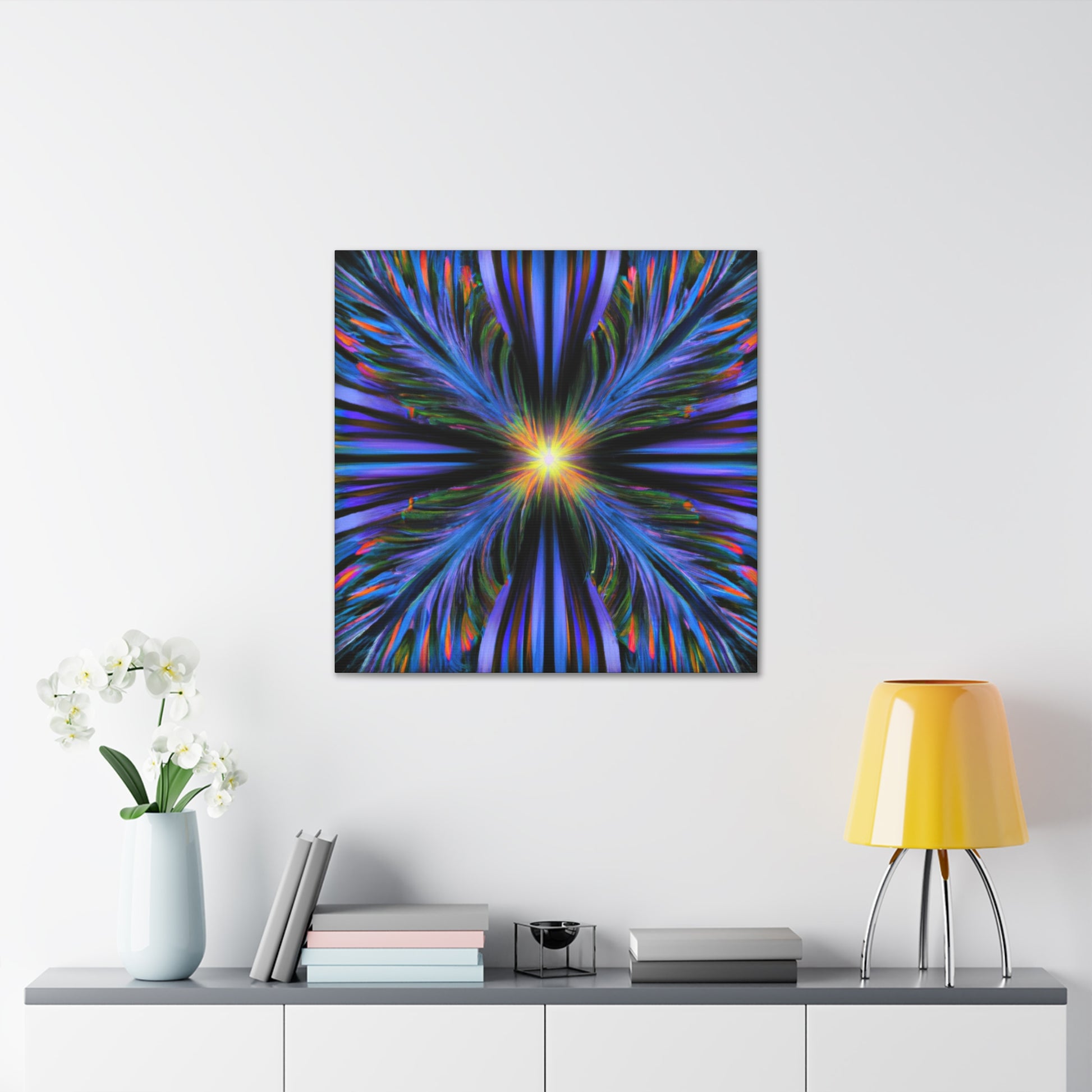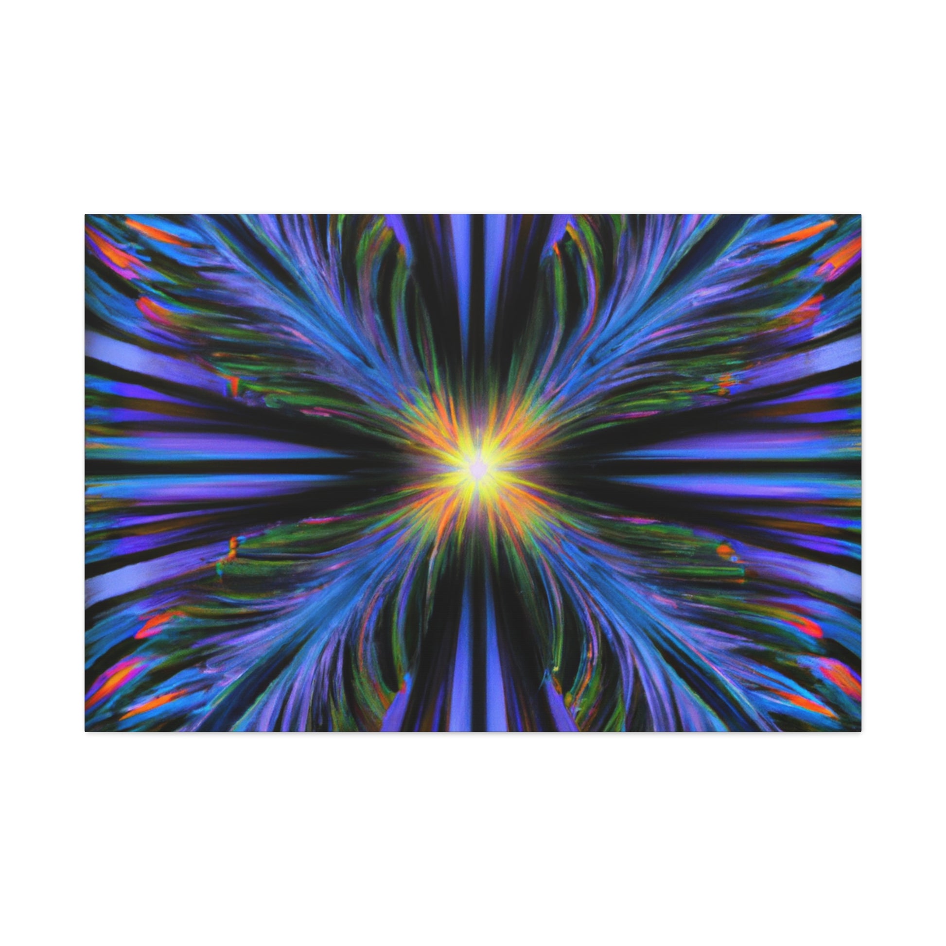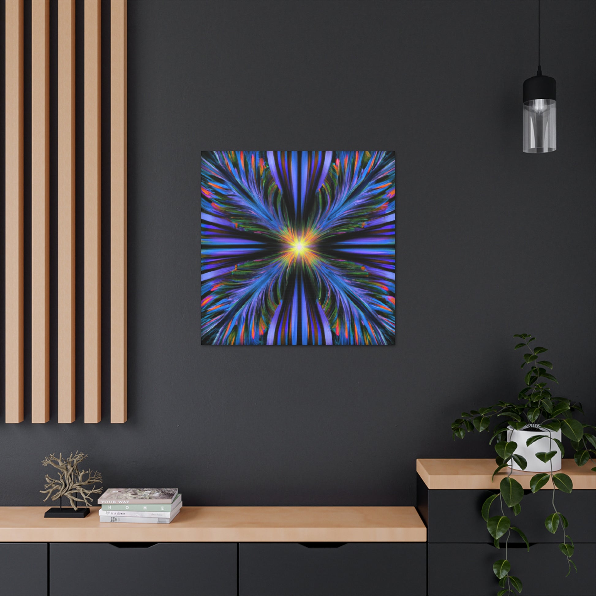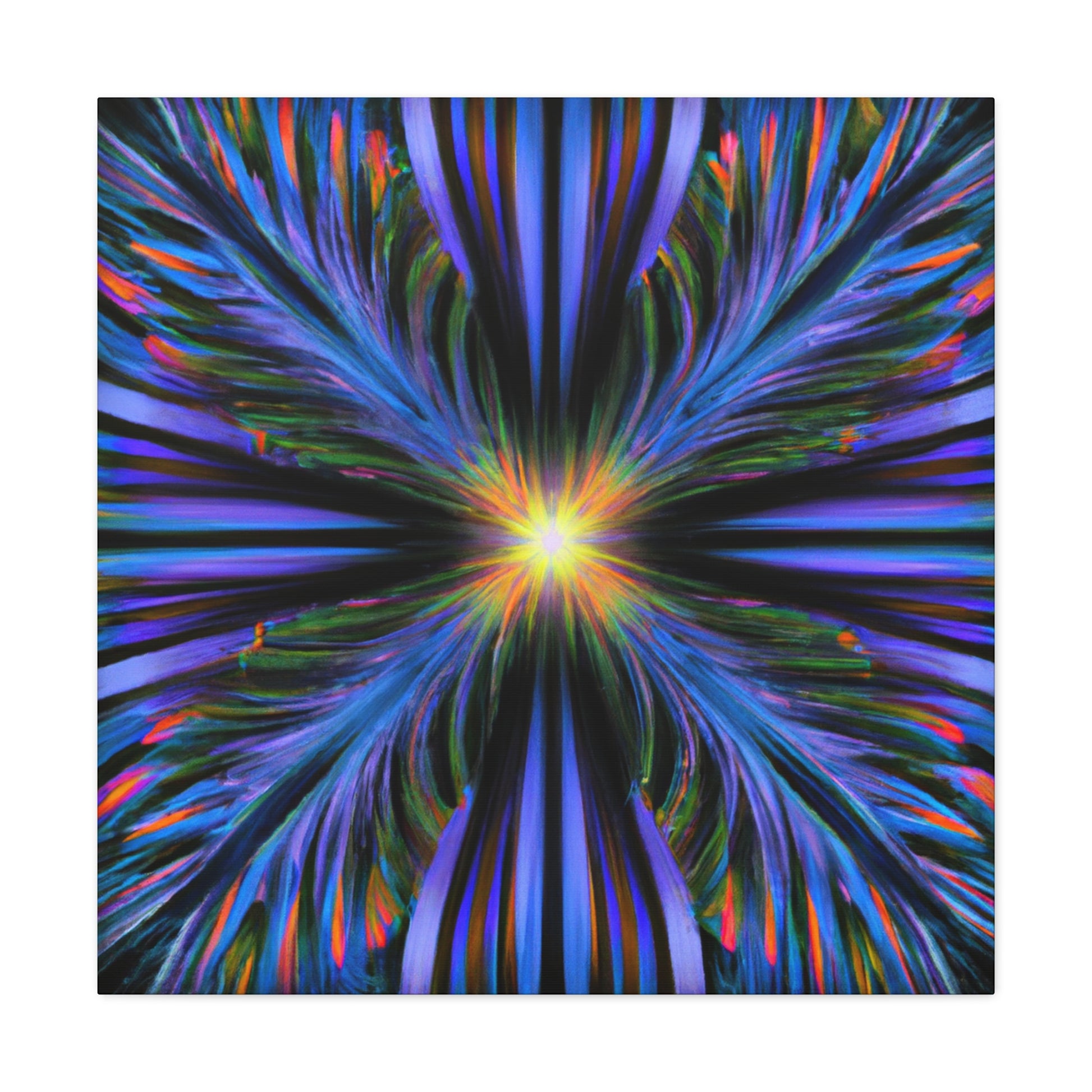 Make a statement with this captivating canvas featuring bold abstract art with an explosion of trippy geometric palm leaves, kaleidoscope, 3D lines and fractal. The vibrant colors and mesmerizing patterning will bring life and movement to any space, and is sure to be a conversation starter. #interiordesign #digitalart #wallart #statementpiece #canvasprint #kaleidoscope #palmleaves #trippy #fractal #abstractart #vibrantcolors